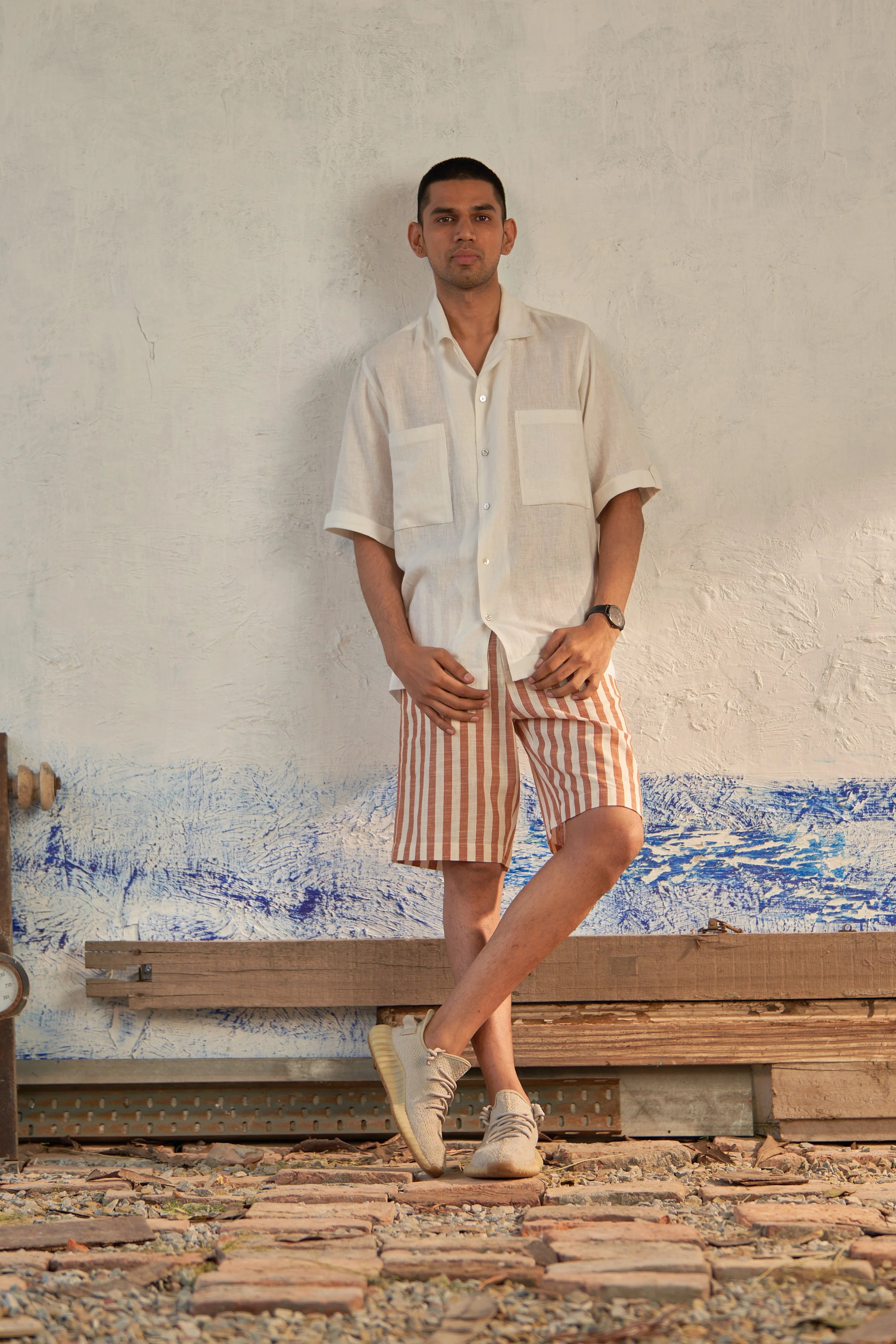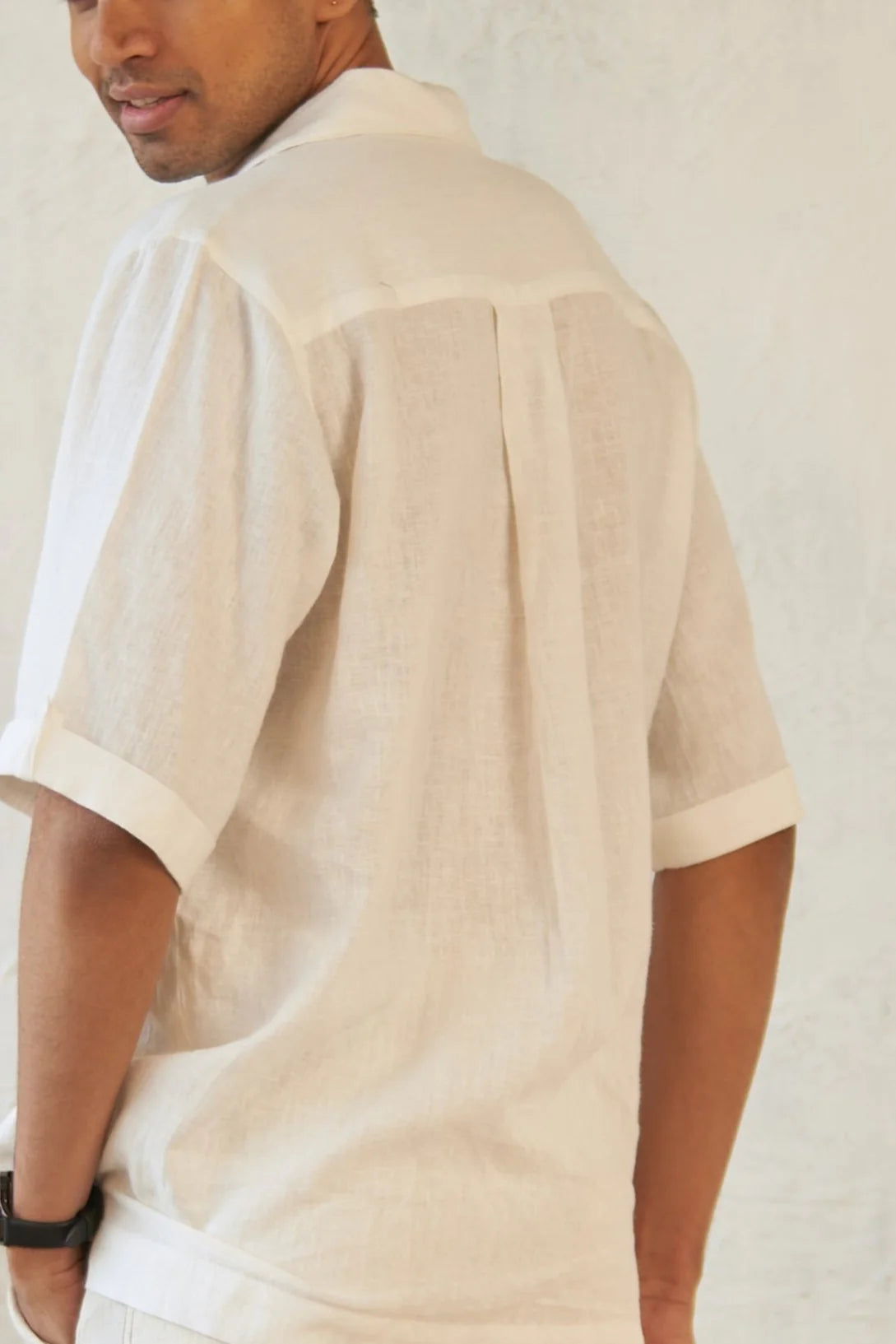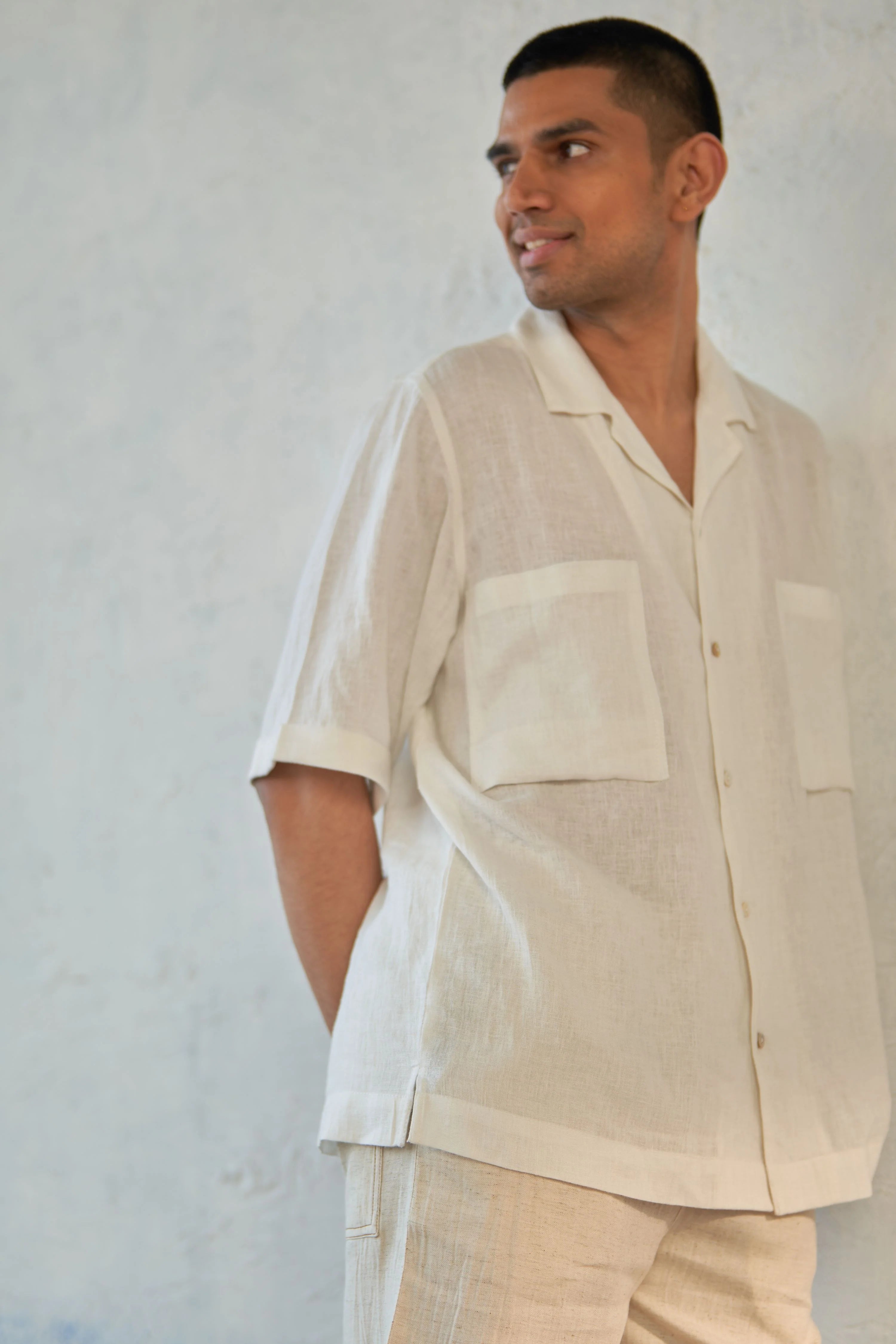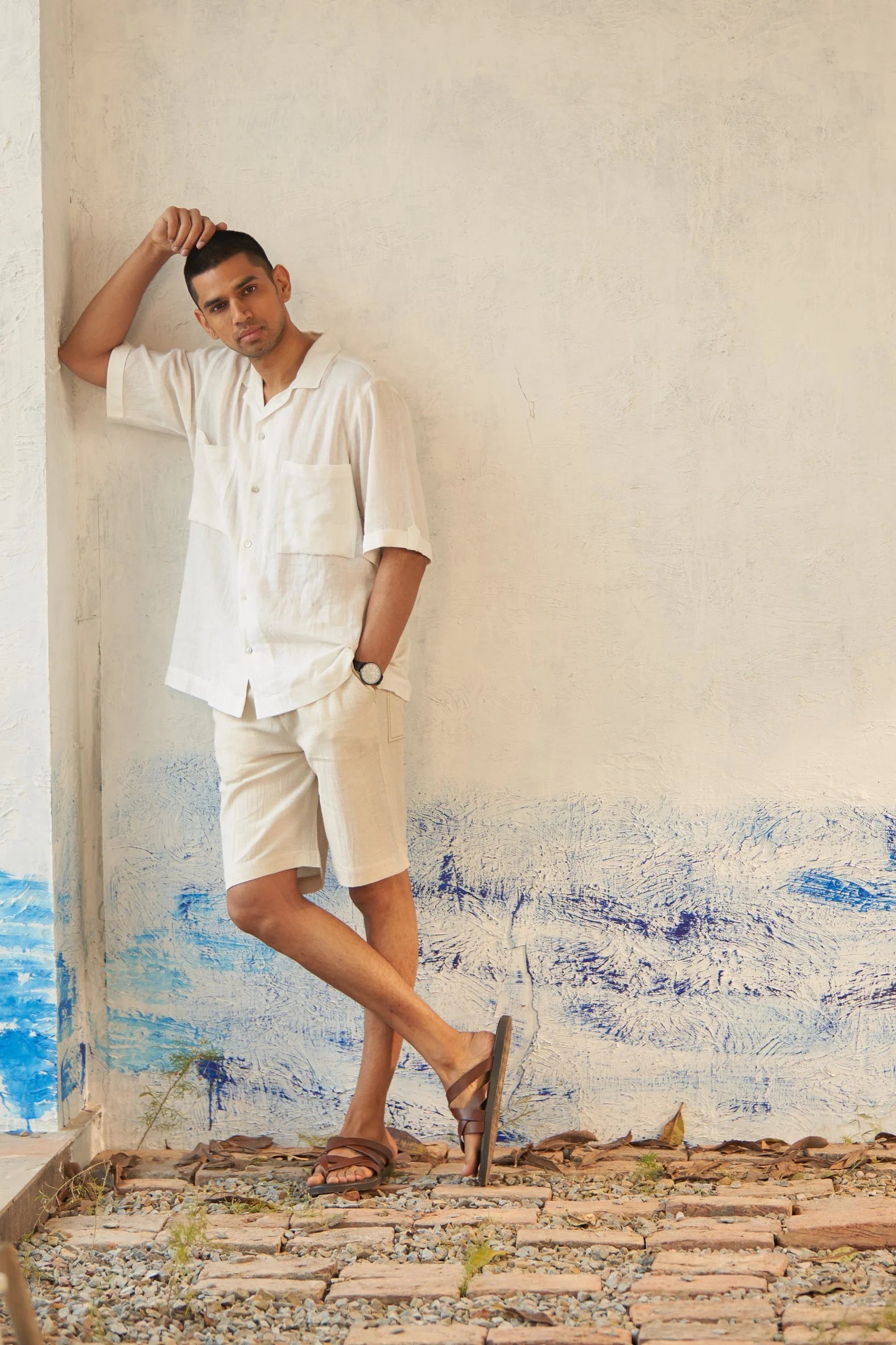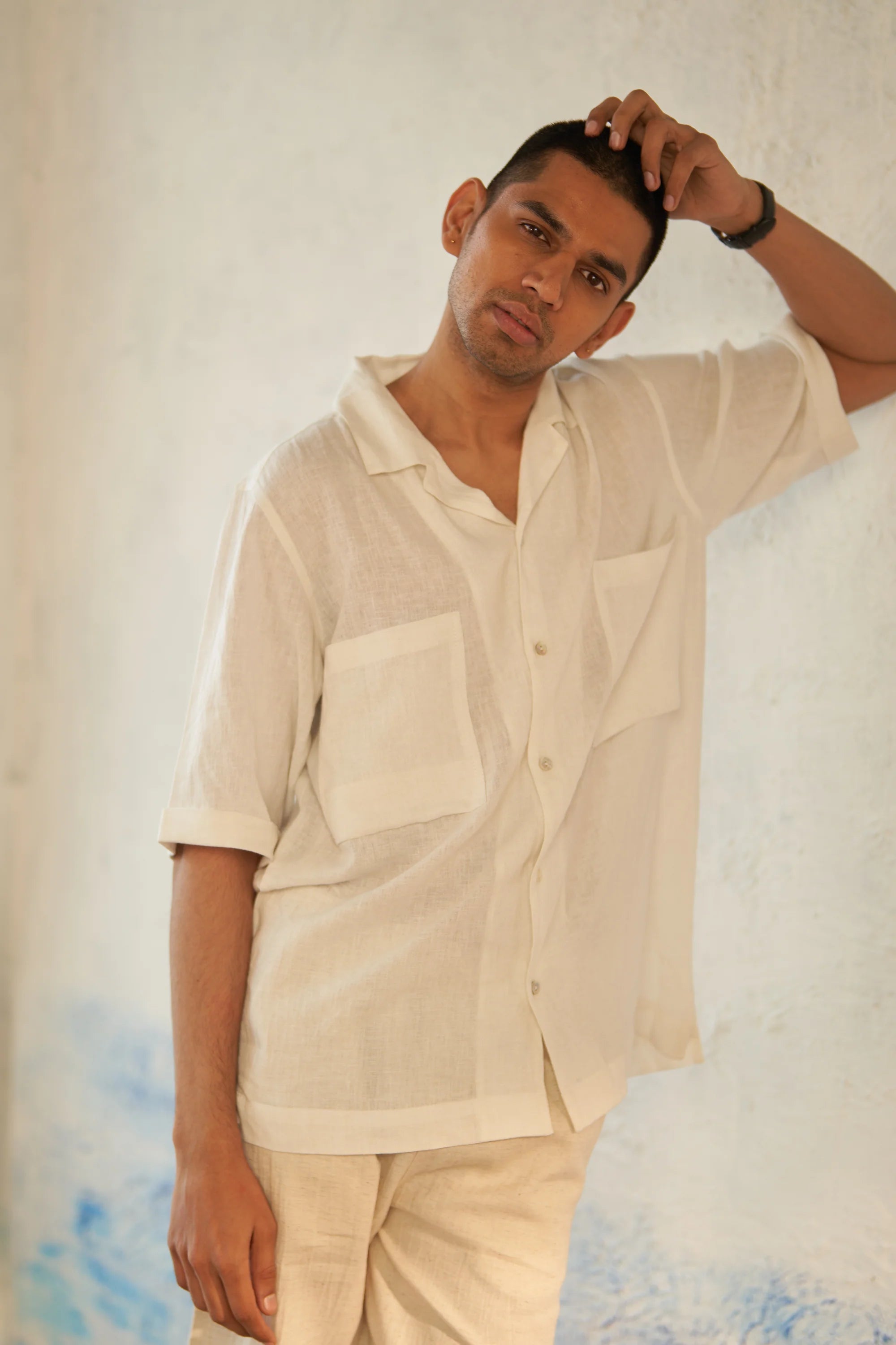 White shirt for men with a little twist. This ice crush shirt offers a perfect offering for a leisurely feel. Featuring a camp collar design and horizontal spacious pockets for a subtle contrast shade. Complete with side vents at the hem and a false lapel detail on the left sleeve, it's the perfect choice for laid-back outings.