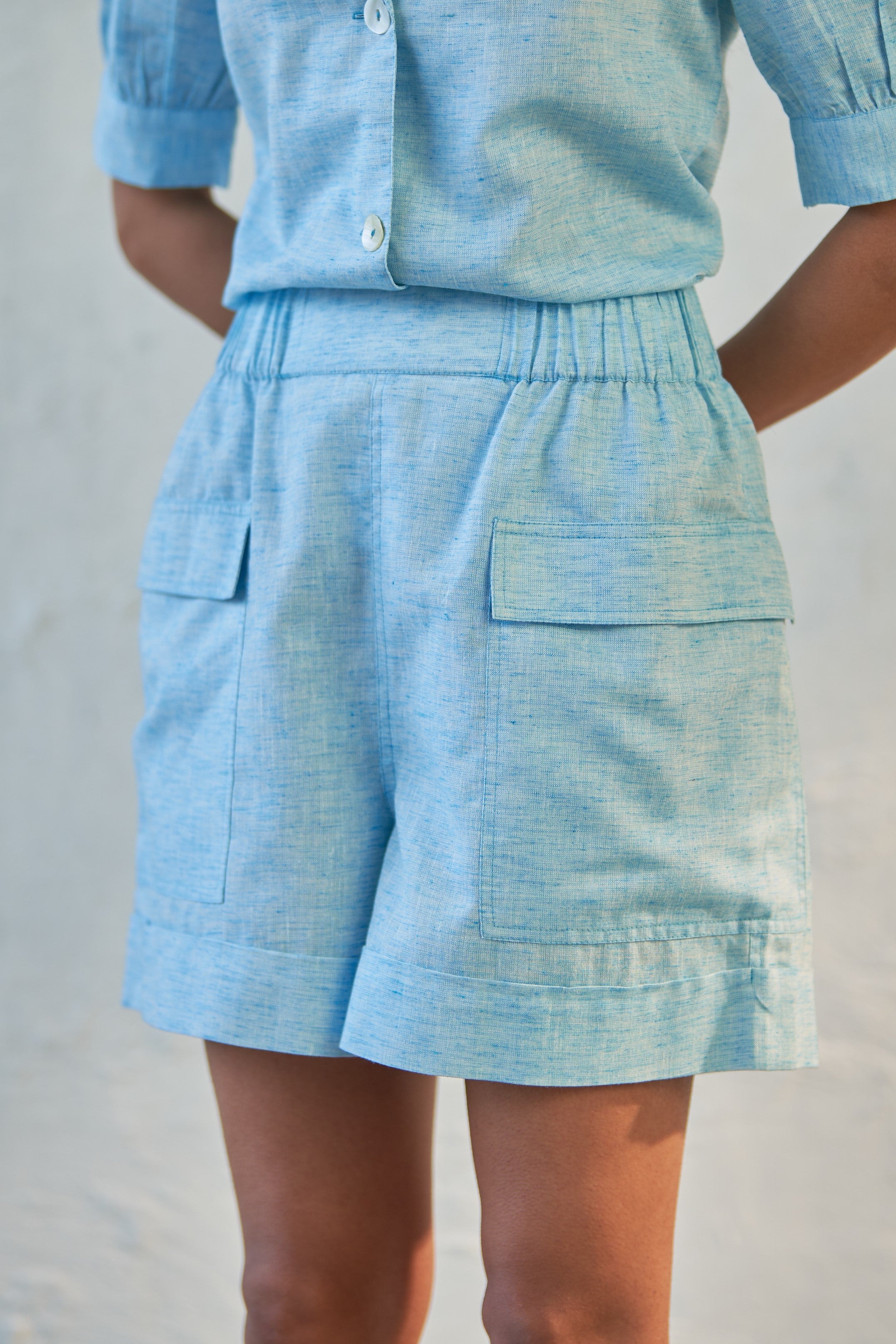 Immerse yourself in the cool tranquility of icy blue with our chic shorts. Designed with a half elastic waistband and flap pockets, they provide comfort and practicality in the refreshing hue of icy blue.