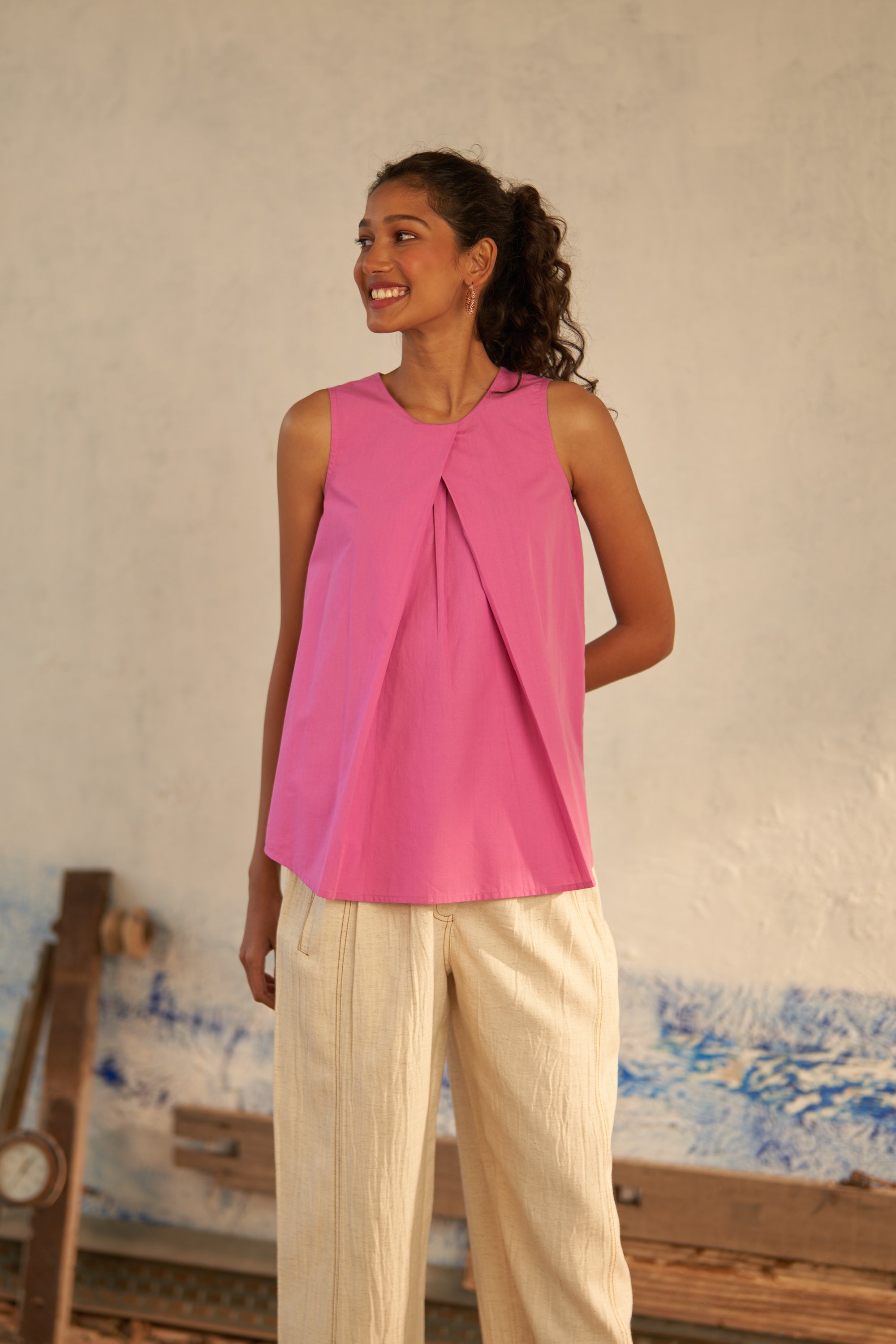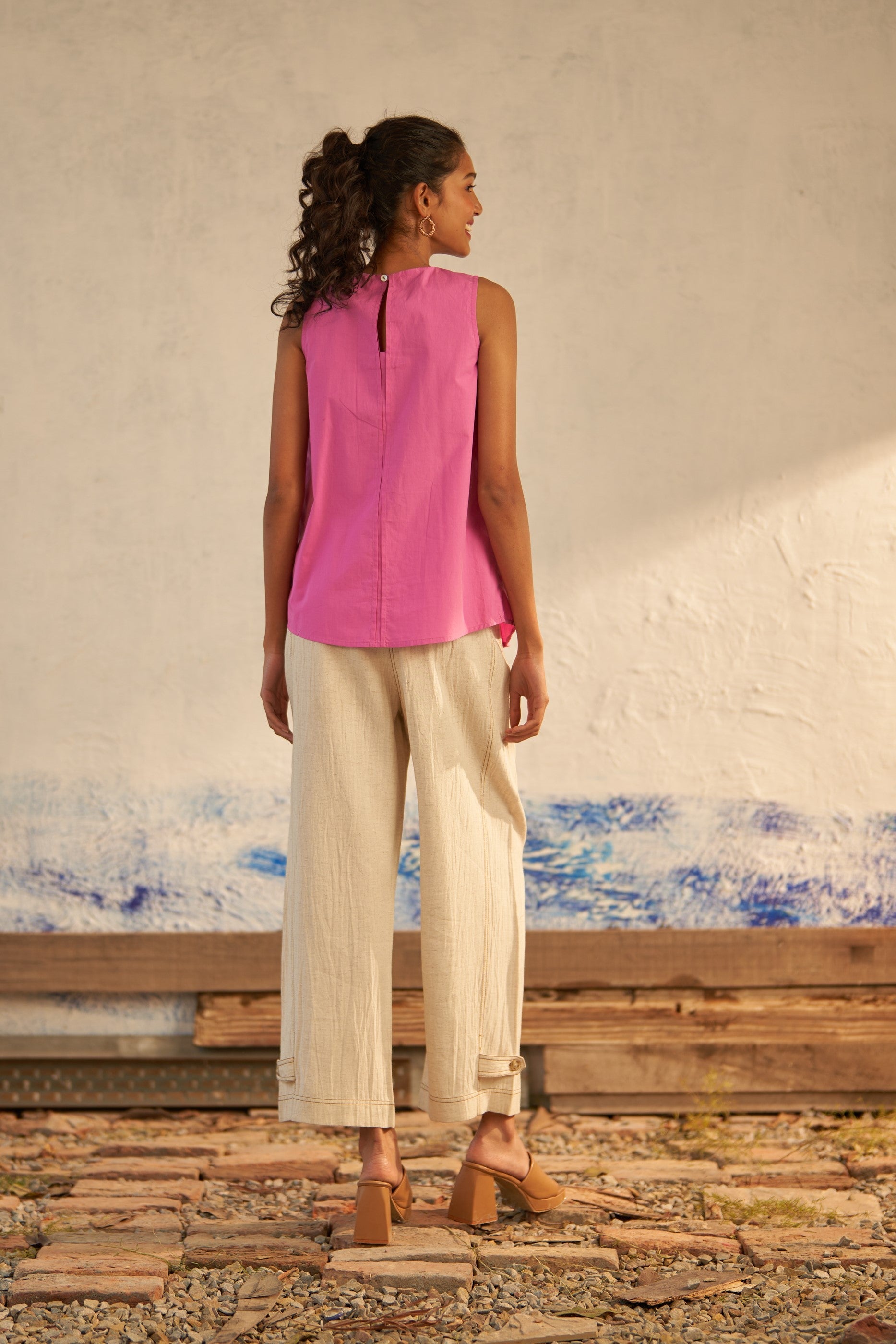 This ensemble offers versatility that seamlessly transitions from day to night. The sleeveless top boasts a twisted neckline, creating a graceful draped effect for a touch of elegance. Paired with Flex Rayon breathable loop pants, these crush-look pants are meticulously designed with intricate stitch detailing, adding flair to the look. Featuring a carefully tailored design with a gently gathered elasticated waist, convenient side pockets, subtle pleats, and an adjustable loop at the hem, these pants offer both style and comfort. Wear them as flared pants for a relaxed vibe during the day, or cinch them to create a sleeker silhouette for outings.