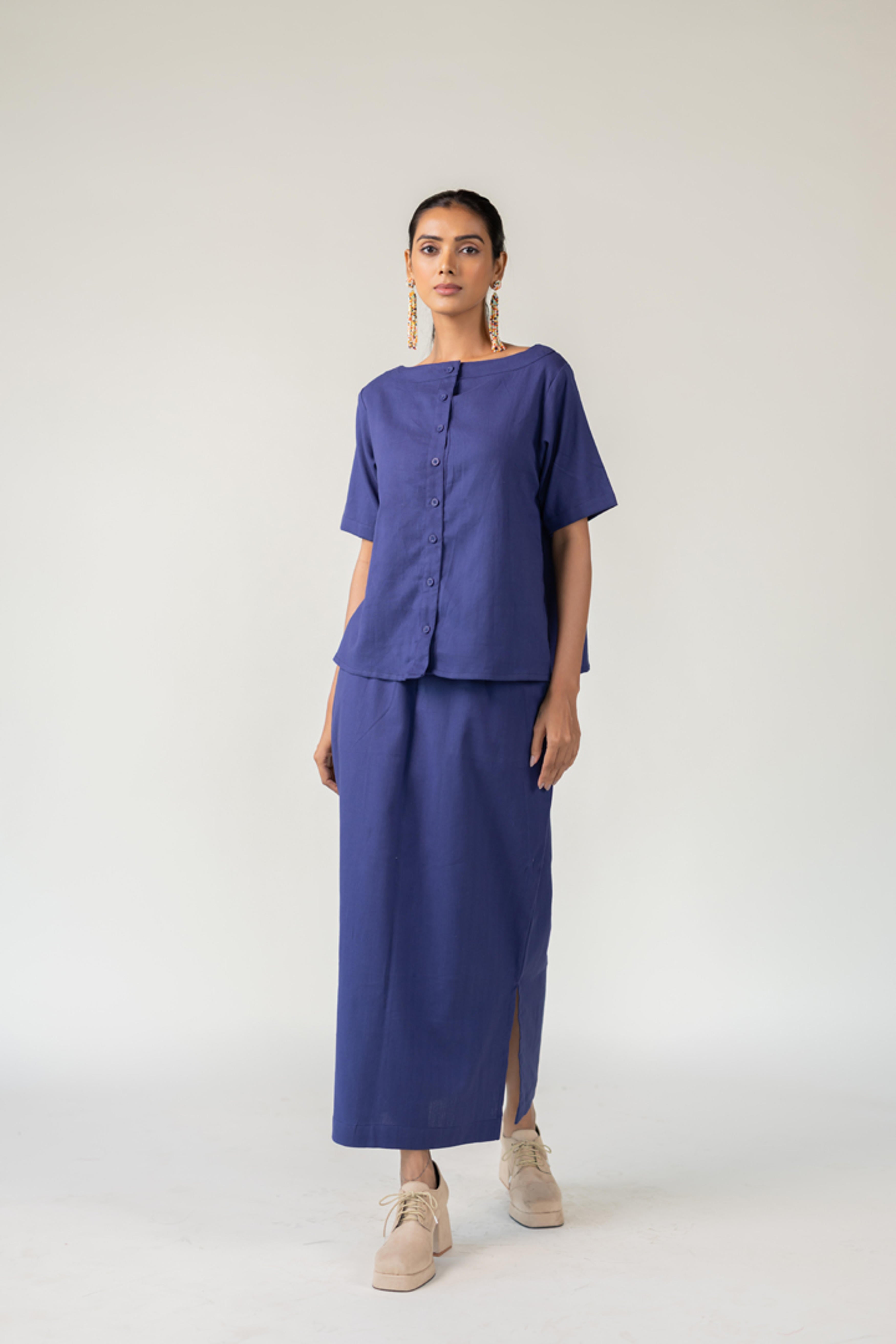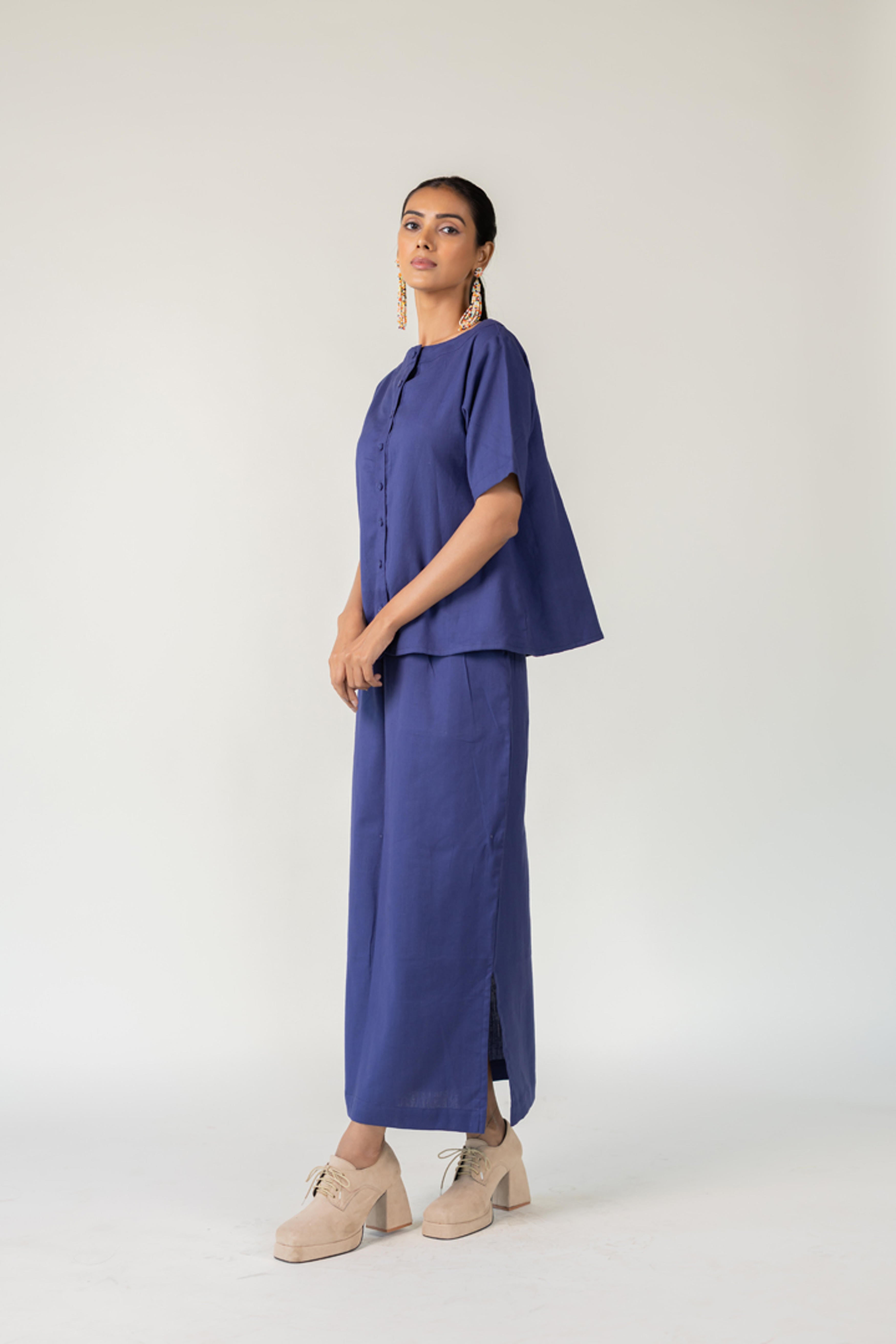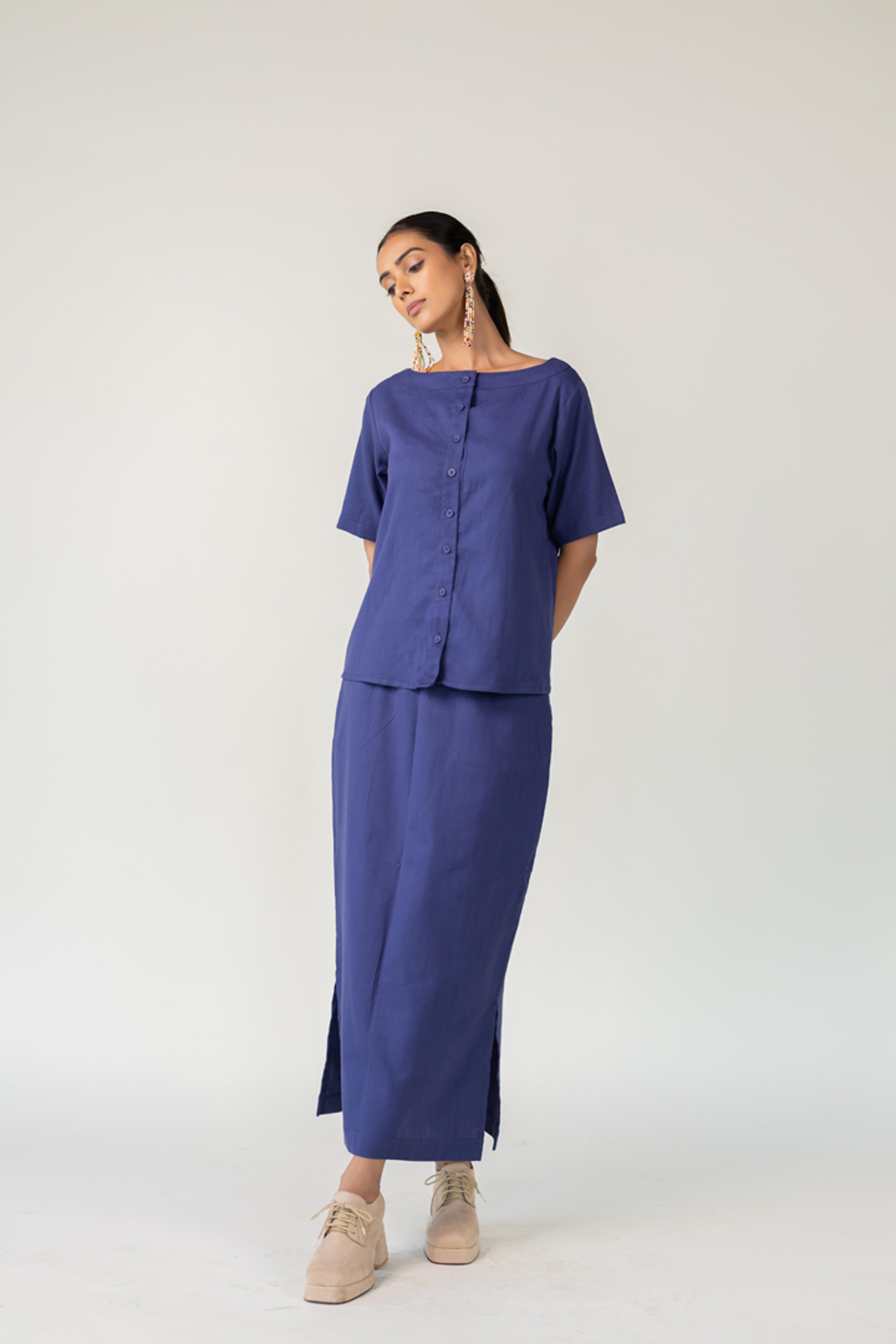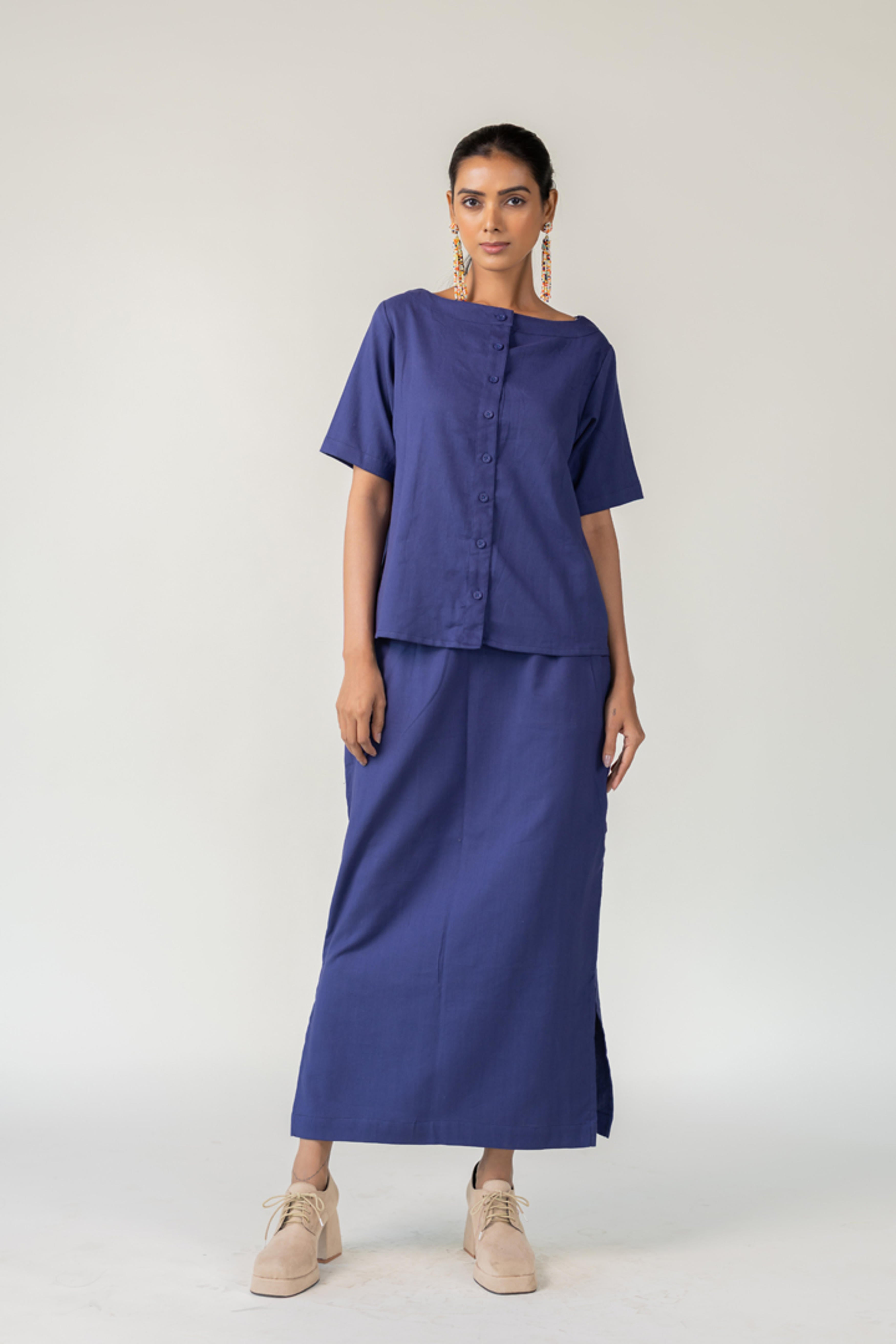 Elevate your everyday wardrobe with our Indigo City-goer Skirt Set ? a contemporary blend of comfort and structure. Crafted from breathable cotton, this co-ord set features a boxy top with a functional front placket. Paired with straight-cut ankle-length skirt, the silhouette offers a relaxed yet tailored feel. The rich indigo hue brings timeless elegance, while side slits enhance ease of movement. Model is 5?7? and wearing size M Length: Skirt - 38" Top - 23"