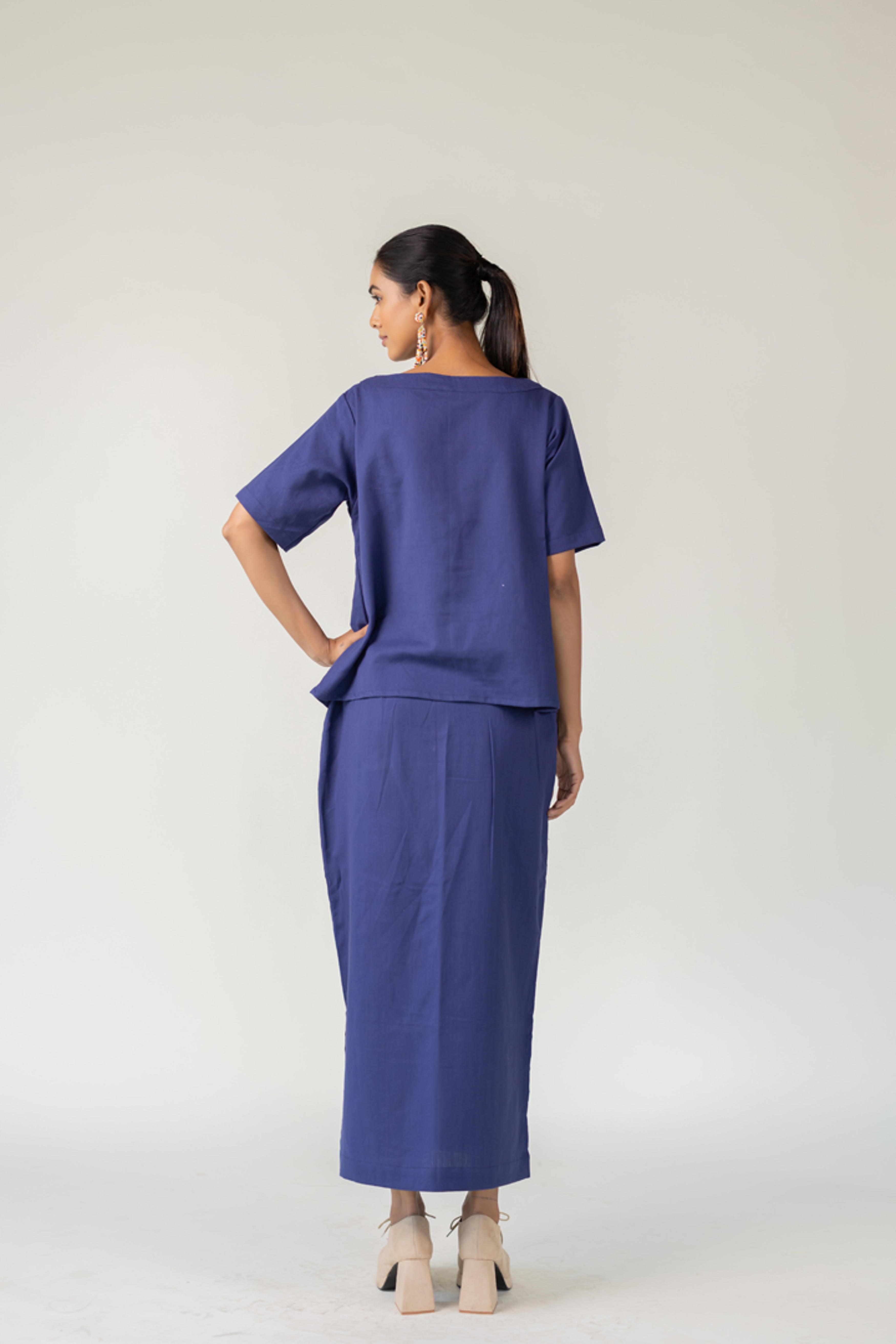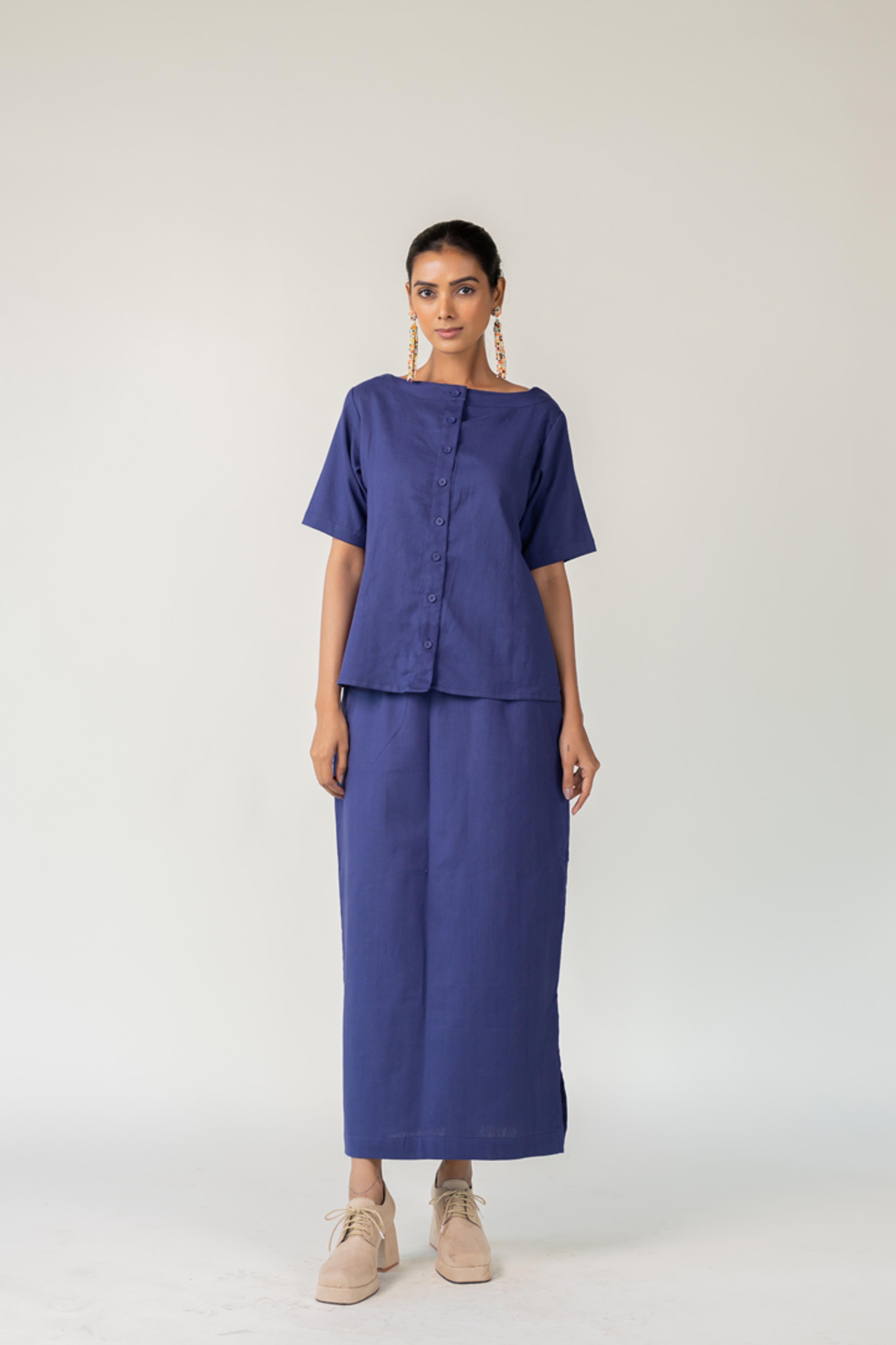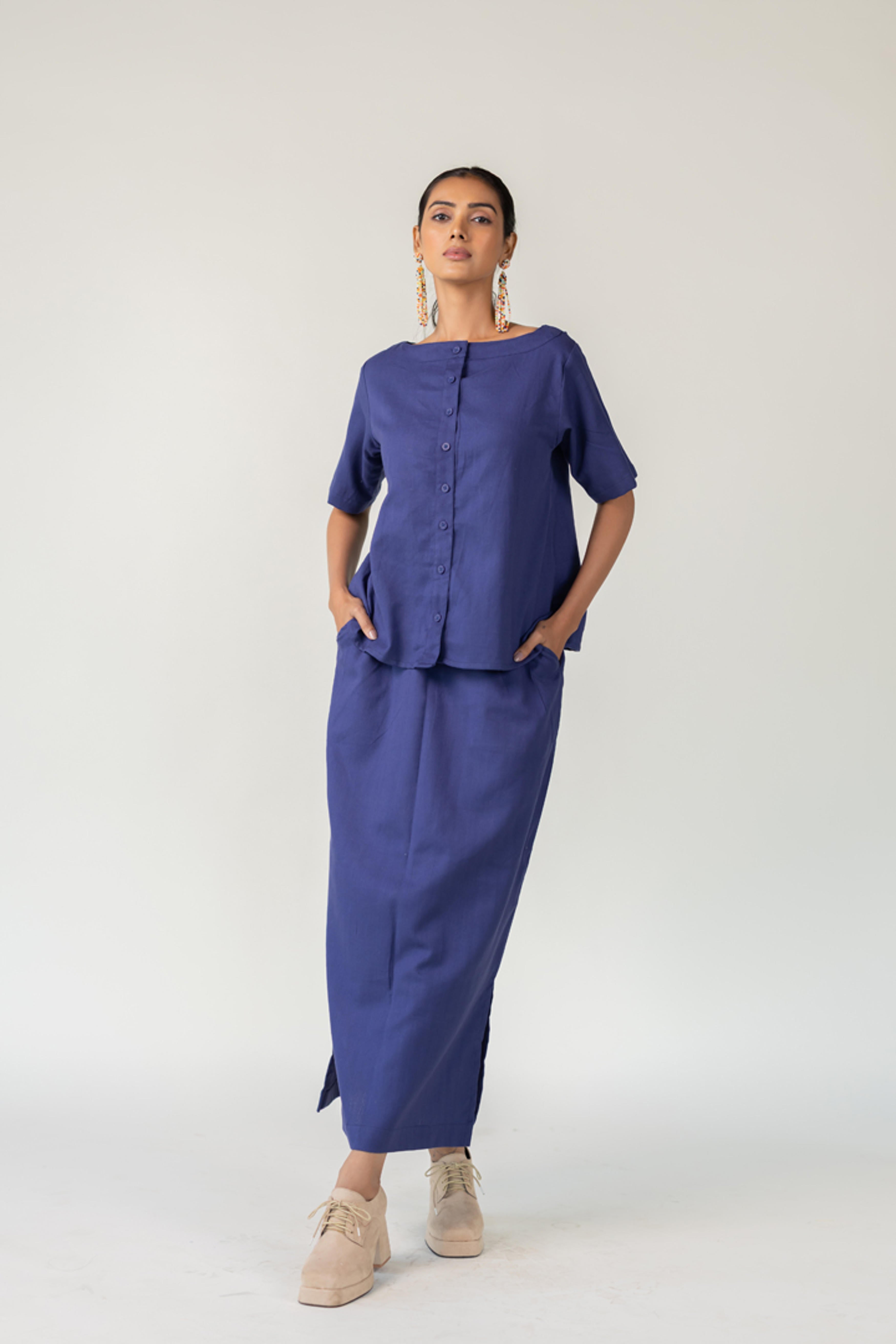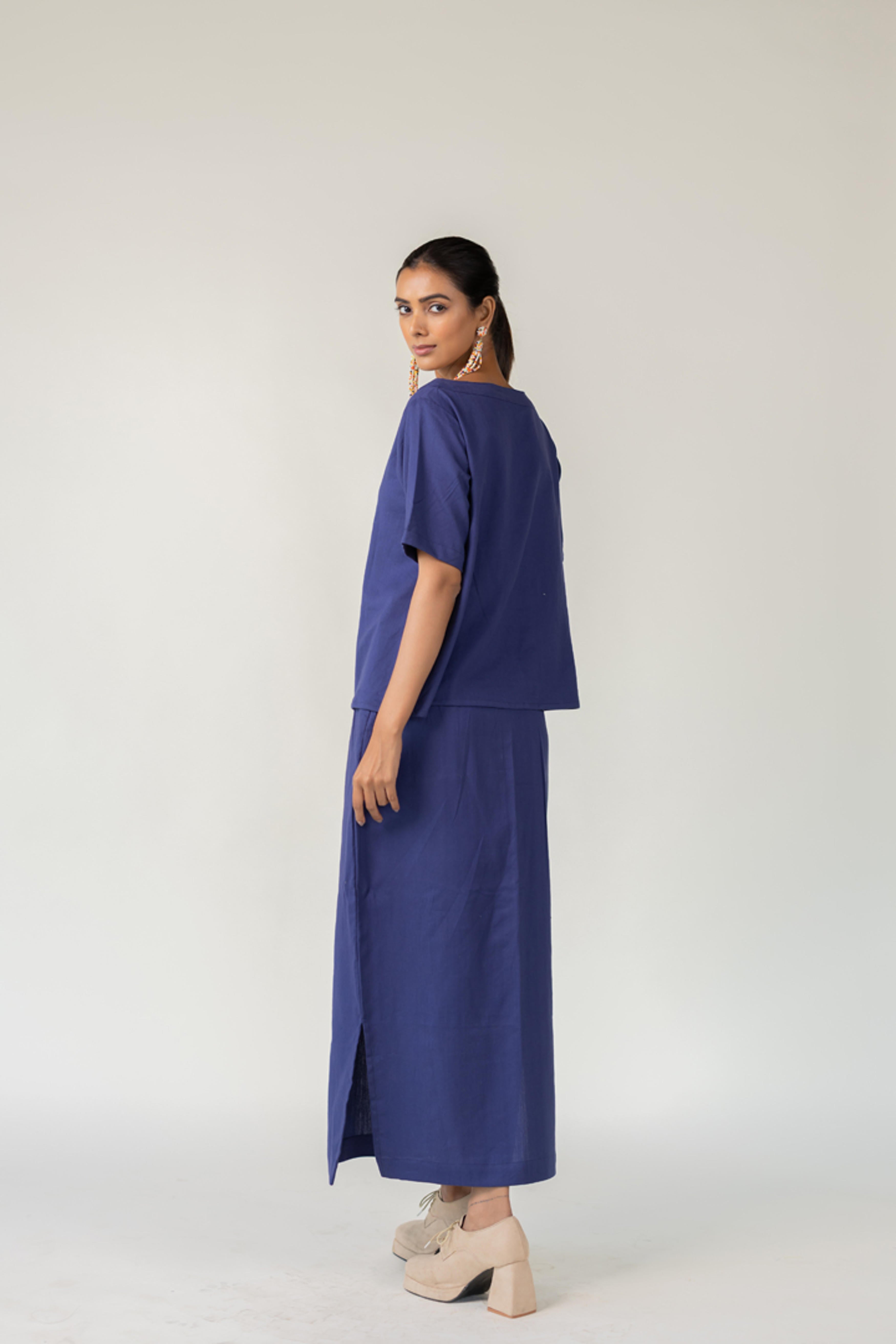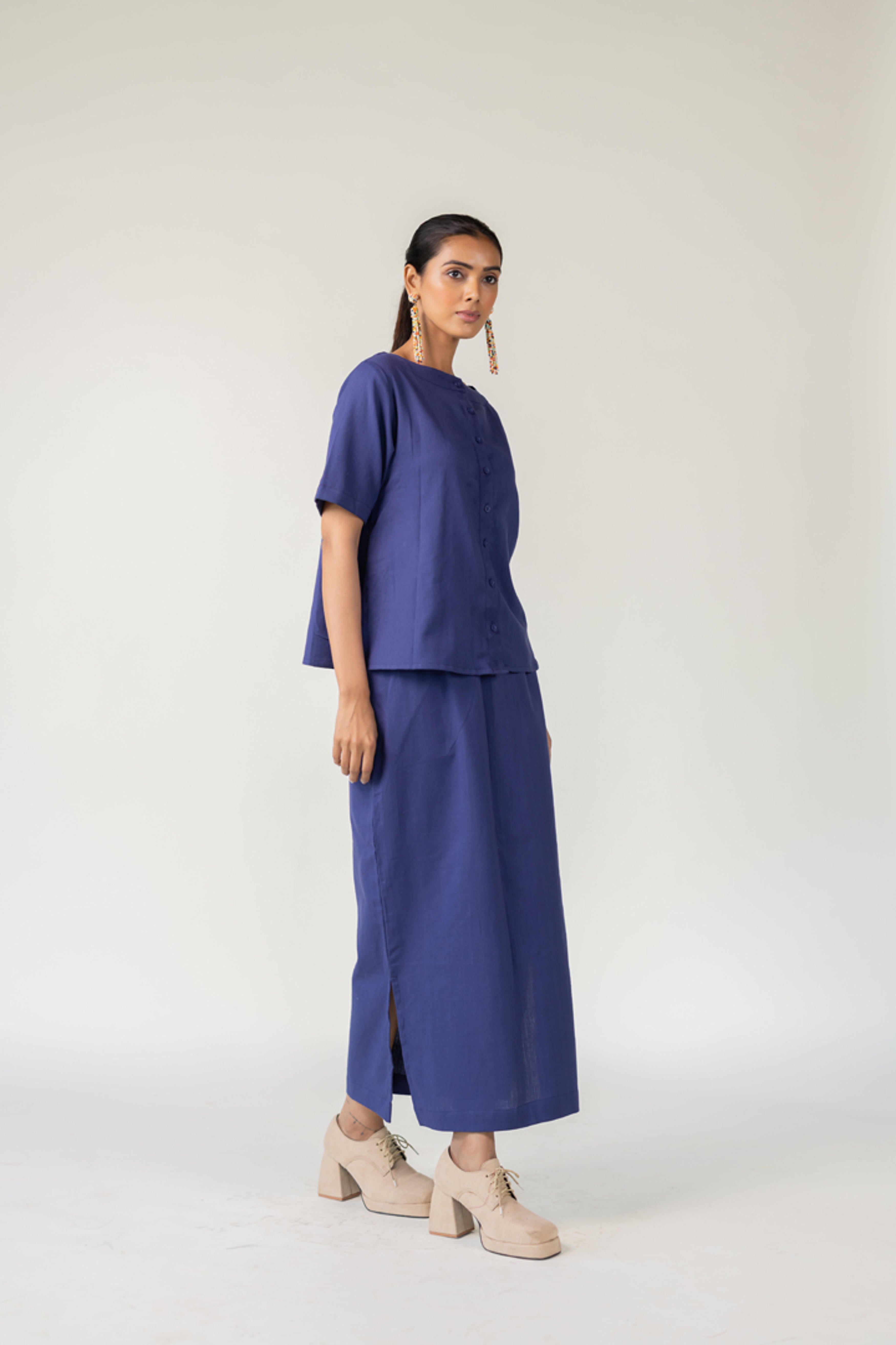 Elevate your everyday wardrobe with our Indigo City-goer Skirt Set ? a contemporary blend of comfort and structure. Crafted from breathable cotton, this co-ord set features a boxy top with a functional front placket. Paired with straight-cut ankle-length skirt, the silhouette offers a relaxed yet tailored feel. The rich indigo hue brings timeless elegance, while side slits enhance ease of movement. Model is 5?7? and wearing size M Length: Skirt - 38" Top - 23"