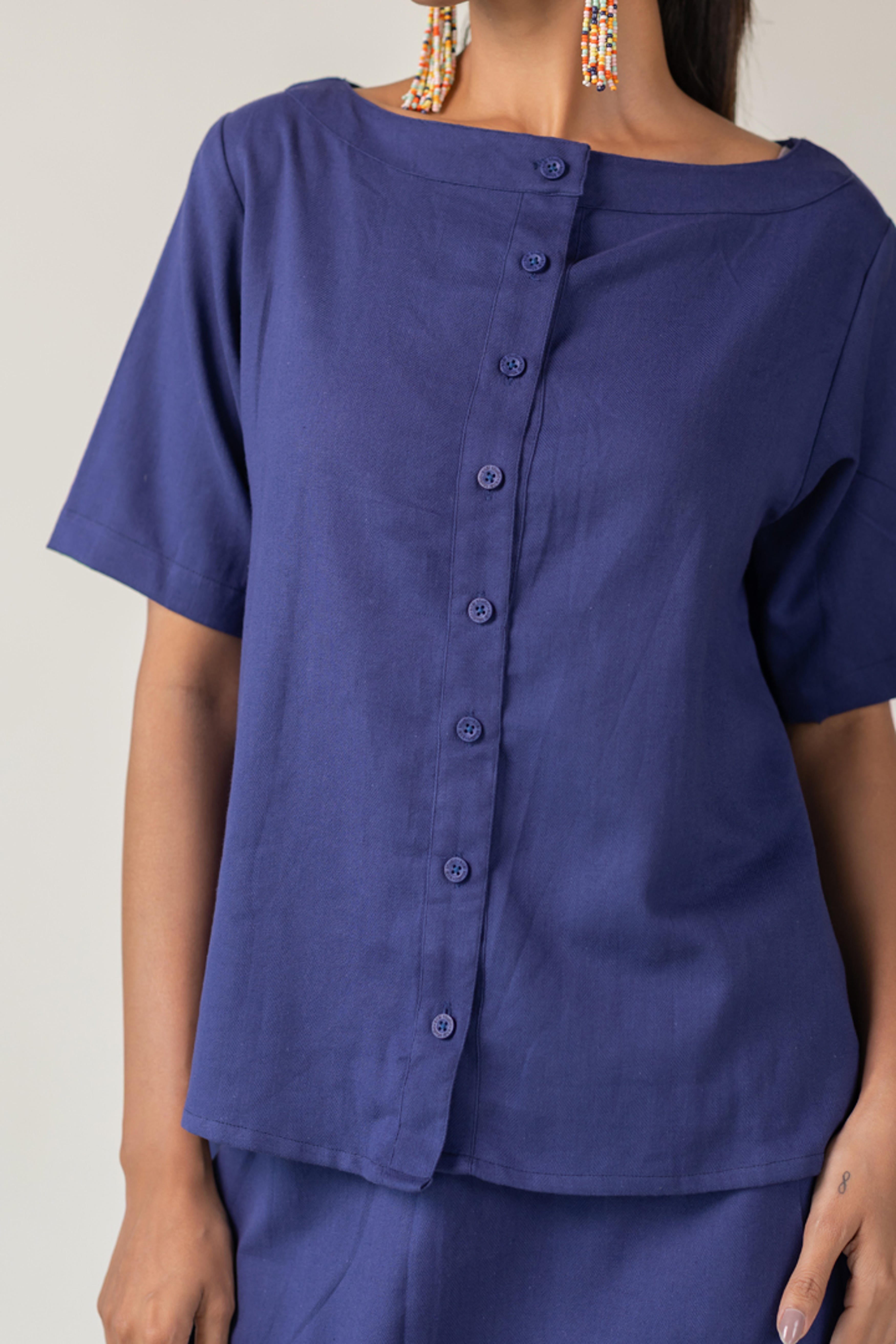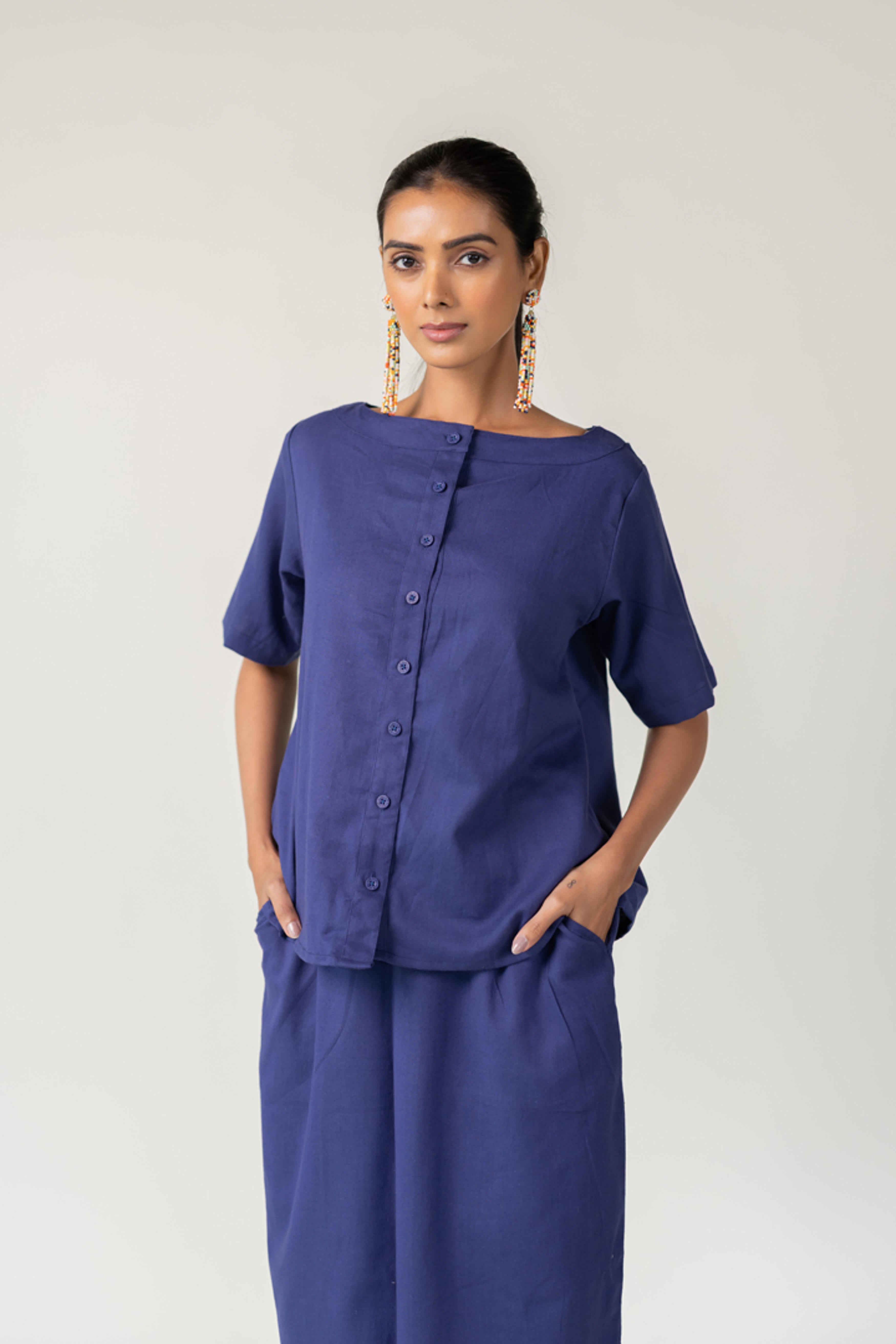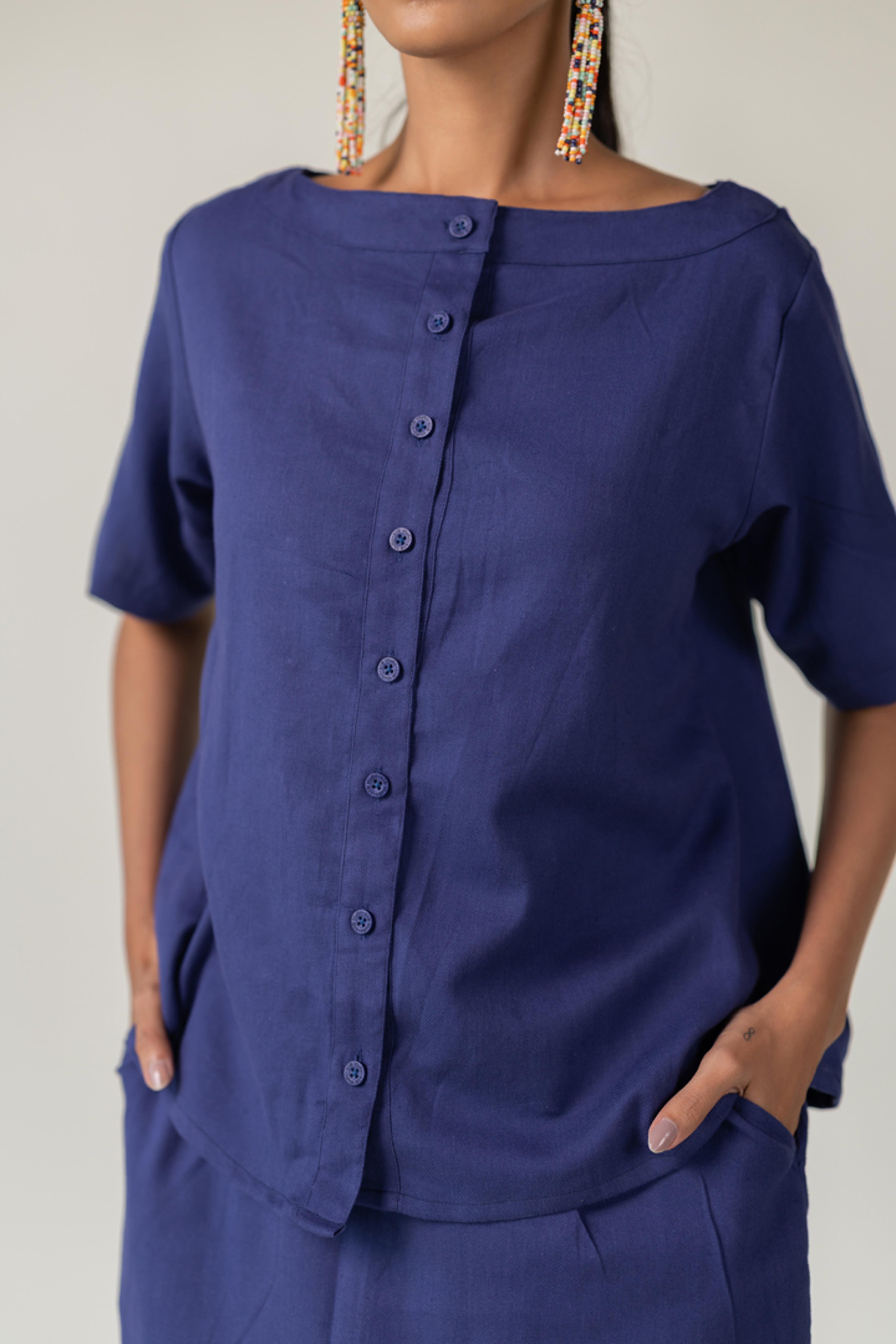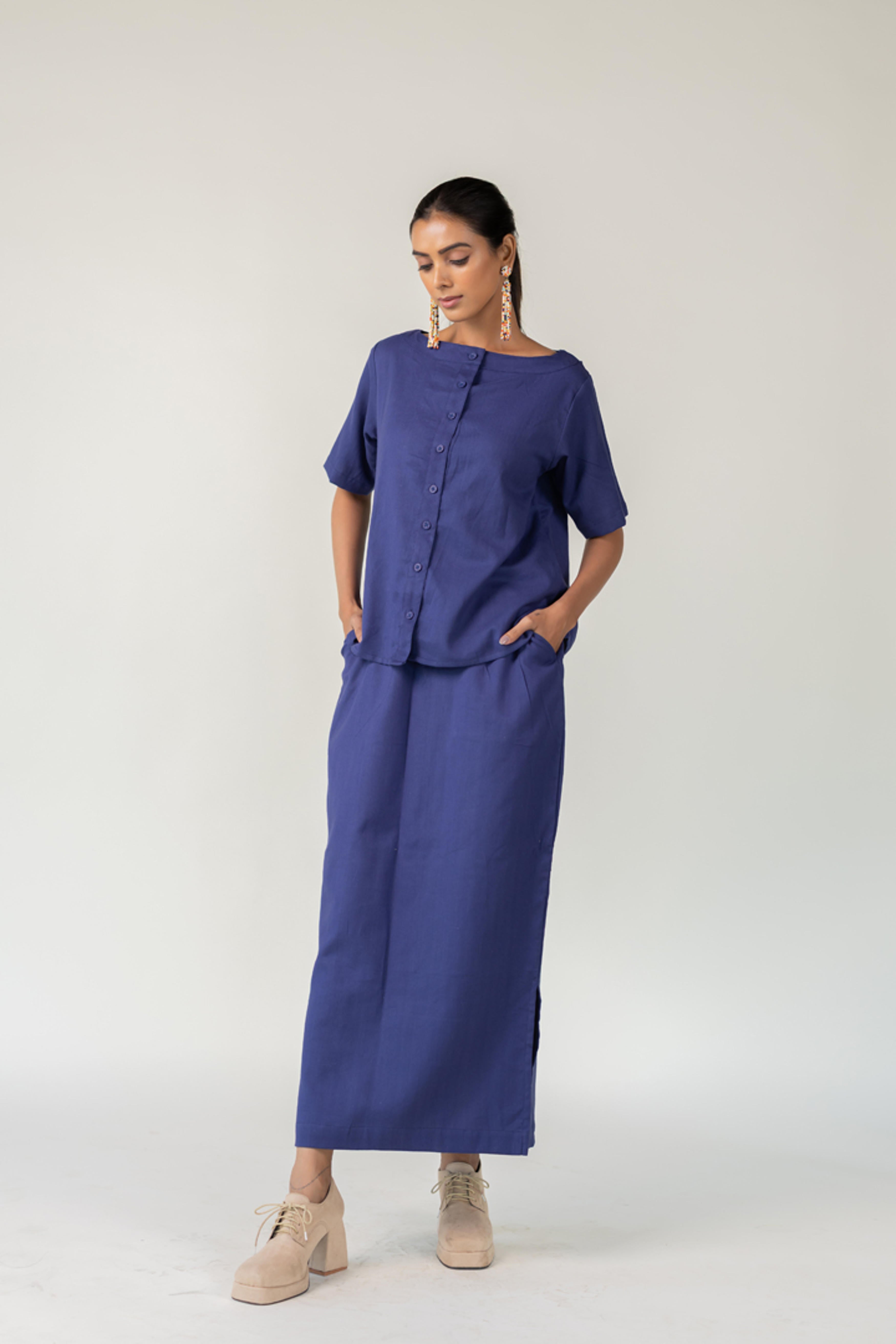 Elevate your everyday wardrobe with our Indigo City-goer Skirt Set ? a contemporary blend of comfort and structure. Crafted from breathable cotton, this co-ord set features a boxy top with a functional front placket. Paired with straight-cut ankle-length skirt, the silhouette offers a relaxed yet tailored feel. The rich indigo hue brings timeless elegance, while side slits enhance ease of movement. Model is 5?7? and wearing size M Length: Skirt - 38" Top - 23"