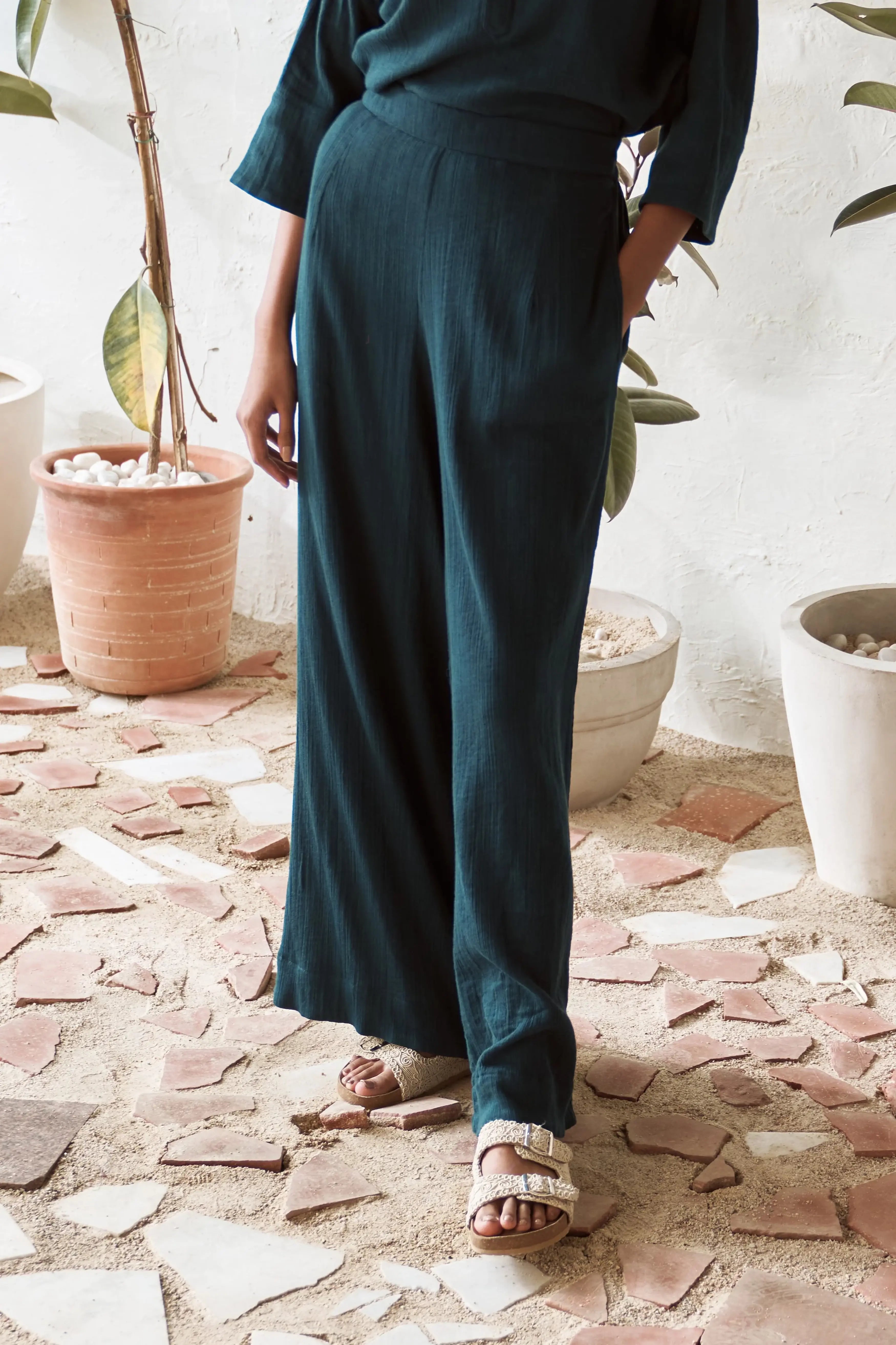 Iris Pants in a stylish teal color, perfect for elevating your casual wardrobe with a blend of comfort and modern style. Crafted from textured crinkle fabric, these pants boast wide, full-length legs with chic broad folds at the bottom, adding a touch of contemporary flair to your outfit. The half-elasticated waistband provides a relaxed and comfortable fit, ideal for leisurely outings.