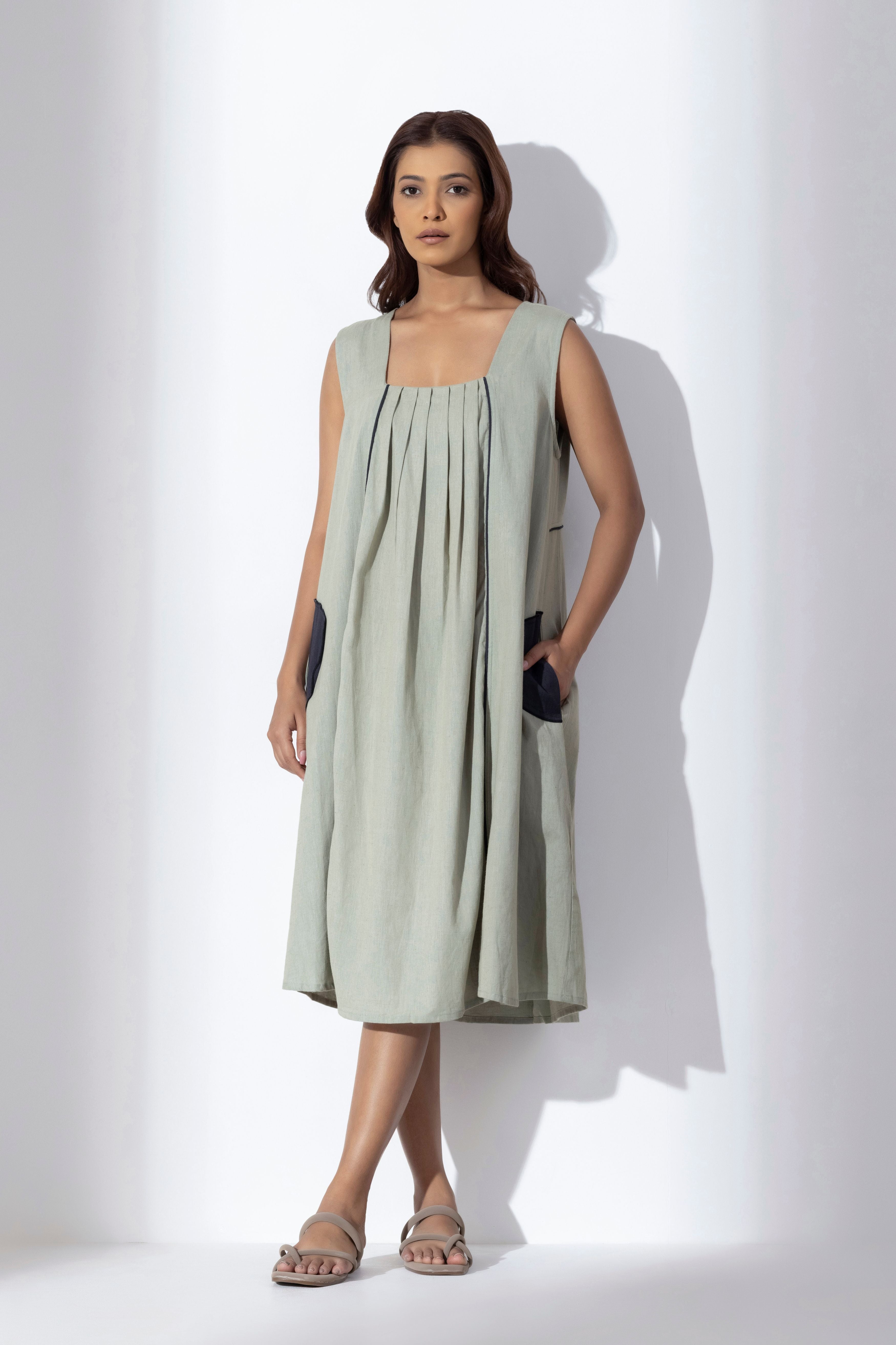 Isla Dress crafted in light weight breathable chambray cotton fabric is perfect for days you want to feel free yet thoughtfully put together. This sleeveless midi dress in muted sage green tone features contrast black piping details and soft pleats front and back to add movement and texture. Playful black applique panel detailing on the side pockets add a modern twist, making Isla as functional as it is stylish. Side pockets with doodled applique work Front and back contrast black piping detail Front and back pleats  Midi dress Model is wearing a size S This is a textile fabric. The subtle imperfections in the weave, texture and colors are a natural outcome of handcrafted textiles and not a defect.