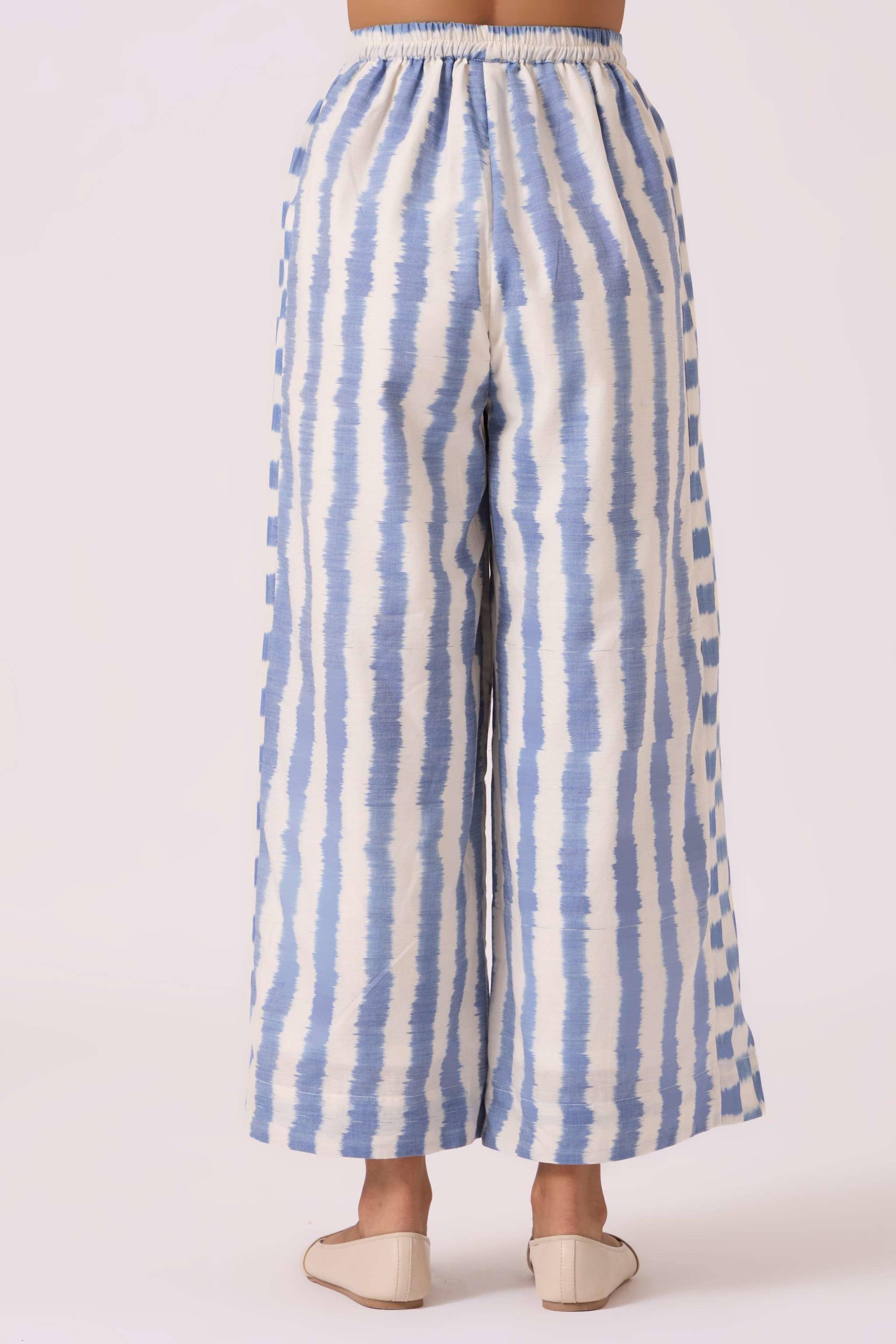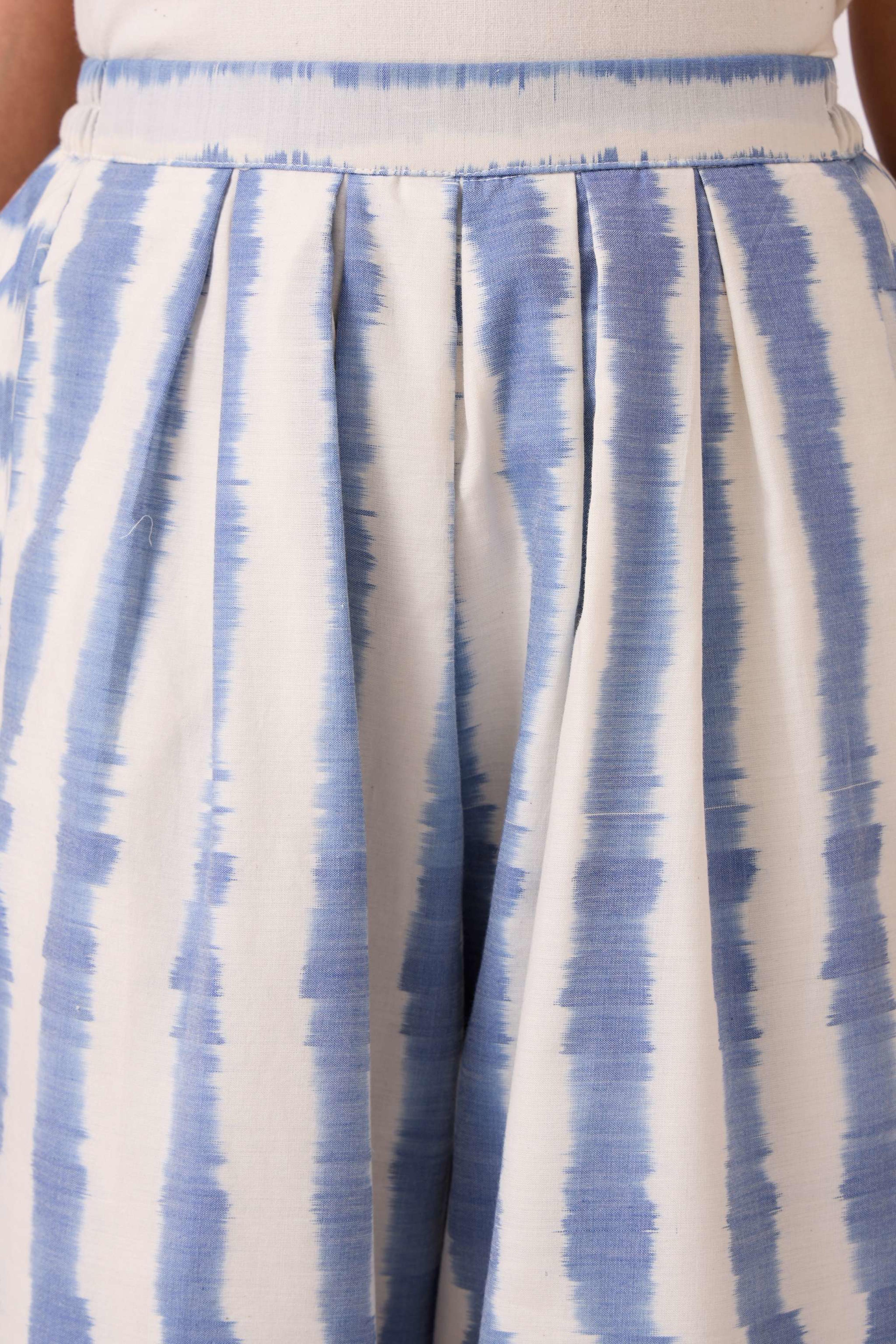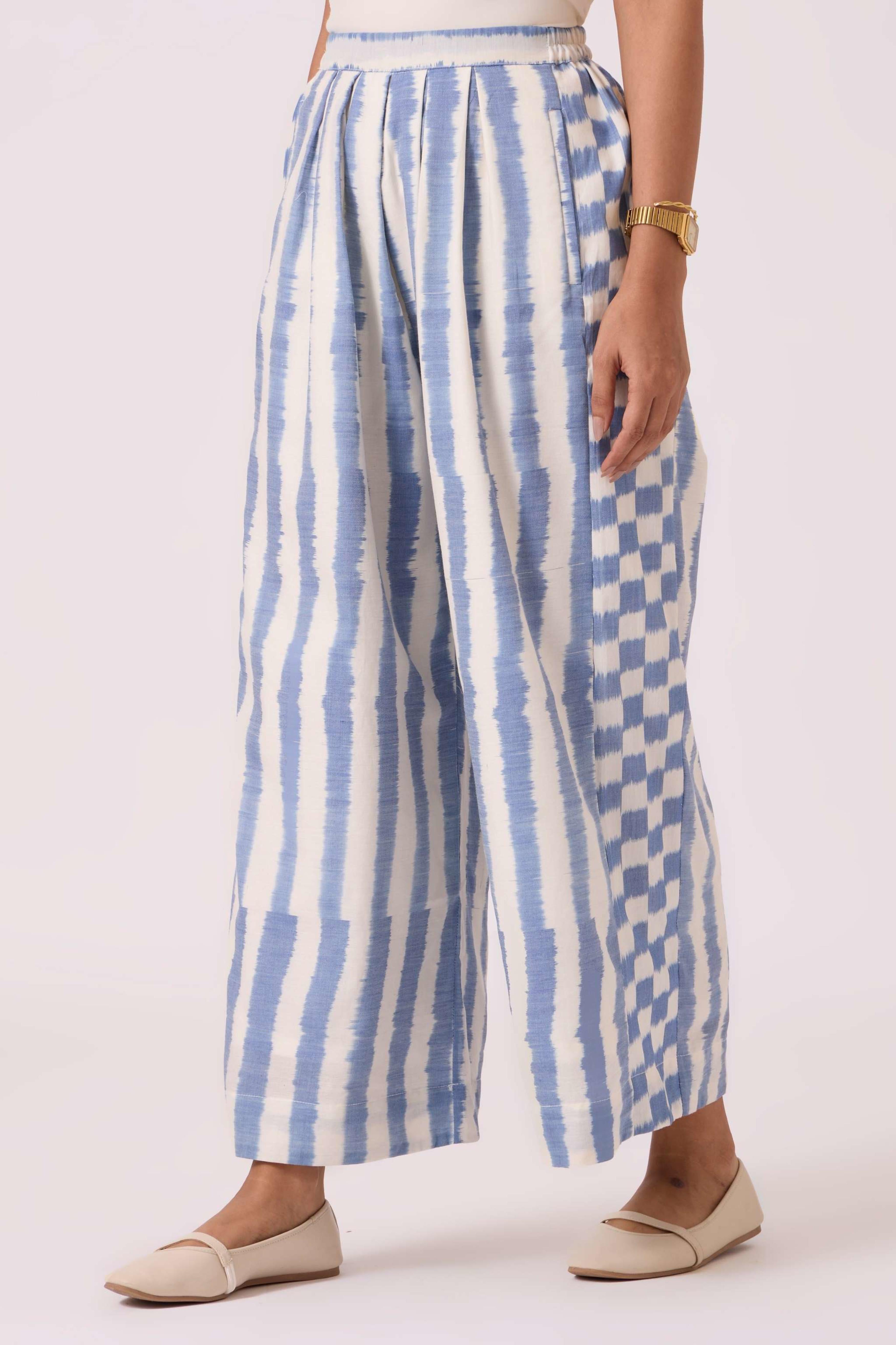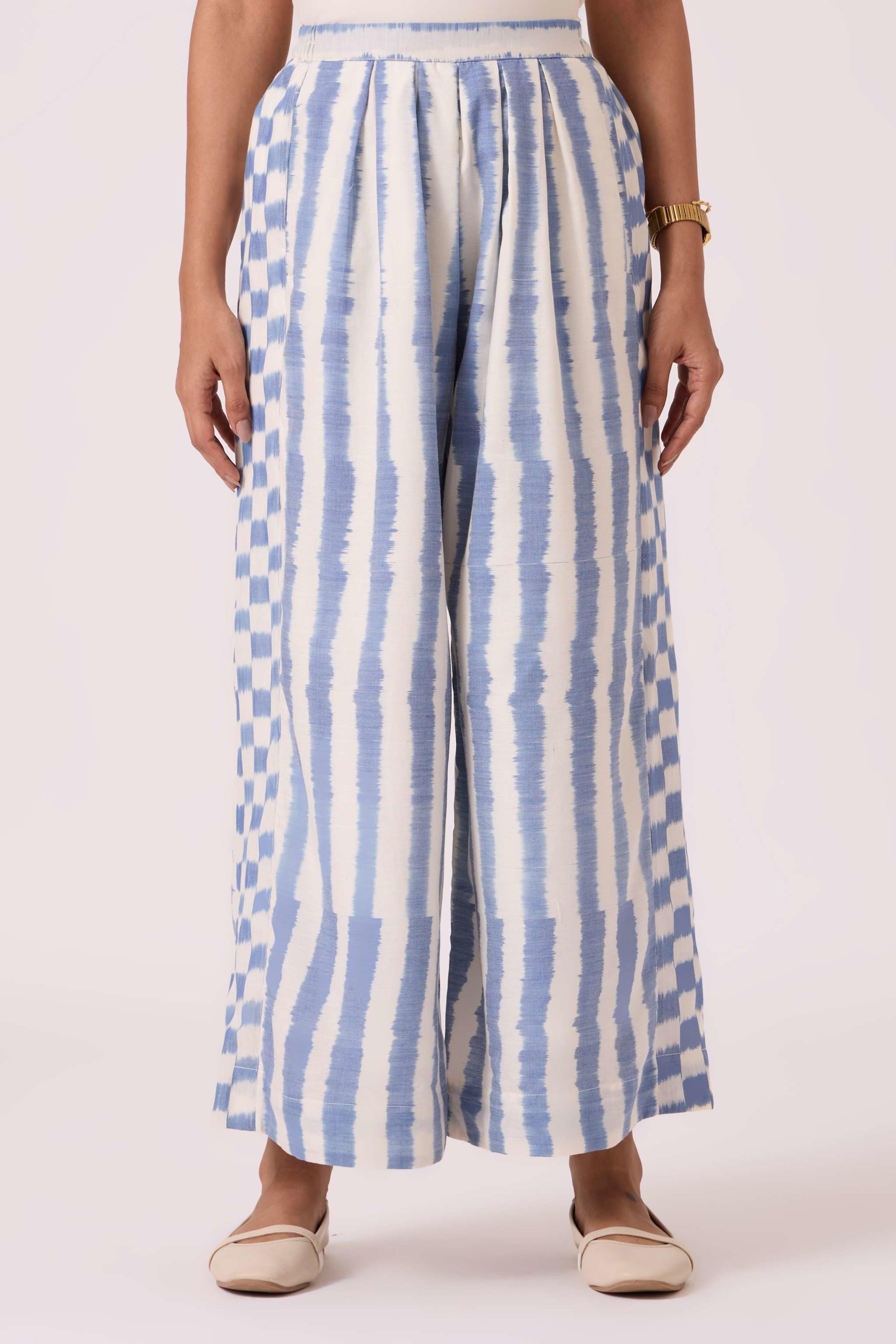 These *wide-leg, regular-fit pants* feature *box pleats* at the waist for a structured look and an *elasticated back* for comfort. They include practical *welt pockets* and are *fully lined*. The pants are made from a studio-developed *Ikat design* that is *handwoven by artisans in Telangana*. The text notes that any slight irregularities in the fabric are a natural characteristic of the handmade process. For sizing reference, Chhavi, who is 5'6", is wearing an XS.