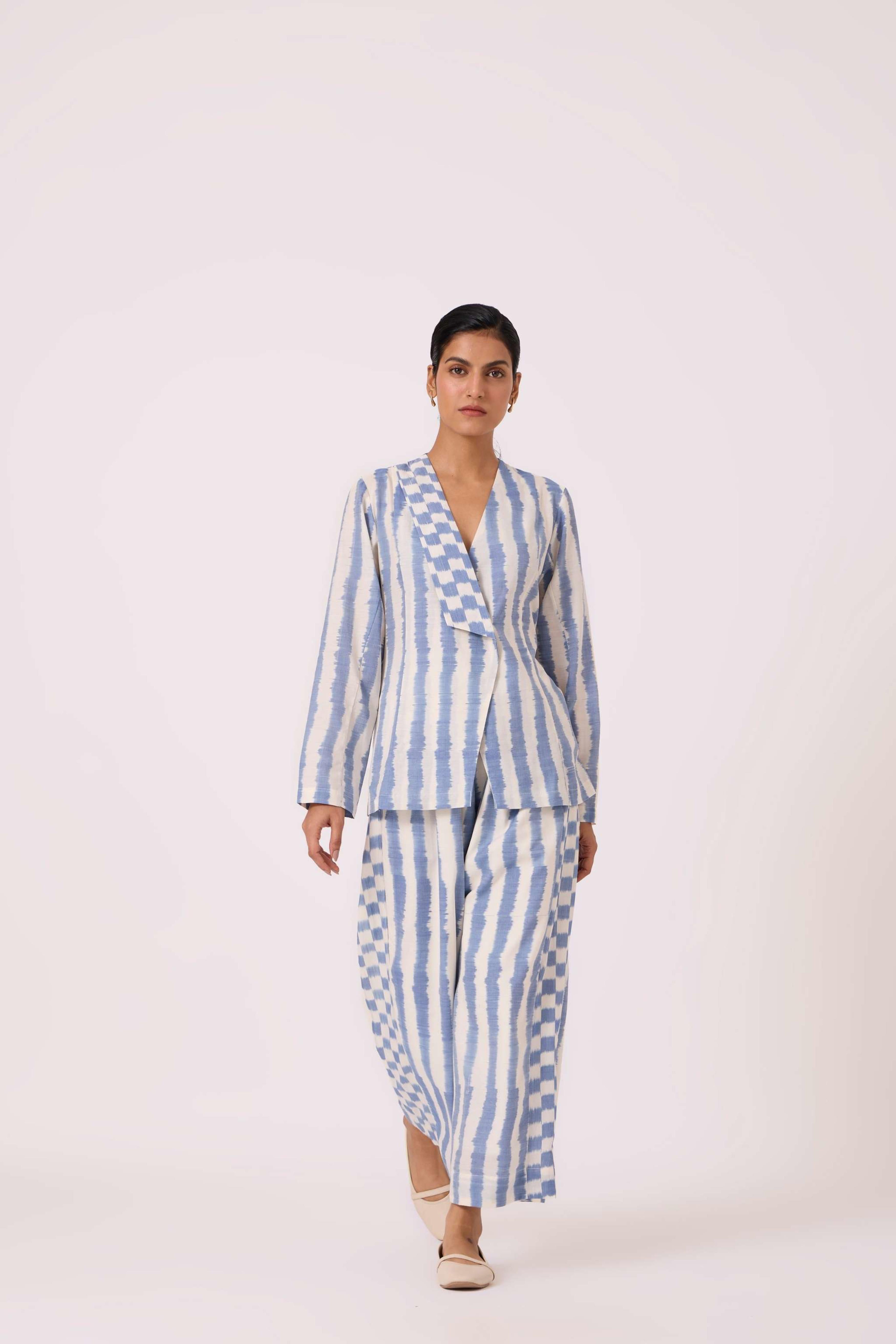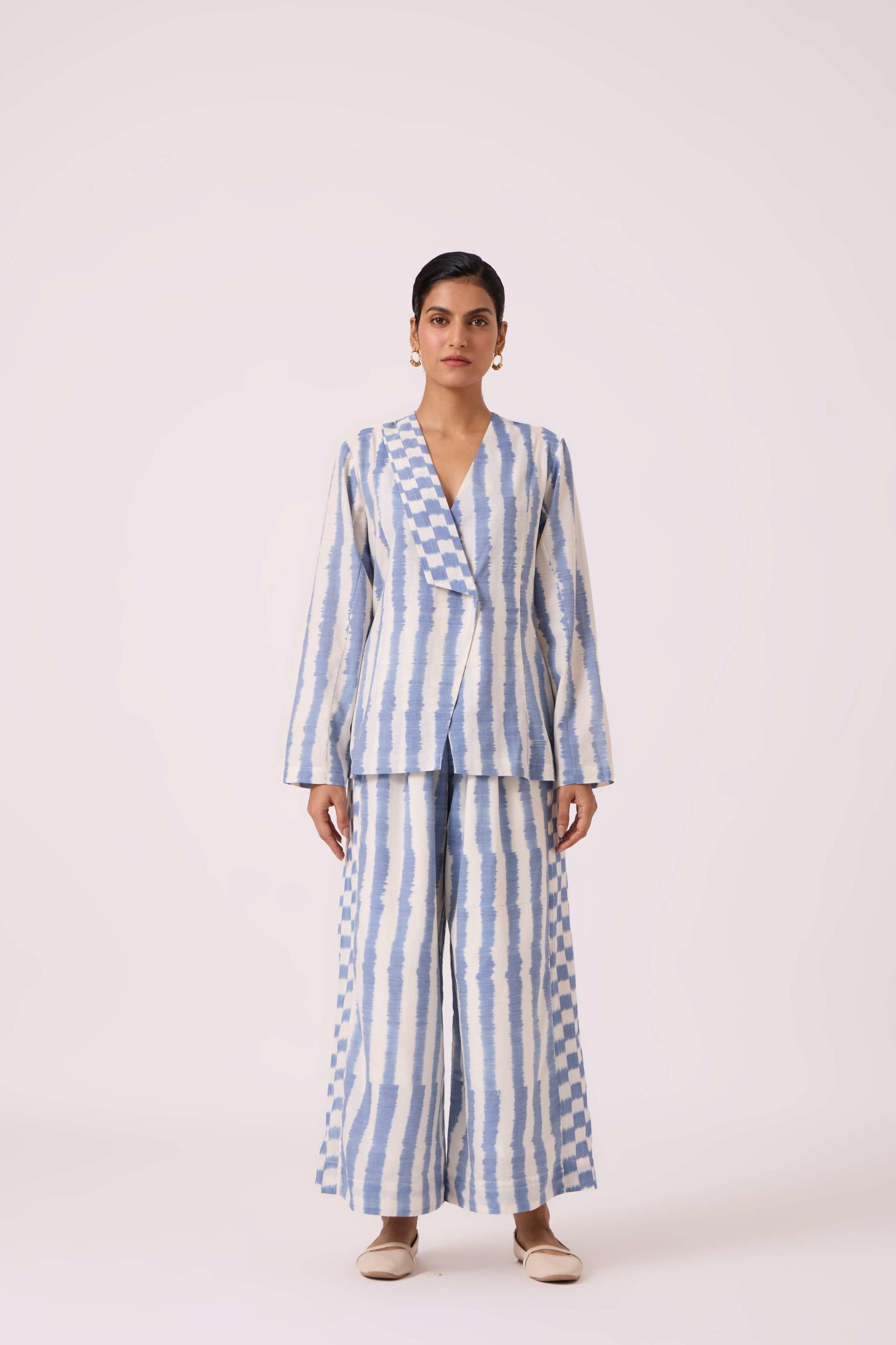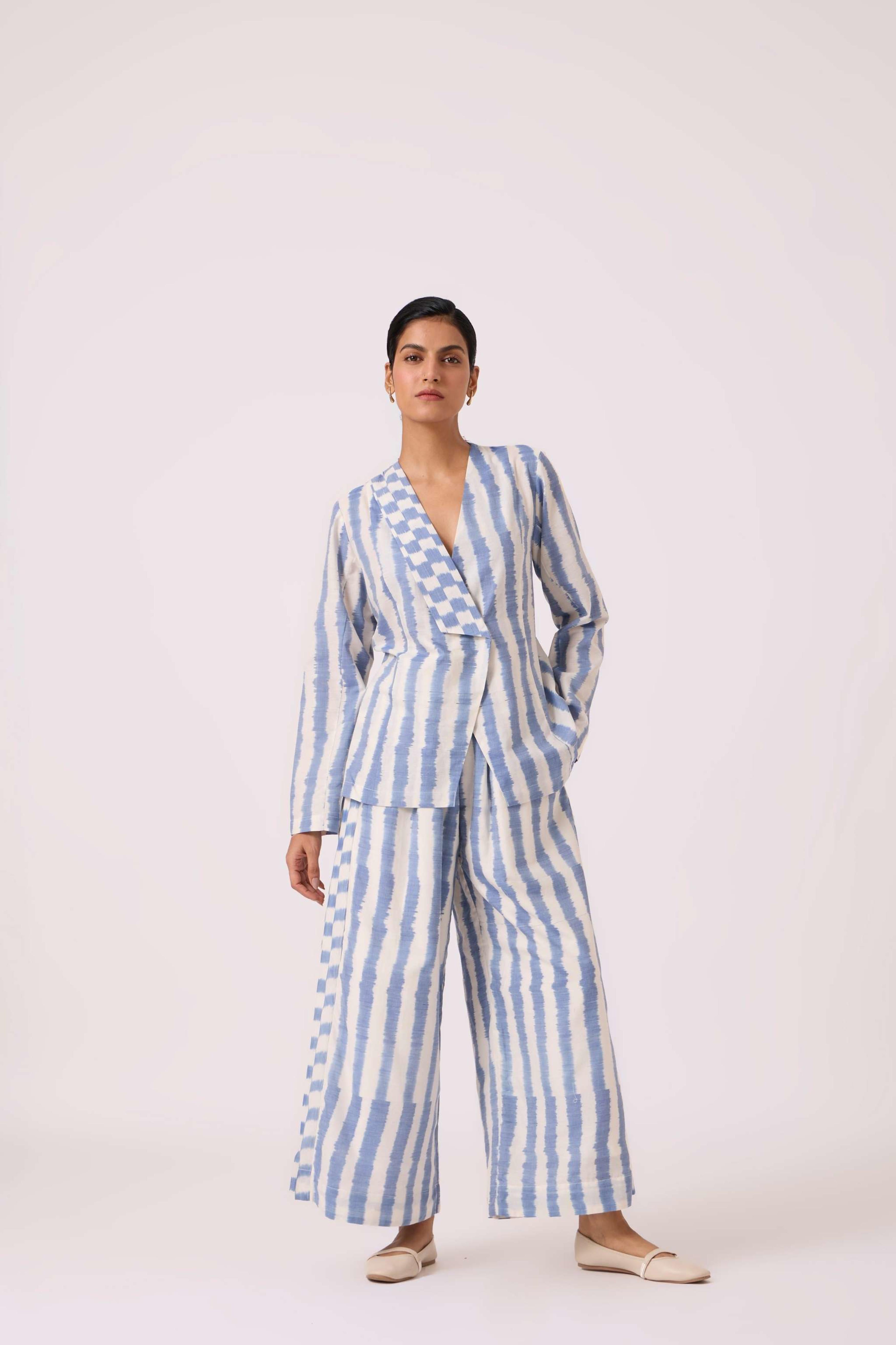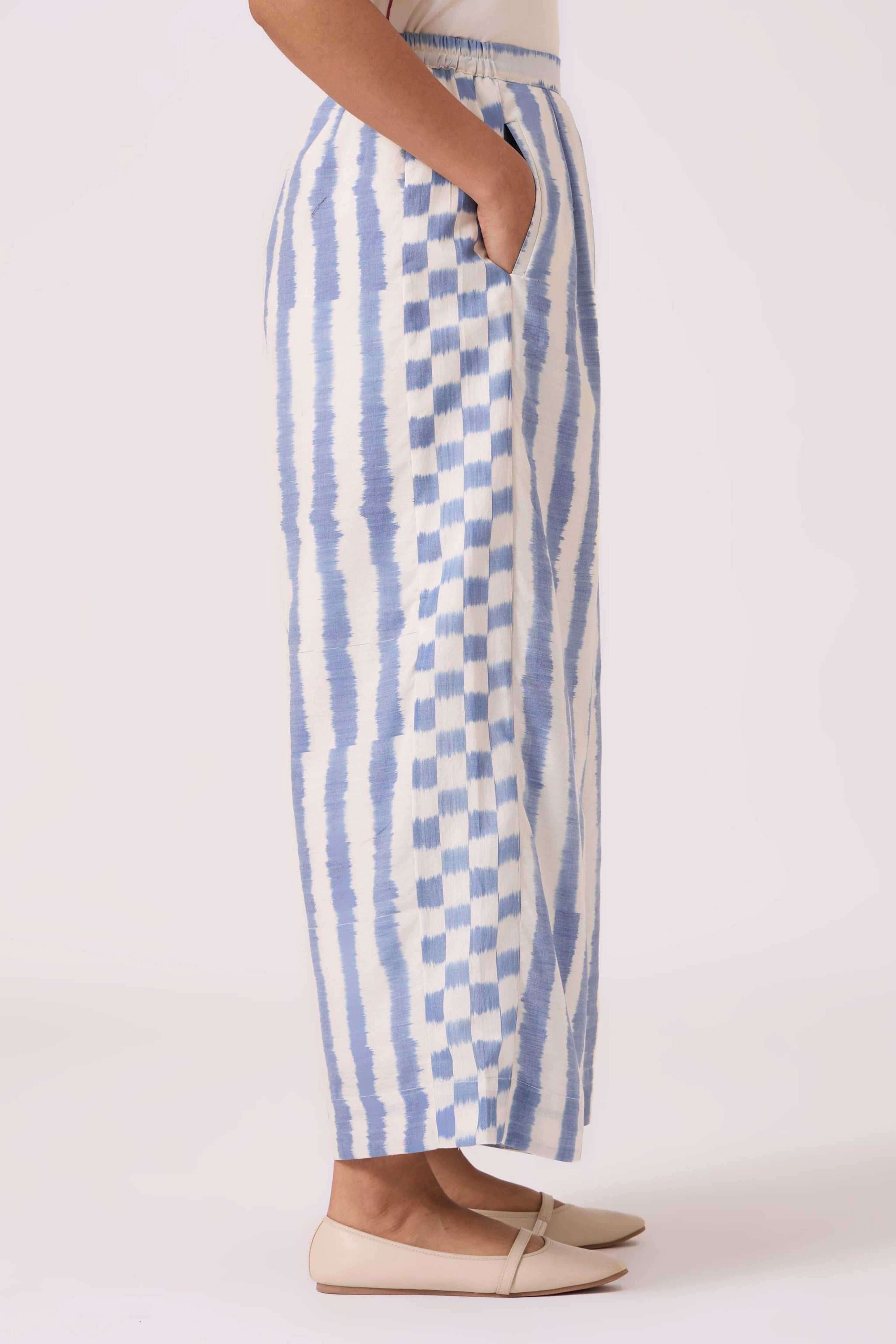 These *wide-leg, regular-fit pants* feature *box pleats* at the waist for a structured look and an *elasticated back* for comfort. They include practical *welt pockets* and are *fully lined*. The pants are made from a studio-developed *Ikat design* that is *handwoven by artisans in Telangana*. The text notes that any slight irregularities in the fabric are a natural characteristic of the handmade process. For sizing reference, Chhavi, who is 5'6", is wearing an XS.