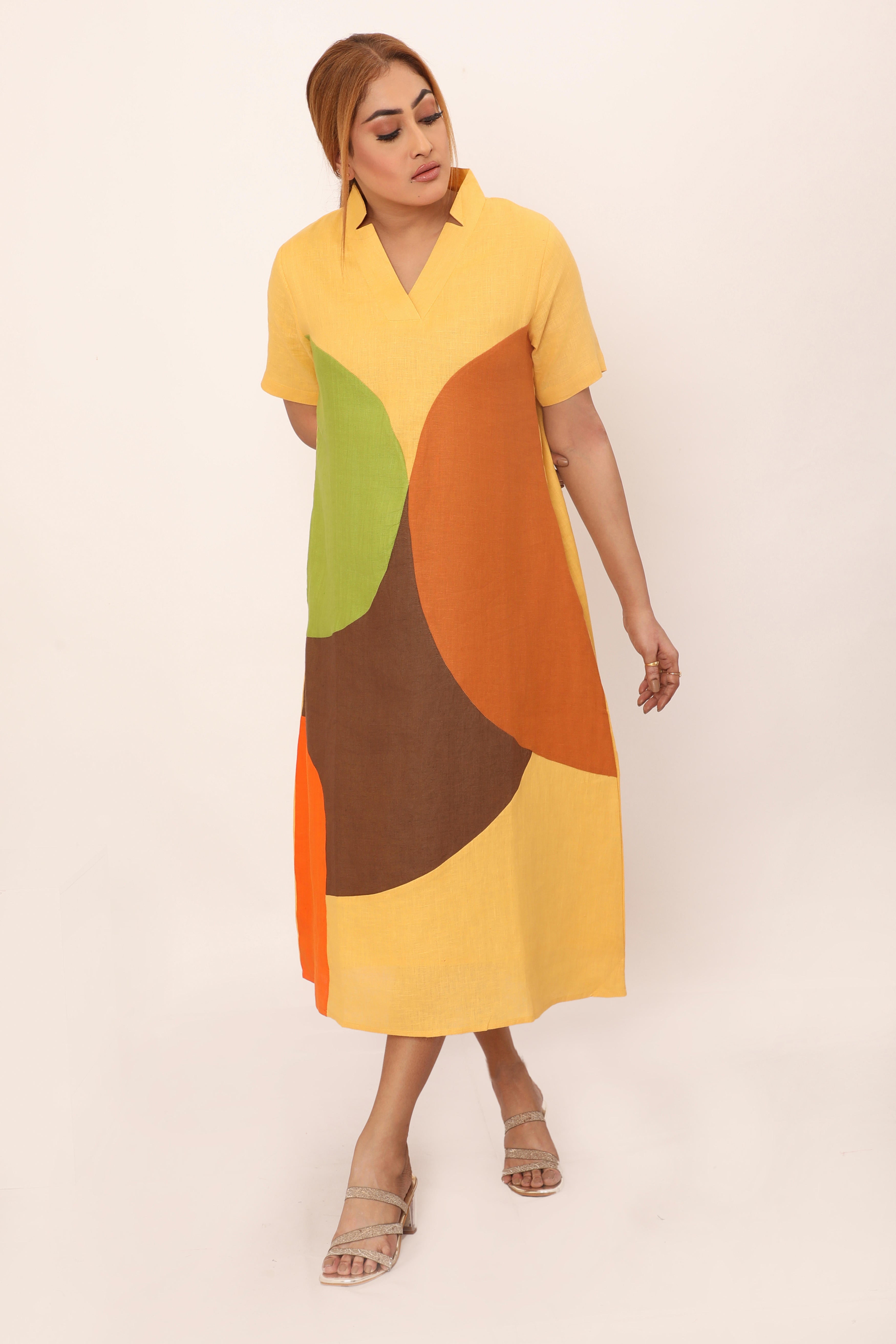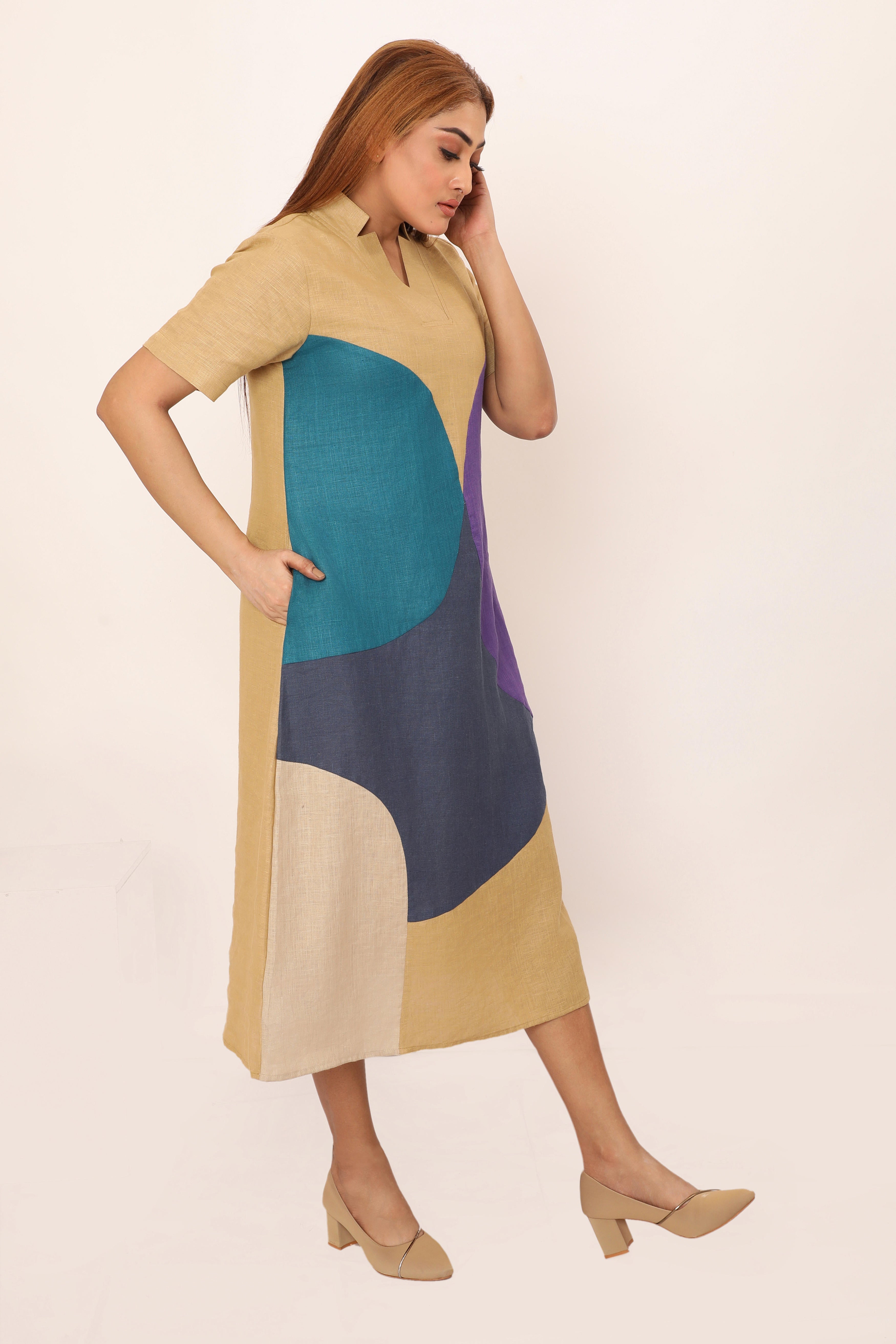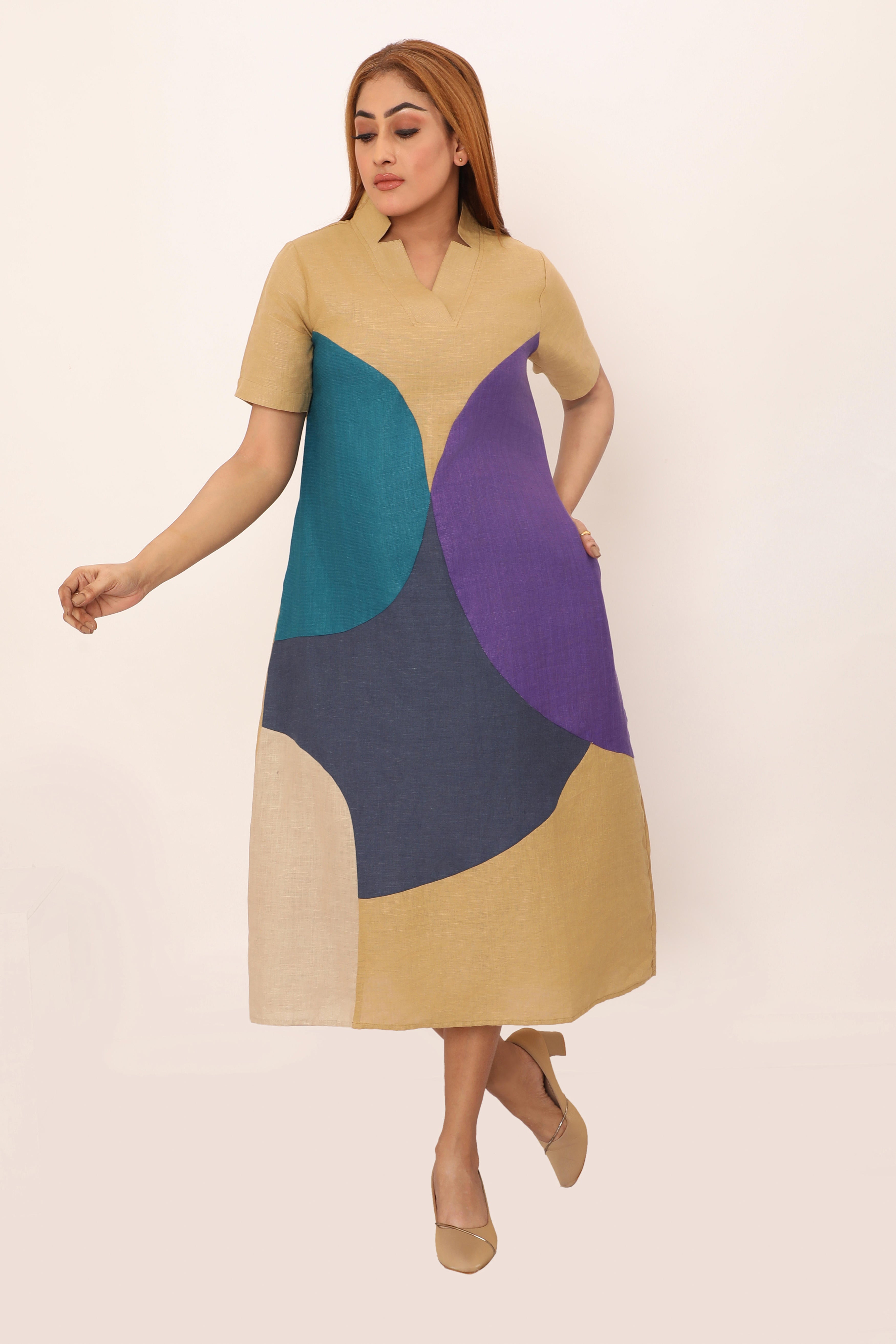 The Ivy dress is a beautiful fusion of bold colour blocking and a sleek silhouette. This midi dress features a striking abstract pattern and a tailored fit that flatters the figure while allowing ease of movement. The notched neckline and short sleeves add structure, making it a versatile choice for any occasion. Crafted from breathable fabric, this dress is perfect for transitioning from day to night with effortless style.