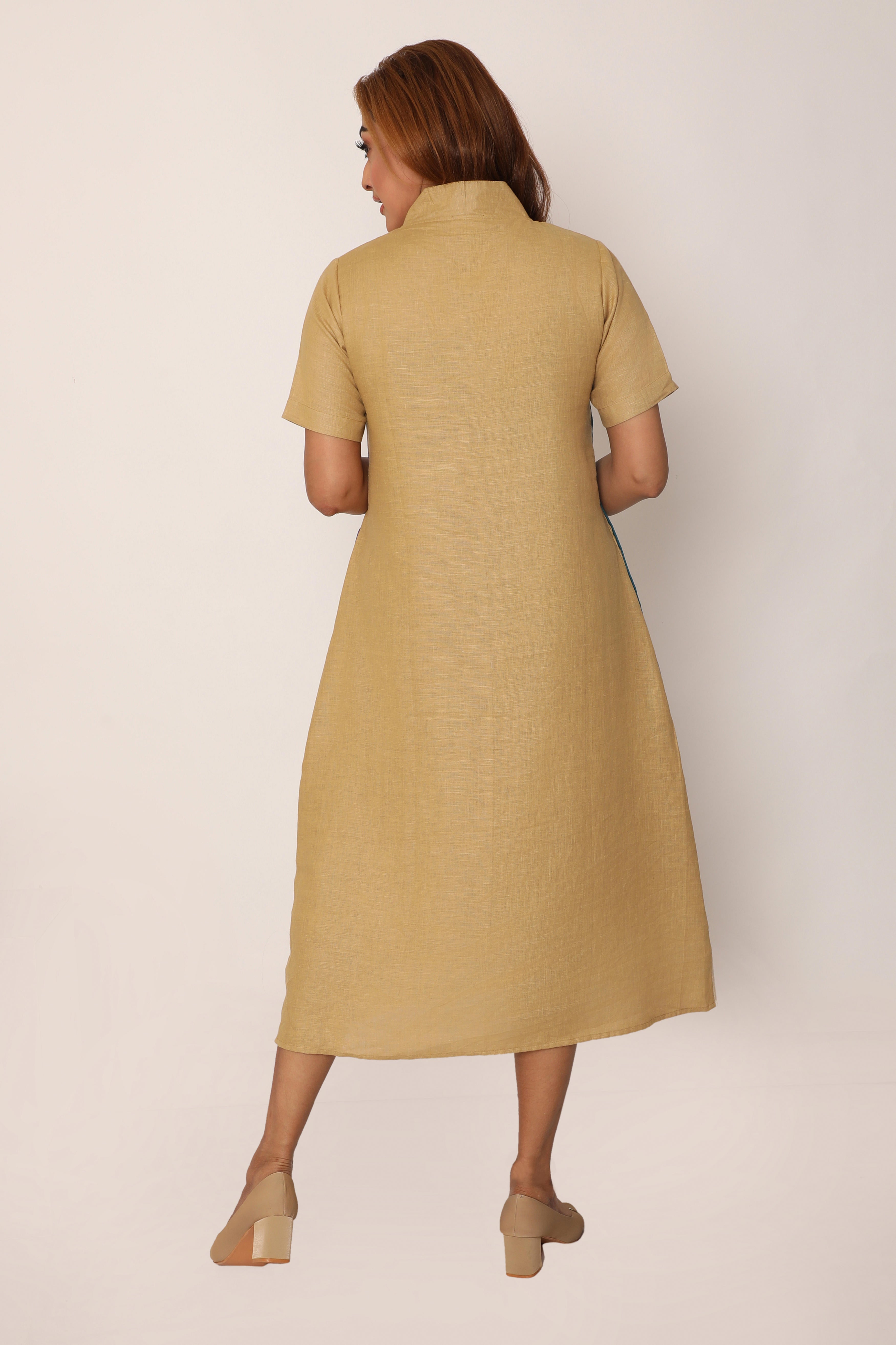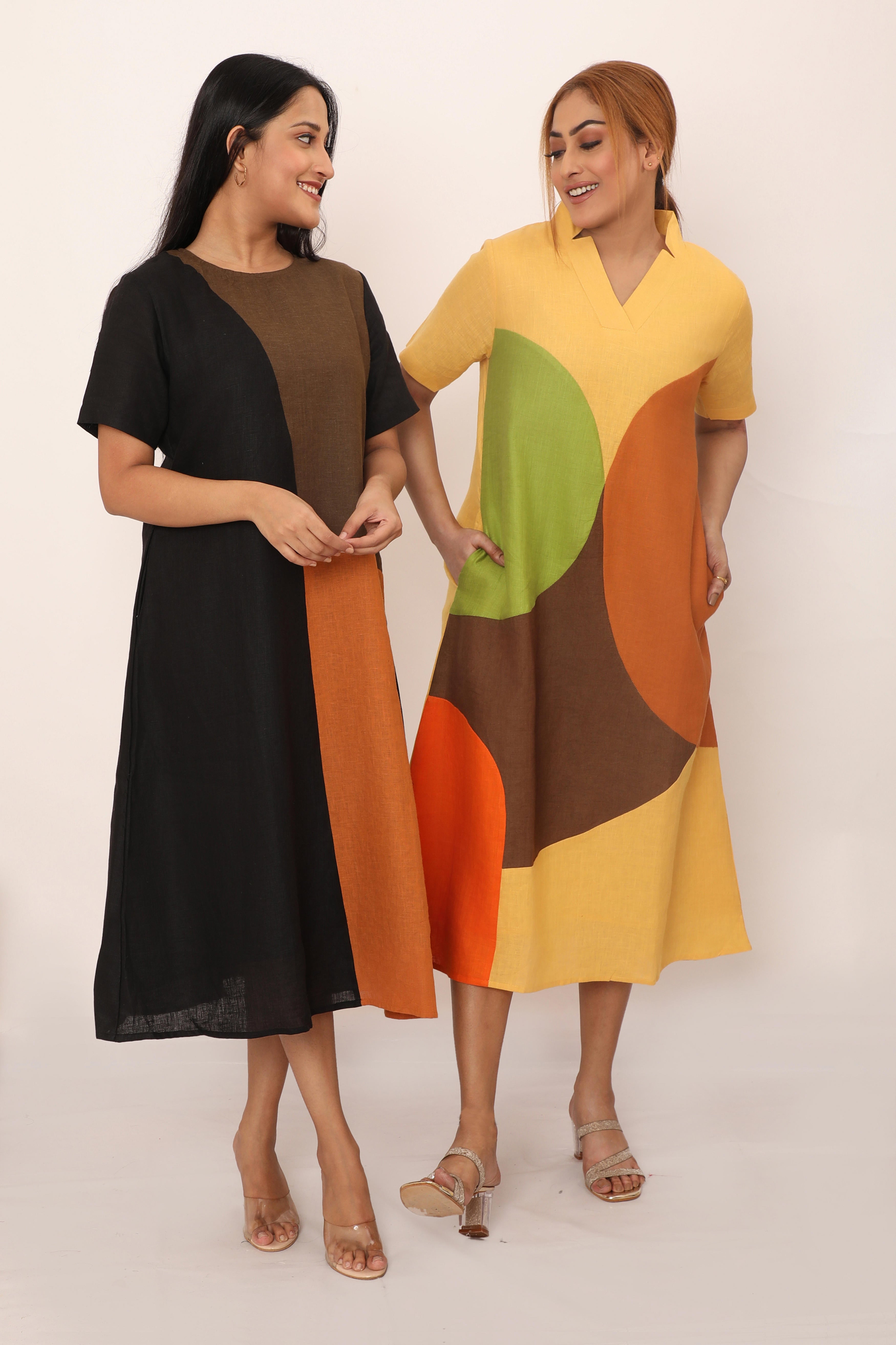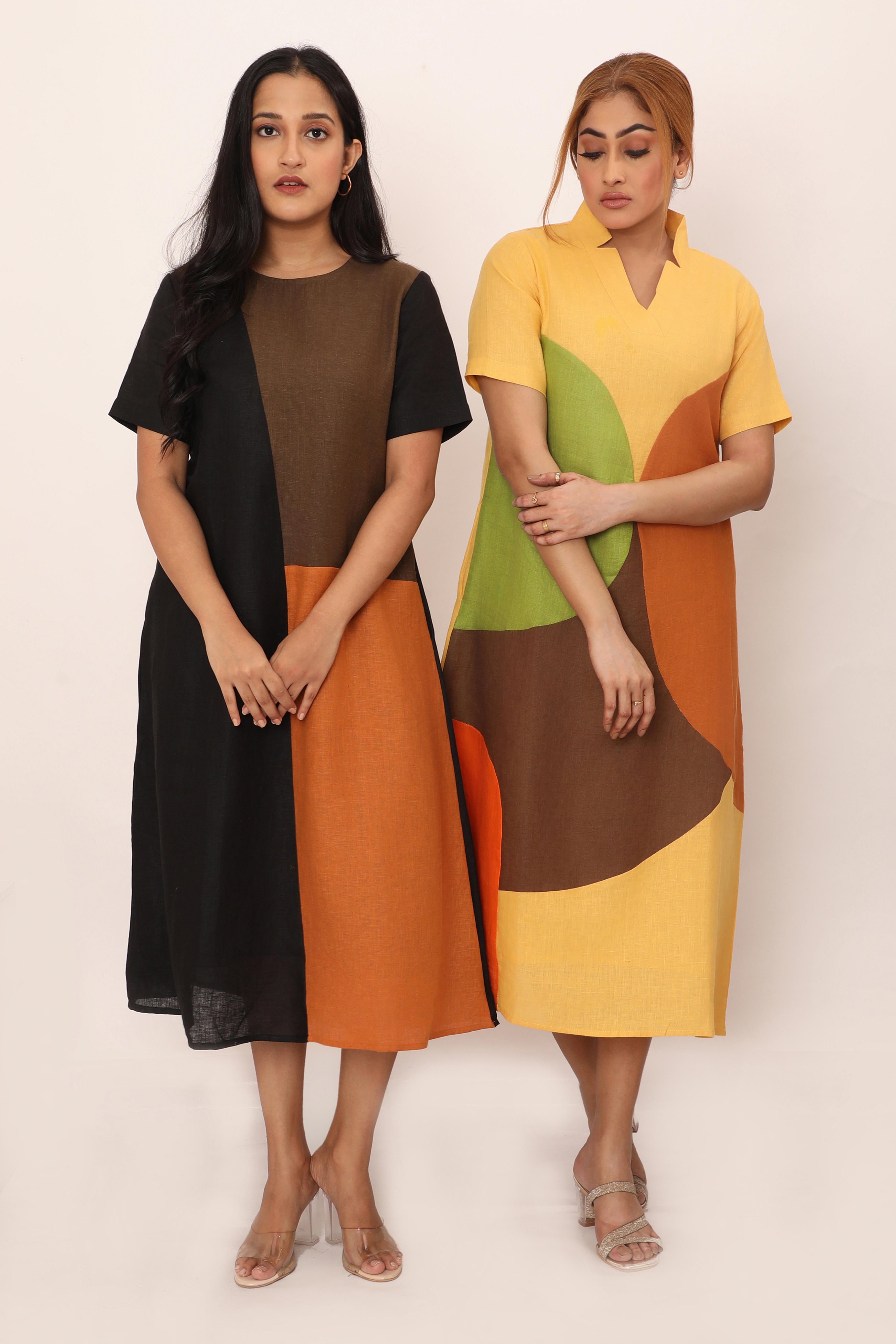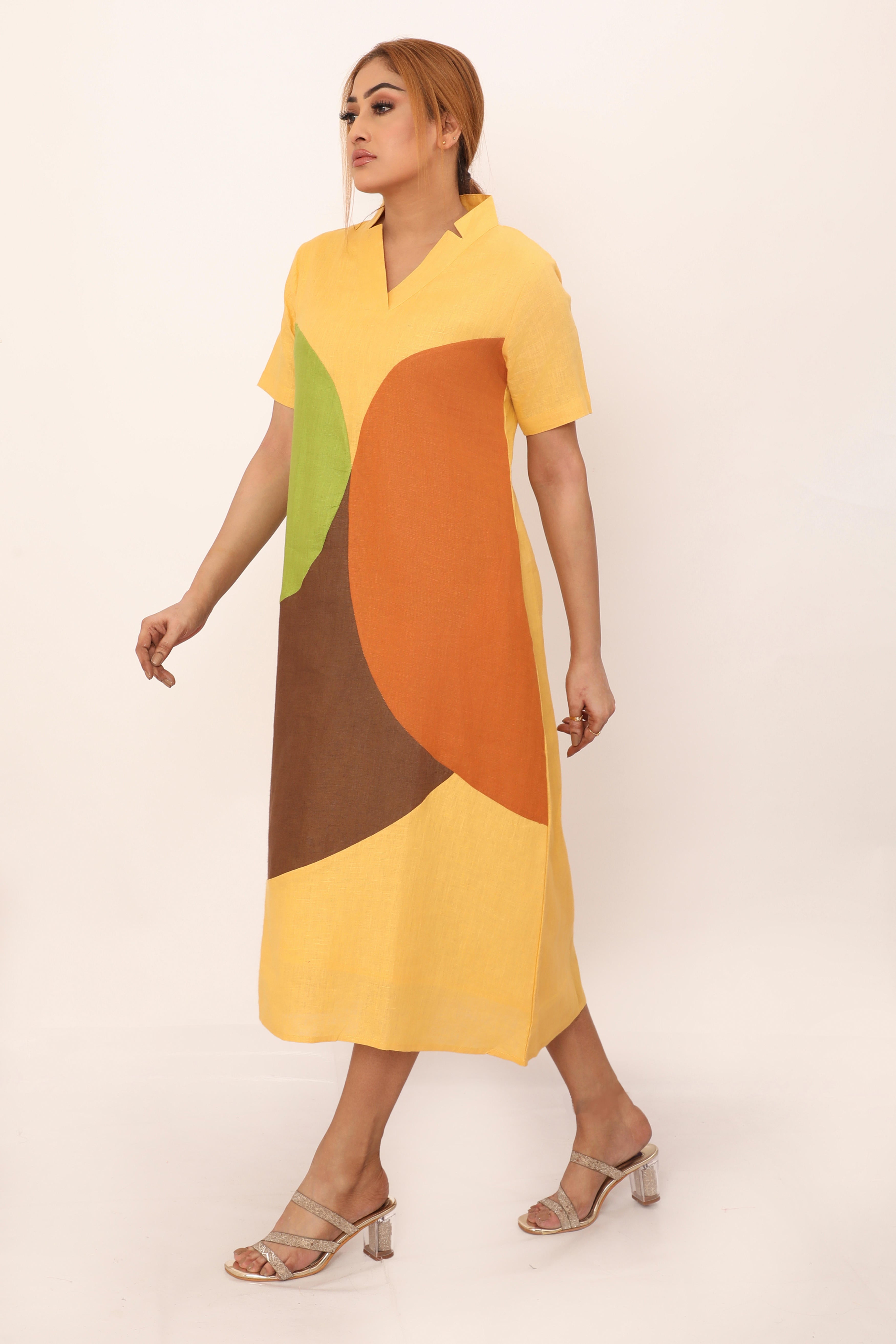 The Ivy dress is a beautiful fusion of bold colour blocking and a sleek silhouette. This midi dress features a striking abstract pattern and a tailored fit that flatters the figure while allowing ease of movement. The notched neckline and short sleeves add structure, making it a versatile choice for any occasion. Crafted from breathable fabric, this dress is perfect for transitioning from day to night with effortless style.