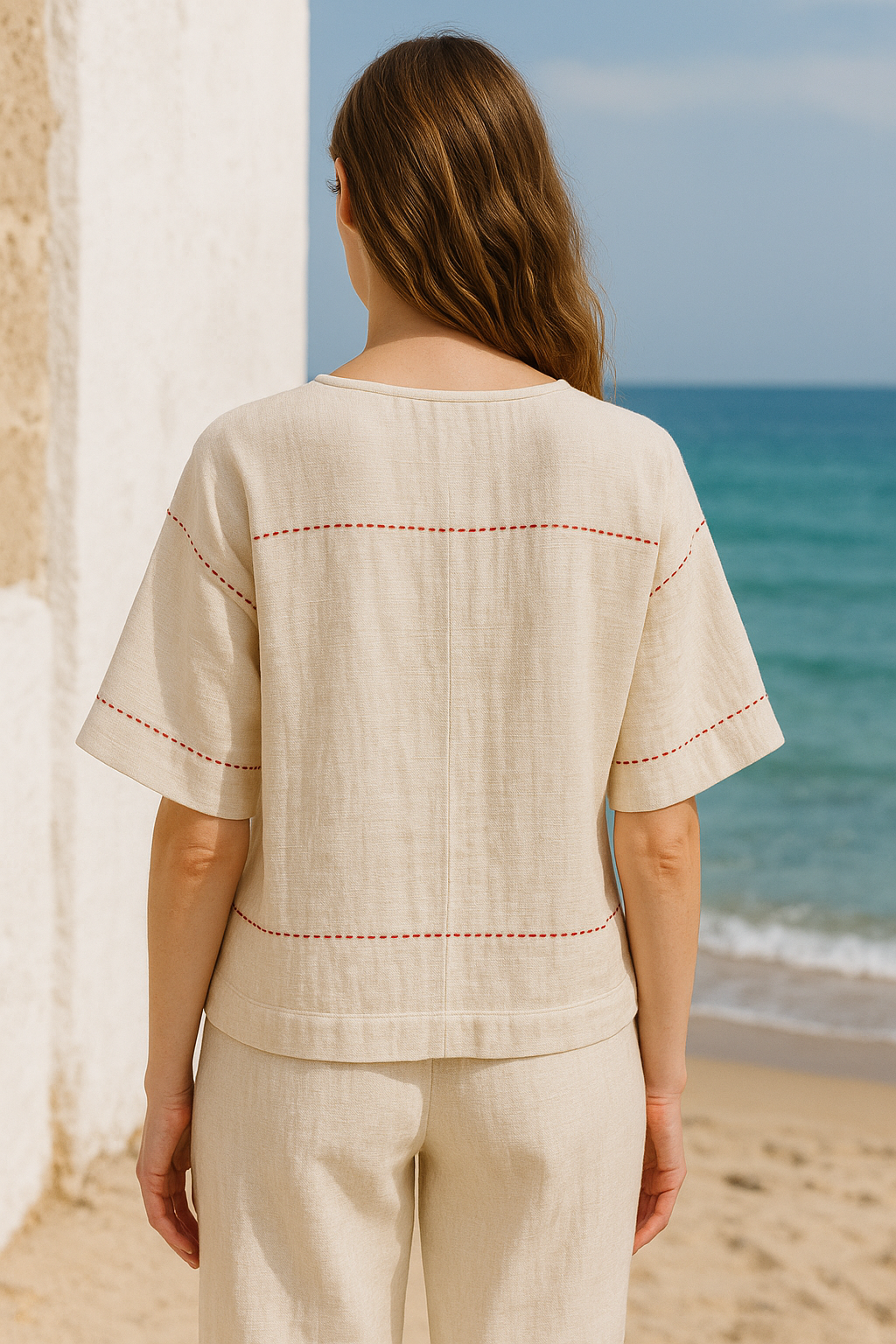 Every stitch tells a story. The Java Top is crafted in breathable organic Cotton and elevated with handsewn red thread detailing, patiently done by women artisans in rural India. Each piece carries hours of work and centuries of tradition. Designed in a boxy, relaxed silhouette, the Java Top drapes with ease, offering effortless style for everyday wear. The drop shoulders, straight hem, and natural volume make it versatile enough to pair with trousers, skirts, or denims.