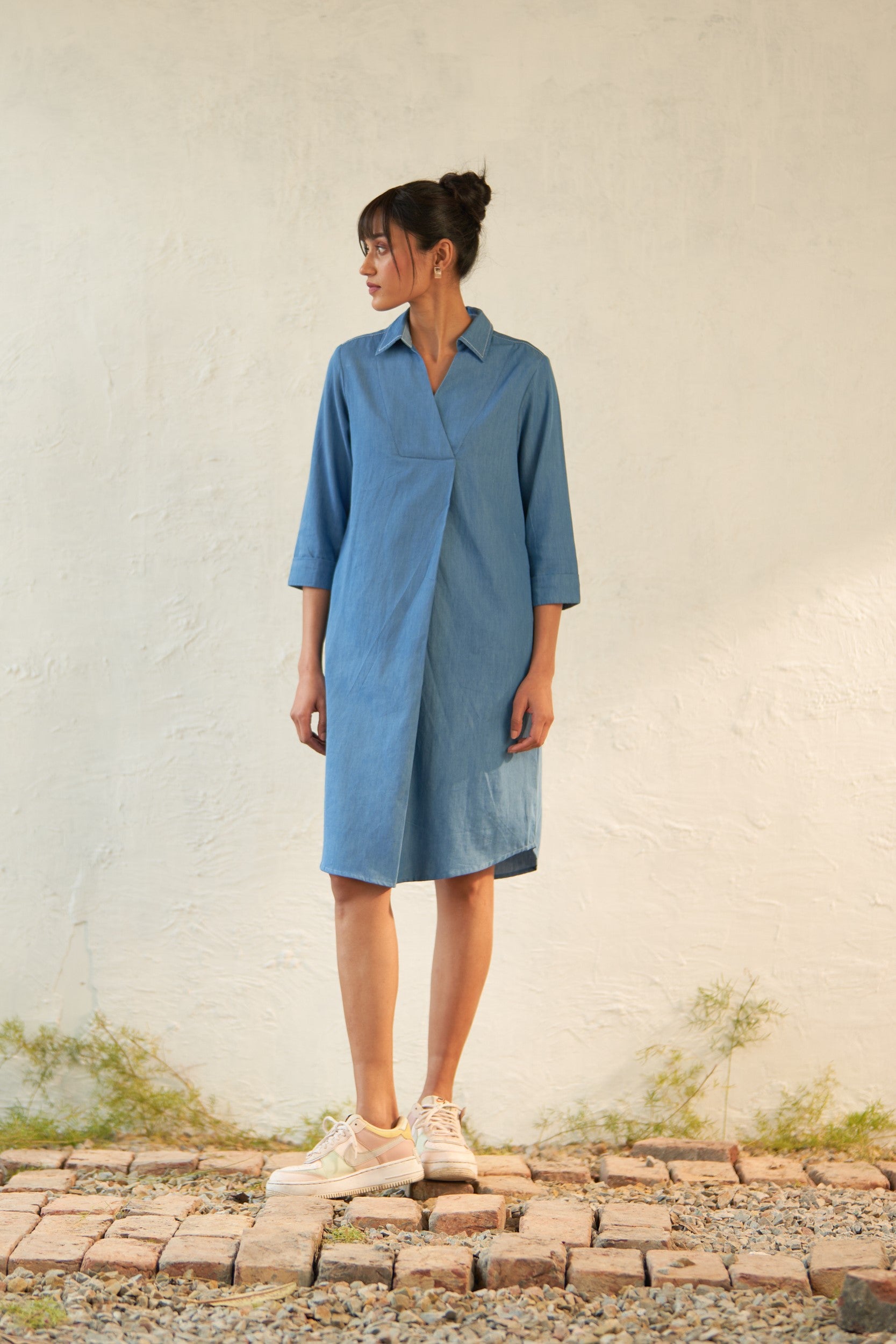 This denim dress seamlessly blends elegance with modernity. It's designed with a distinctive overlapping pleat at the back, creating a soft A-line silhouette. Complete with a classic collared neckline, effortlessly foldable sleeves, and a stylish U-shaped hemline, it exudes sophistication. Elevate your wardrobe with this piece for a chic and confident statement.