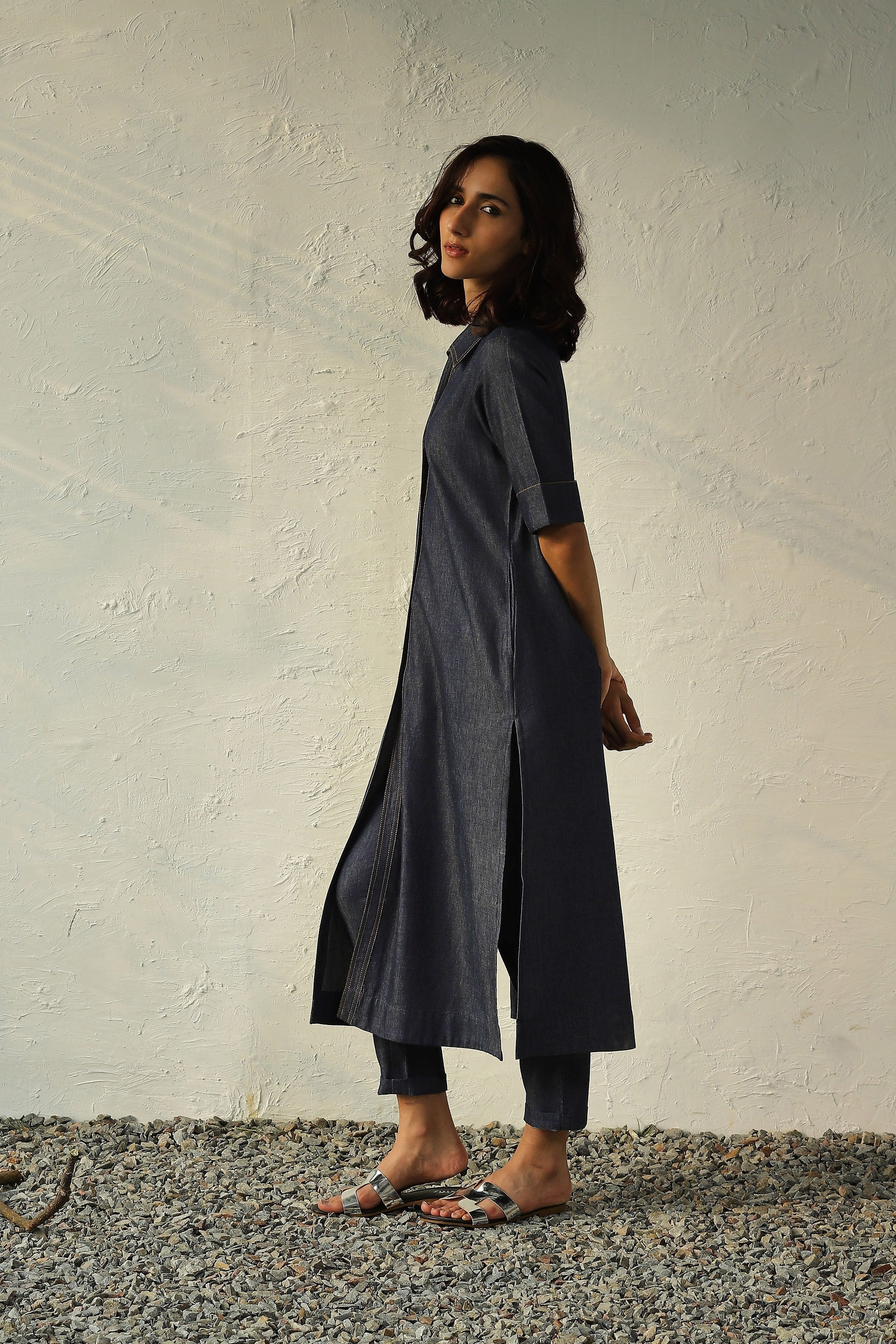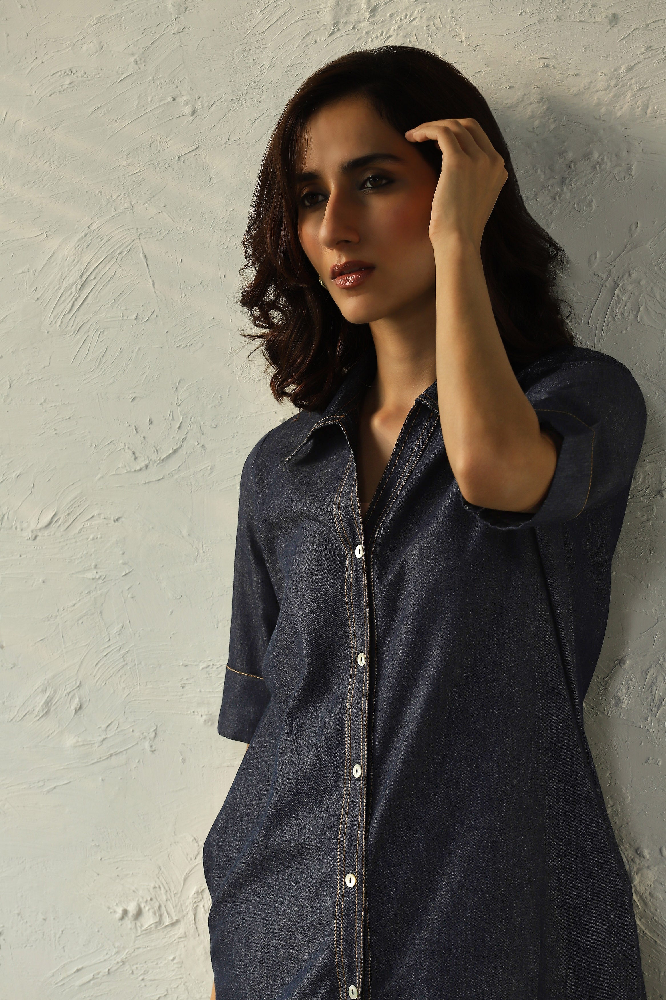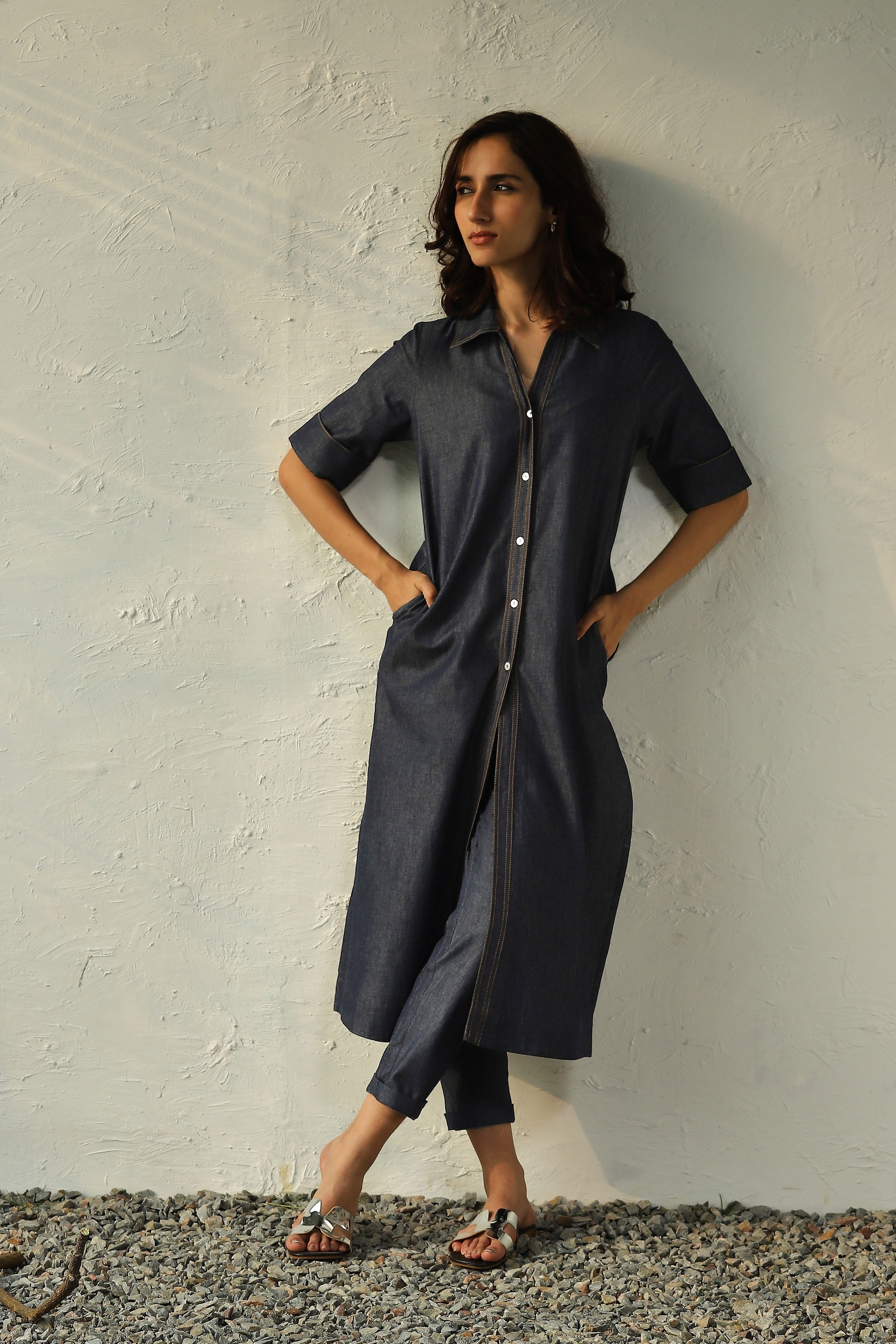 Discover versatility with our soft cotton denim jacket tunic paired with straight pants – a complete ensemble that offers boundless styling options. This outfit features a full-length shell button openable front and practical side pockets. The tunic's side slit adds an element of chic. The accompanying denim straight pants offer an elasticated waist with a drawstring for comfort. The jacket tunic doubles as a dress and a stylish overlay over other outfits. Mix and match with any bottom to create your unique style as you venture out, embracing the everyday moments in fashion.