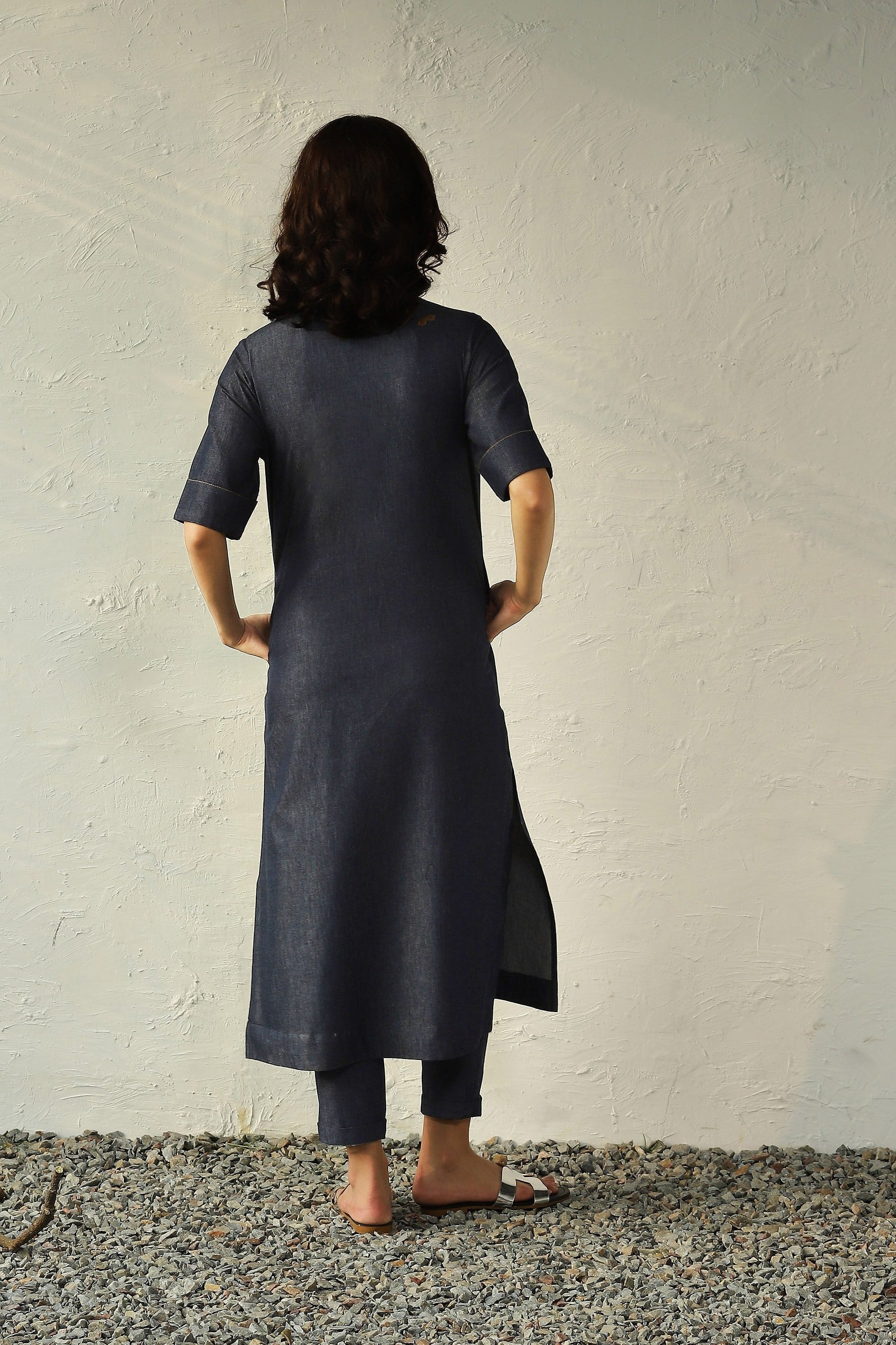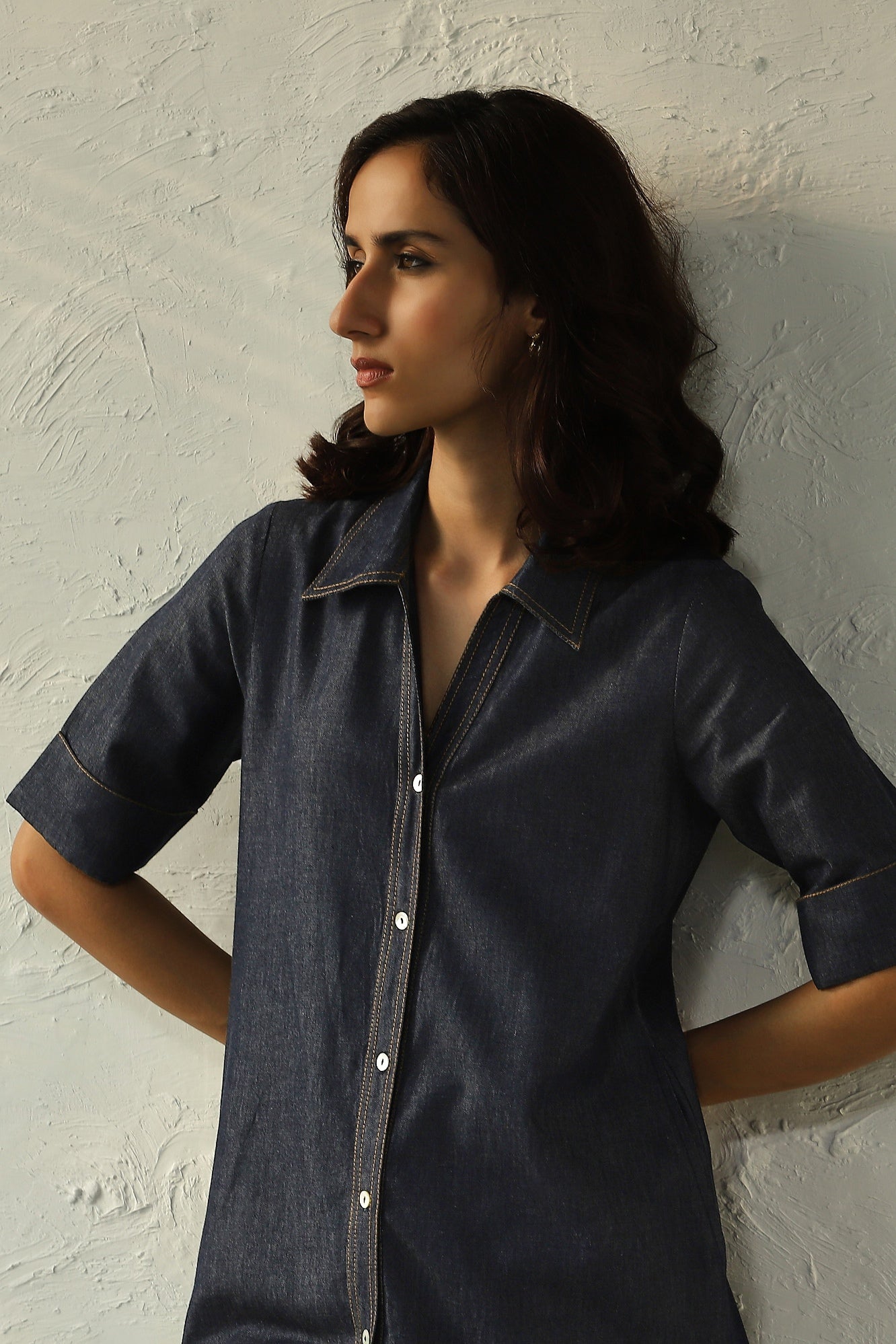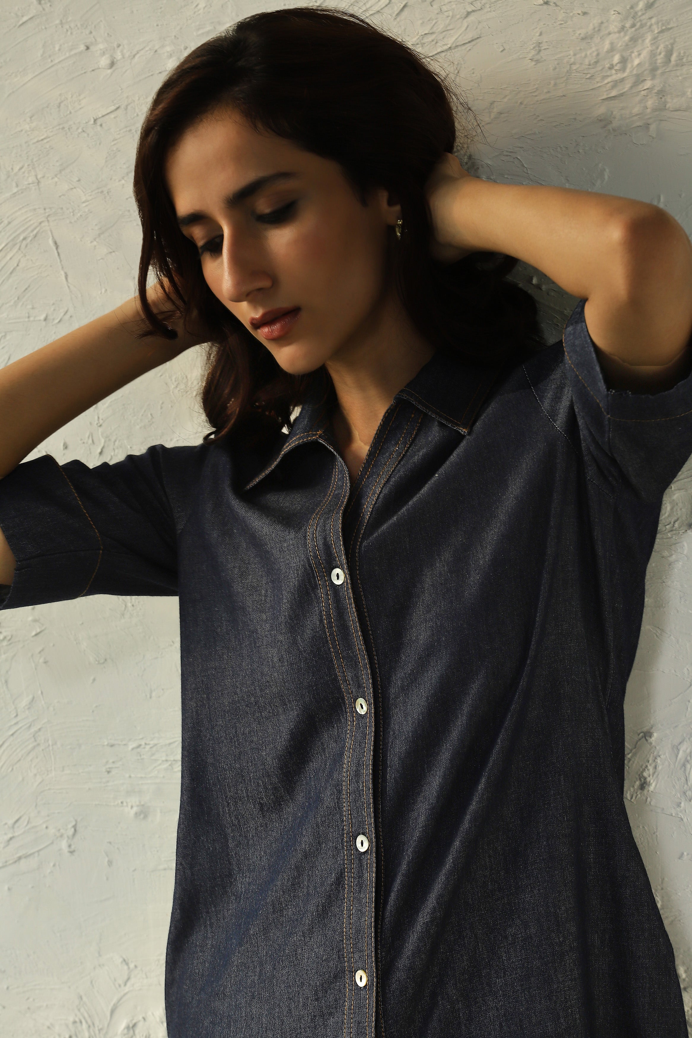 Discover versatility with our soft cotton denim jacket tunic paired with straight pants – a complete ensemble that offers boundless styling options. This outfit features a full-length shell button openable front and practical side pockets. The tunic's side slit adds an element of chic. The accompanying denim straight pants offer an elasticated waist with a drawstring for comfort. The jacket tunic doubles as a dress and a stylish overlay over other outfits. Mix and match with any bottom to create your unique style as you venture out, embracing the everyday moments in fashion.