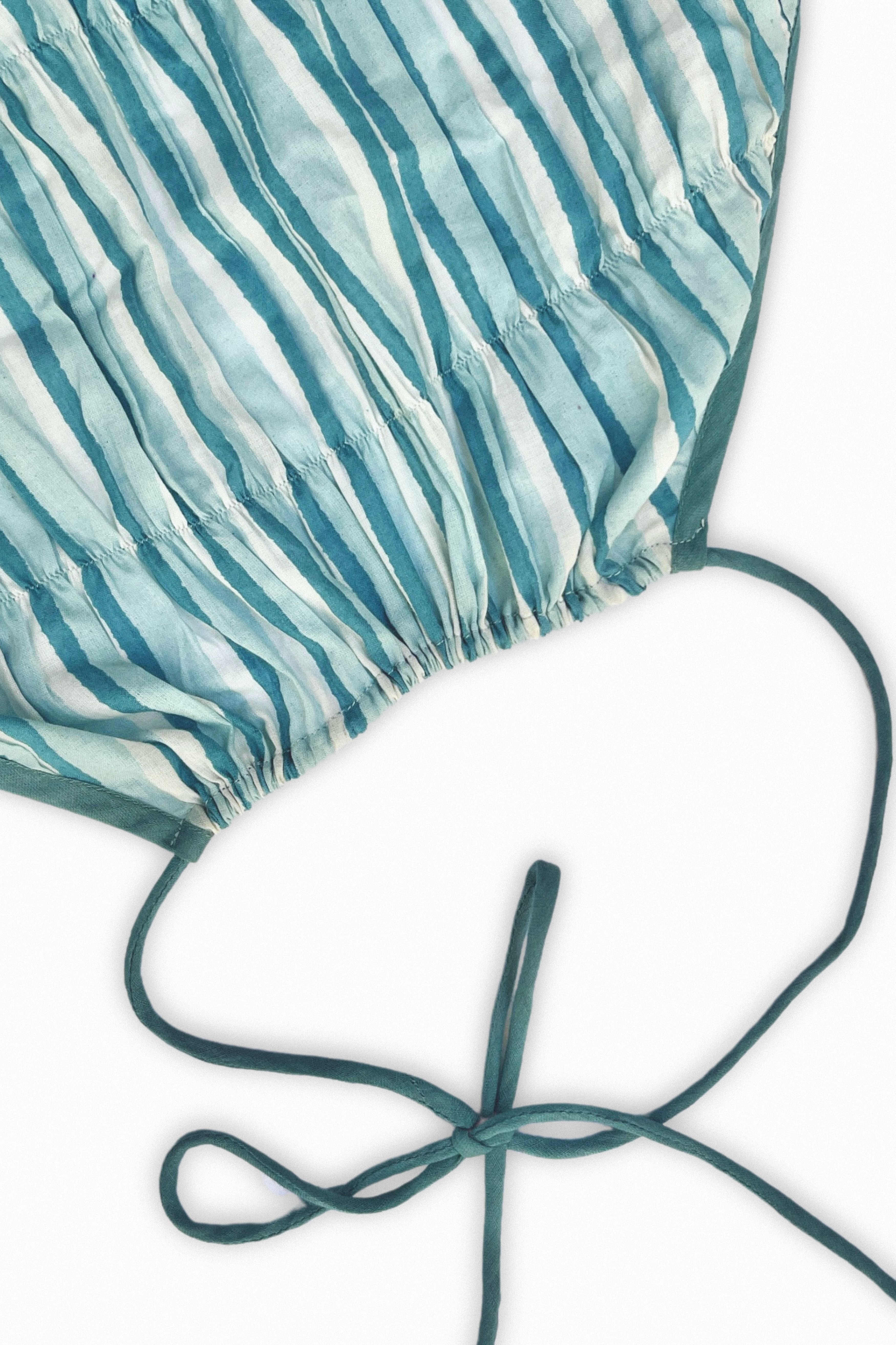 This halter-neck striped mini dress is defined by its shirring, creating a textured, form-fitting look that enhances movement while ensuring a comfortable fit. The open-back design adds an element of allure, elegantly showcasing the shoulders and upper back. Rendered in a soft blue hue with delicate vertical stripes, this dress embodies effortless charm crafted from lightweight an d breathable fabric. Model is 5'8 and is wearing a size XS