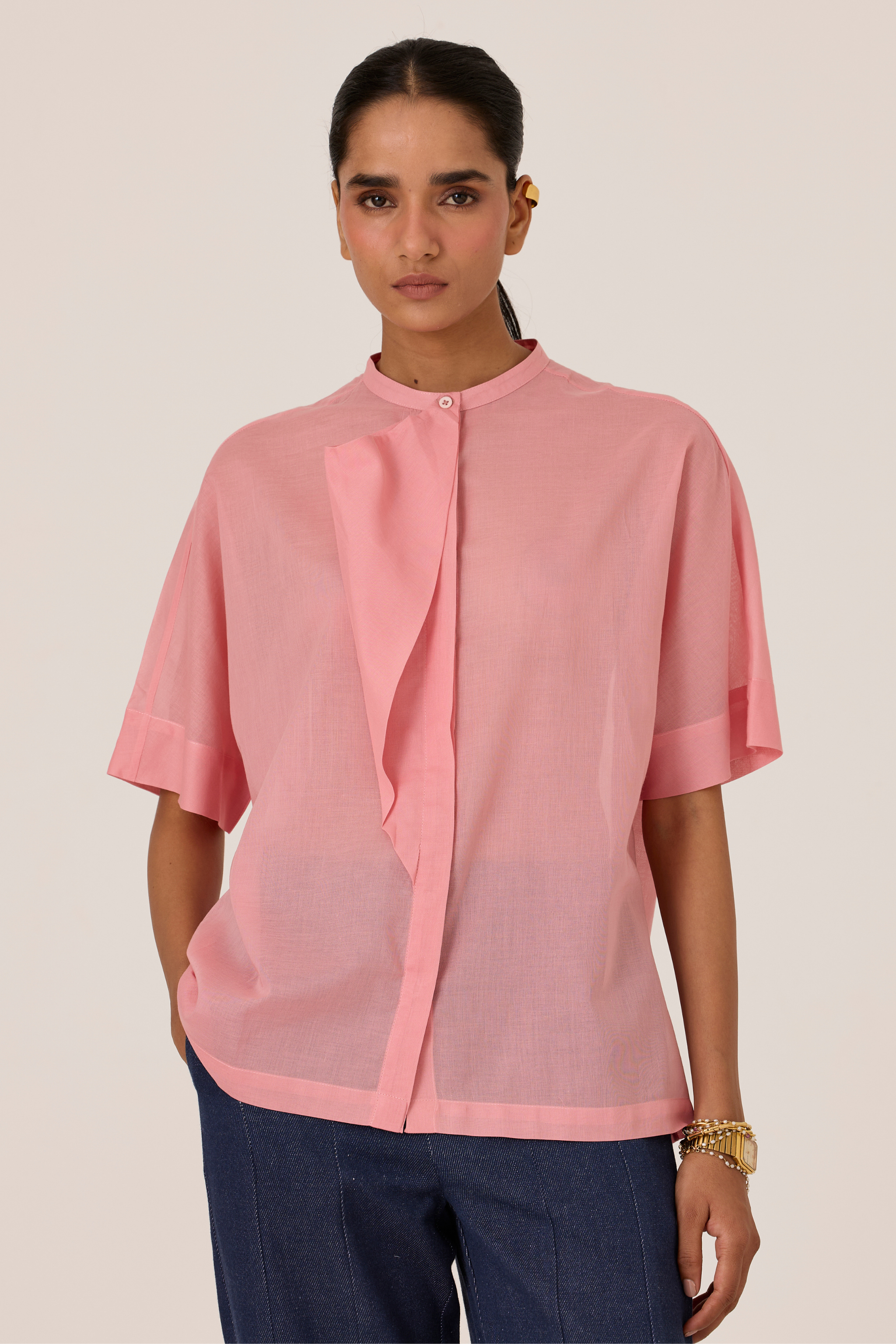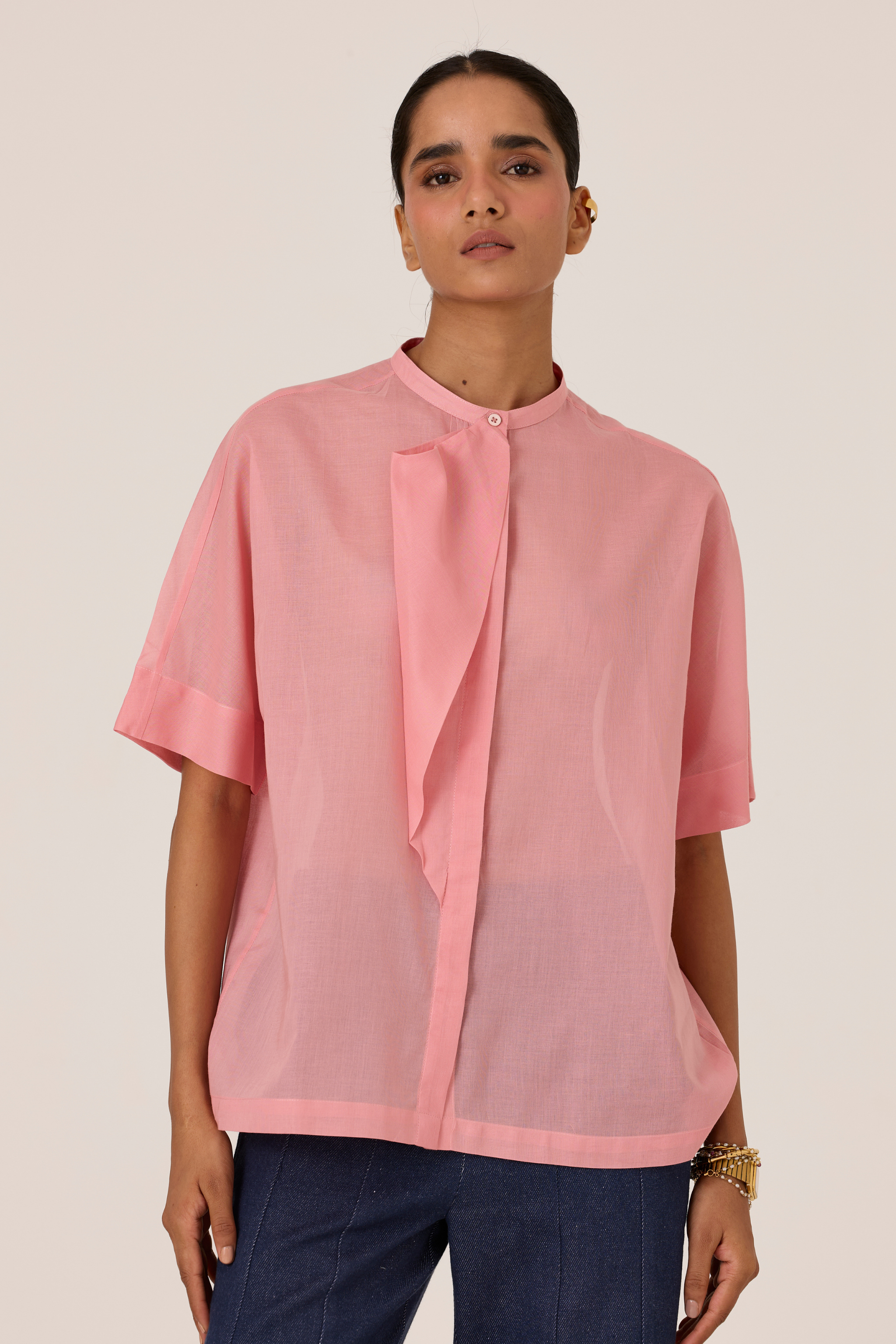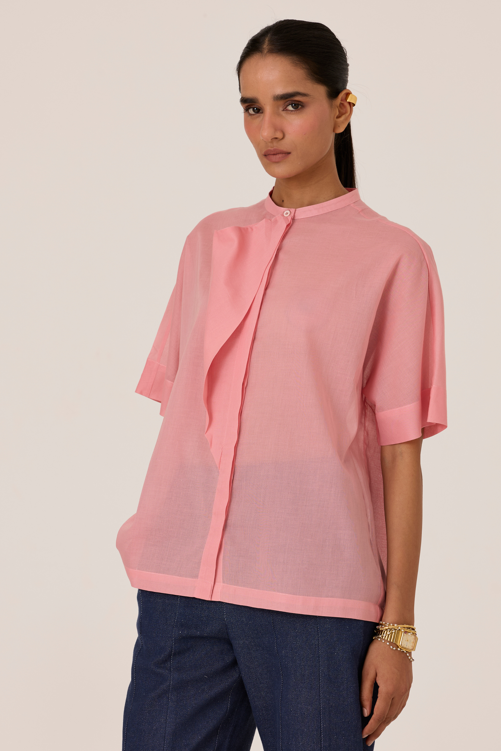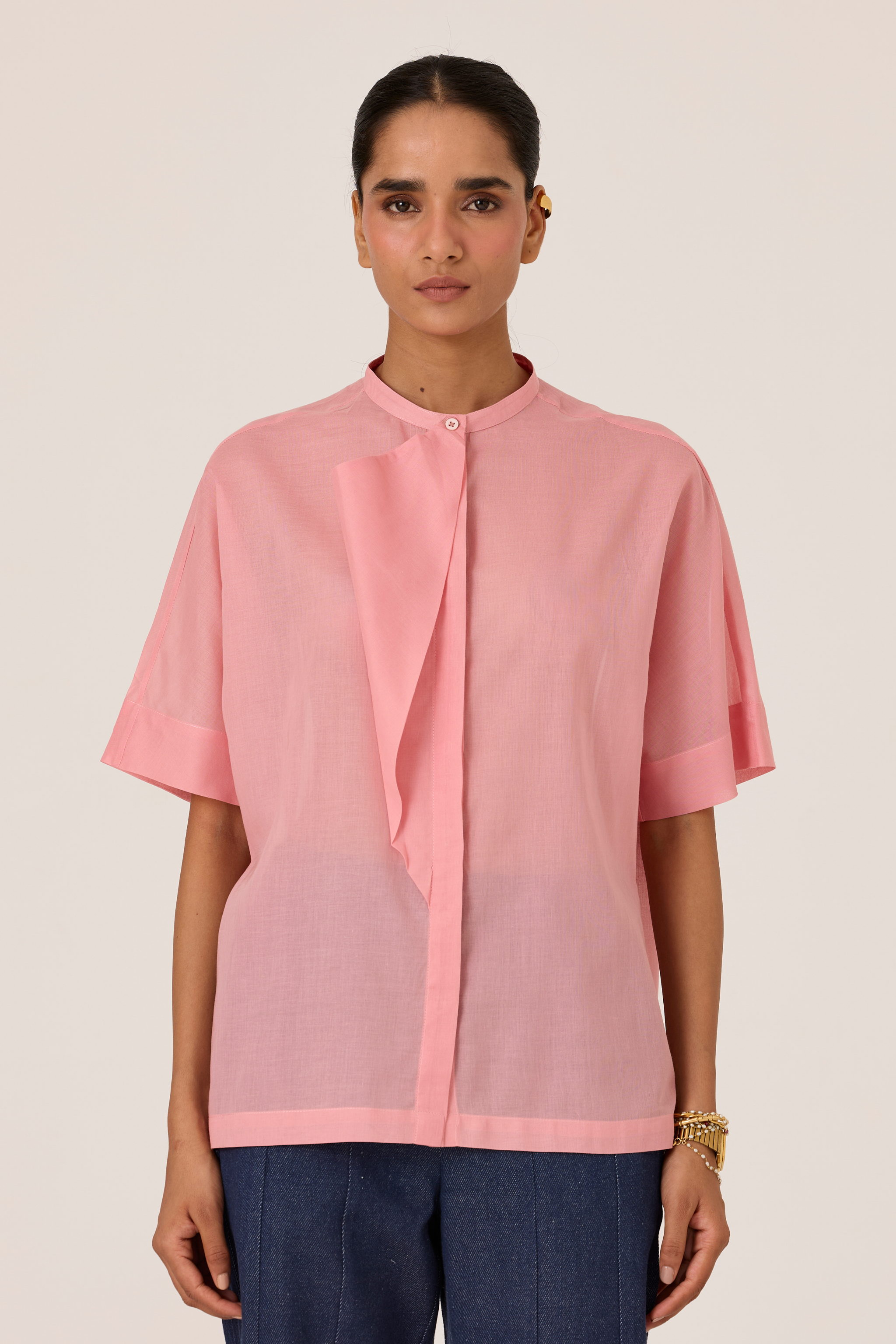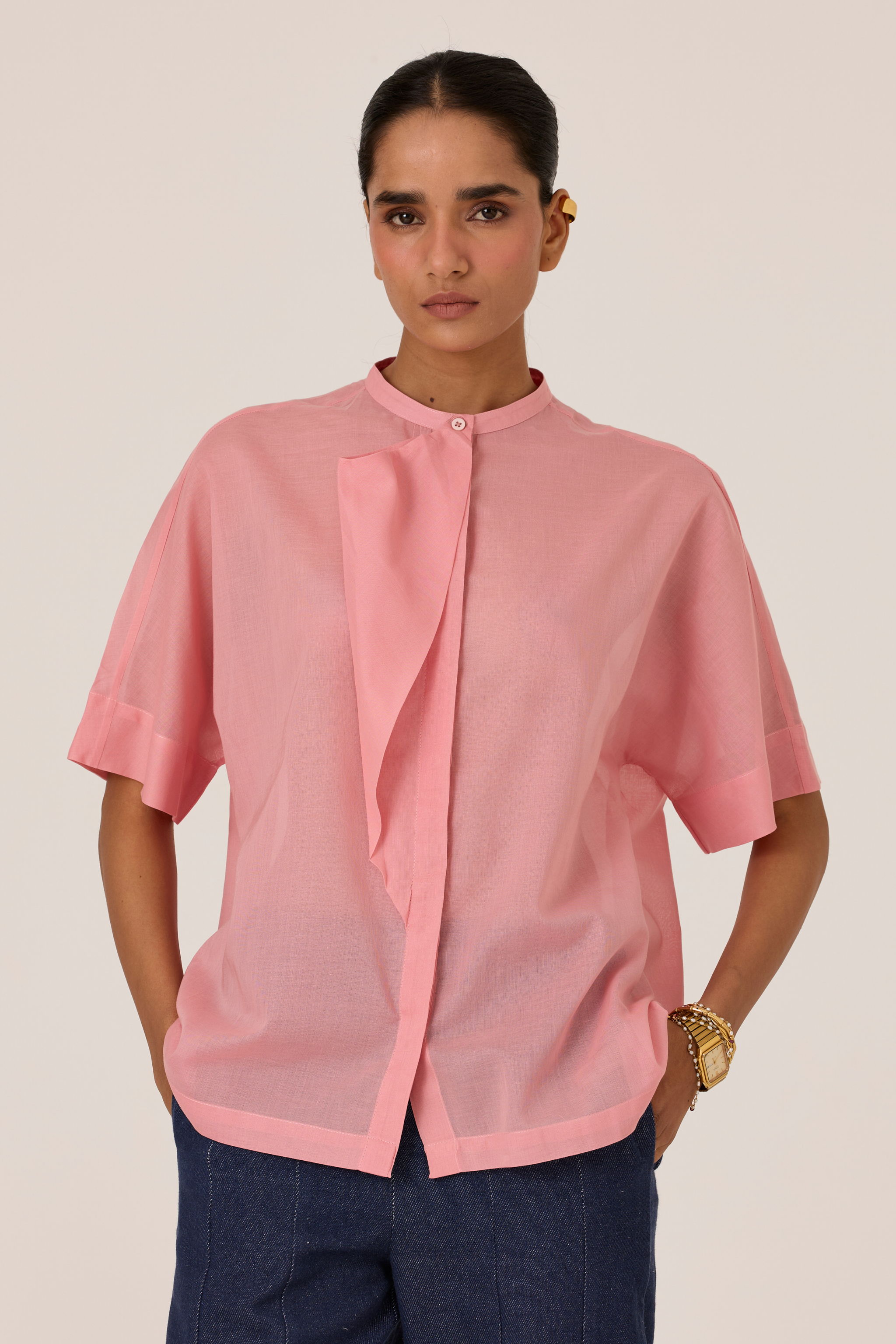 Superbly tailored button-down shirt. Drape detail along the placket. Elbow-length sleeves. Ideal for desk to dinner plans.