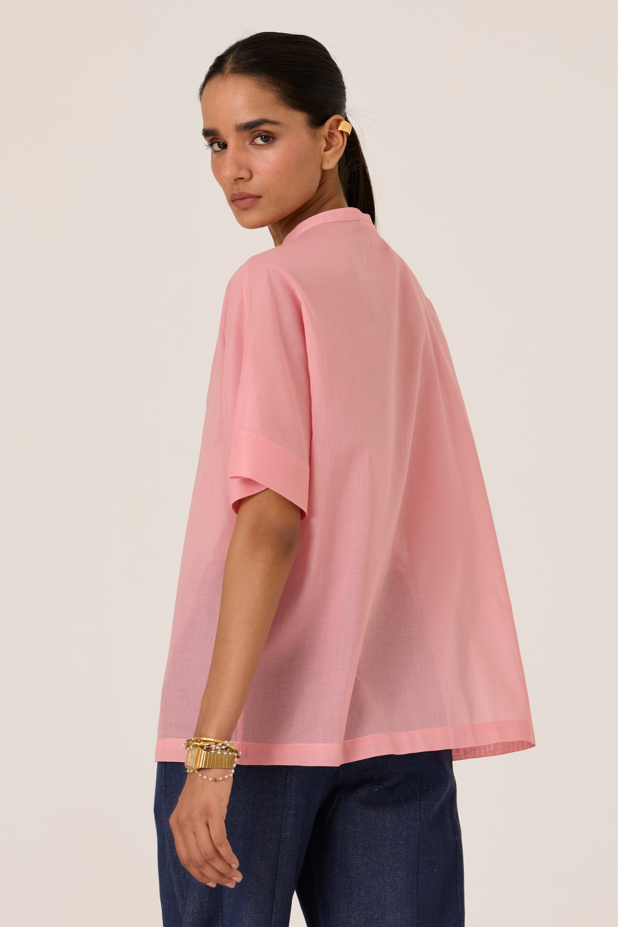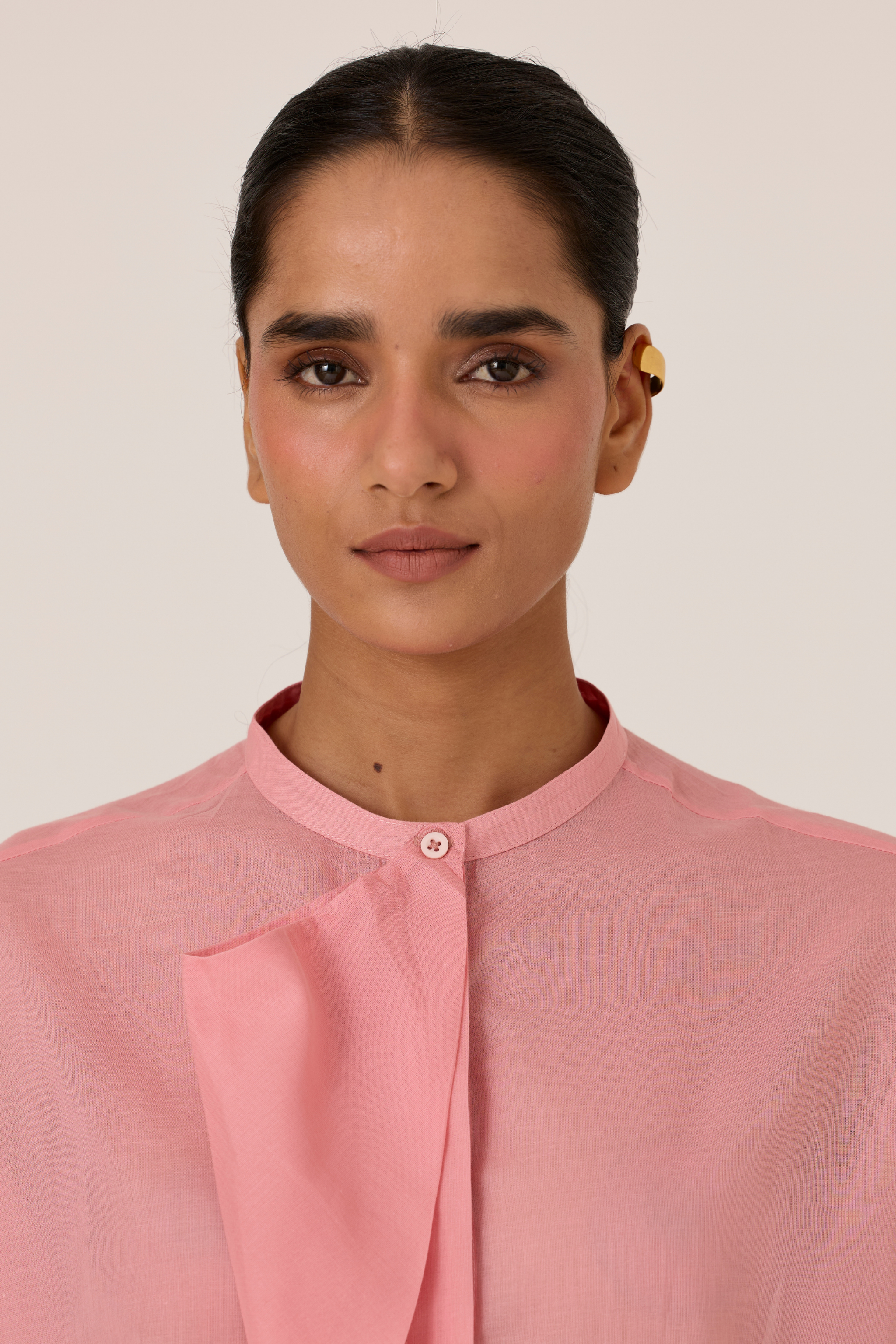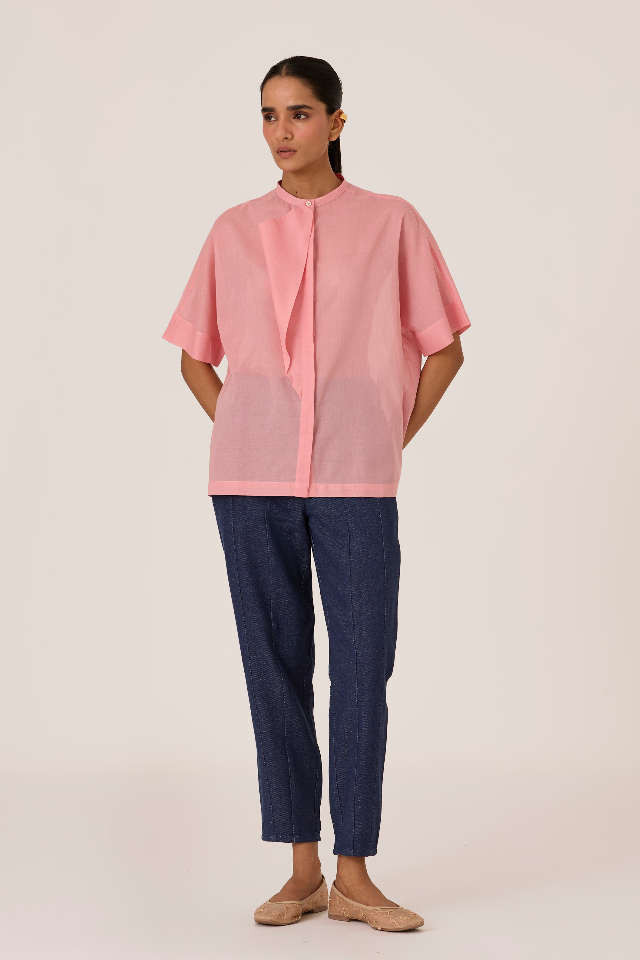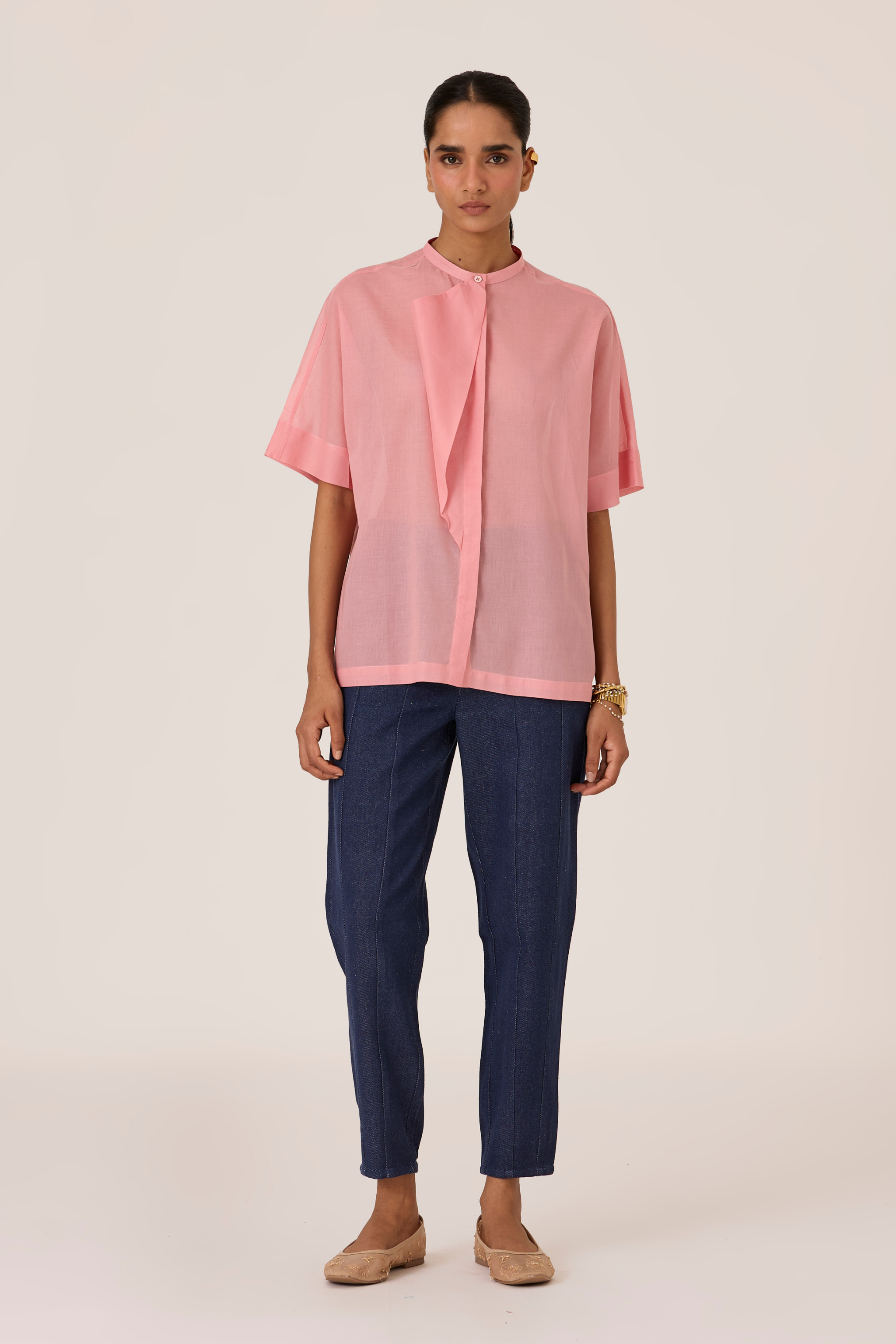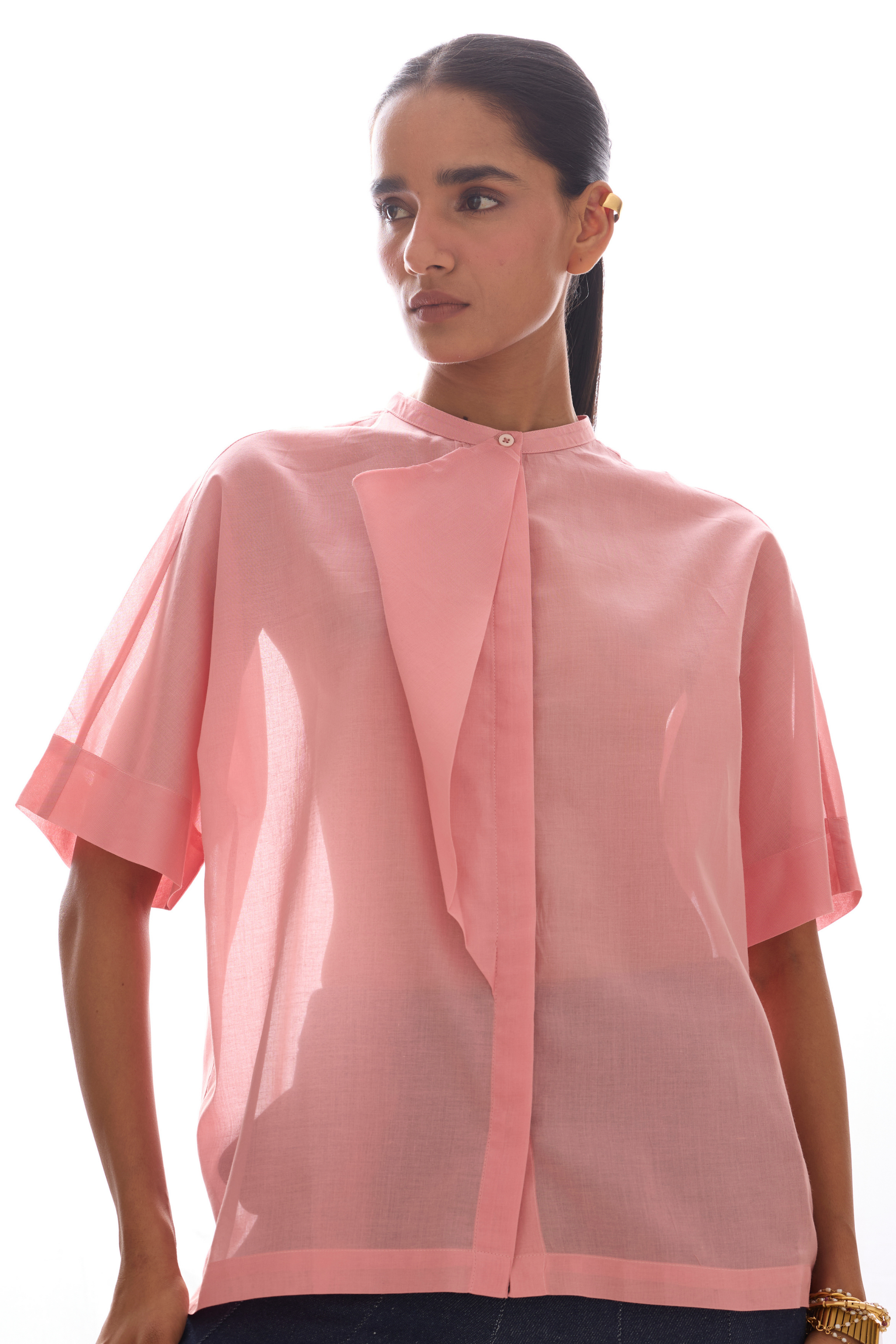 Superbly tailored button-down shirt. Drape detail along the placket. Elbow-length sleeves. Ideal for desk to dinner plans.