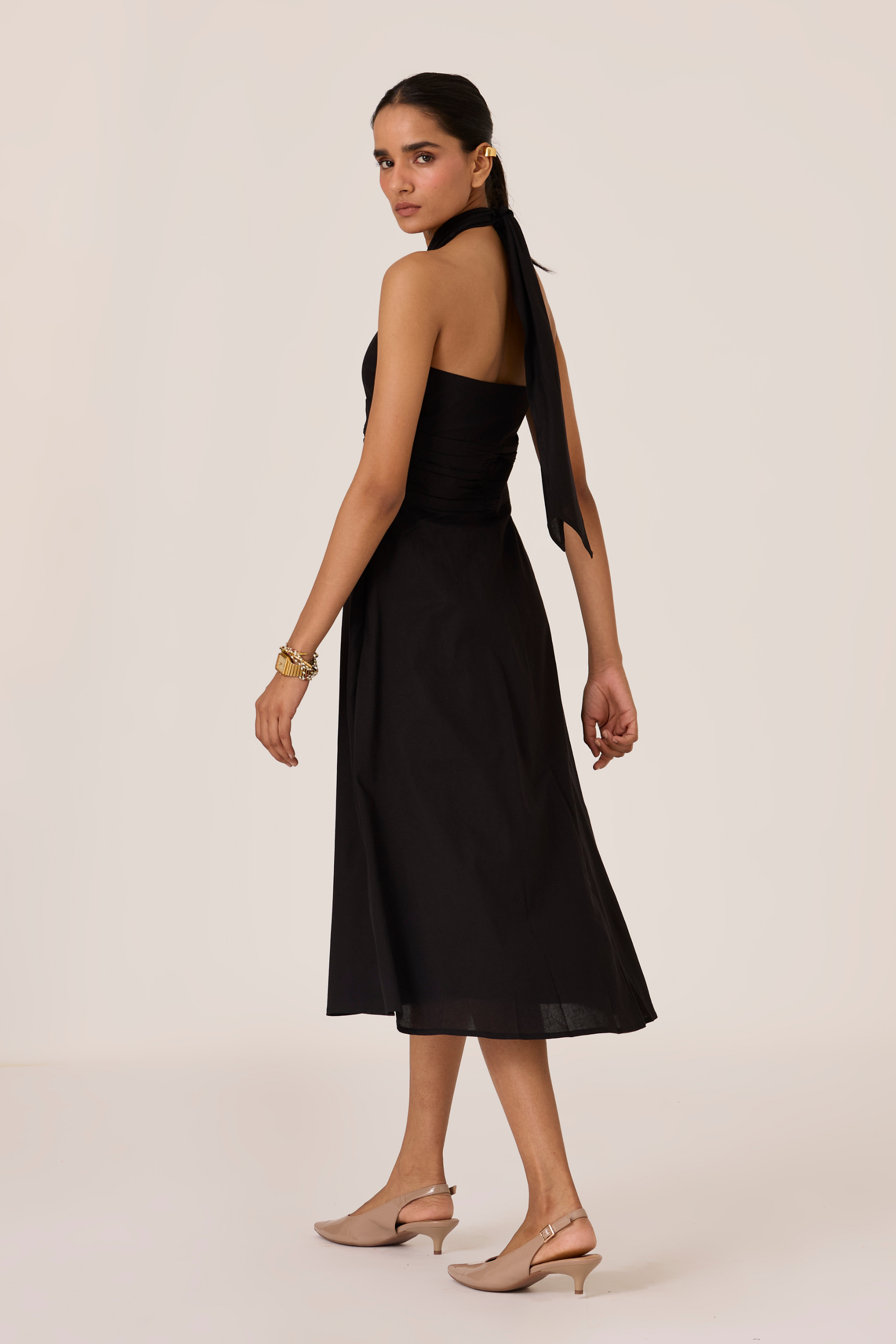 The ultimate black dress for a season of RSVPs. Crossover halter neck. Ruched at the waist for a comfortably cinched shape. Side zip fastening. In-seam pockets. This dress is fully lined.