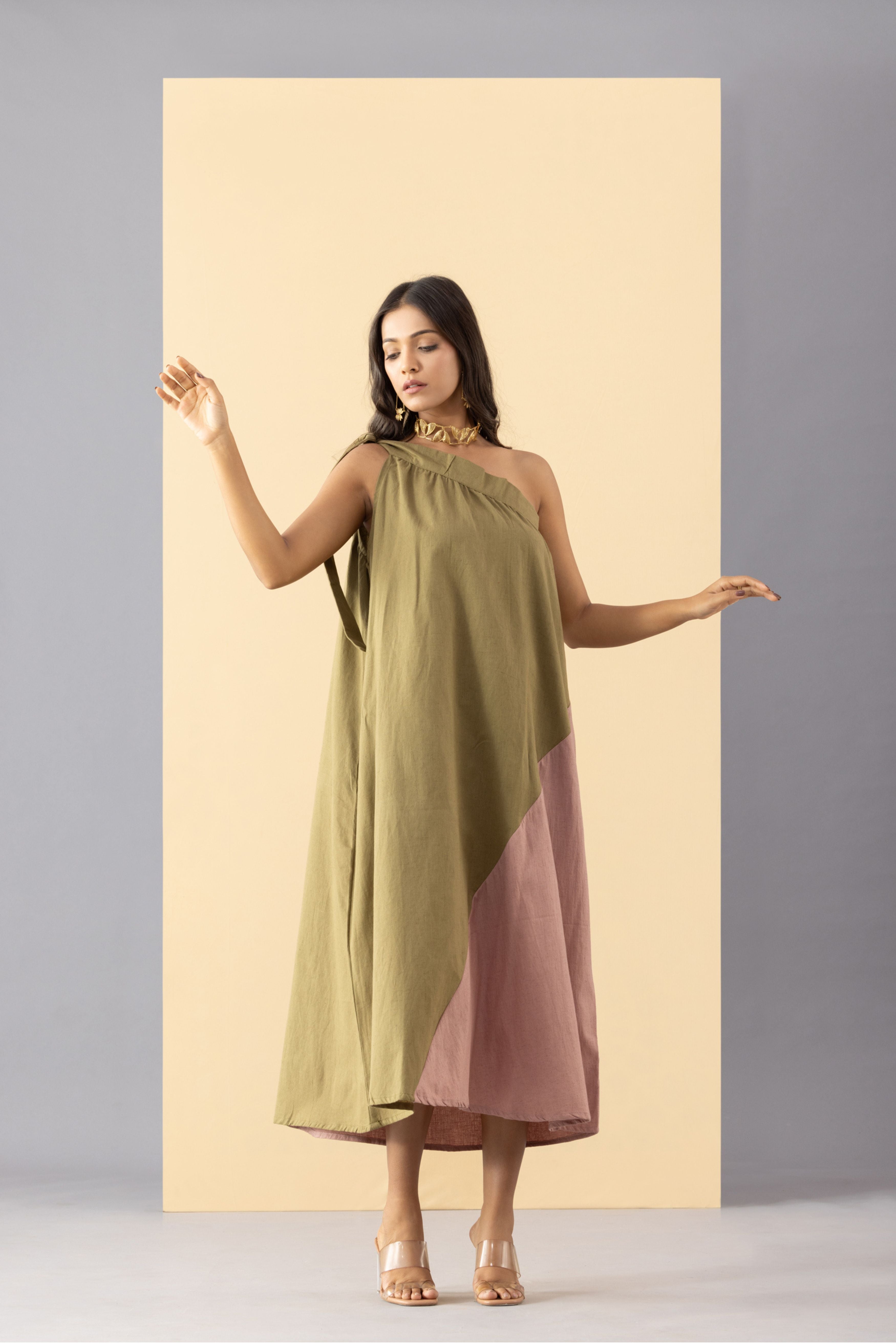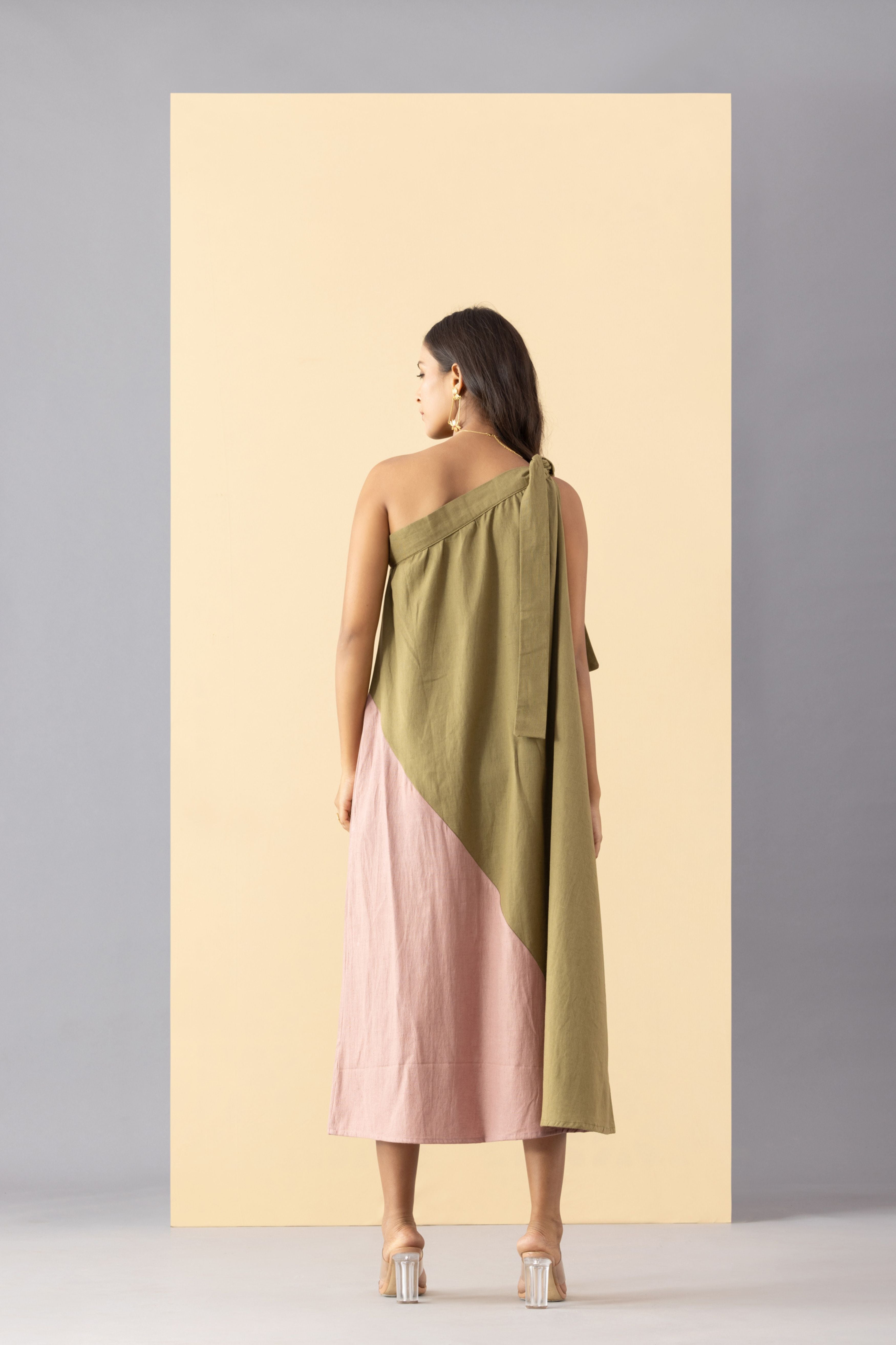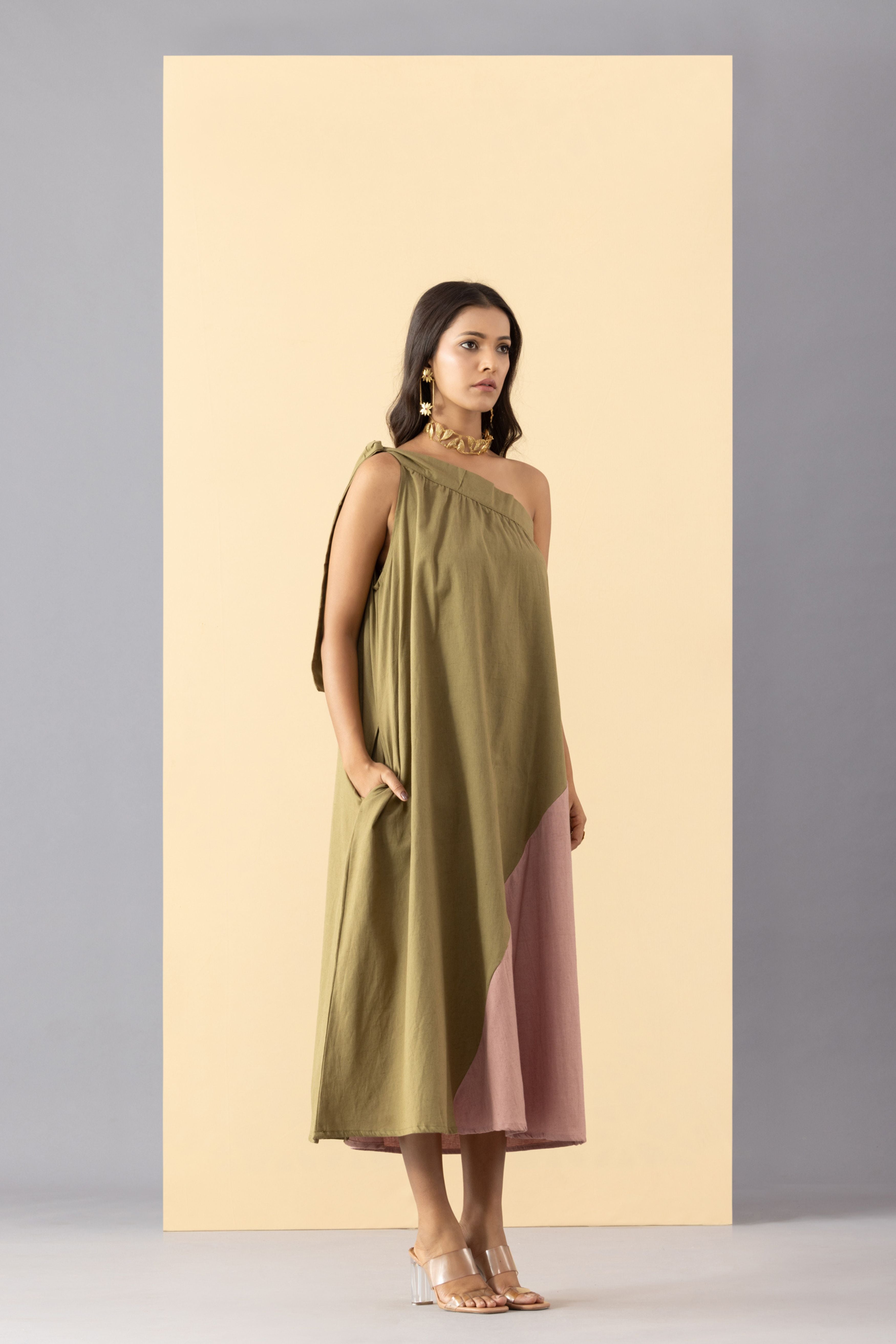 Joji tie dress is designed in 2 tones of olive and slate pink , it is a one-shoulder tie dress with broad belt tie-up. This season-less dress is perfect for any day/ night occasion. - One shoulder dress, side pockets - Can be tightened or kept lose on the shoulder as per your body measurements - Free size - Loose fit - Model is wearing size S - This is a textile fabric. The subtle imperfections in the weave, texture and colors are a natural outcome of handcrafted textiles and not a defect.