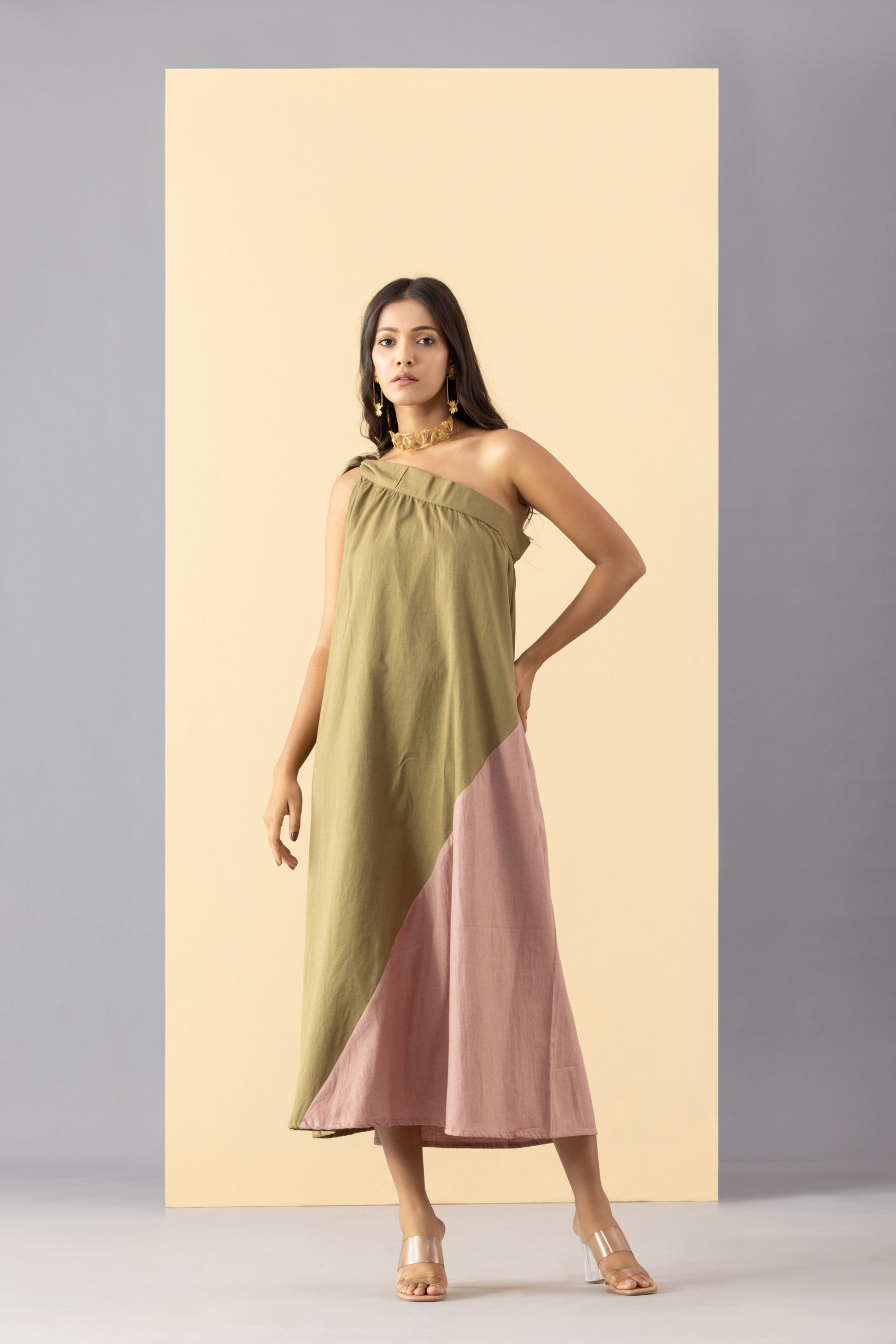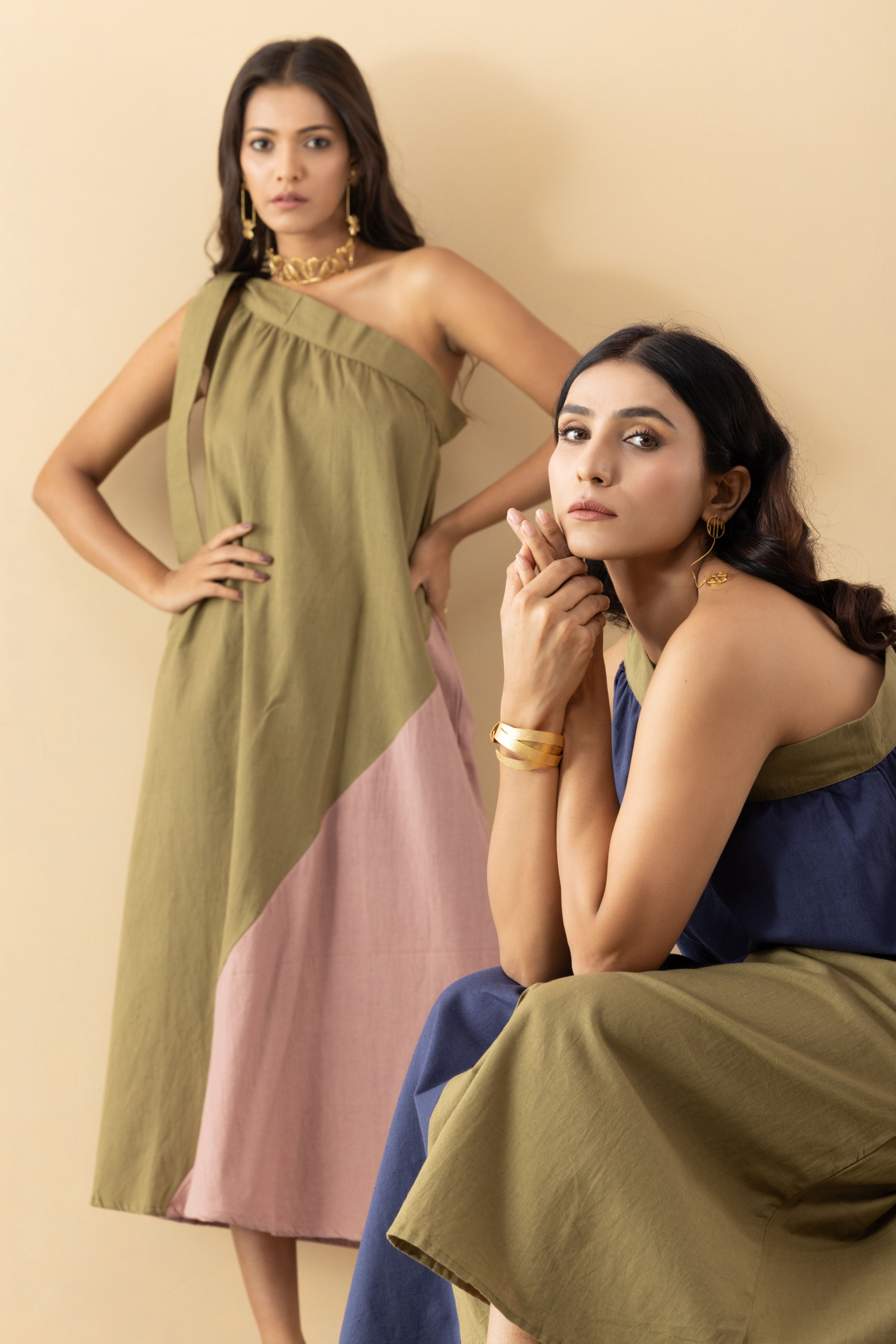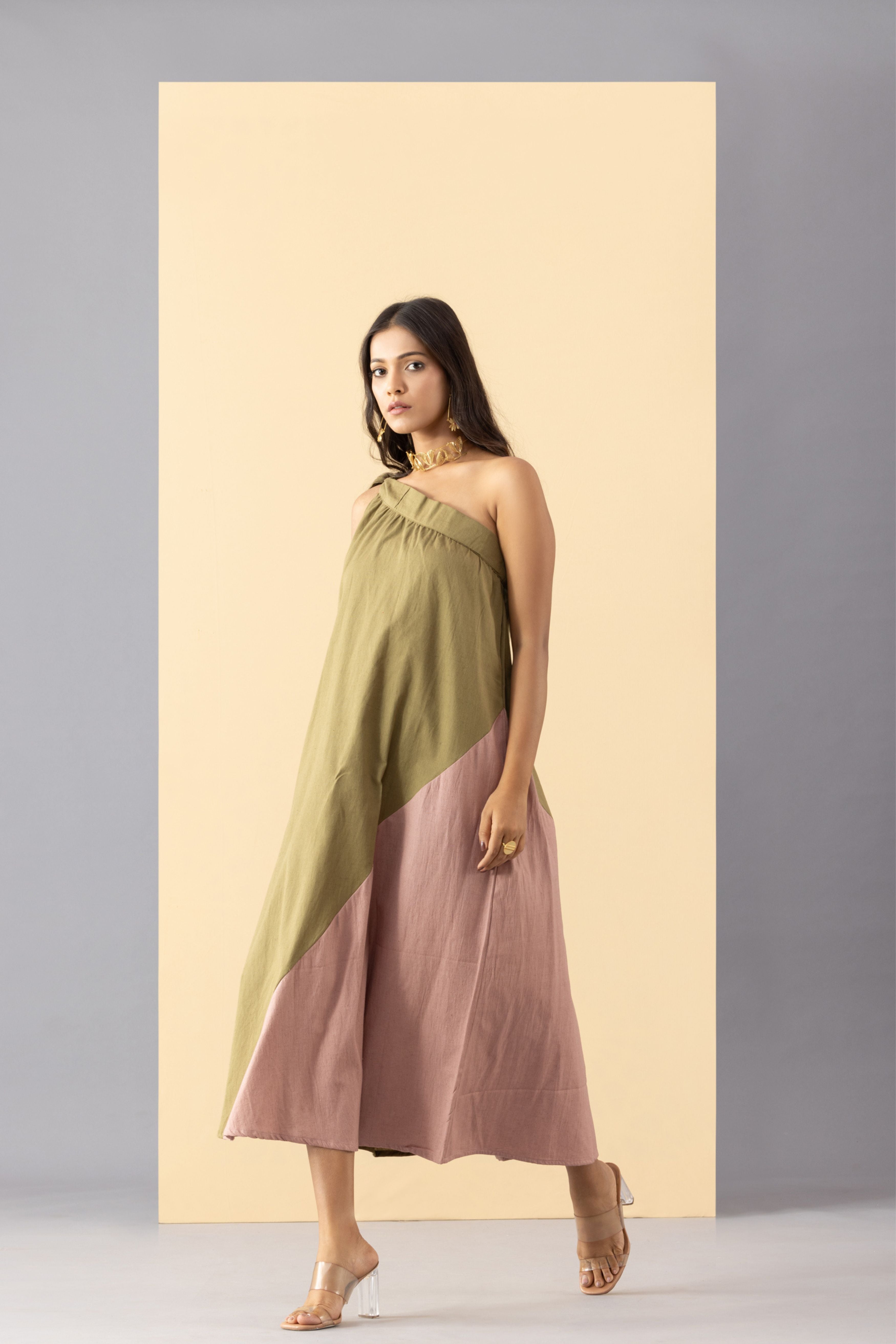 Joji tie dress is designed in 2 tones of olive and slate pink , it is a one-shoulder tie dress with broad belt tie-up. This season-less dress is perfect for any day/ night occasion. - One shoulder dress, side pockets - Can be tightened or kept lose on the shoulder as per your body measurements - Free size - Loose fit - Model is wearing size S - This is a textile fabric. The subtle imperfections in the weave, texture and colors are a natural outcome of handcrafted textiles and not a defect.