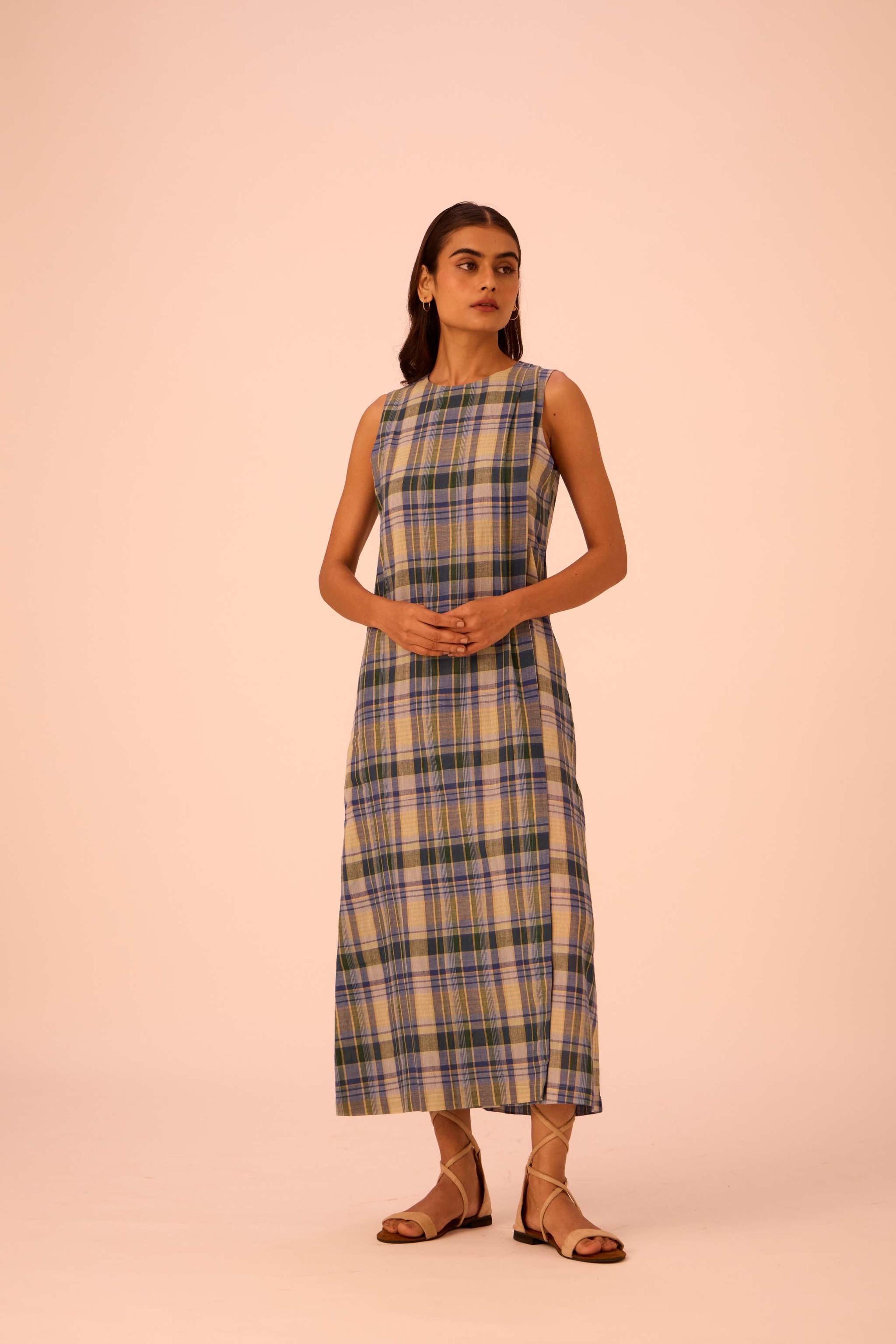 This is a sleeveless, straight, regular-fit dress with a unique *front overlap* and neat *shoulder pleats*. It's designed for practicality with *in-seam pockets* and is easy to put on thanks to a *side zip* and a *rouleau button fastening* at the back. The back of the dress is *lined* for added comfort and a better drape. Like their other pieces, the fabric is a studio-developed design that's *handwoven by artisans in Bengal*. The model, Chhavi, is 5'6" and is wearing an XS.