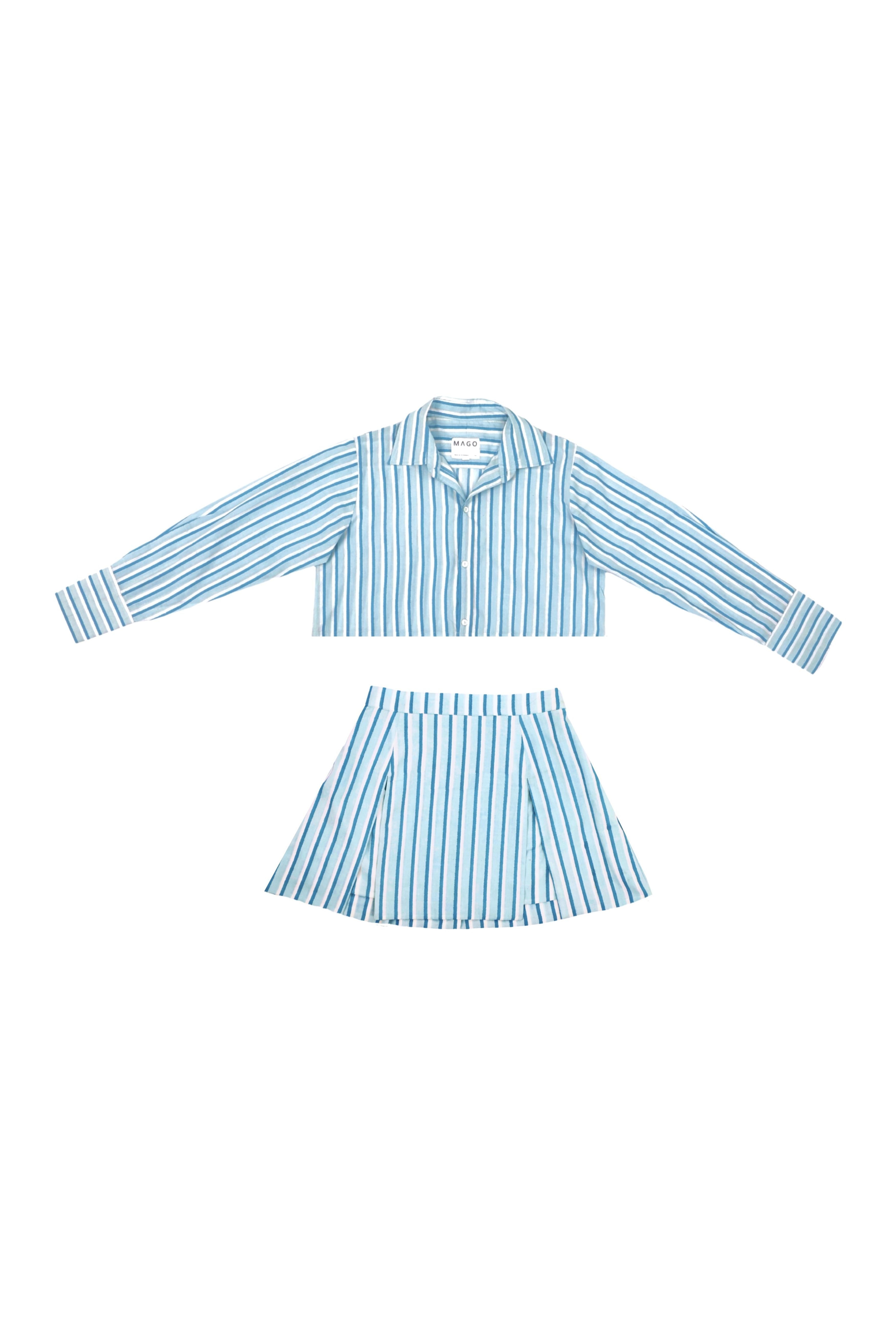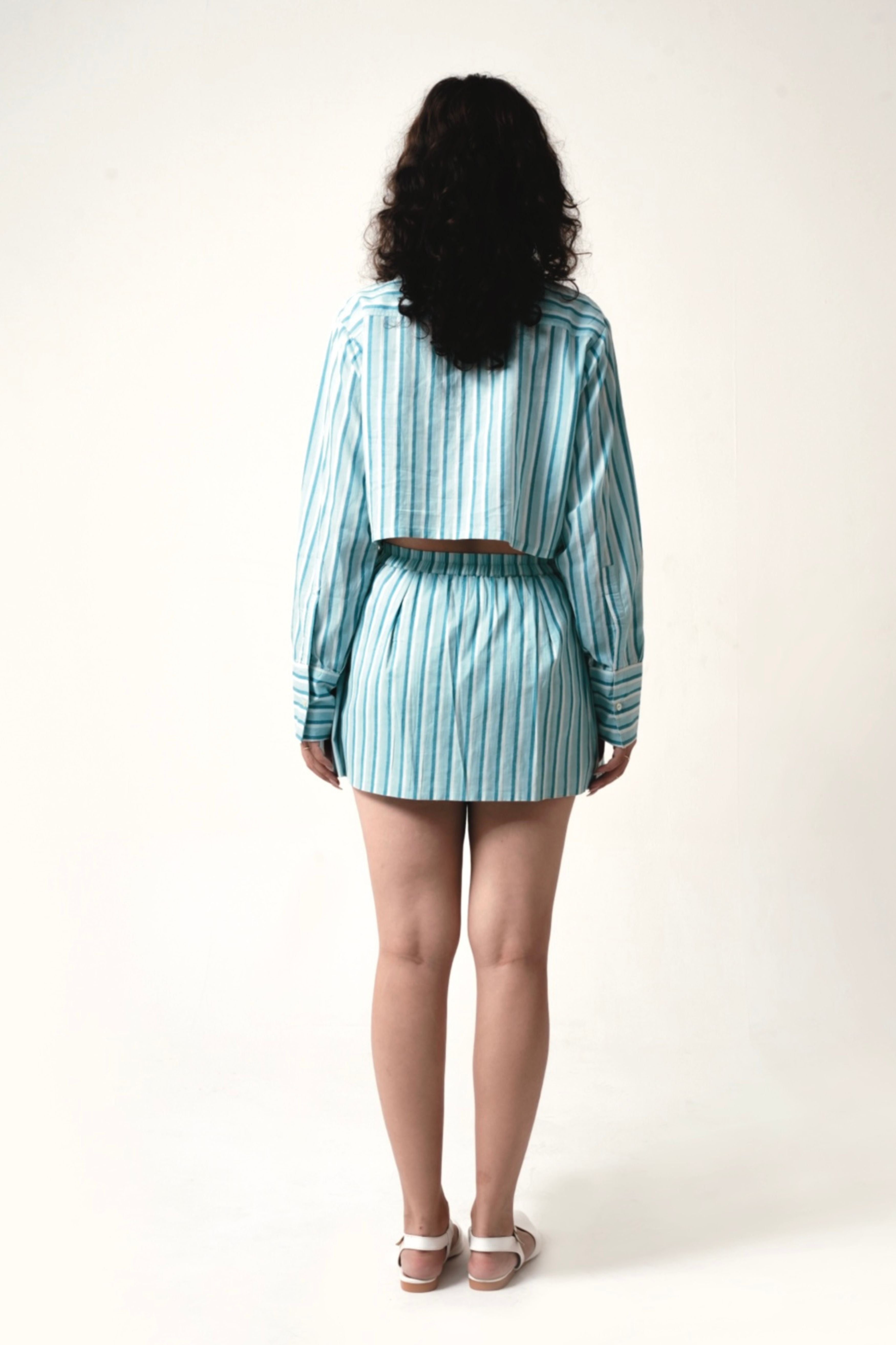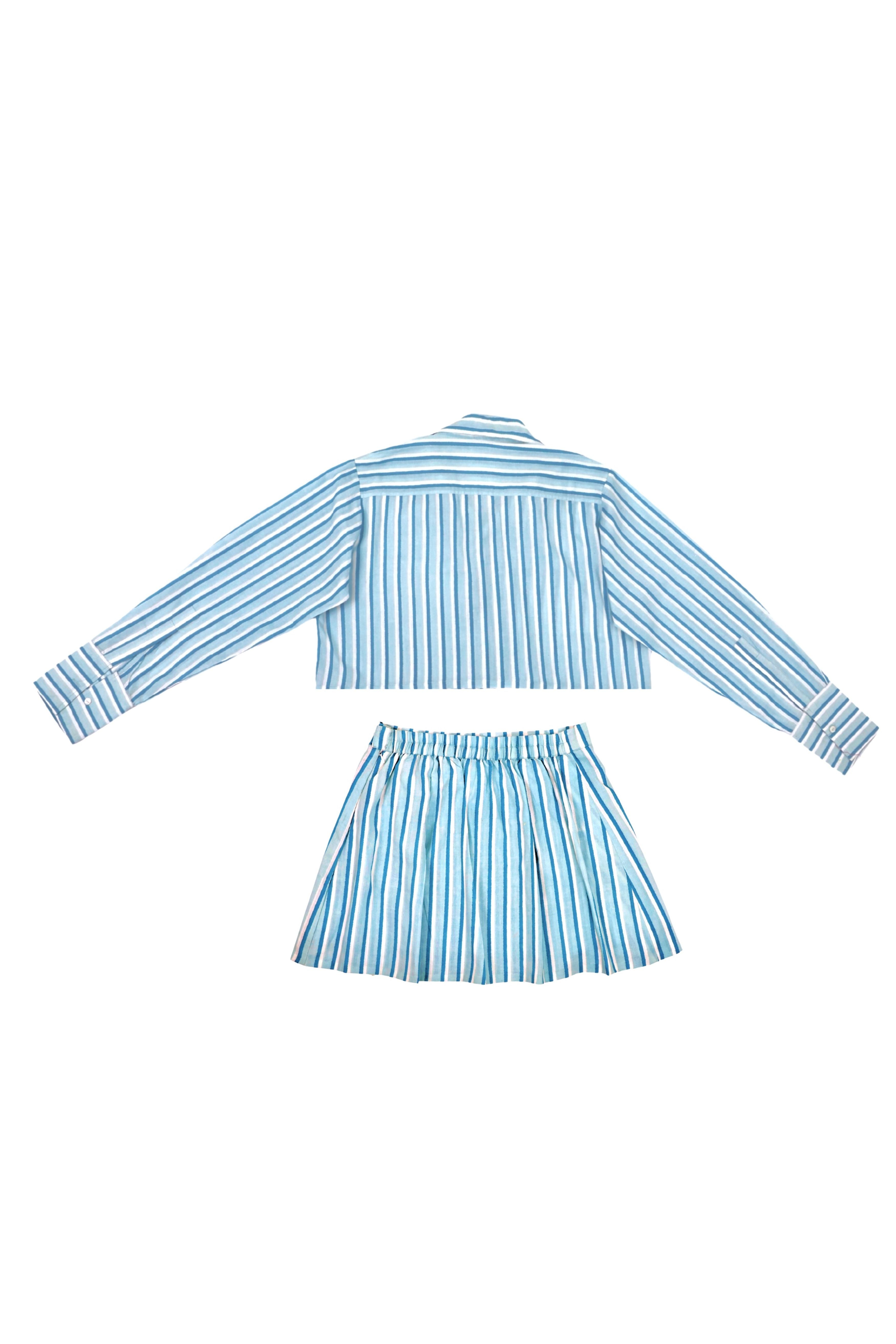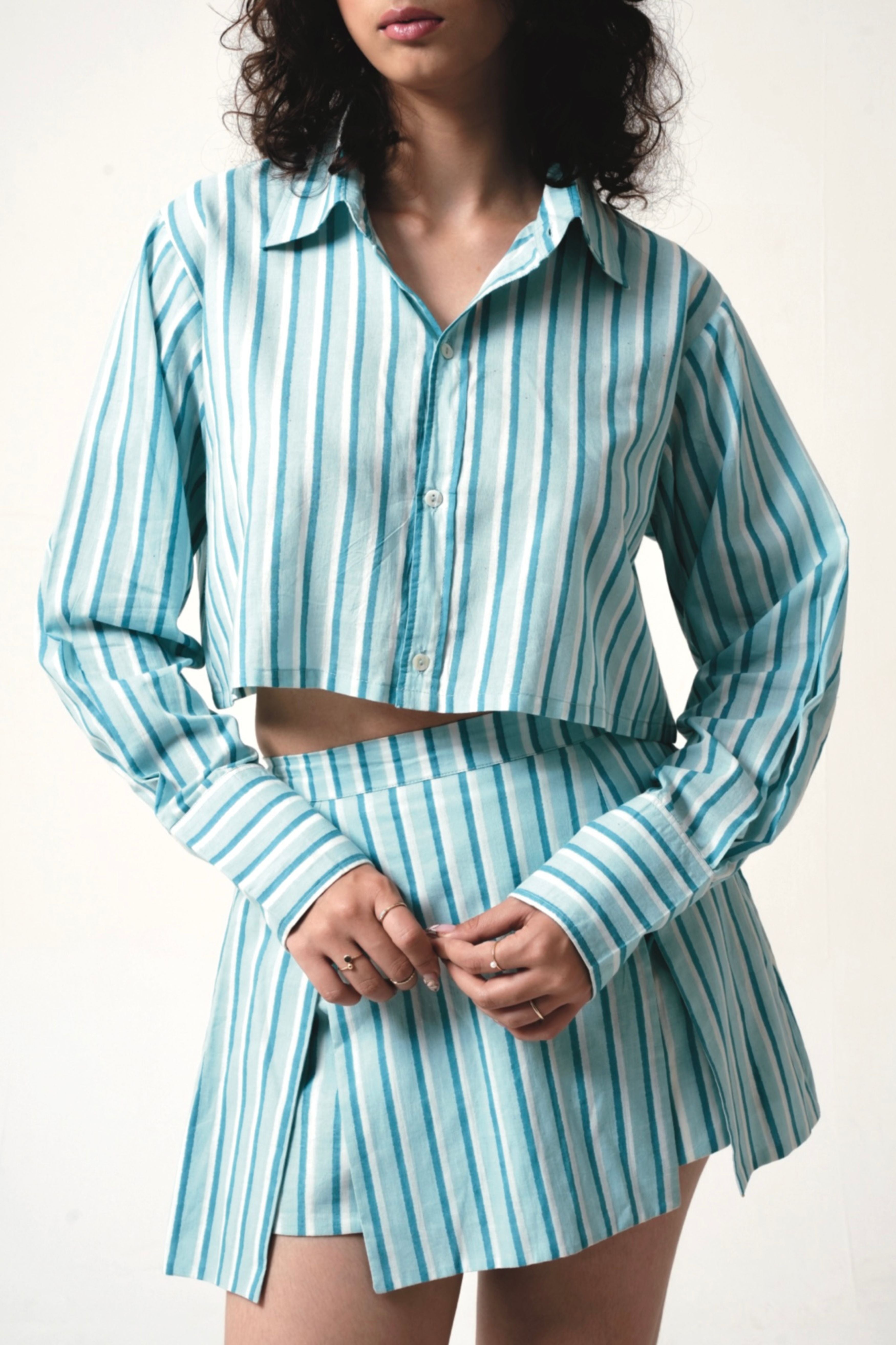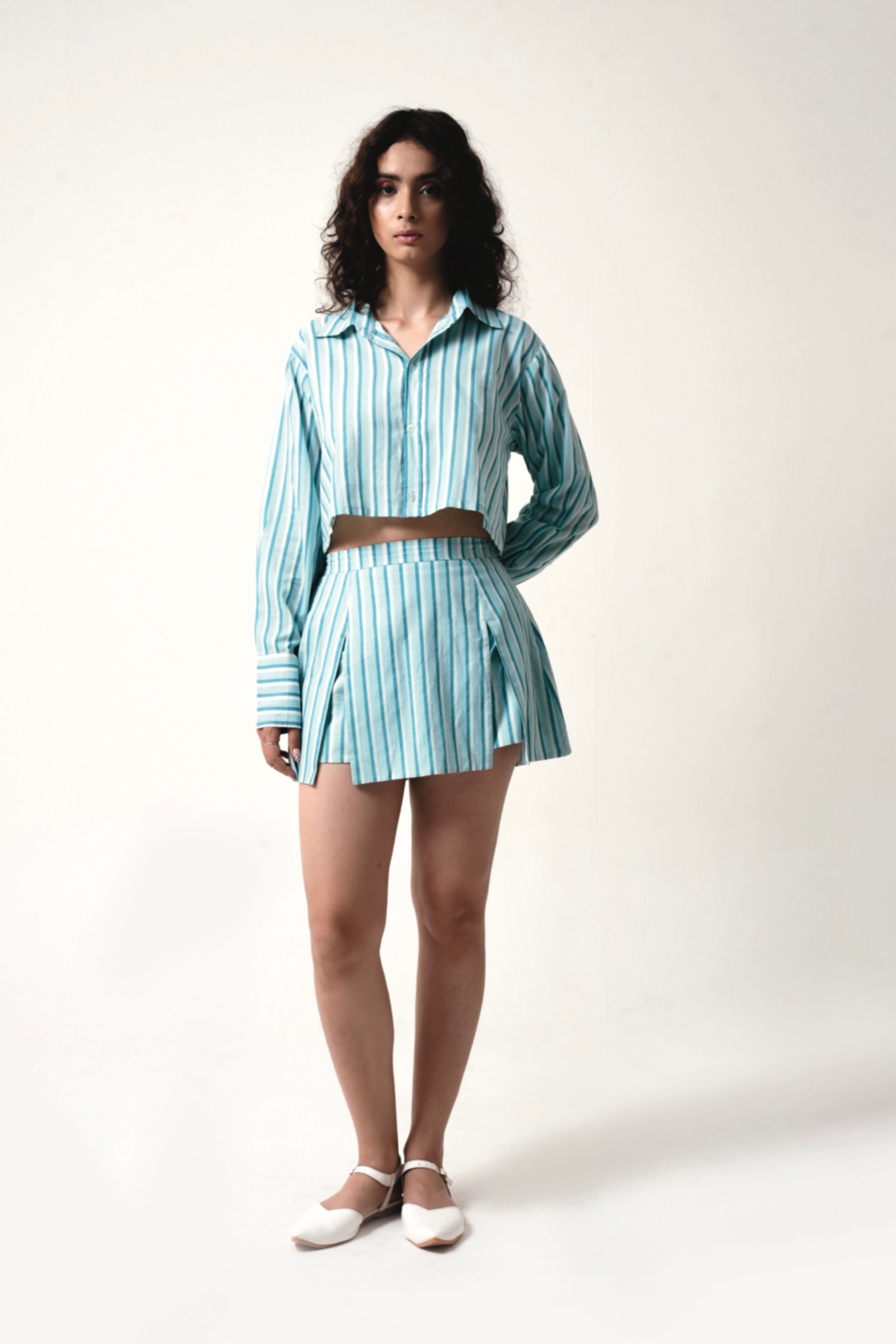 This Striped coordinated set combines timeless sophistication with a modern, fashion-forward appeal. The slightly boxy cropped button-up shirt features a structured yet relaxed fit, complete with a classic collar and long sleeves, offering a refined yet effortless look. Paired with a sleek mini skirt enhancing movement and comfort without straying from a structured, straight-cut design making it an ideal choice for both casual and semi-formal occasions. Crafted from lightweight, breathable fabric, this set delivers both style and ease of wear. Model is 5'8 and is wearing a size XS.