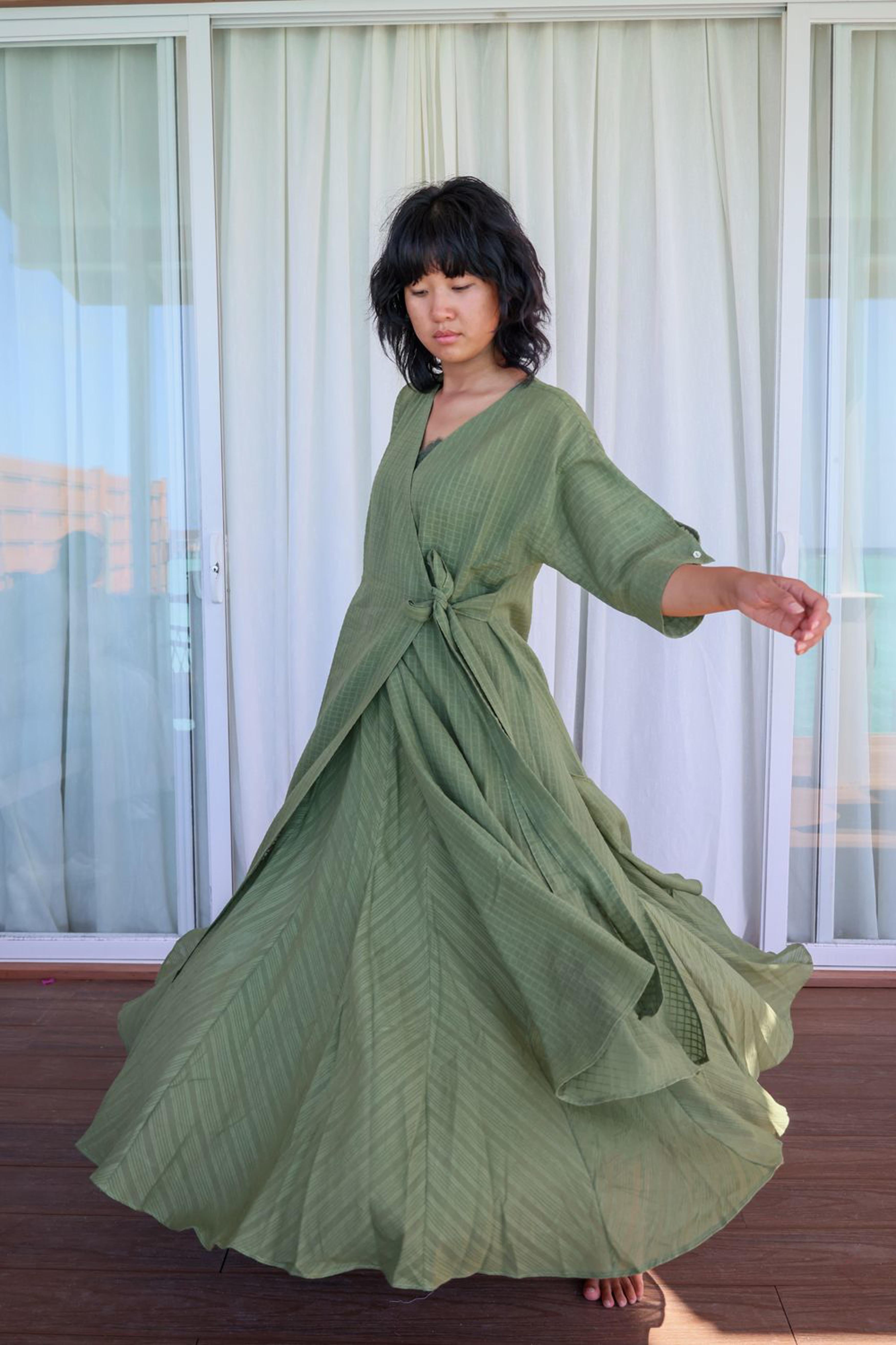 Sap green side knotted wrap slit tunic with button embellished sleeve