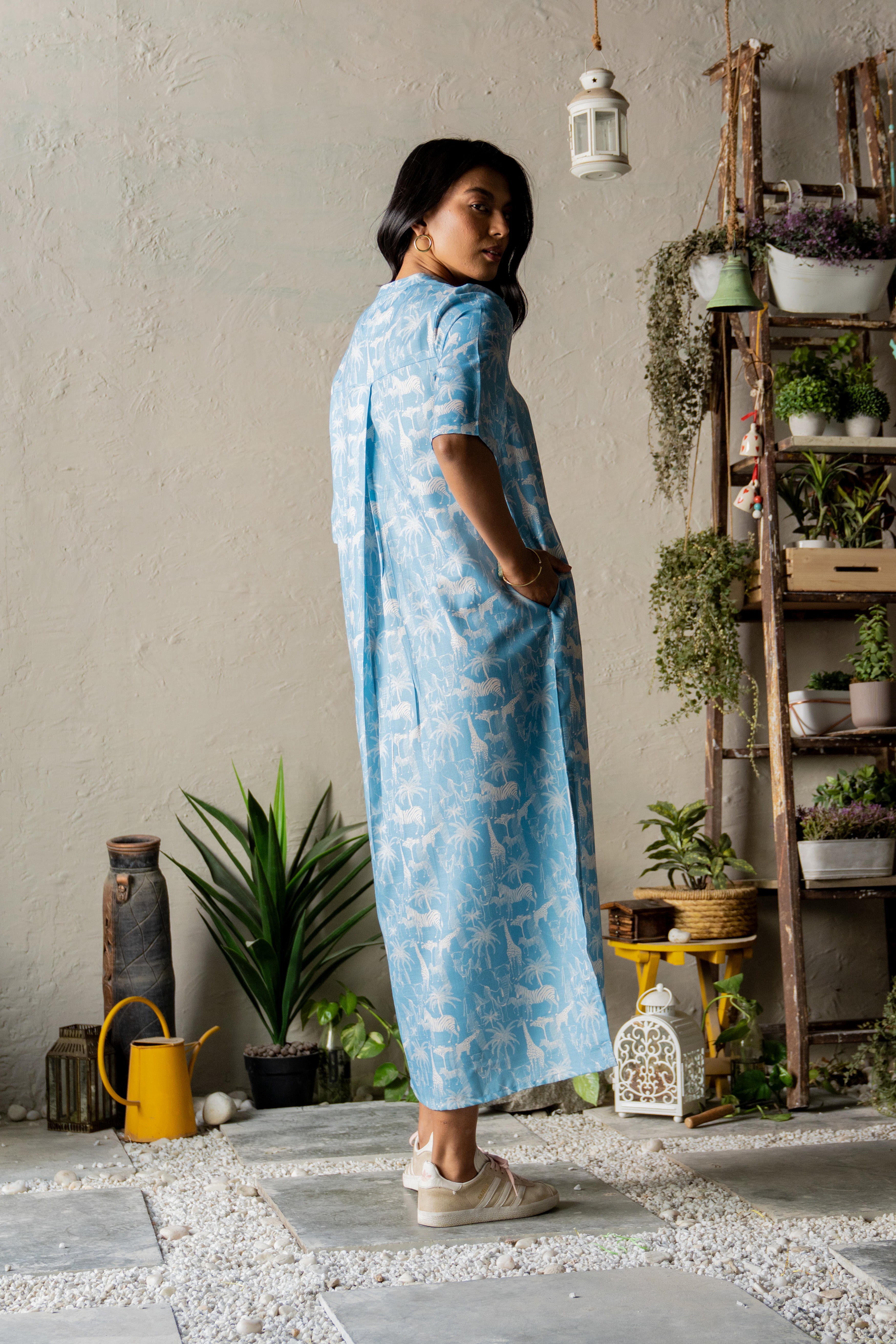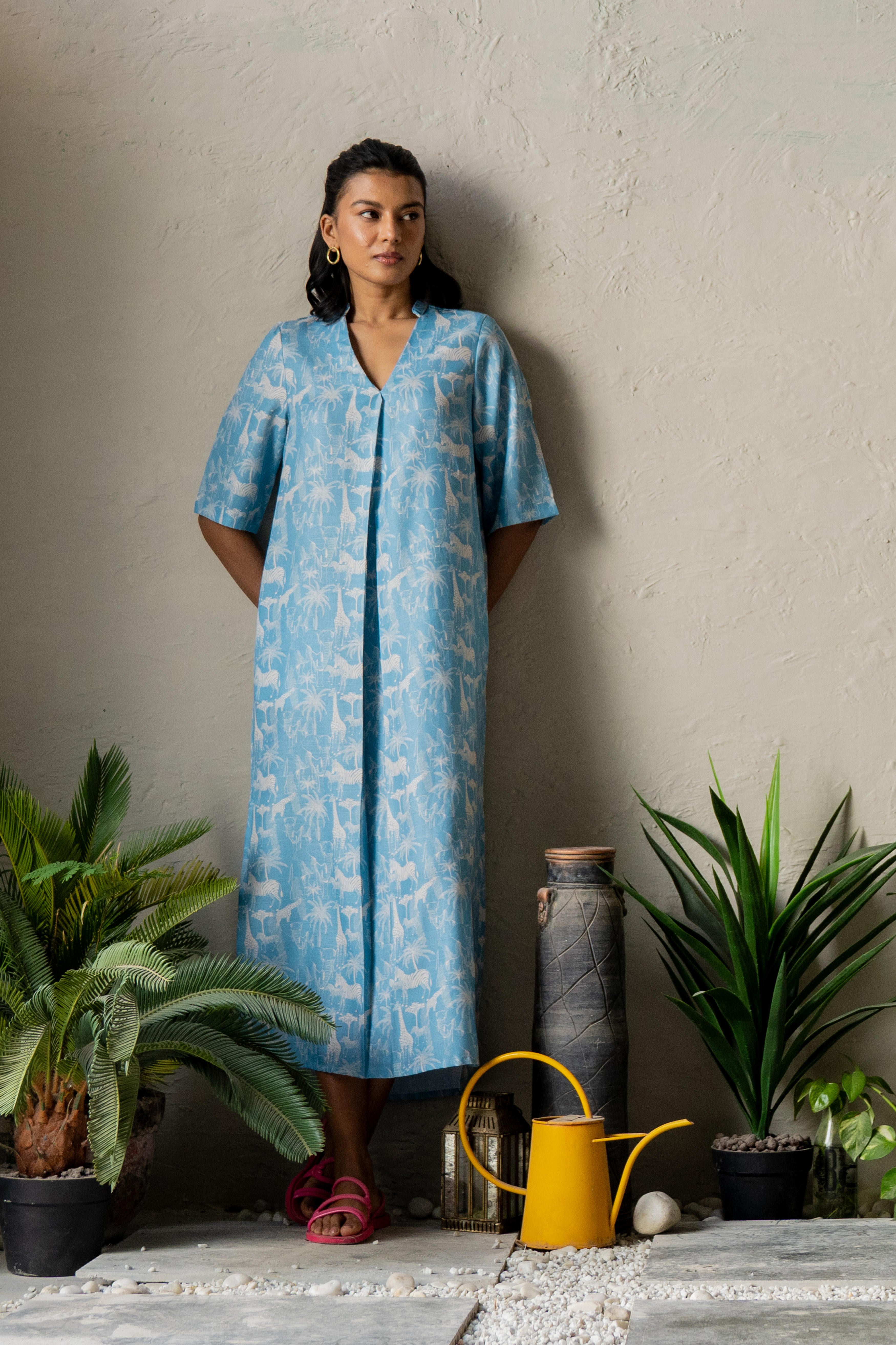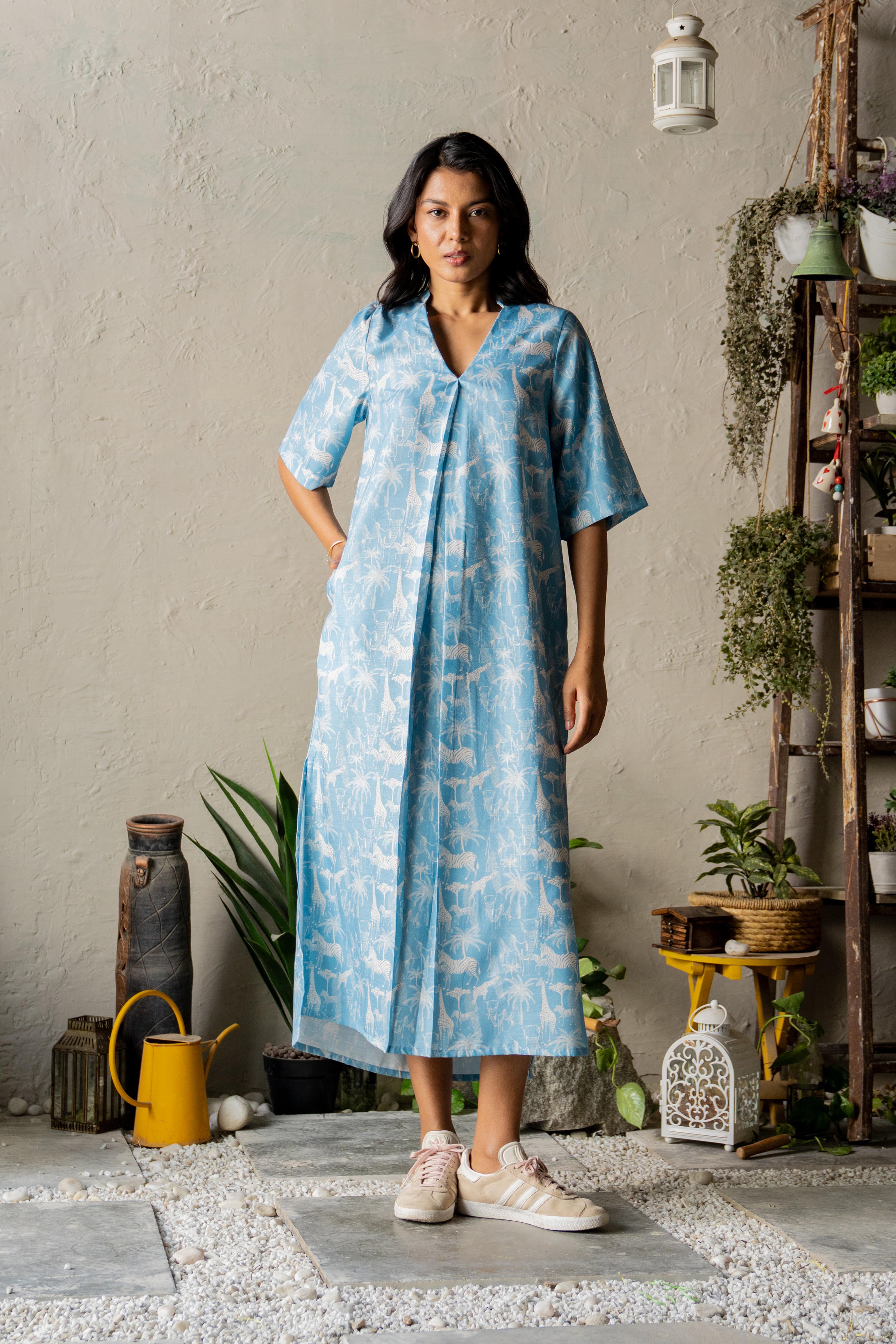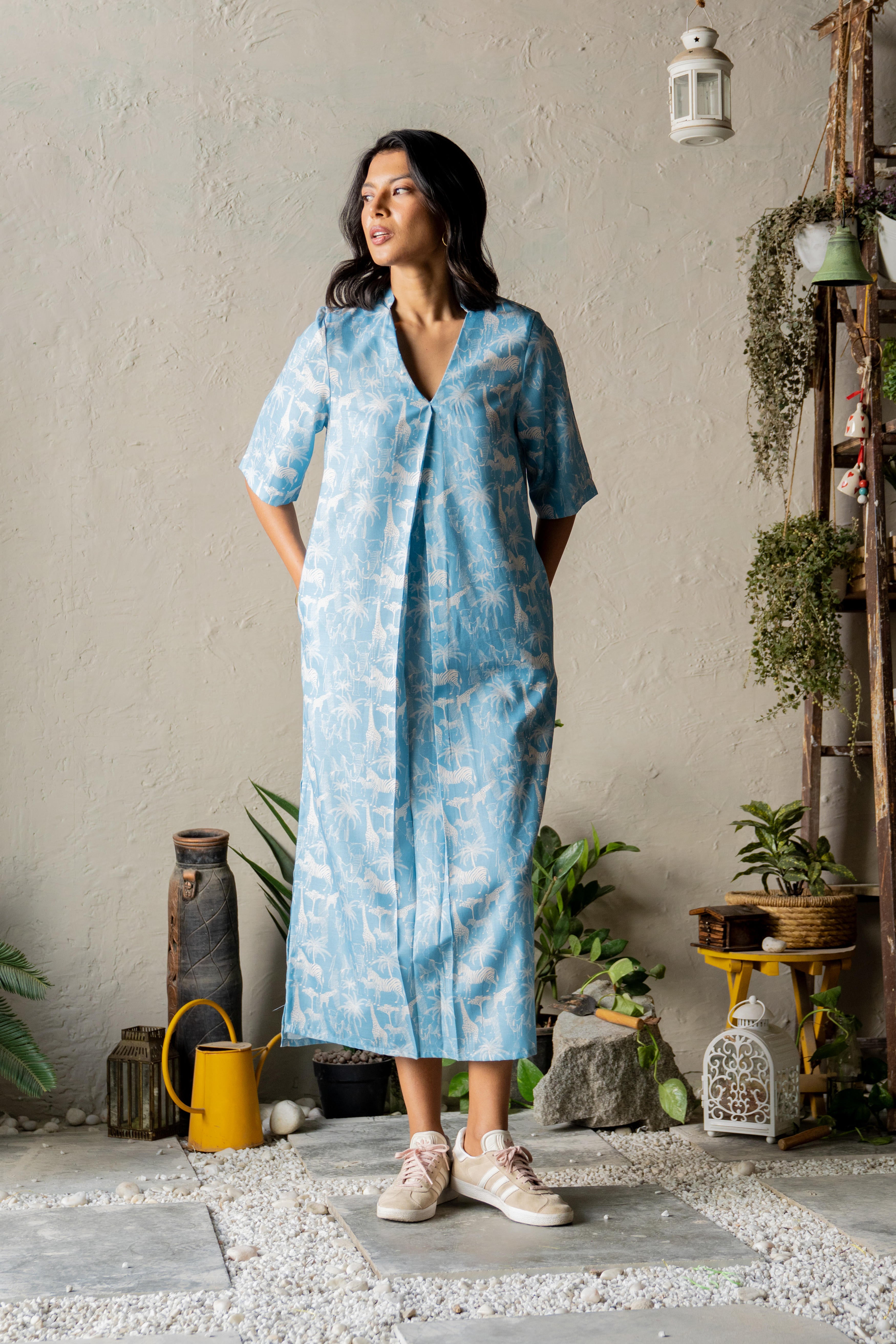 Inspired by the serene beauty of Kanha, this dress combines effortless elegance with practicality. Crafted in a refreshing light blue hue adorned with a jungle-inspired print, it features a straight silhouette with front pleats and convenient side slits for ease and comfort. Complete with functional side pockets, this versatile piece is a wardrobe must-have, perfect for embracing your love for dresses with a fresh and modern flair.