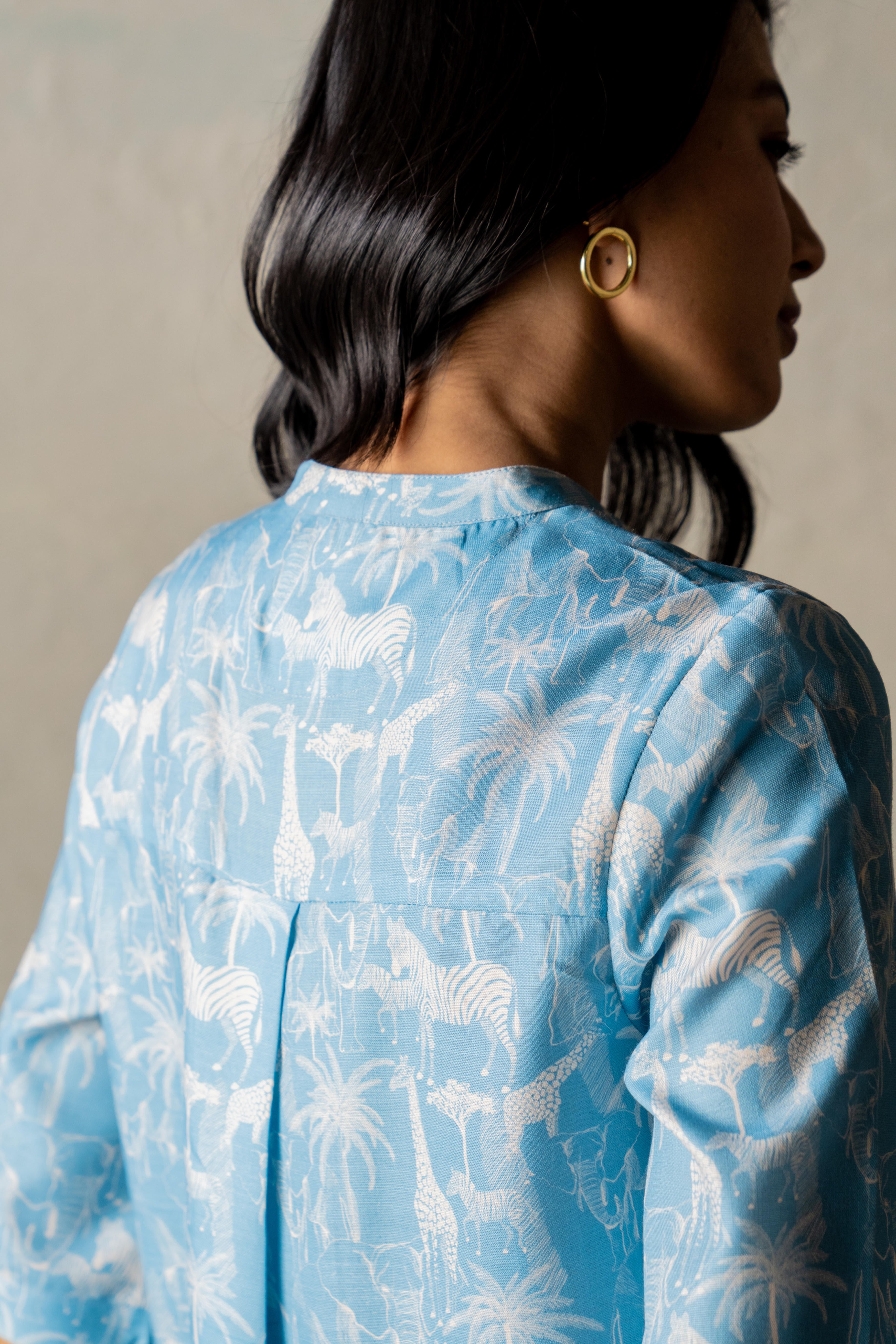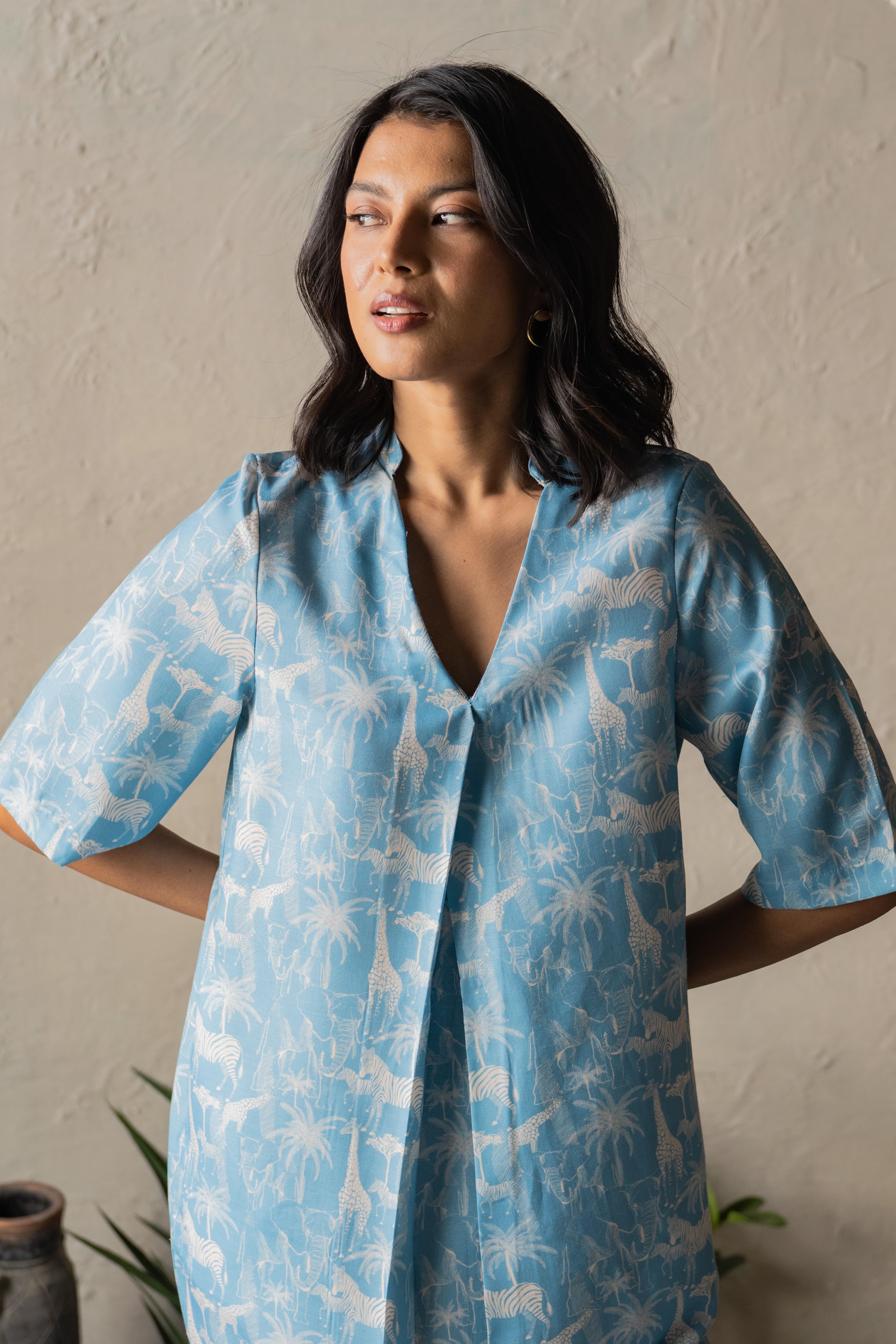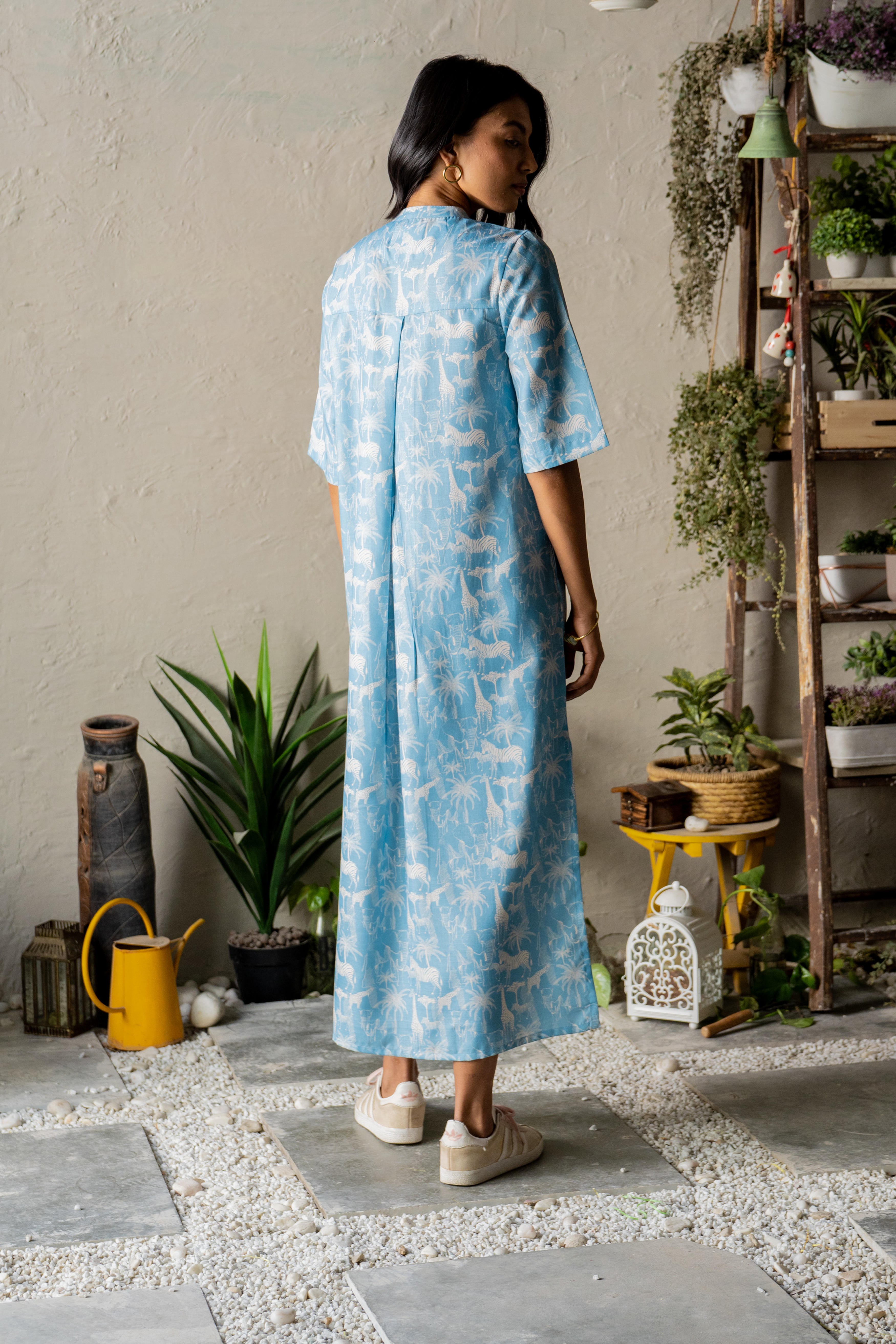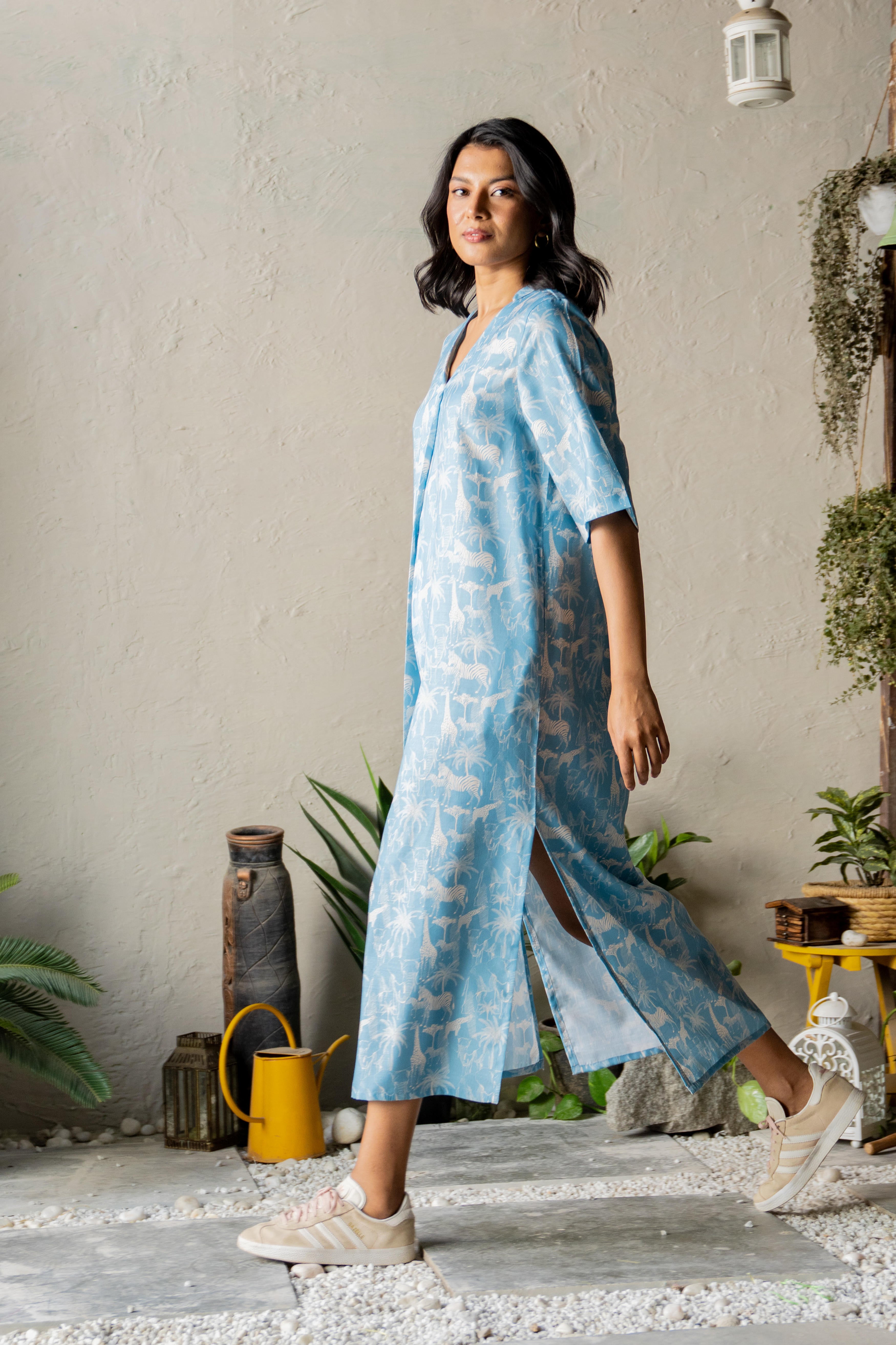 Inspired by the serene beauty of Kanha, this dress combines effortless elegance with practicality. Crafted in a refreshing light blue hue adorned with a jungle-inspired print, it features a straight silhouette with front pleats and convenient side slits for ease and comfort. Complete with functional side pockets, this versatile piece is a wardrobe must-have, perfect for embracing your love for dresses with a fresh and modern flair.