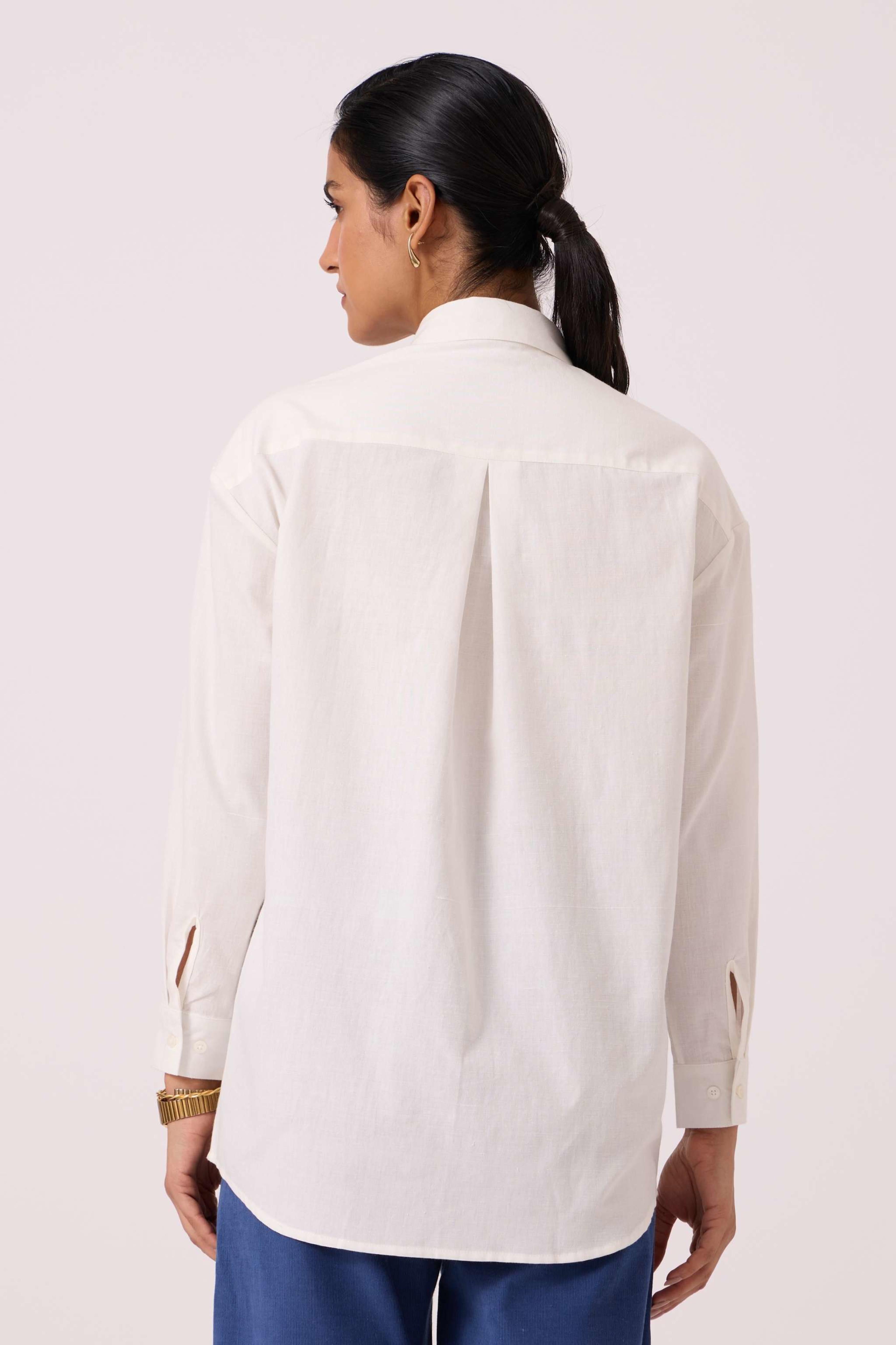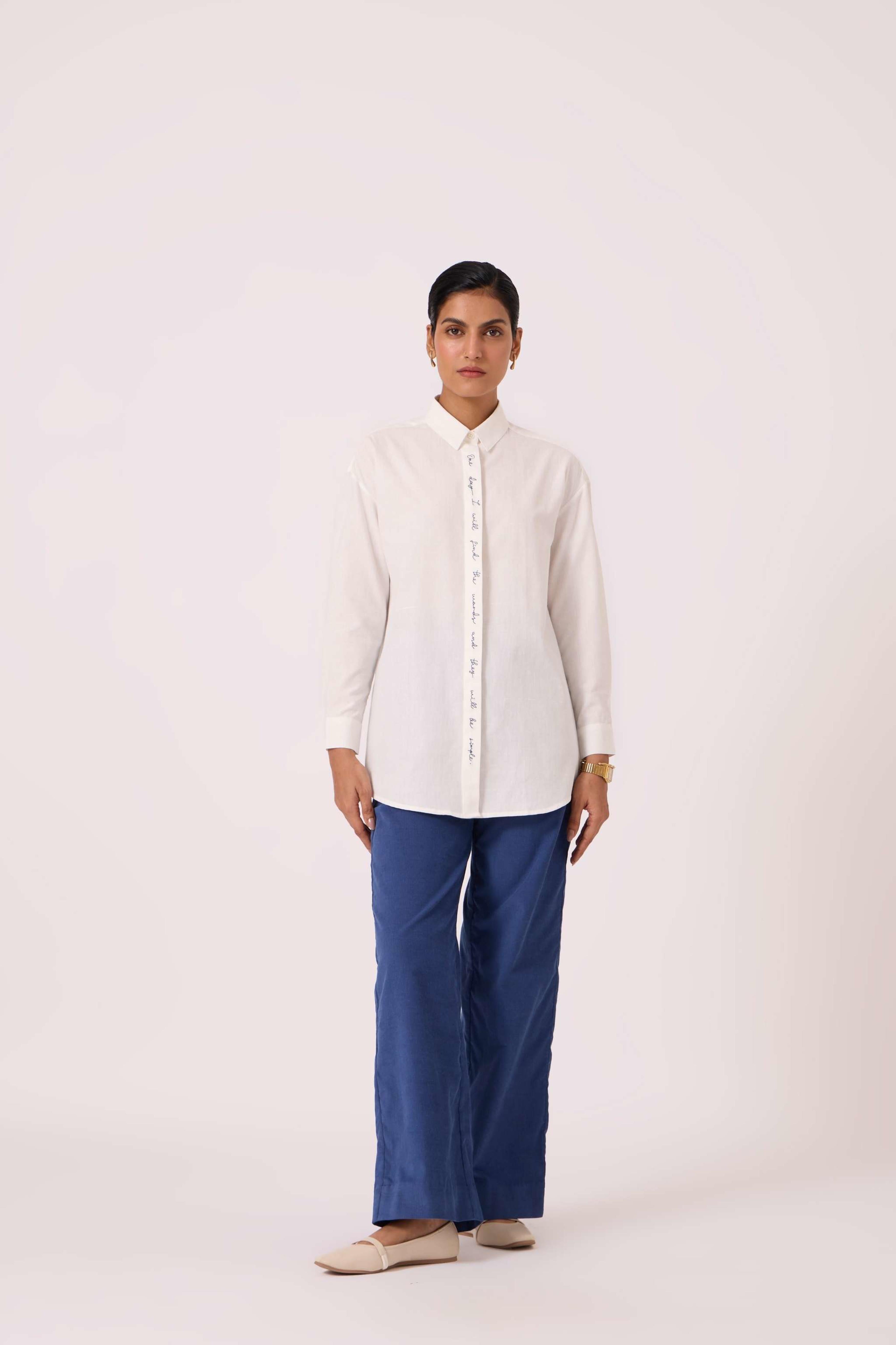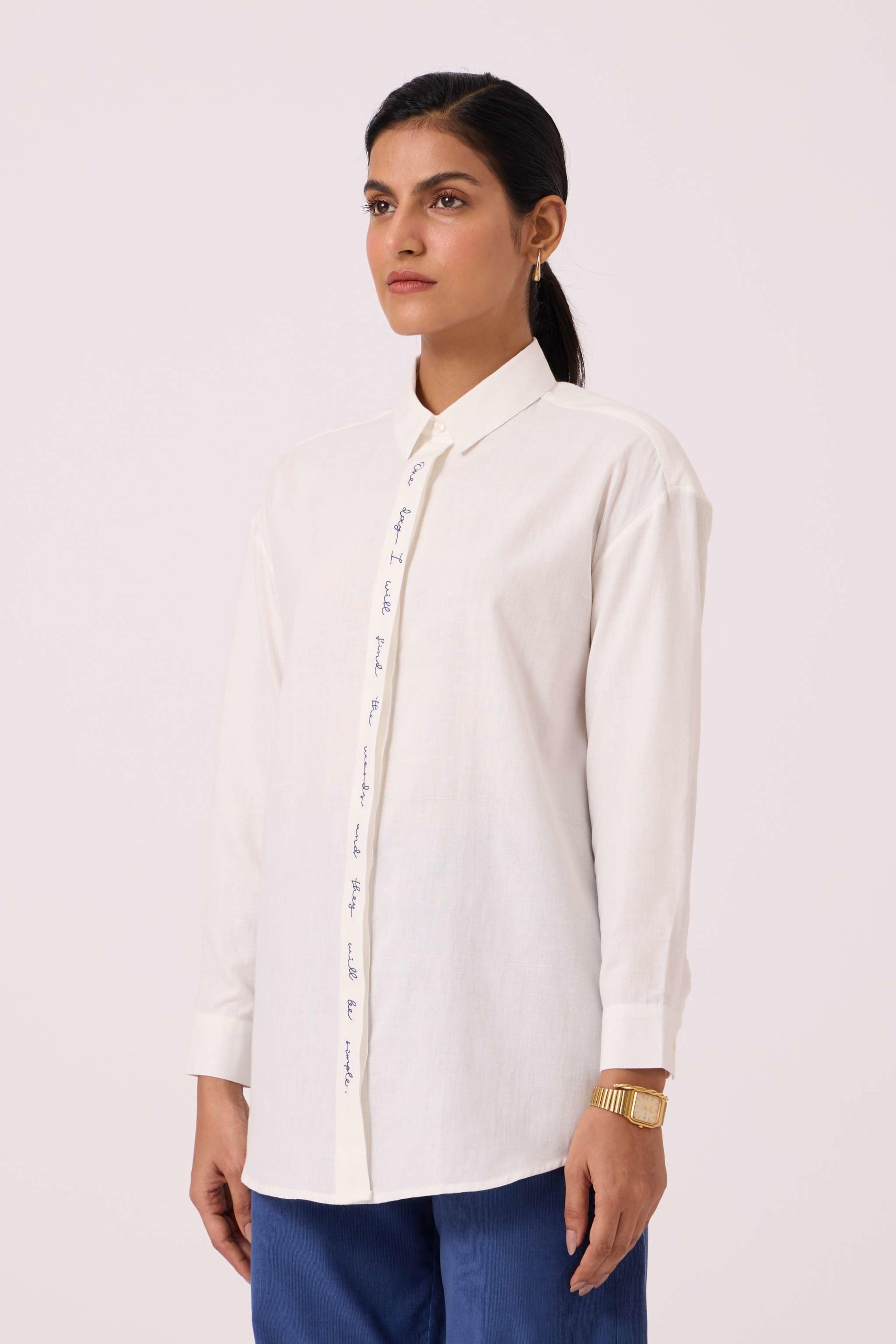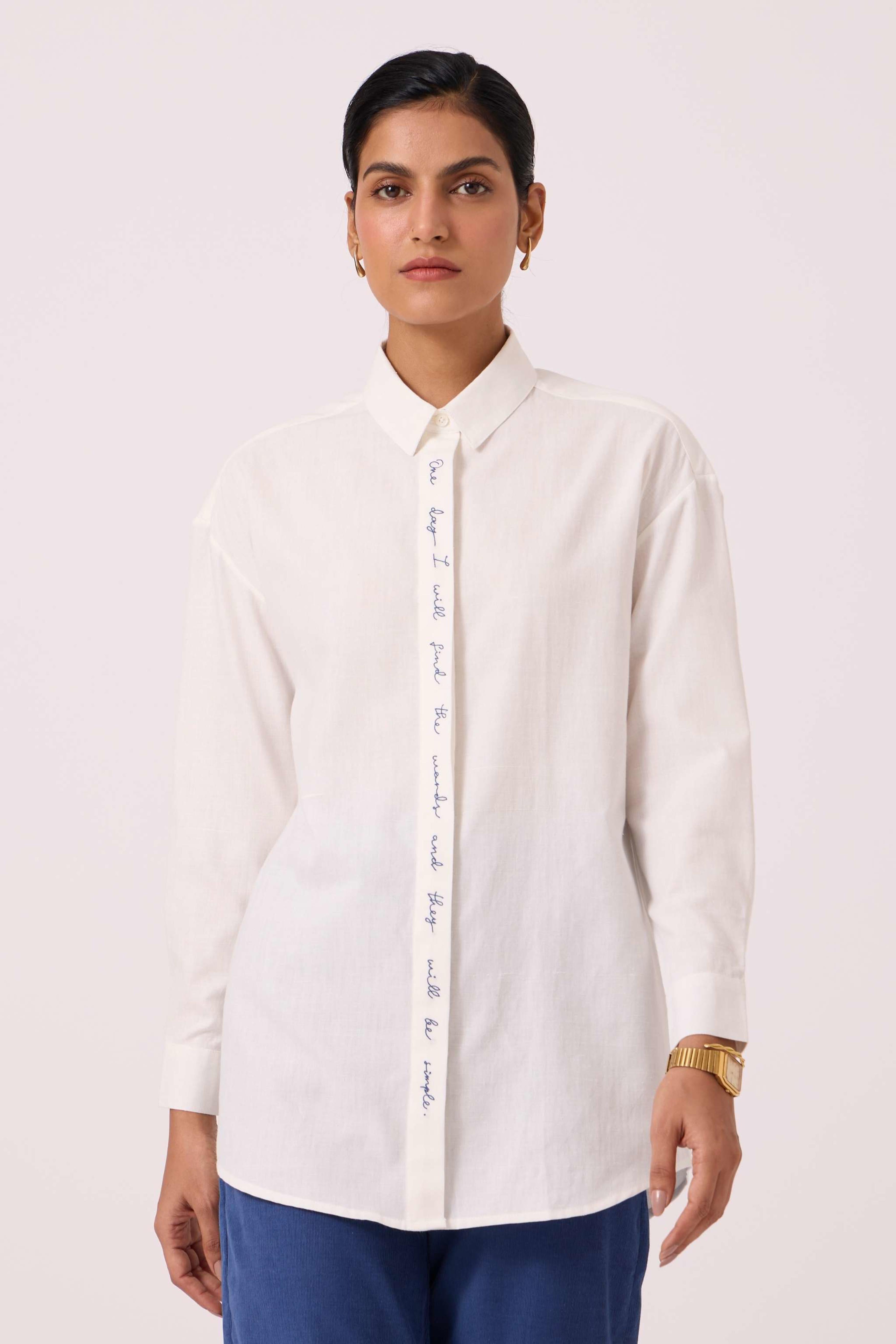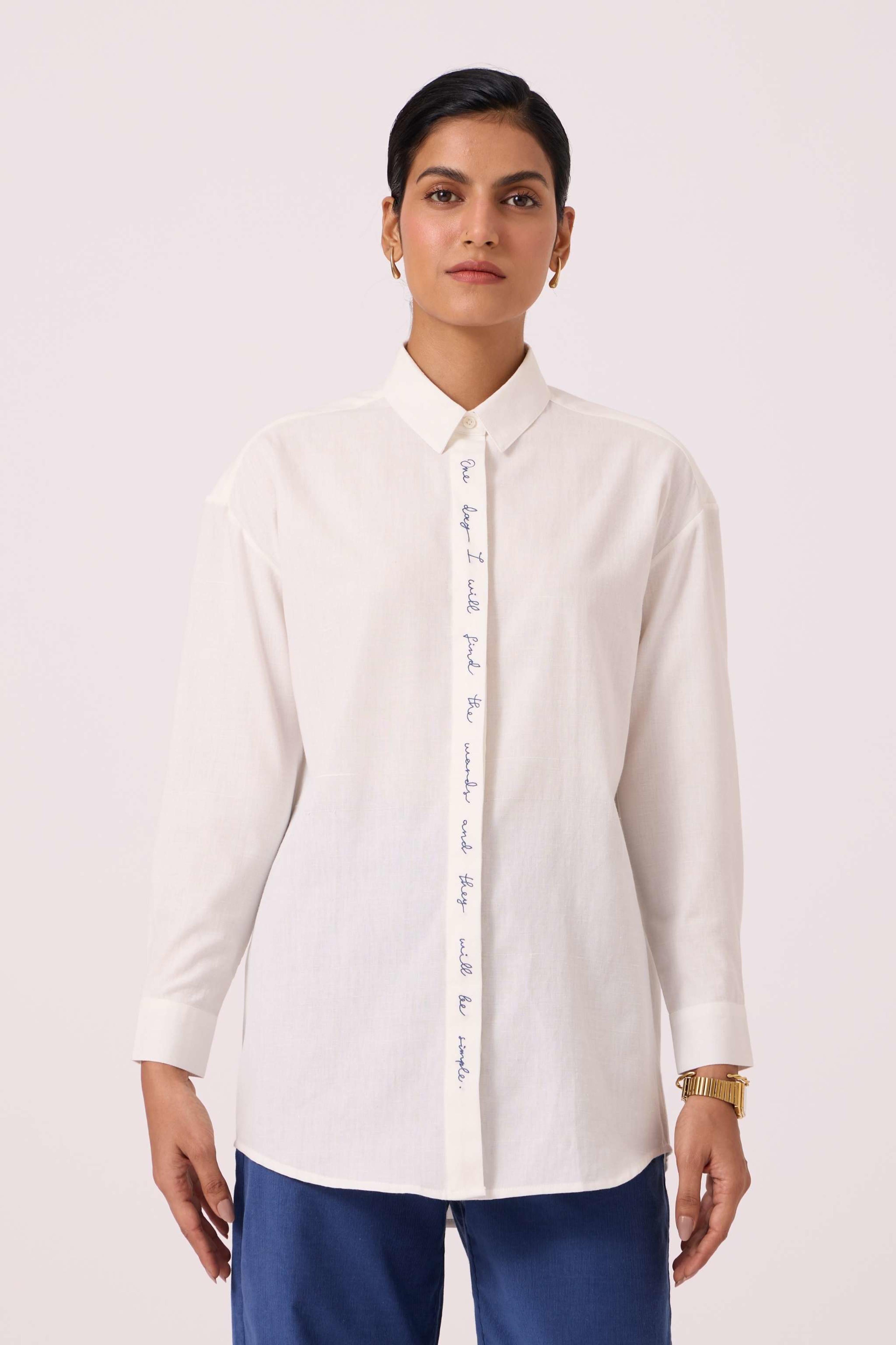 This *regular-fit shirt* features a *slim collar* and a *front concealed placket* for a clean, seamless look. It has a *slightly curved hemline* and is detailed with an *embroidered button placket*. The garment is *finely hand-embroidered in The Summer House studio*, and any slight differences in the embroidery highlight the handcrafted process. The model, Chhavi, is 5'6" and is wearing a size XS.