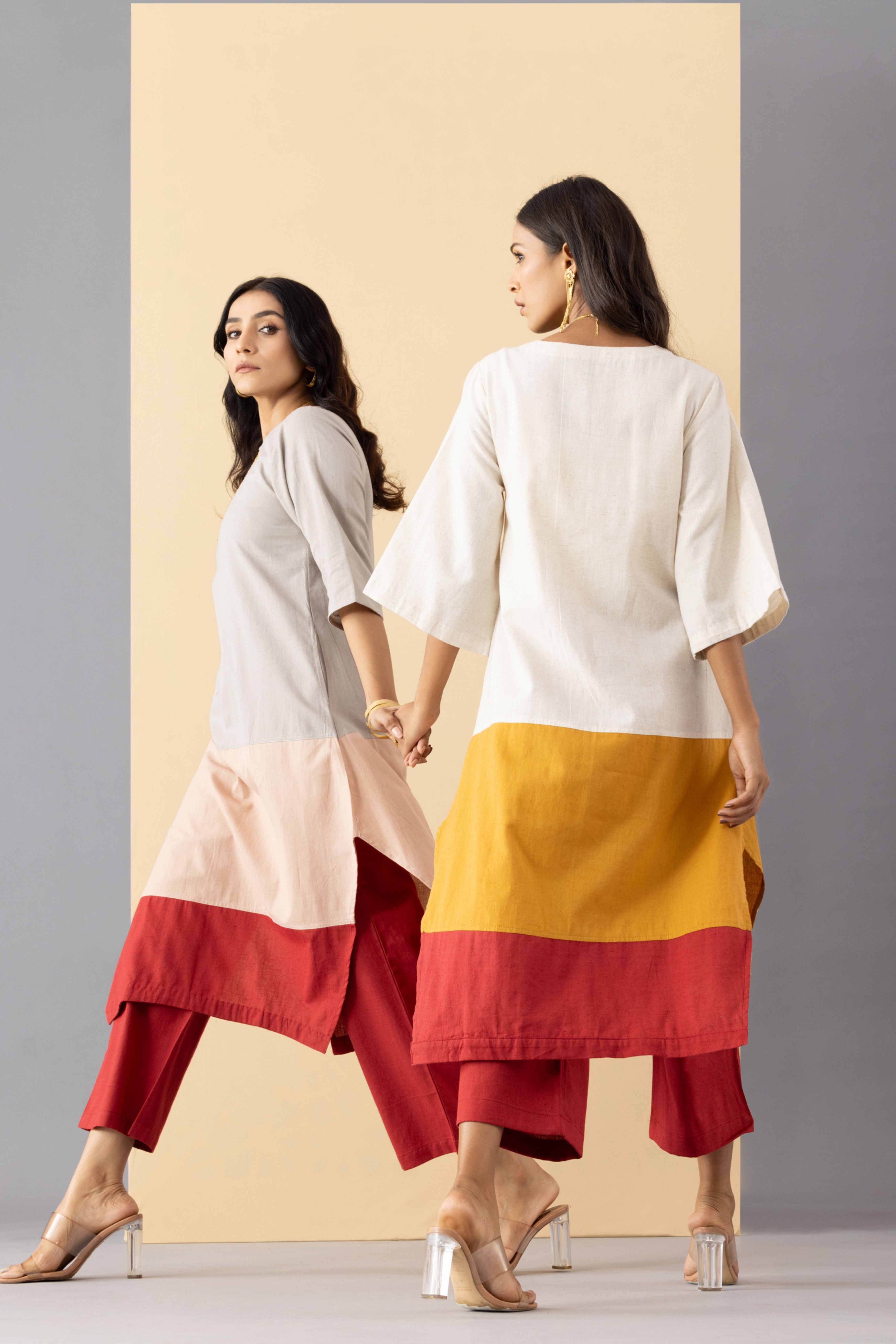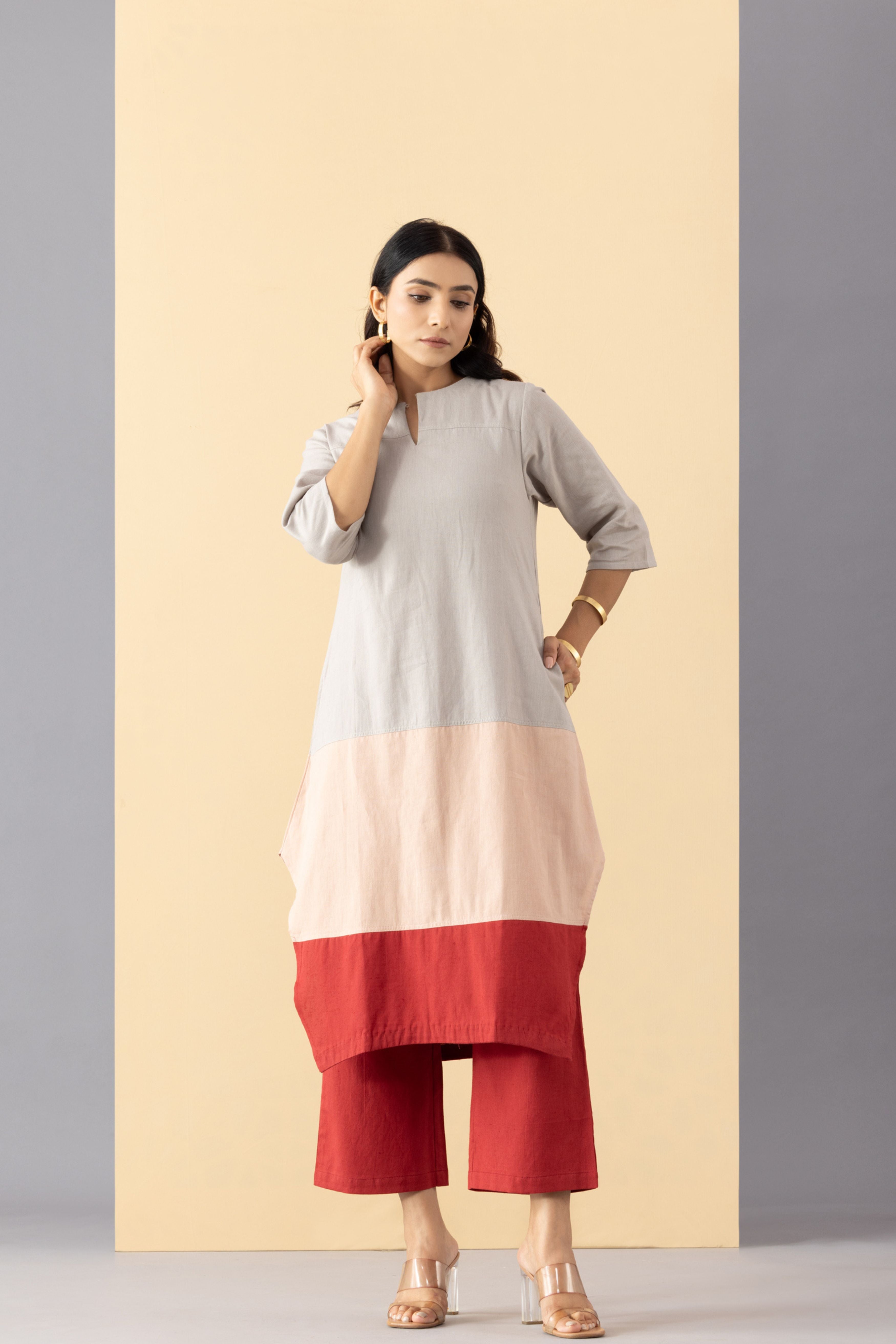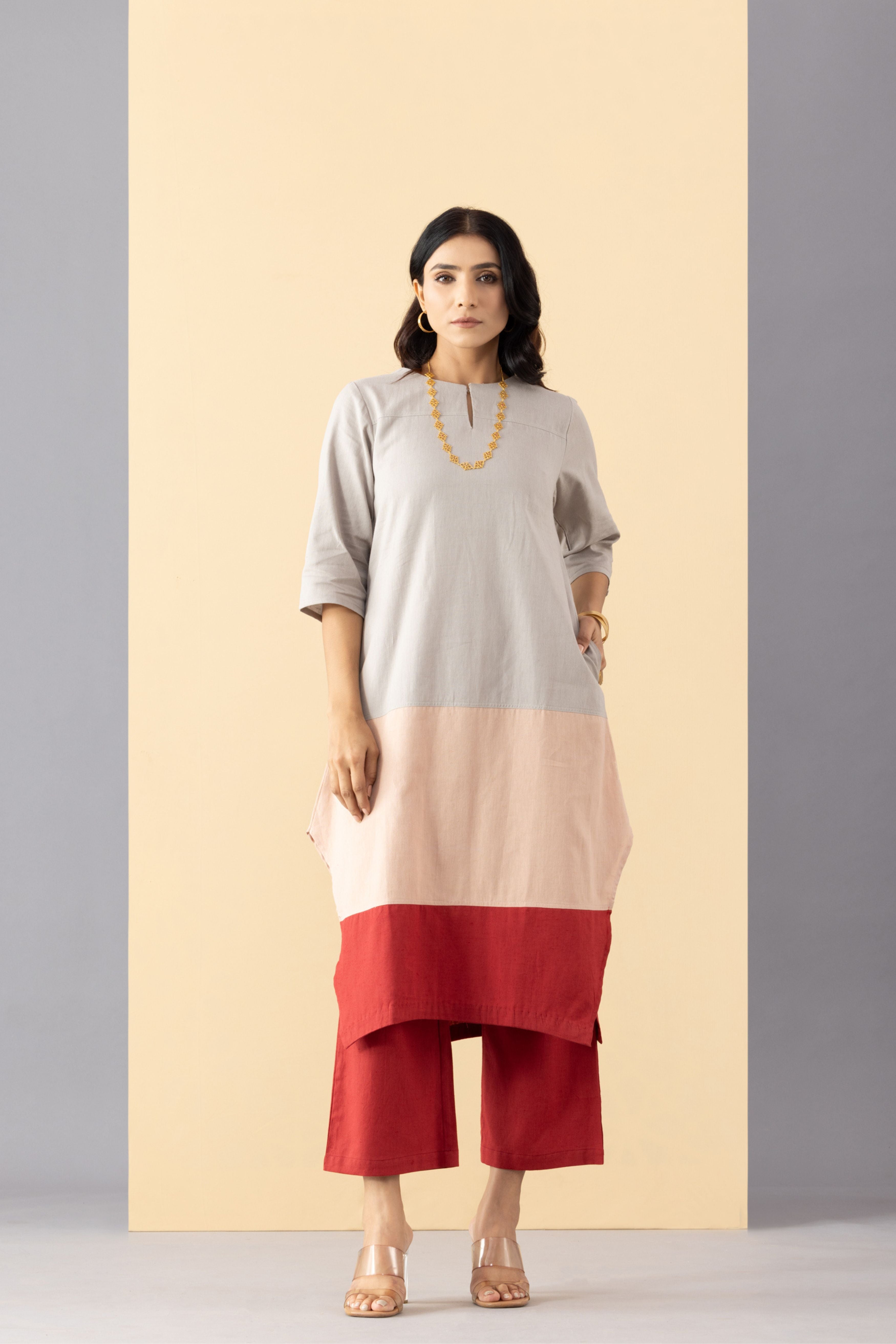 This three colour paneled kurti tunic is crafted in light weight Khadi Cotton. Designed to be worn with our scarlet khadi pants . This tunic is made with breathable, comfort fabric. It is perfect for daily wear or festive occasions for that subtle minimal look. - Front opening ,tunic has side pockets - Regular fit - Model is wearing size S - This is a textile fabric. The subtle imperfections in the weave, texture and colors are a natural outcome of handcrafted textiles and not a defect.