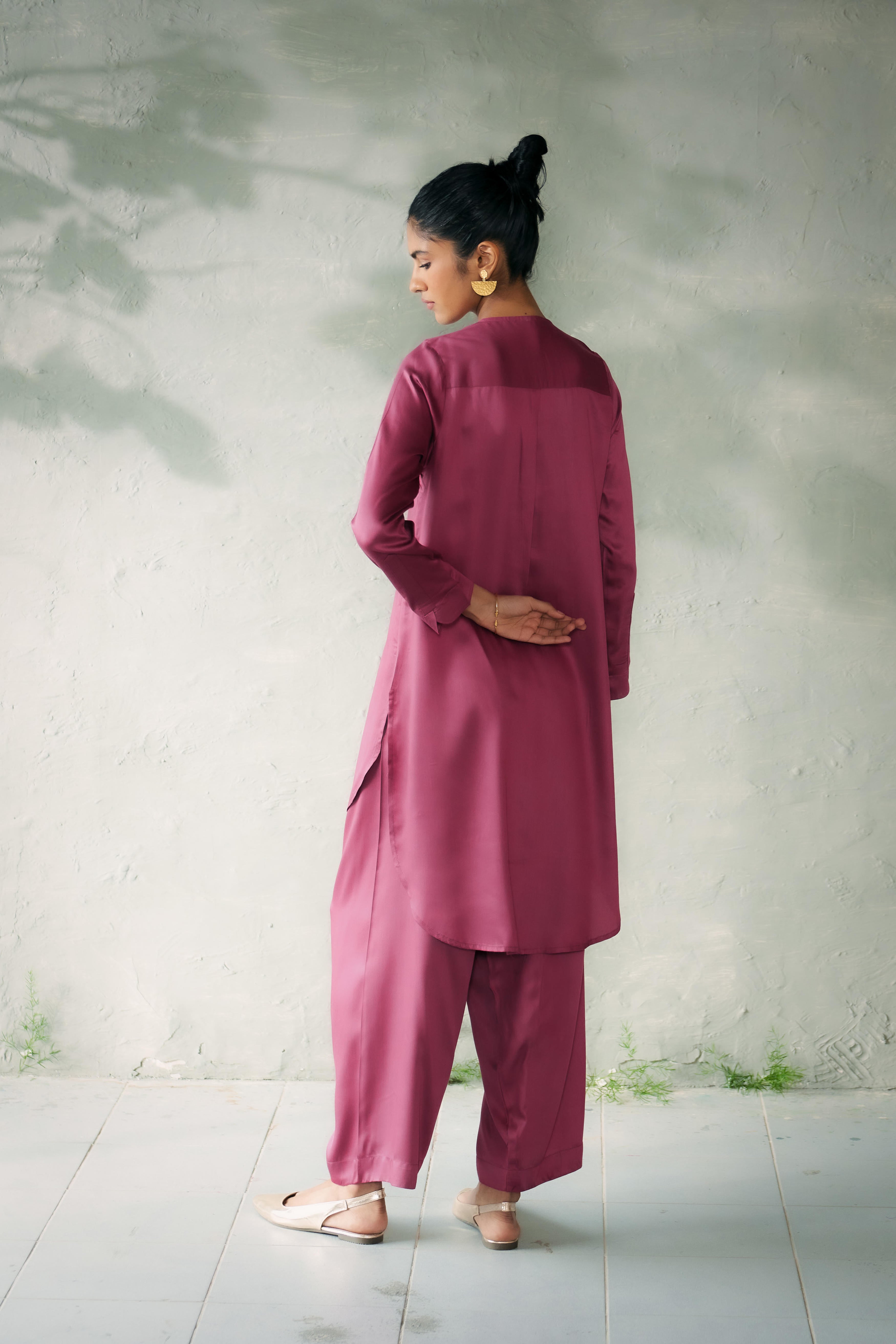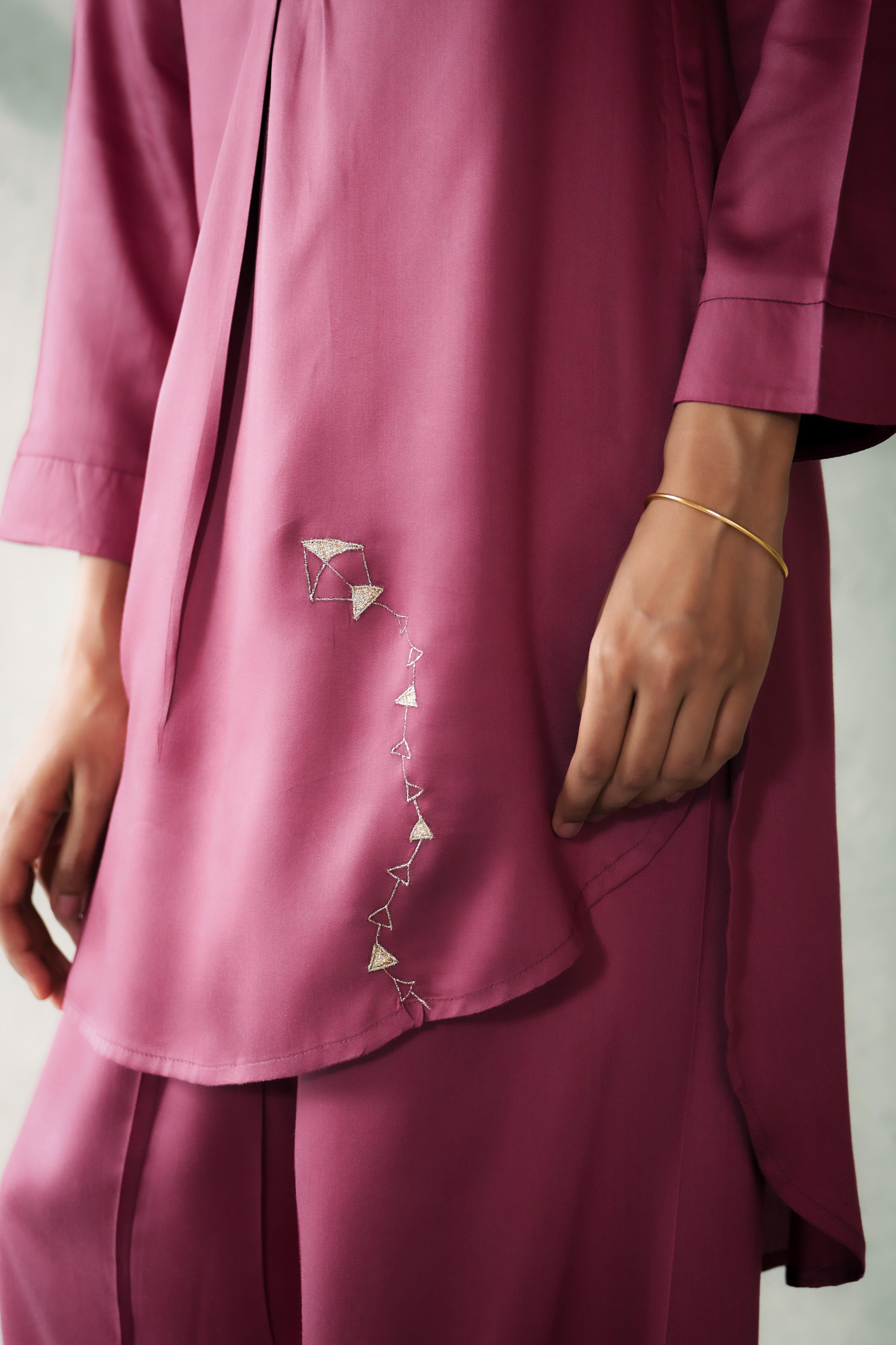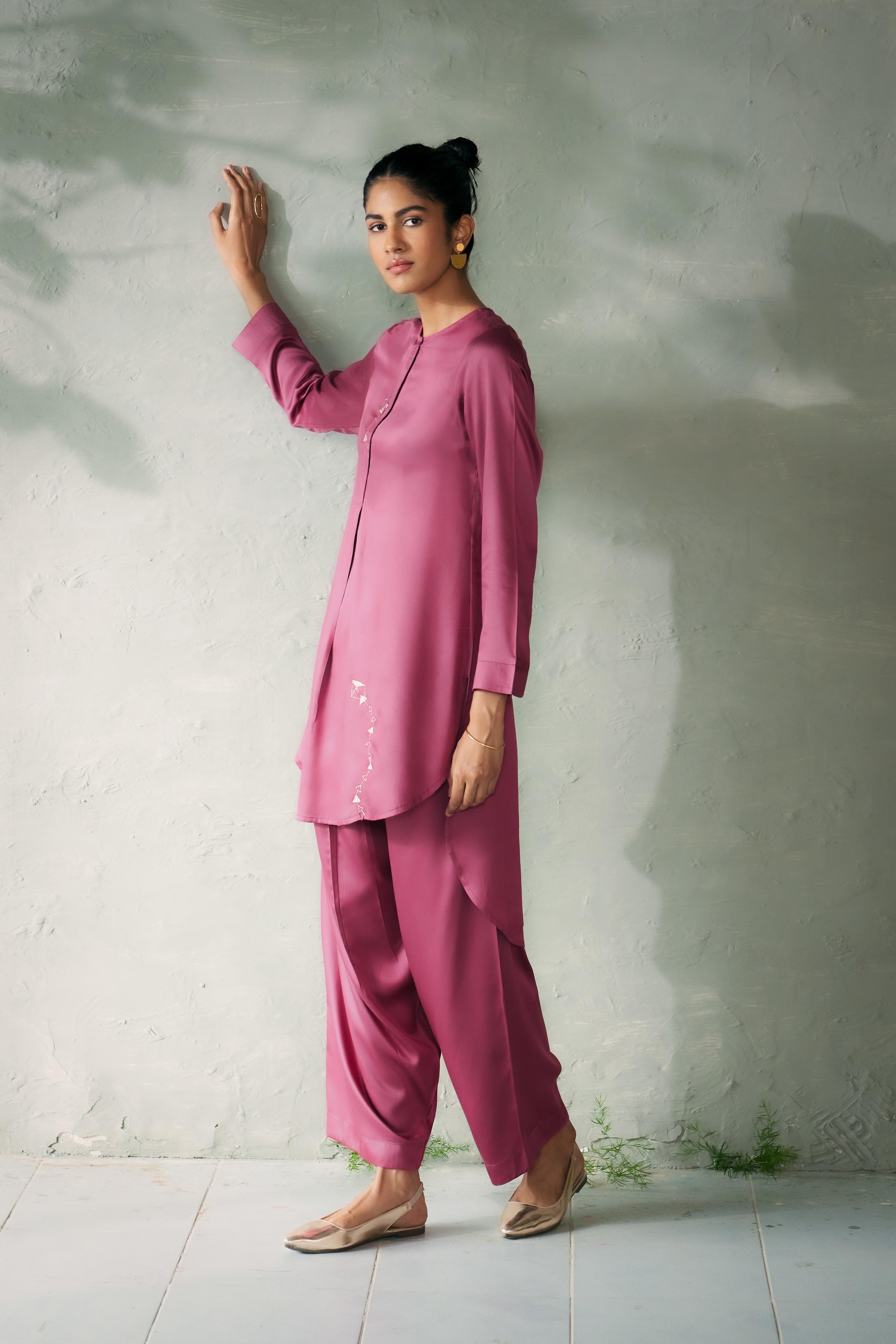 The Kite Fly Hi-Low Kurta Set blends timeless elegance with a modern silhouette and a delicate handembroidery. Paired with coordinated loose-fit tulip pants that taper delicately at the ankle, the belt is secured with a drawstring, this ensemble offers comfort and sophistication in equal measure. Perfect for festive occasions or elegant gatherings, it’s a style that stands out without trying too hard. Model is 5'10" & wearing Size 'S'