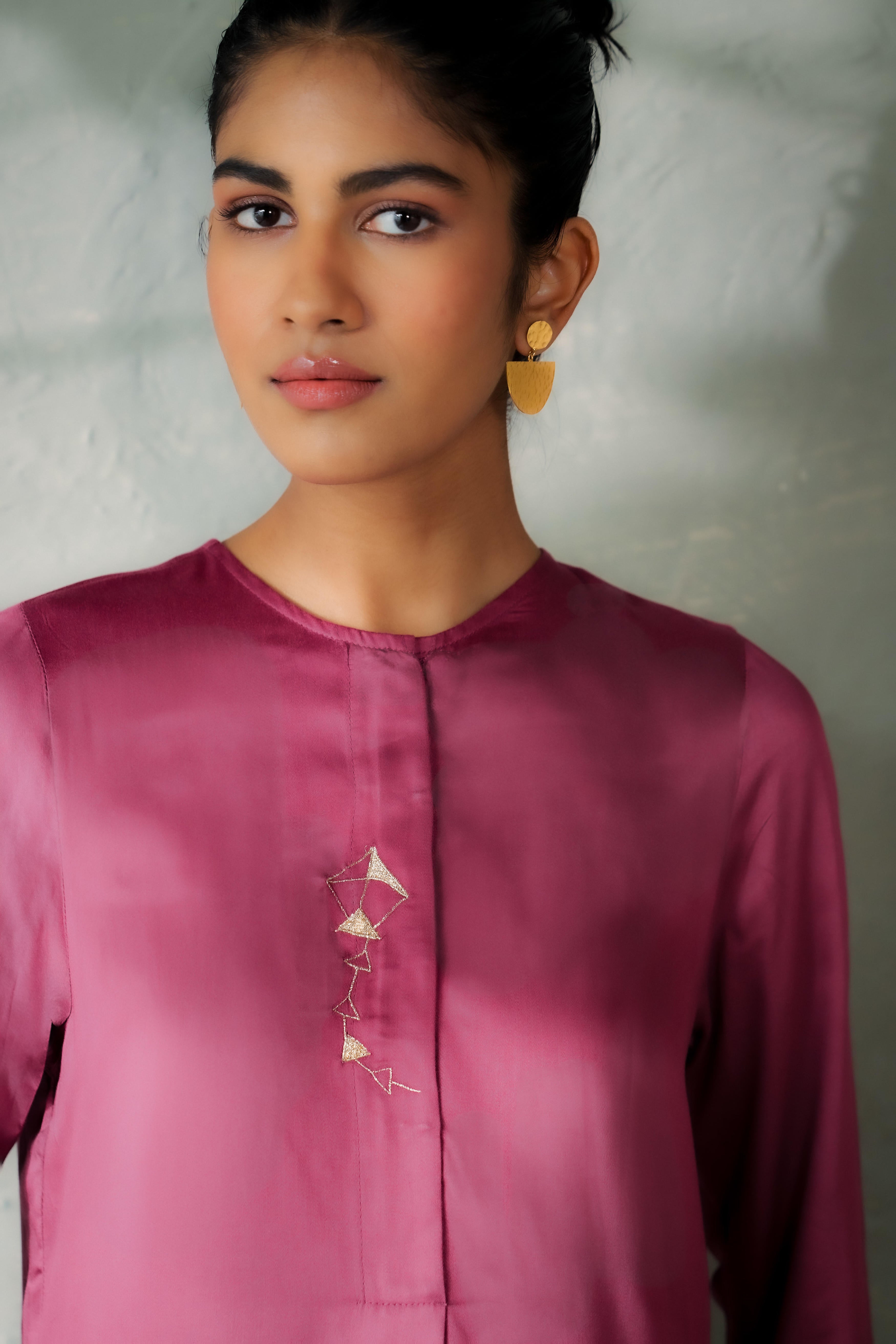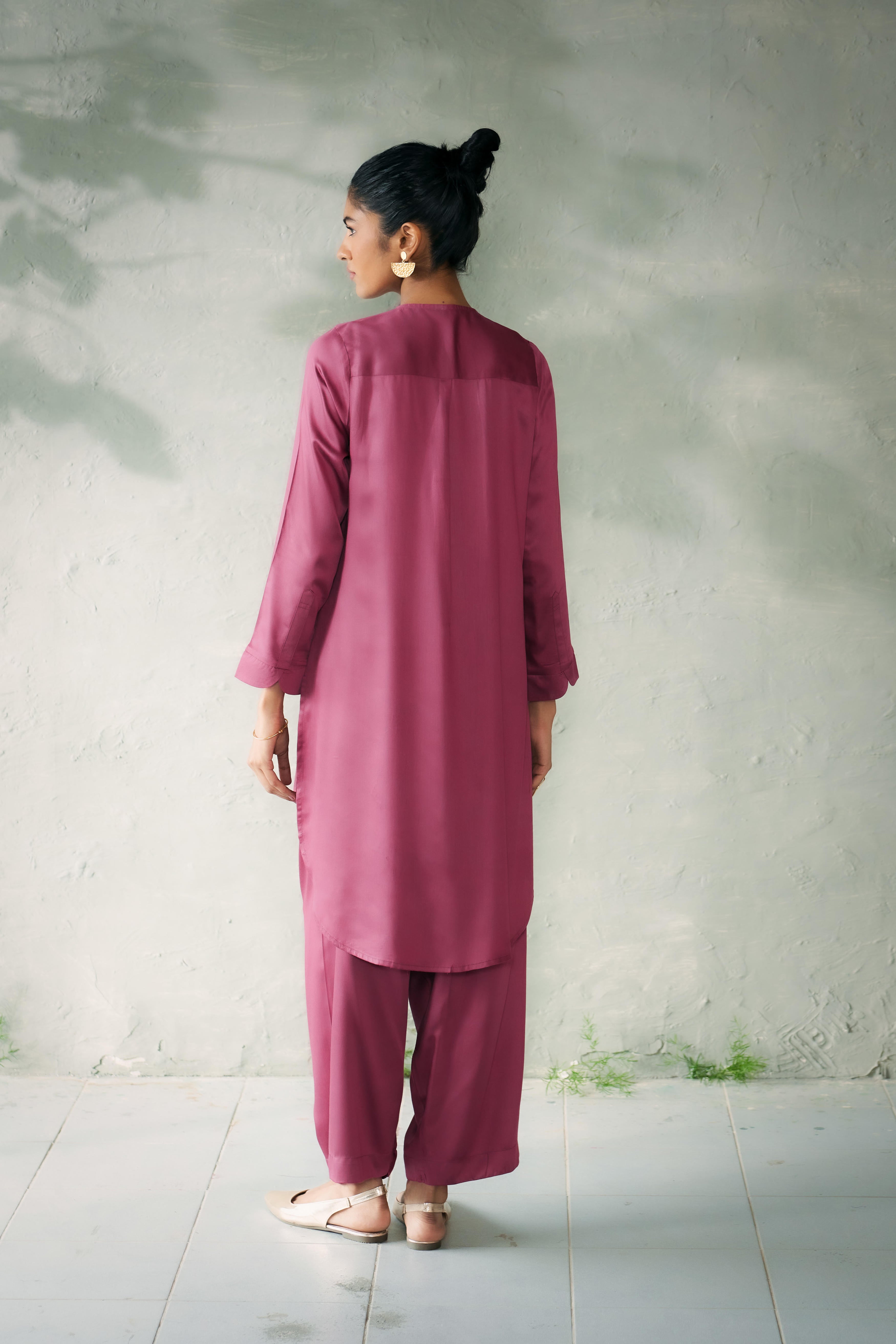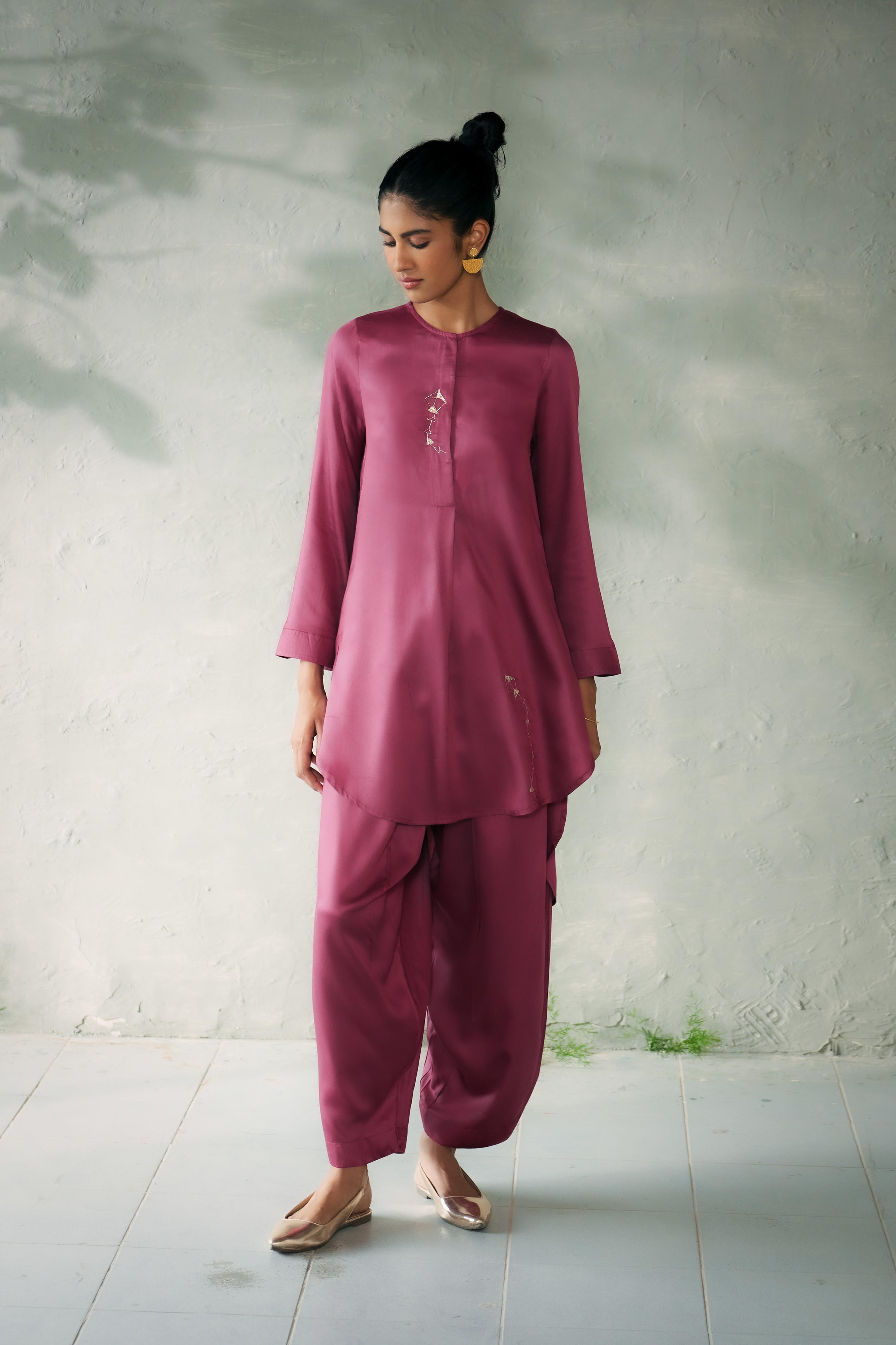 The Kite Fly Hi-Low Kurta Set blends timeless elegance with a modern silhouette and a delicate handembroidery. Paired with coordinated loose-fit tulip pants that taper delicately at the ankle, the belt is secured with a drawstring, this ensemble offers comfort and sophistication in equal measure. Perfect for festive occasions or elegant gatherings, it’s a style that stands out without trying too hard. Model is 5'10" & wearing Size 'S'
