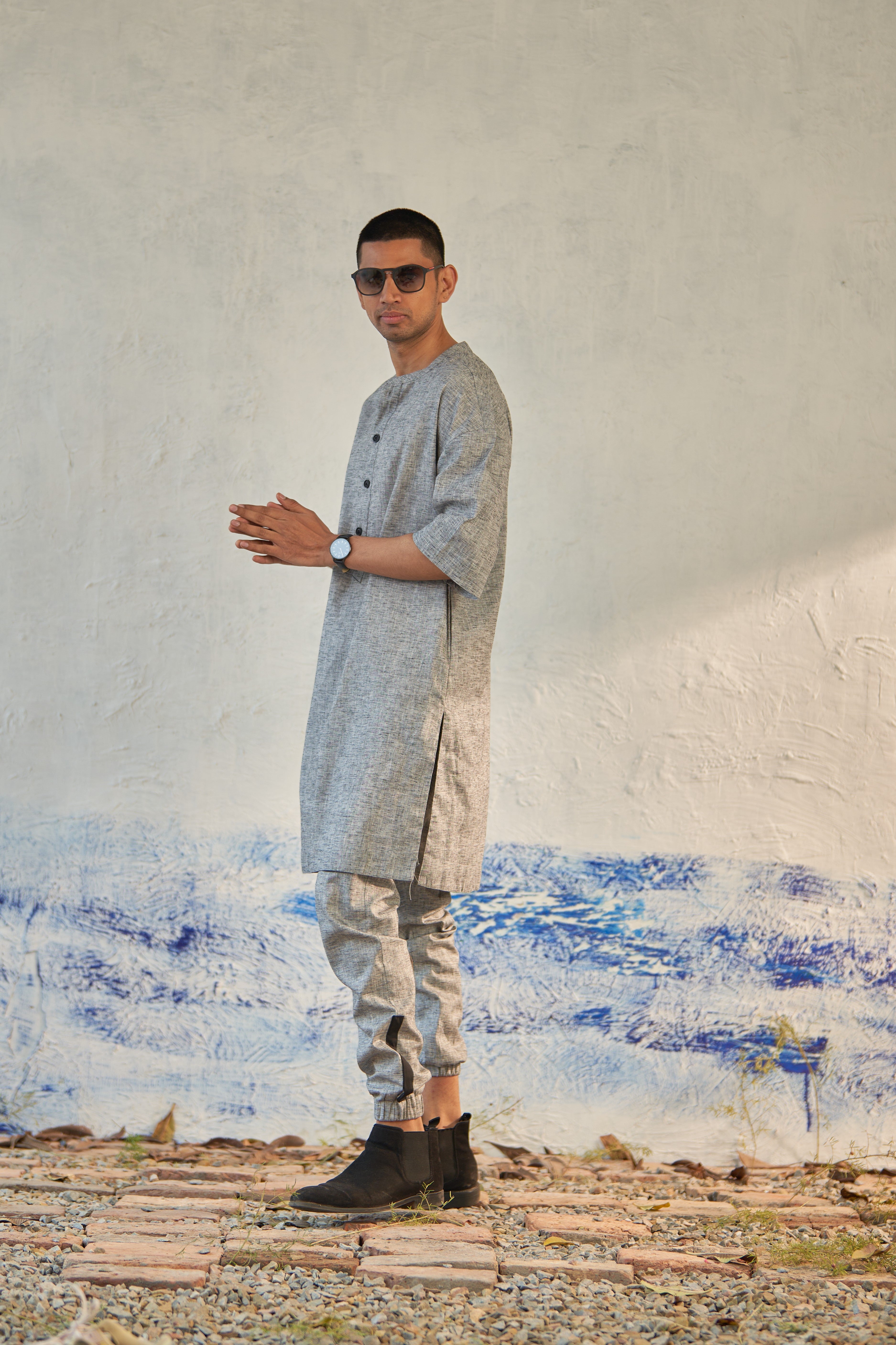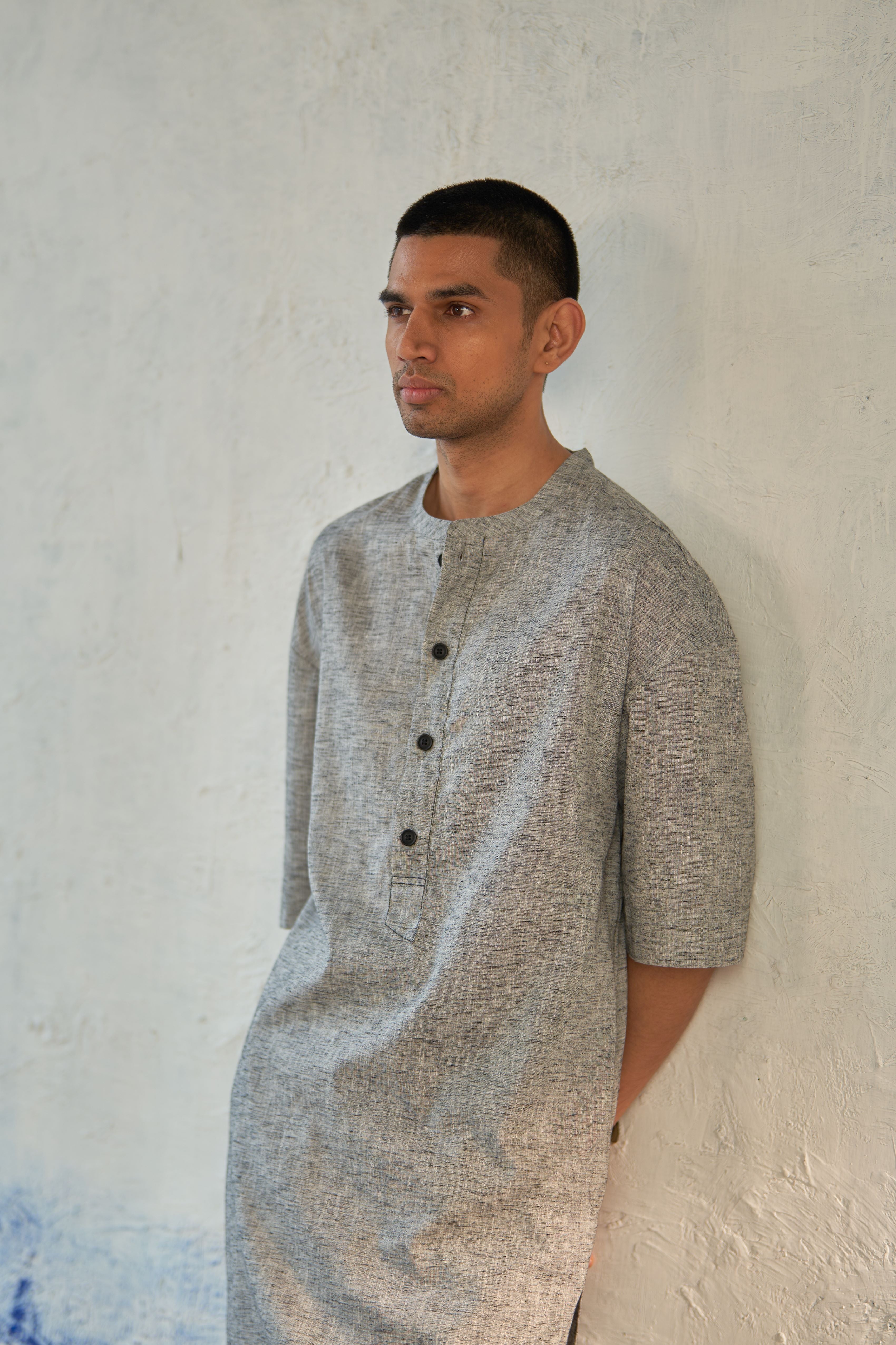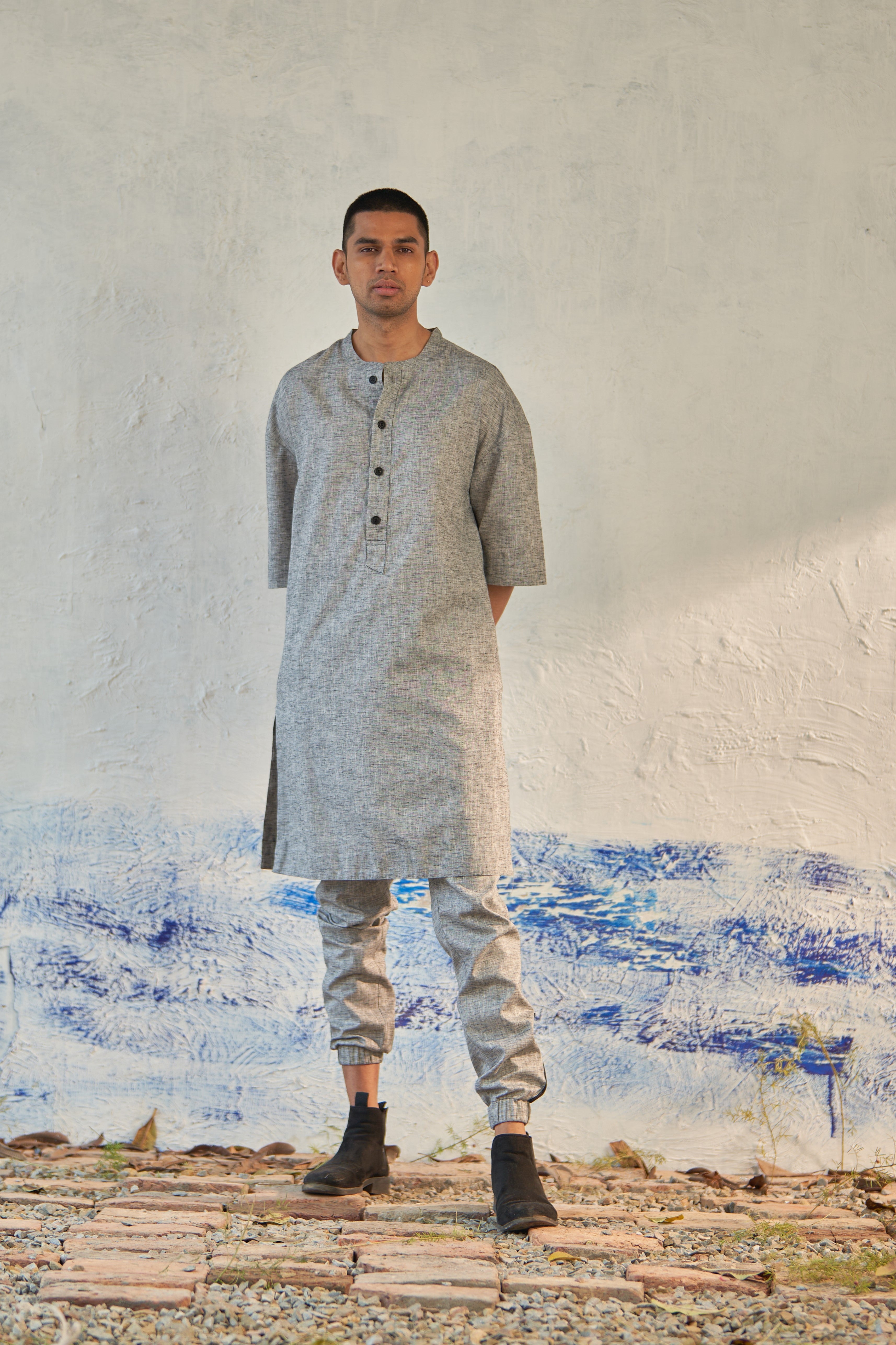 Crafted from traditional textured cotton, this kurta is reimagined with a sense of ease and spontaneity, offering both comfort and style. Boasting a broad, elongated front placket with a diagonal finish, adorned with bold black buttons for a contemporary touch. Black thread detailing on the placket adds a modern outlook