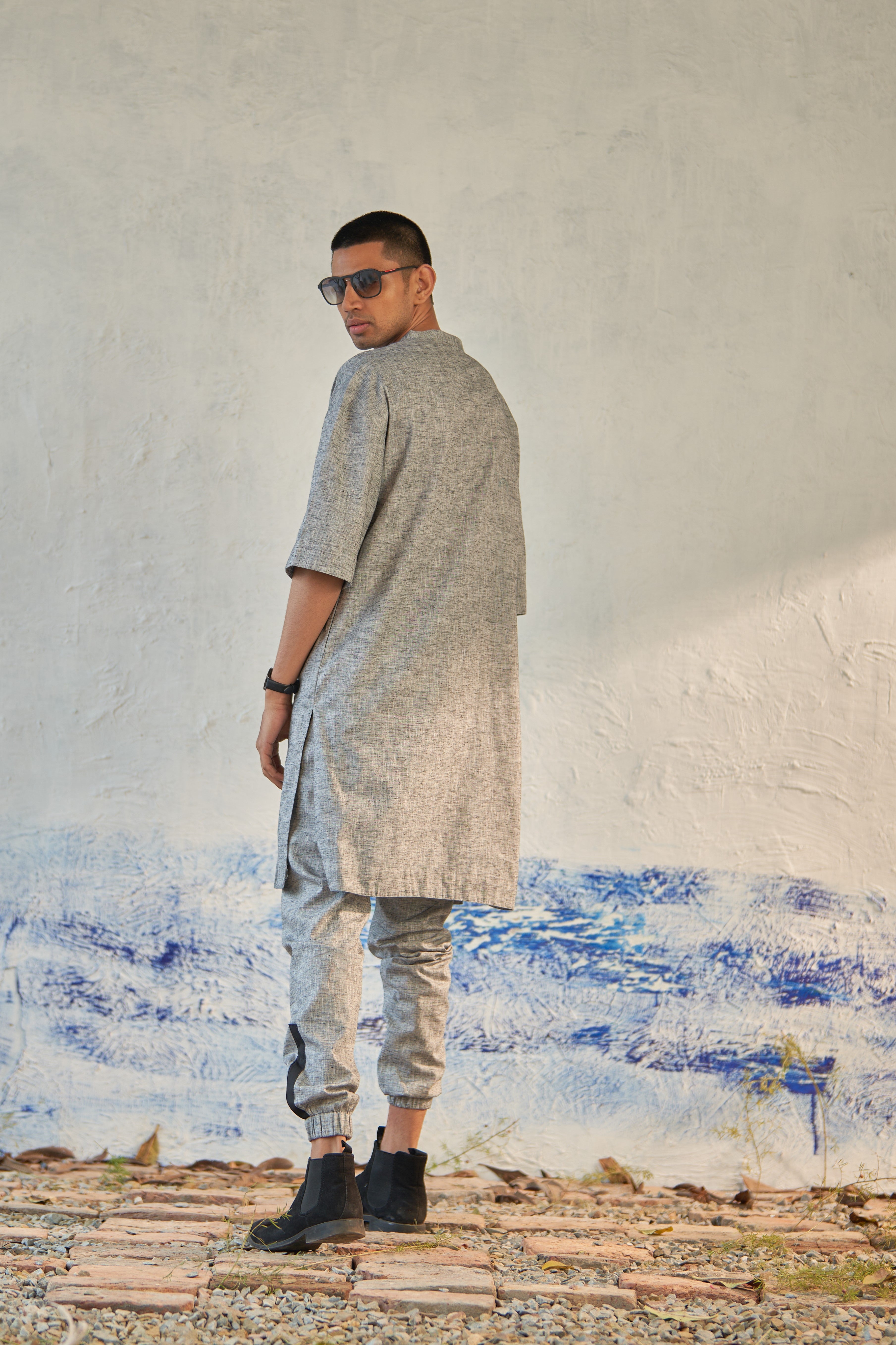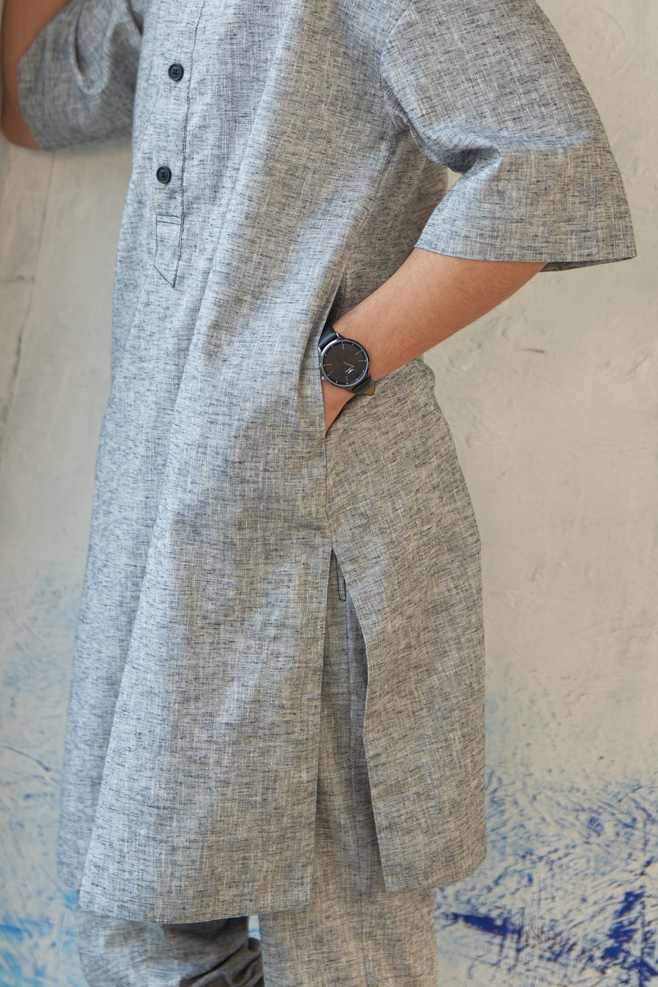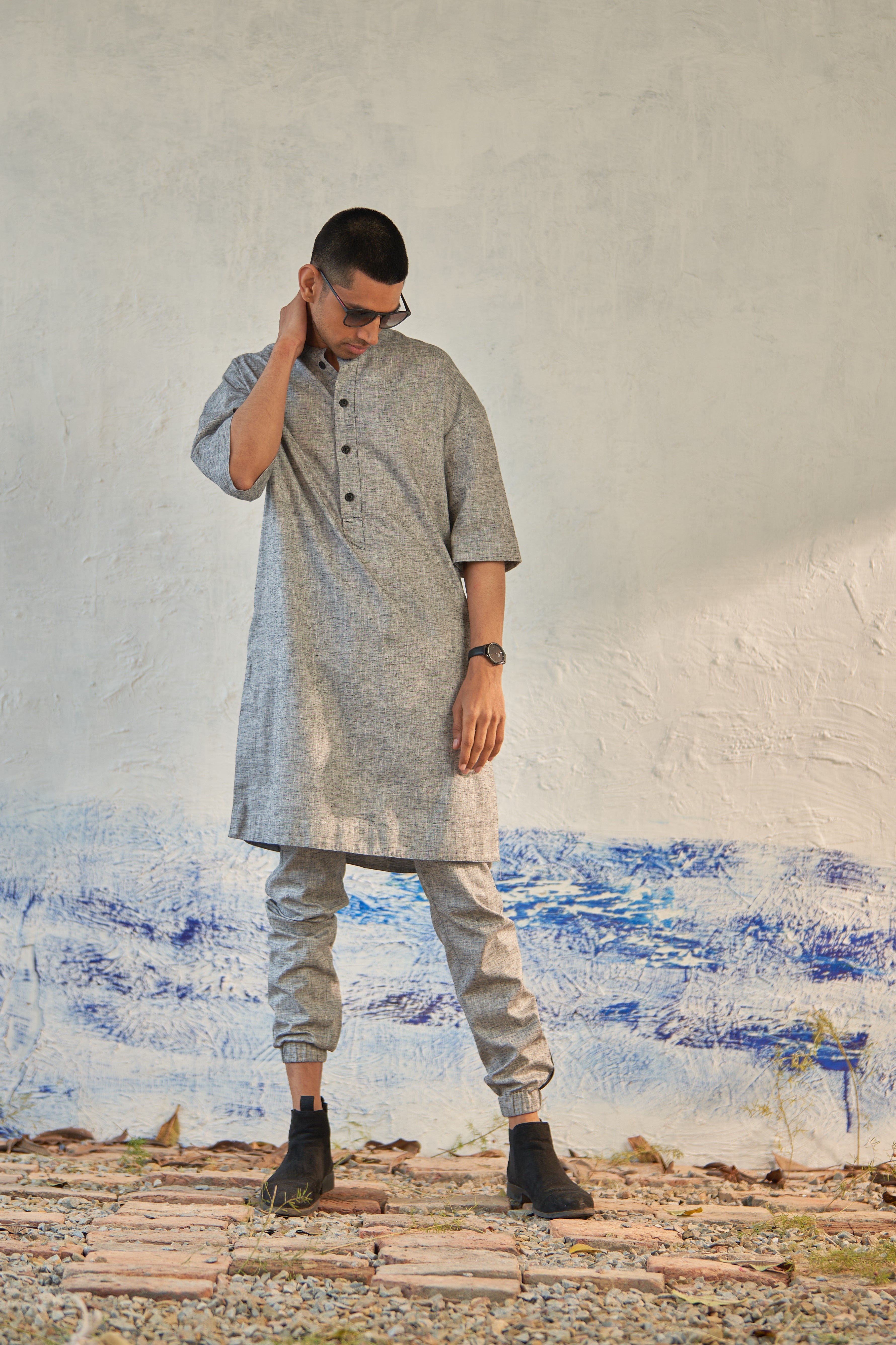 Crafted from traditional textured cotton, this kurta is reimagined with a sense of ease and spontaneity, offering both comfort and style. Boasting a broad, elongated front placket with a diagonal finish, adorned with bold black buttons for a contemporary touch. Black thread detailing on the placket adds a modern outlook