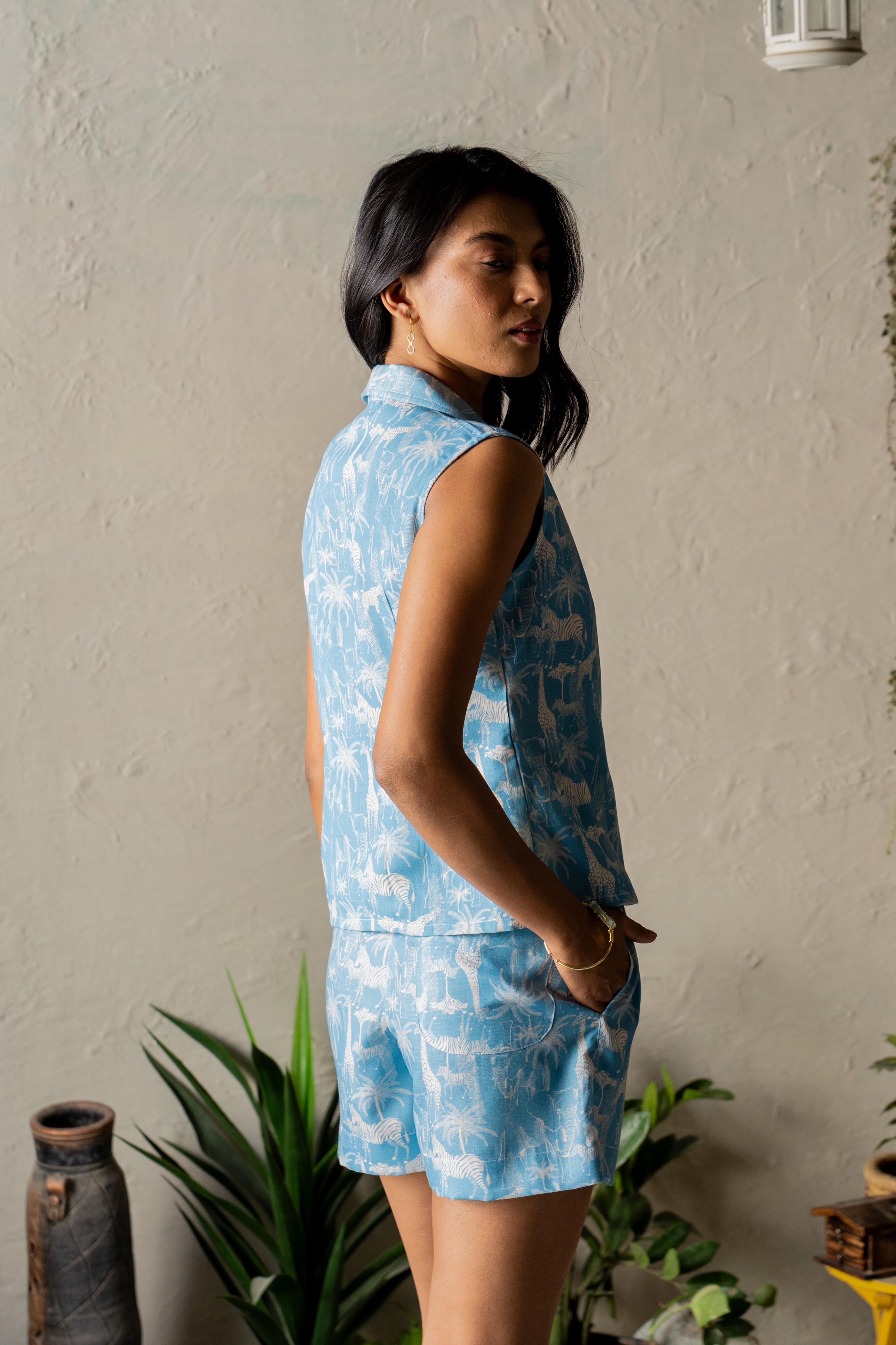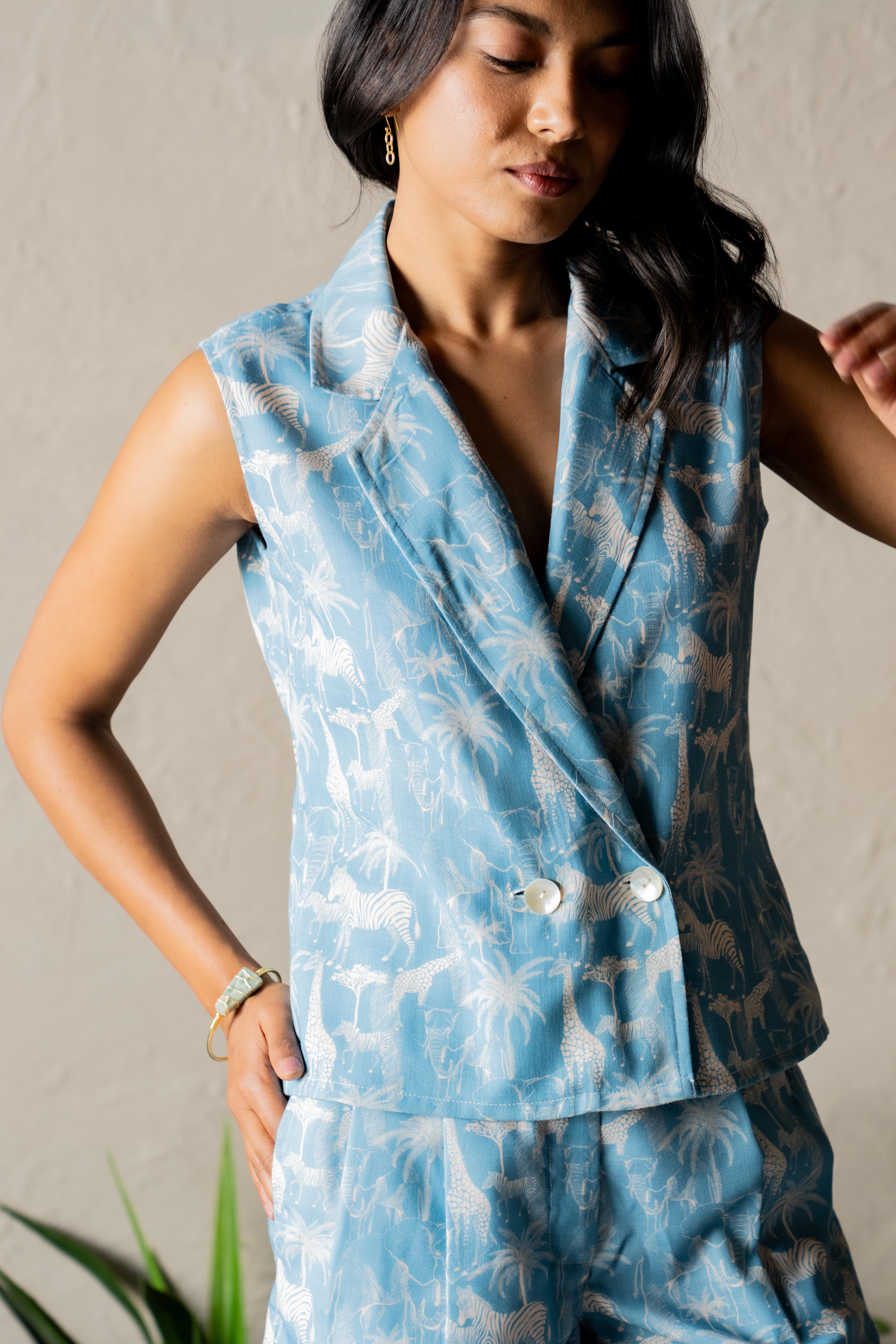 Elevate your wardrobe with the Kruger Top, a versatile piece in a serene light blue hue with a vibrant jungle print. This waistcoat-style sleeveless top features a double-buttoned front for a chic, tailored look. Structured with soft cotton lining, it offers a comfortable fit that's perfect for layering. Double it as an overlay jacket paired with a spaghetti top for endless styling possibilities.