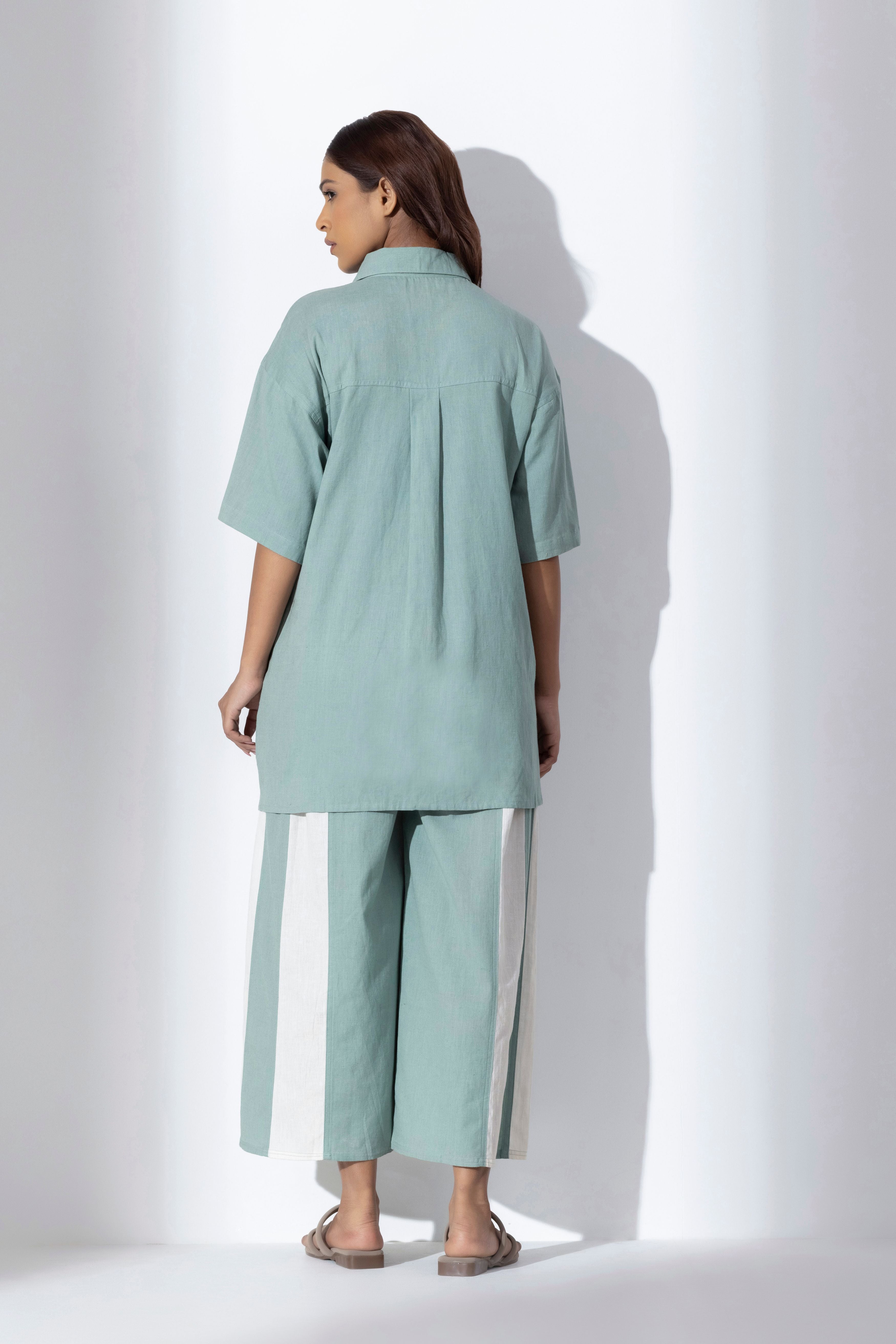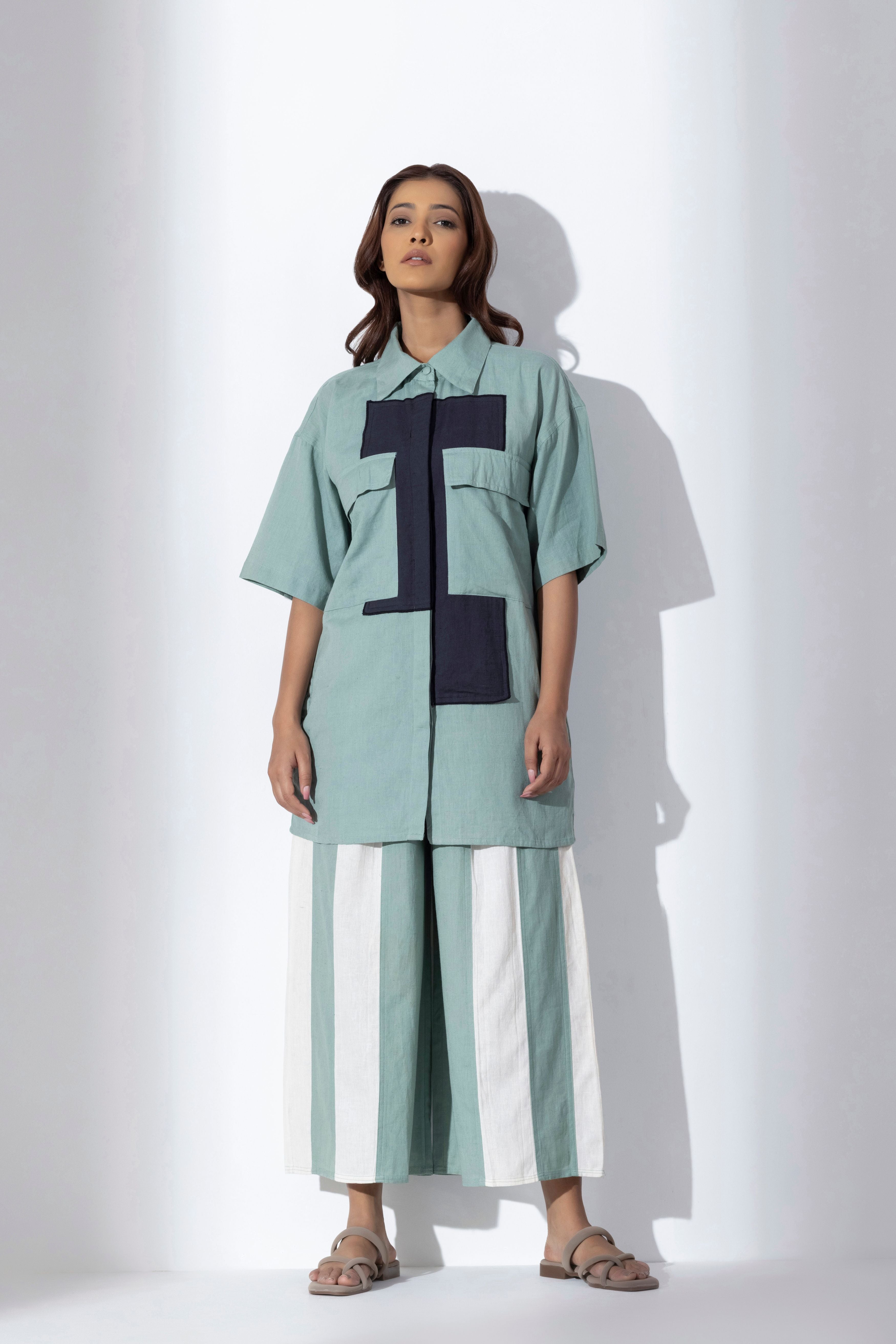 Kumo Shirt - intricately designed button down shirt in chambray cotton with front appliqu? panels and giant pockets detailing. This shirt can be coordinated with our Kumo high-waisted Pants. This shirt is comfort lifestyle inspired , perfect for all seasons. - Front concealed placket, side pockets, - Black appliqu? panelling  - Comfort oversized fit - Model is wearing size S - This is a textile fabric. The subtle imperfections in the weave, texture and colors are a natural outcome of handcrafted textiles and not a defect.