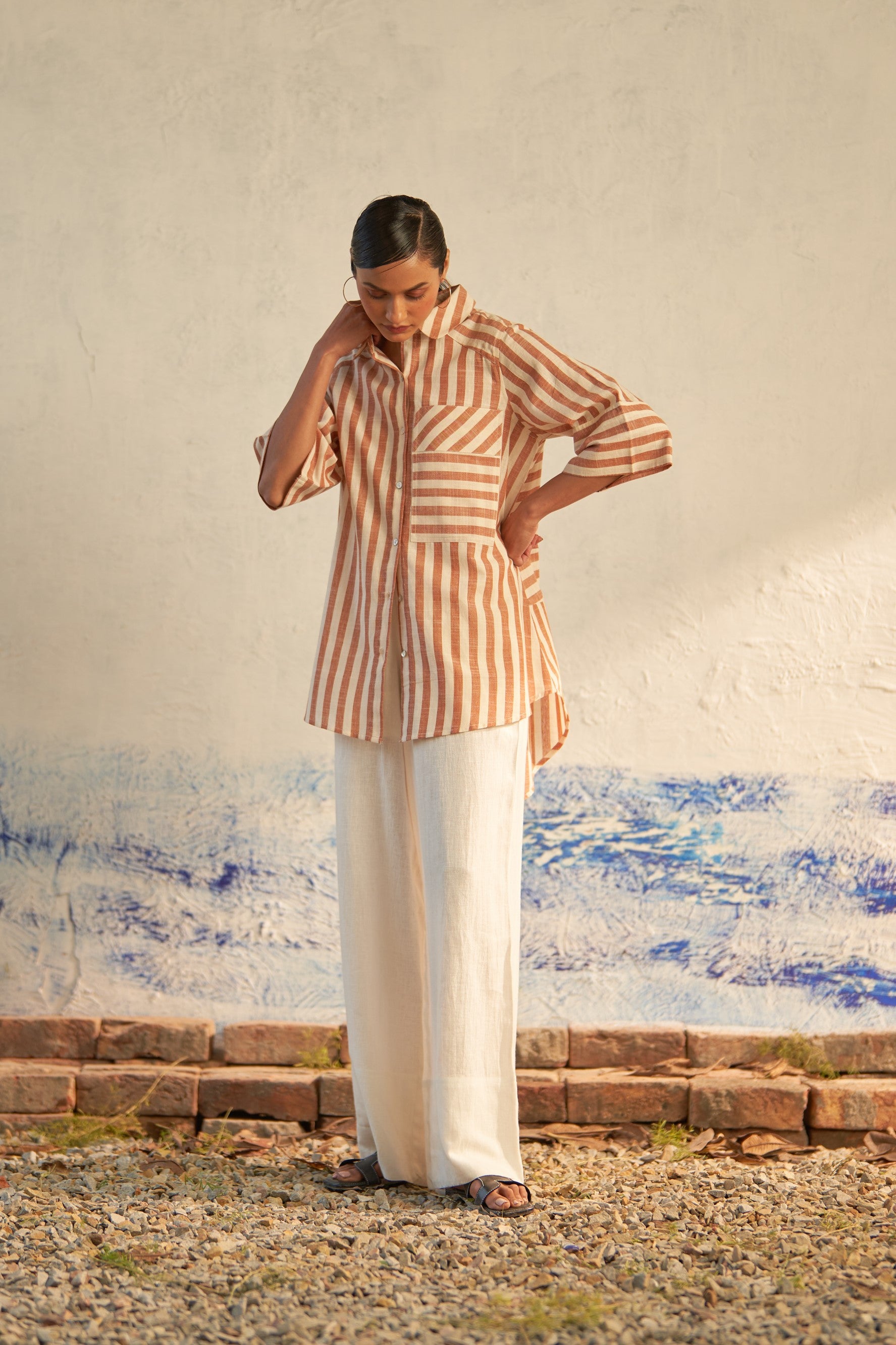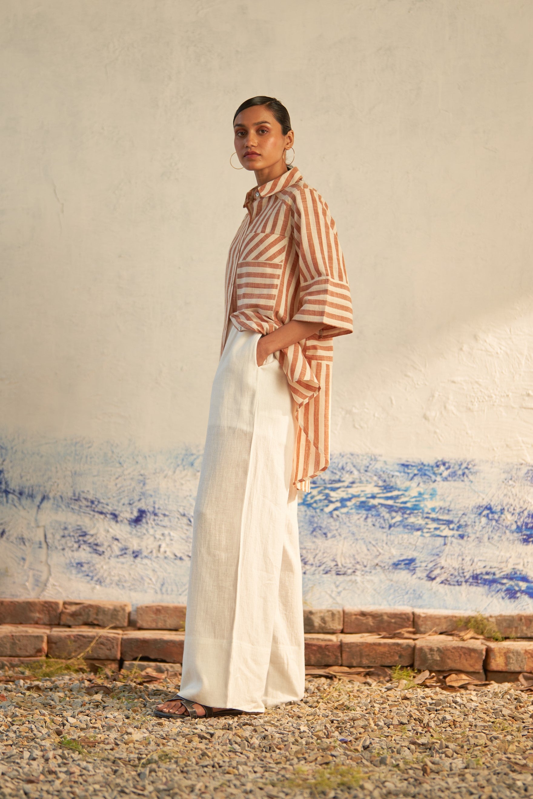 Elevate your style with our hi-lo striped shirt, featuring a patch pocket, curved hemline, and elegant shell buttons. Its dynamic silhouette pairs seamlessly with textured pants made from flex fabric. The timeless white pants boast wide, full-length legs with chic broad folds at the bottom for a contemporary look. Complete with an elasticated waistband for maximum comfort.