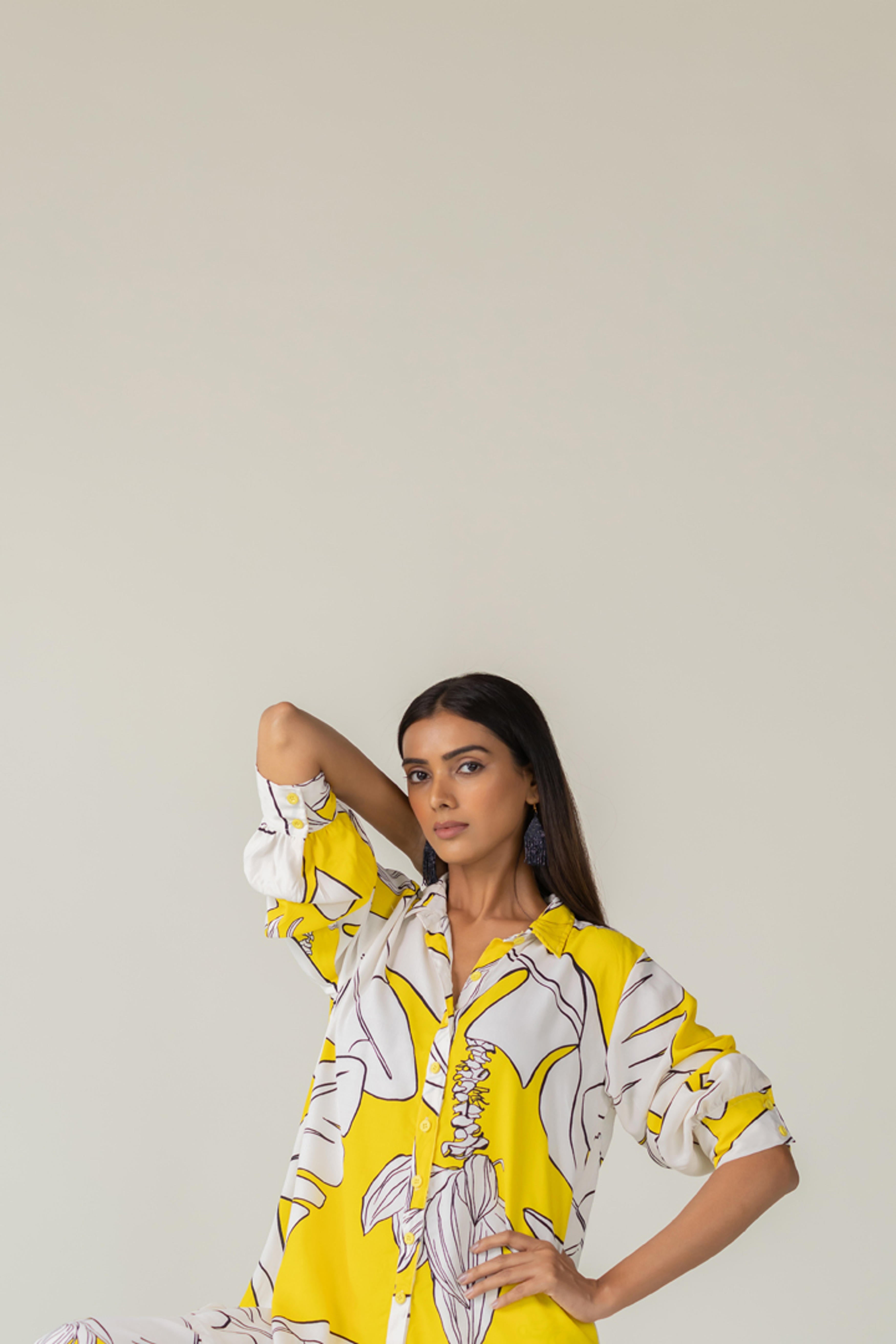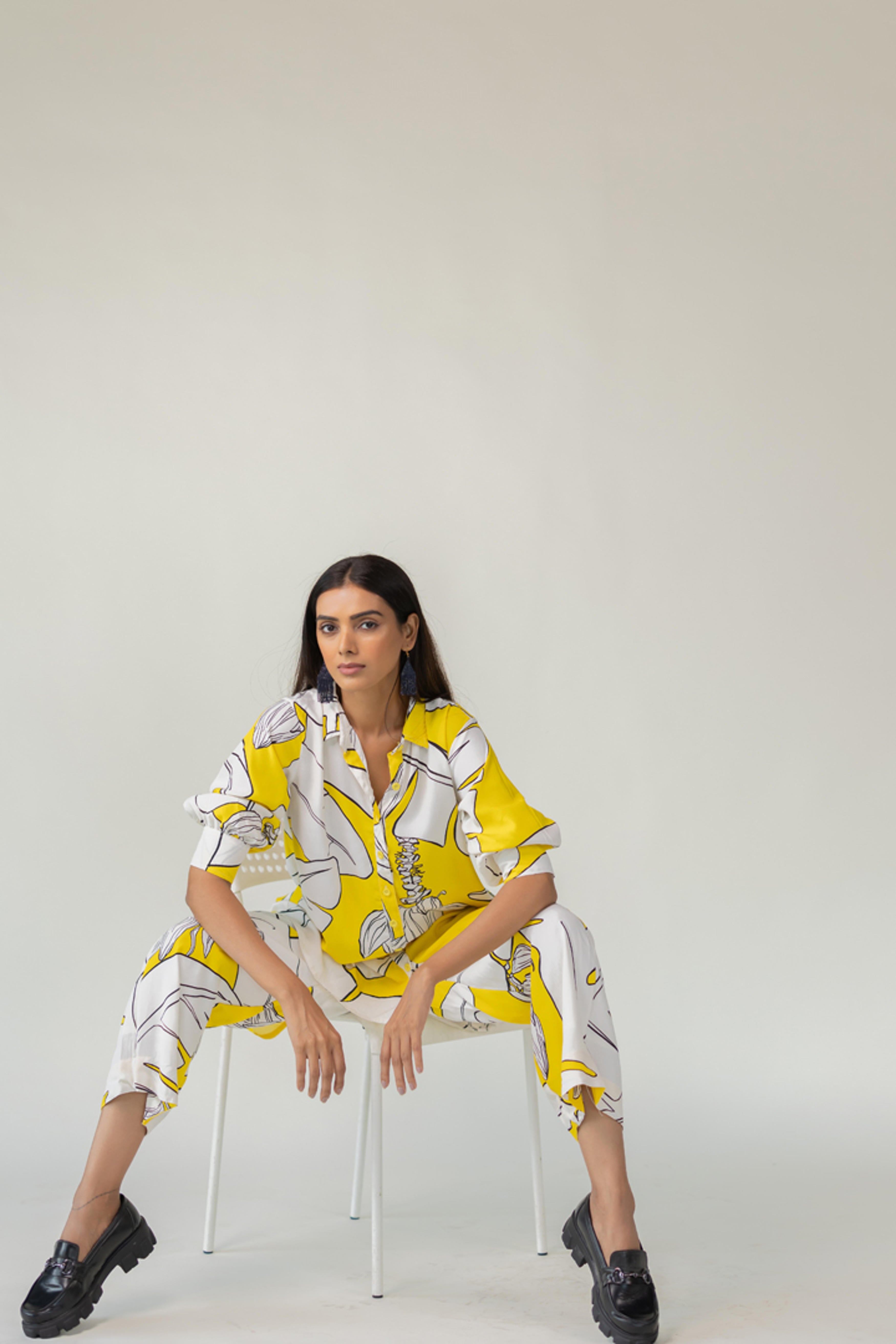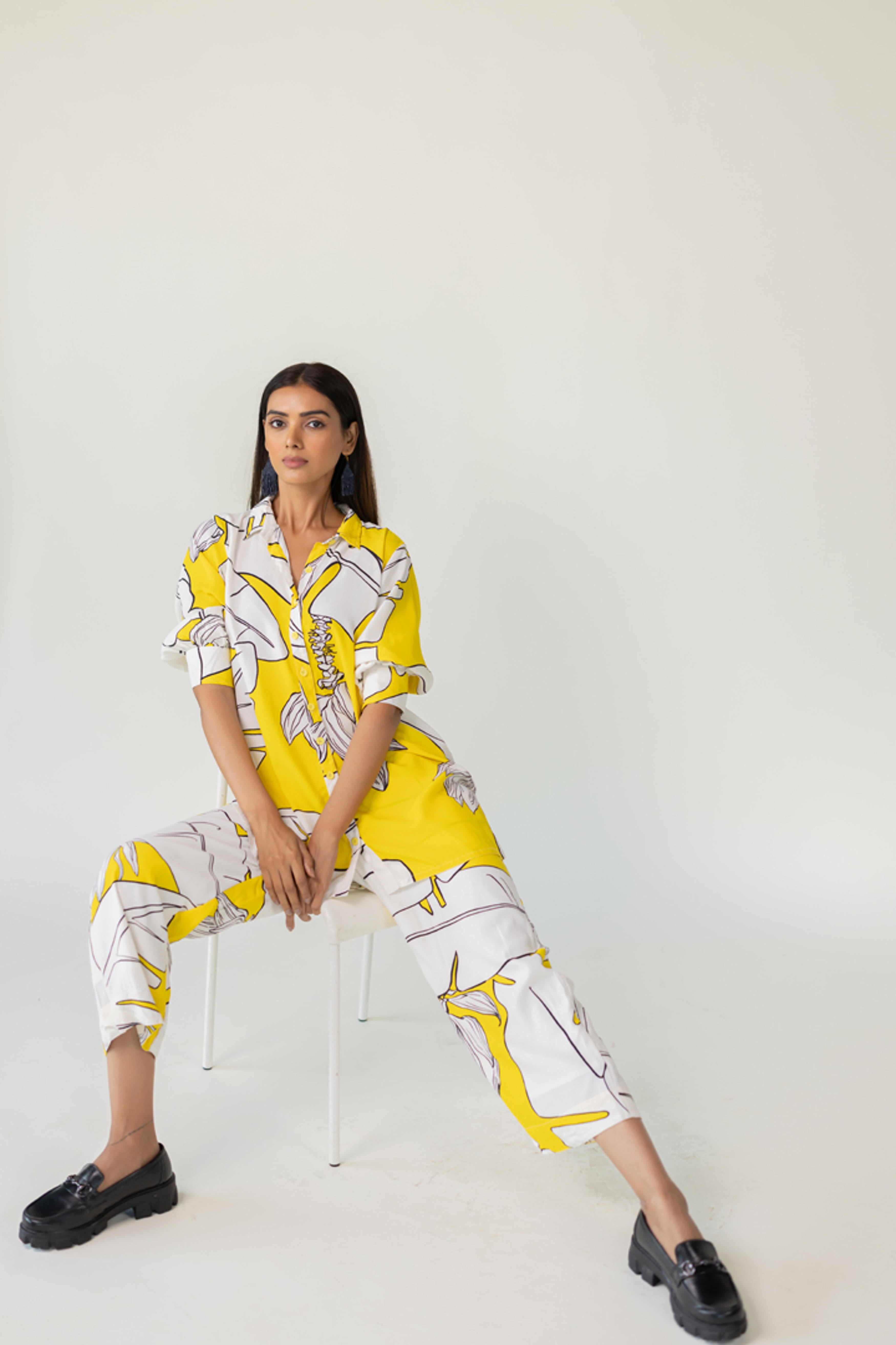 The Leafsong Co-Ord Set is a statement in bold ease and contemporary charm. Featuring a fluid shirt with a relaxed collar and 3 quarter -length sleeves paired with straight-leg trousers, this set is rendered in a vibrant lemon yellow and ivory floral sketch print. With its hand-drawn botanical motifs and button-down detailing, it seamlessly balances structure and playfulness ? ideal for resort days or stylish city strolls. Length - Tunic - Front - 30" Tunic - Back - 34" Pants length - 36"
