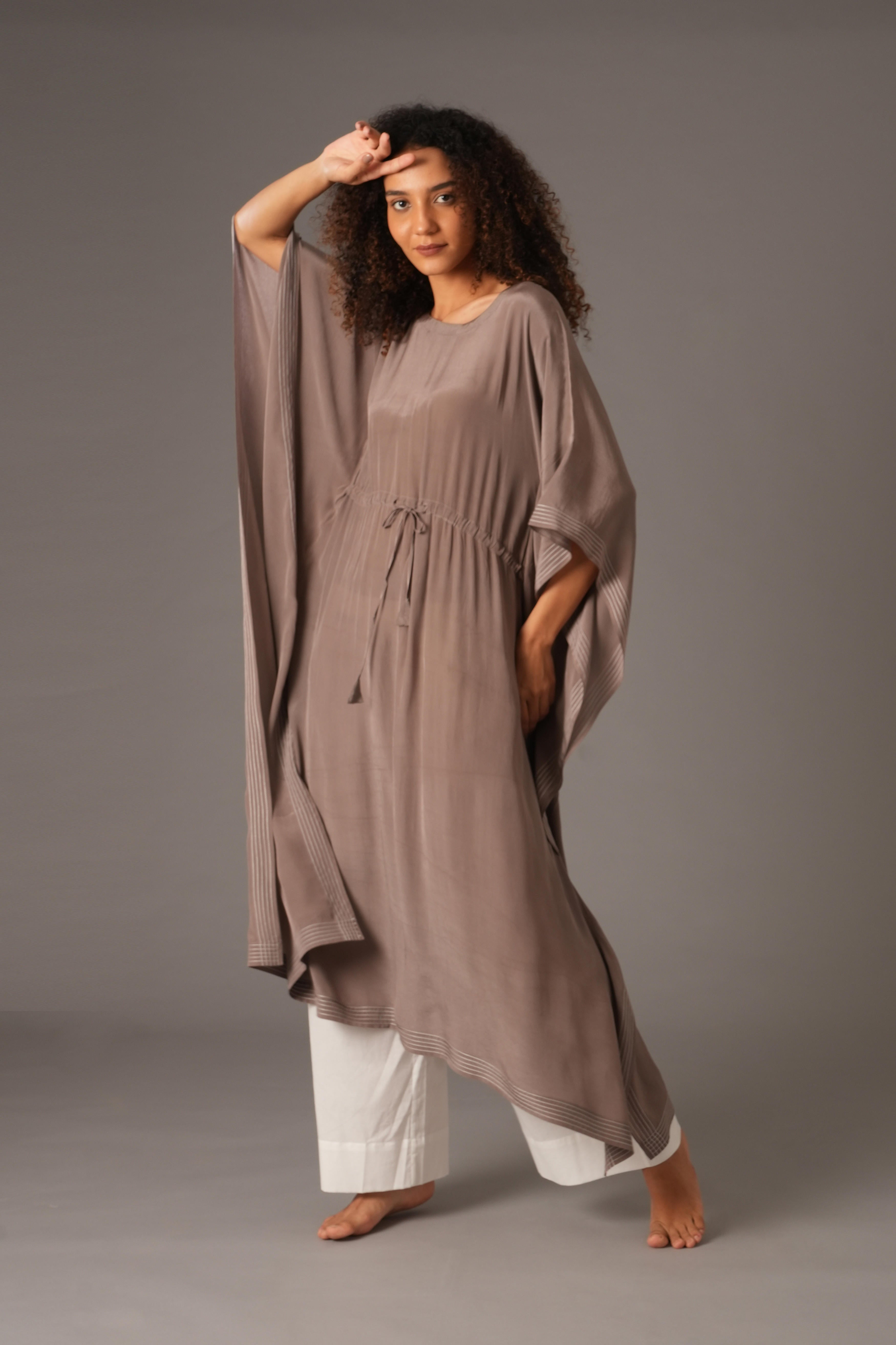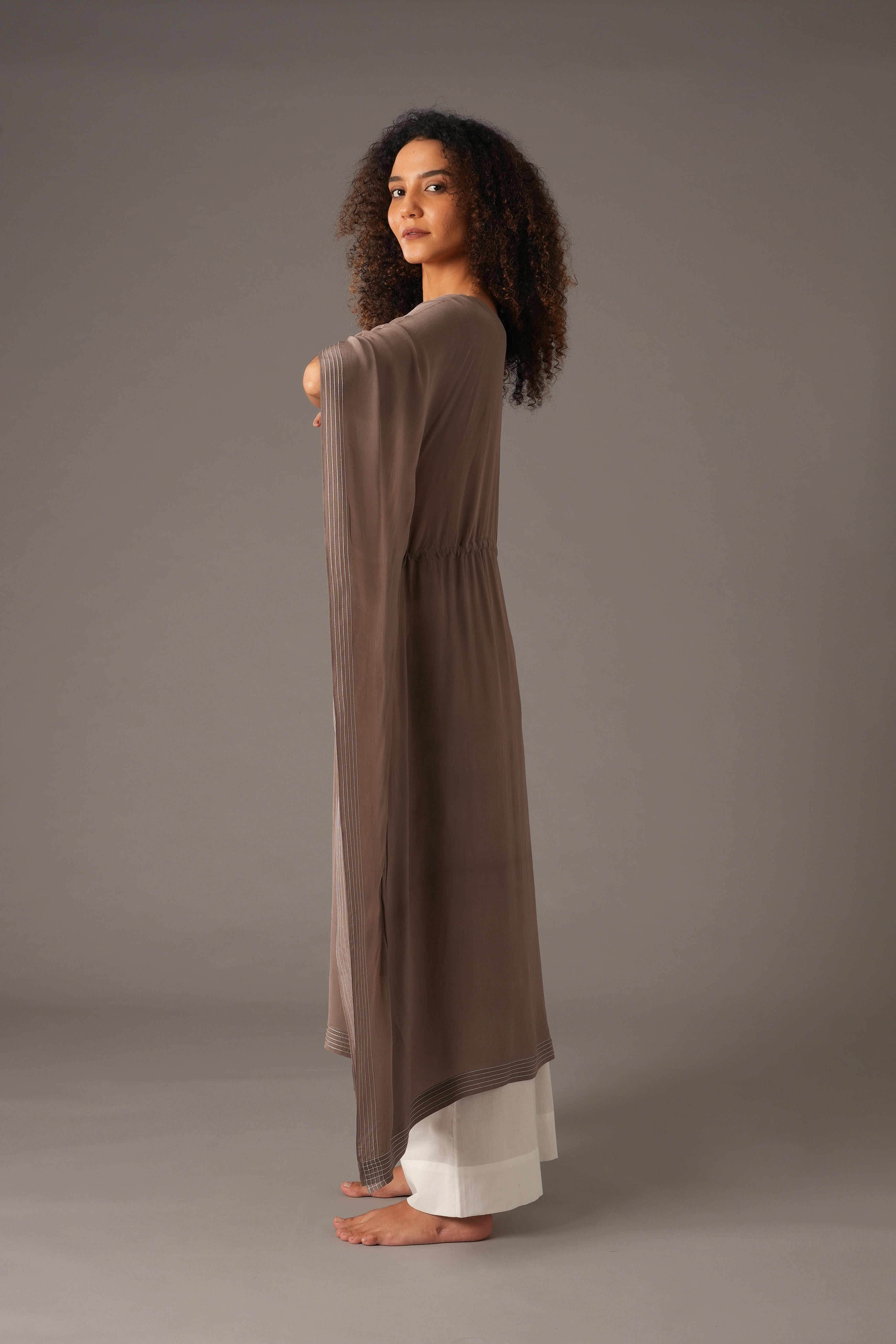 This luxurious Crepe Silk & Mul set in a rich taupe shade includes a beautifully flowing Kaftan, pants, and Scarf. The full-length Kaftan offers a relaxed and free fit, designed to provide comfort and effortless elegance. The round neck and loose design of the Kaftan make it a versatile and stylish piece for any occasion. The accompanying Scarf, with a length of 82 inches and width of 25 inches, adds a touch of sophistication to the set. Our model, standing at 5'8", is wearing a size S.
