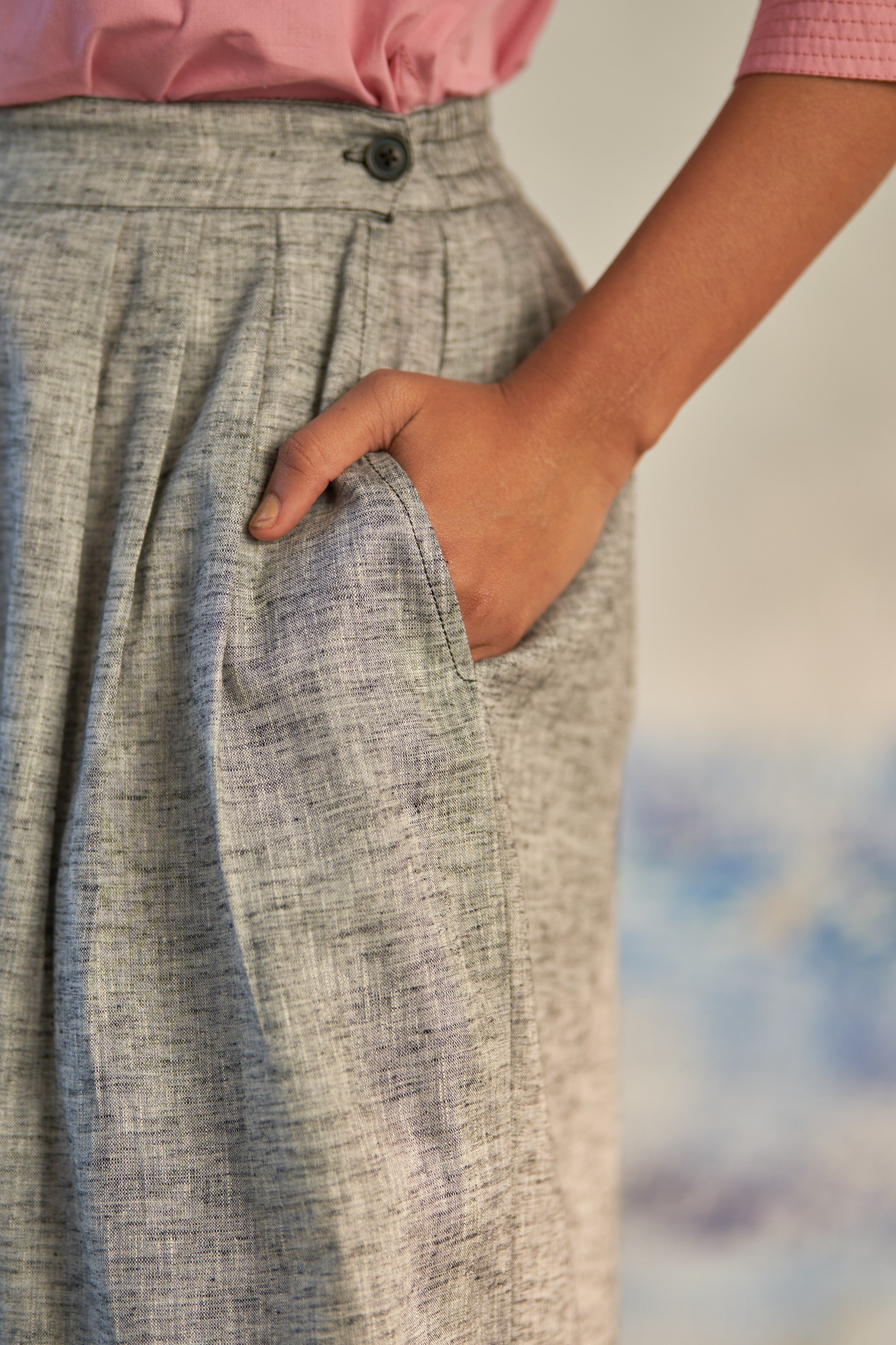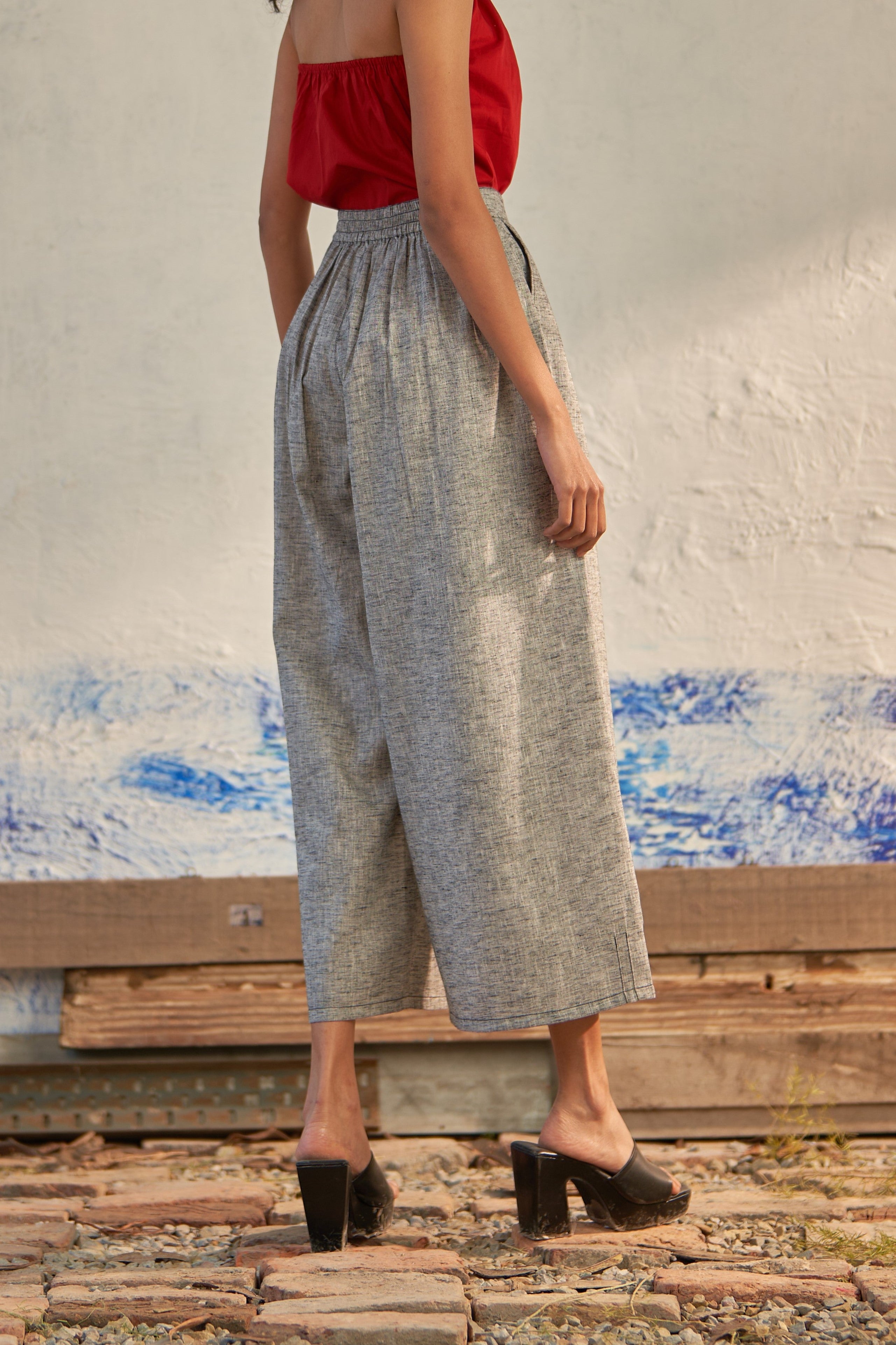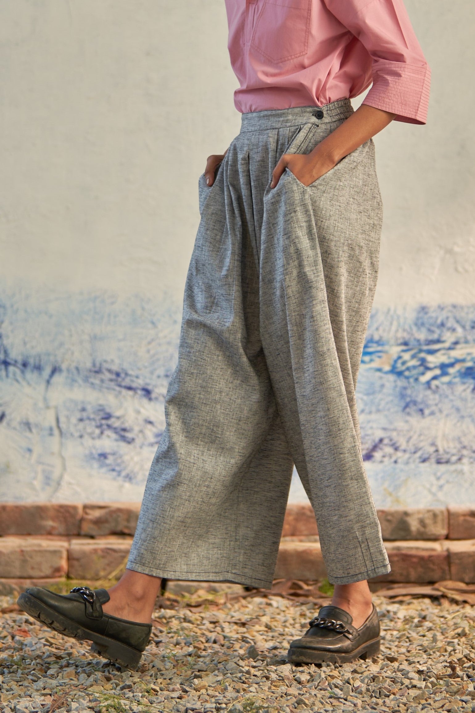 Discover comfort and style with our Elasticated Box Pleat Pant, expertly crafted from textured cotton. These pants offer a seamless fusion of fashion and ease, perfect for any occasion. The half elasticated waist with a button ensures a personalized fit, while the sophisticated inverted box pleat detailing adds a touch of refinement to your look. Versatile and chic, these pants redefine effortless elegance and elevate your wardrobe to new heights.