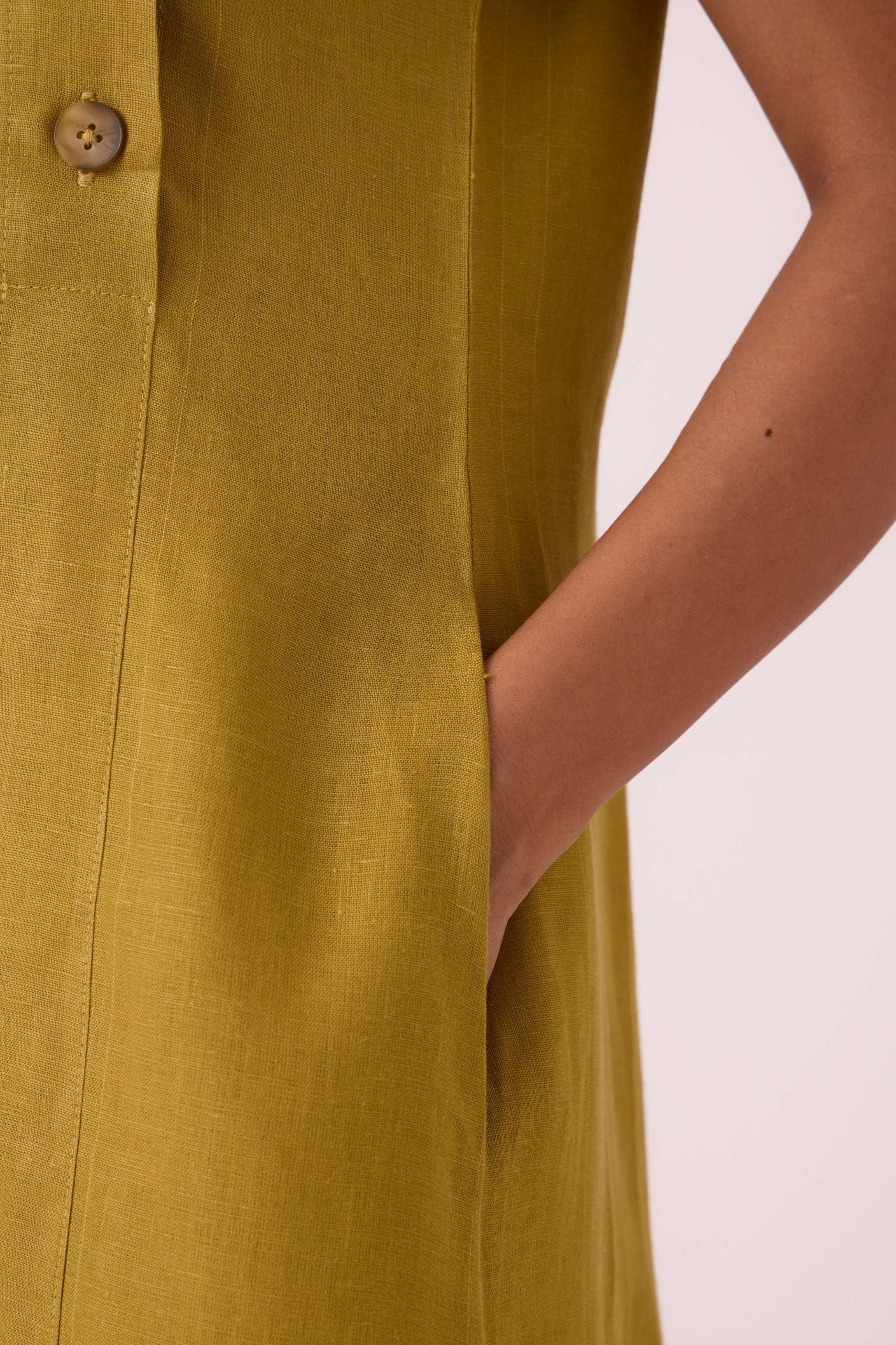 This *regular-fit dress* features a *drop-shoulder* design and a stylish *round neck*. It includes practical *in-seam pockets* and an *off-center button-down placket*. A slit is incorporated for *ease of movement*. The model, Chhavi, is 5'6" and is wearing a size XS.
