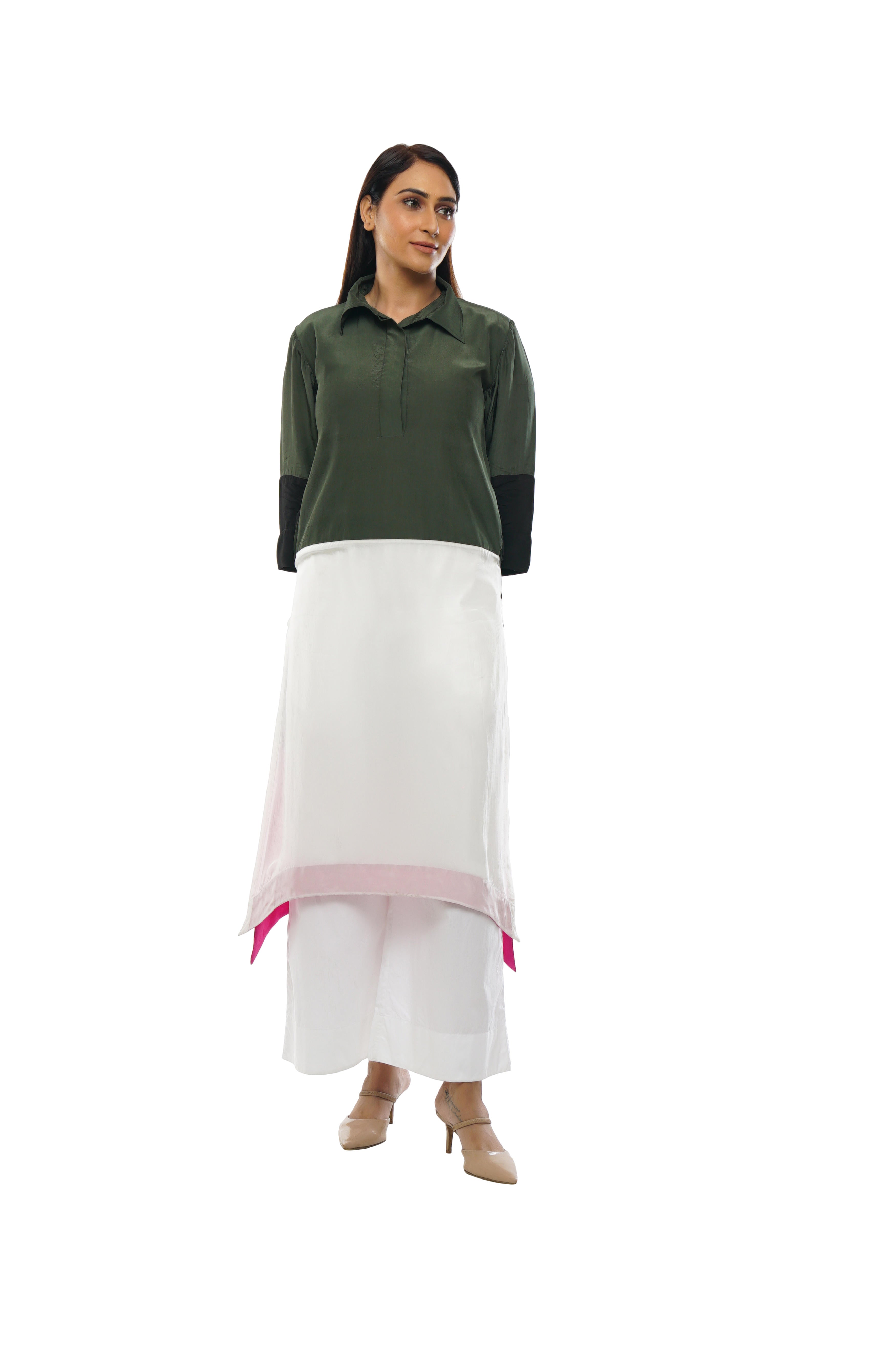 Step into sophistication with this forest green collar long shirt 2 pc fusion set. Featuring a striking half green, half black sleeve design and a stylish tie-up detail, this outfit is where elegance meets edgy. Crafted from luxurious Crepe Silk for the shirt and Poplin cotton for the pants, it offers a perfect balance of comfort and style. Our model, standing 5'7", is wearing size S.