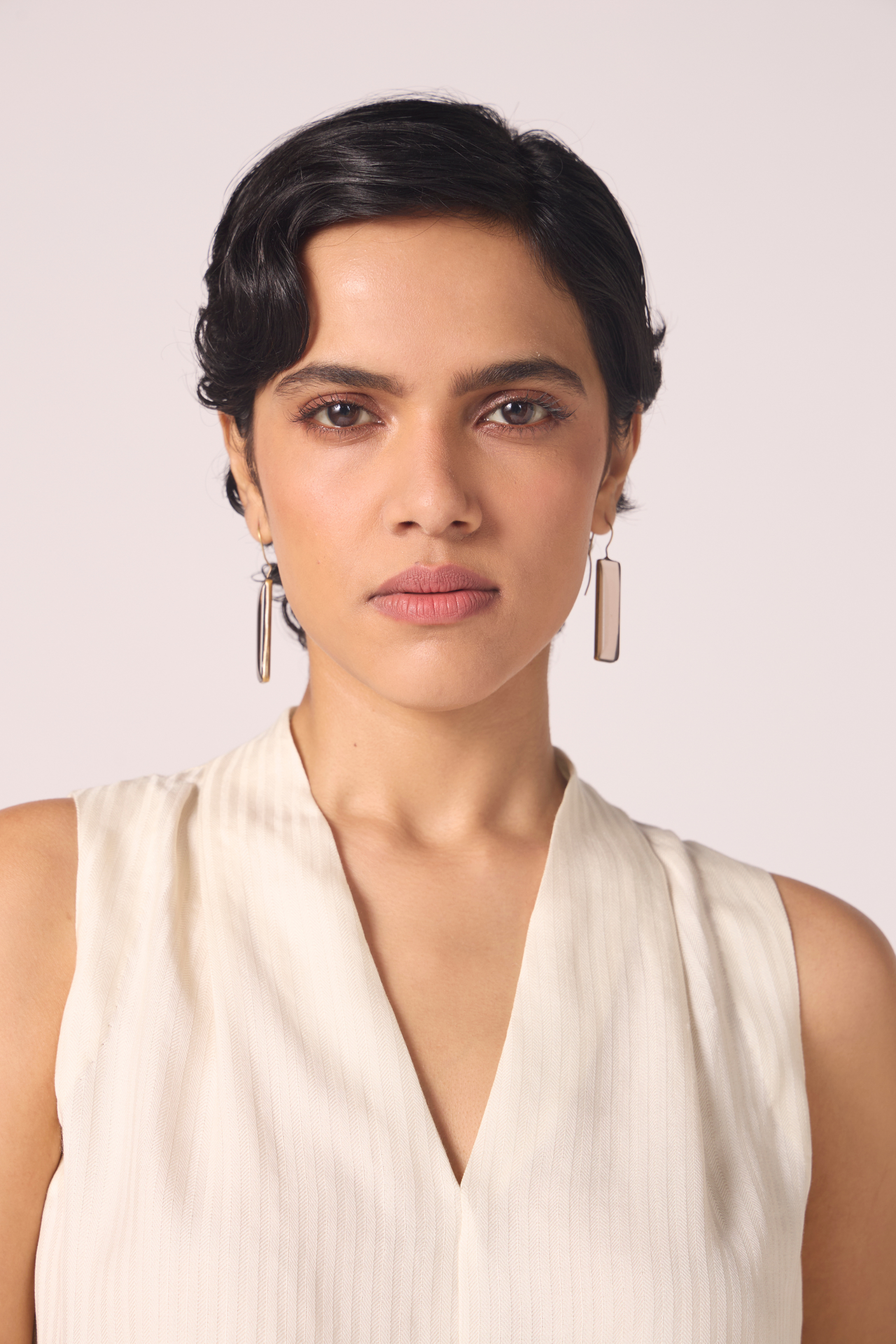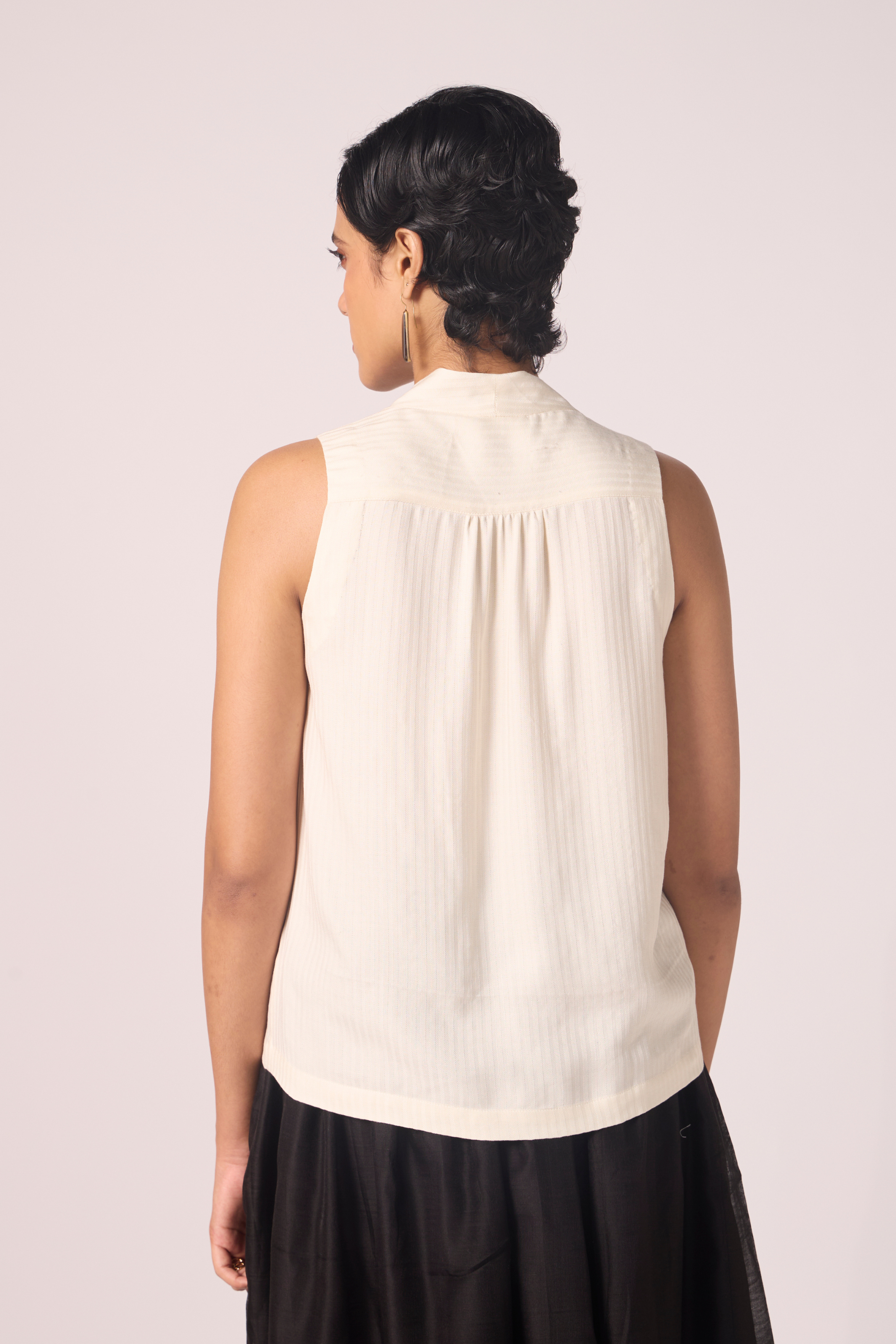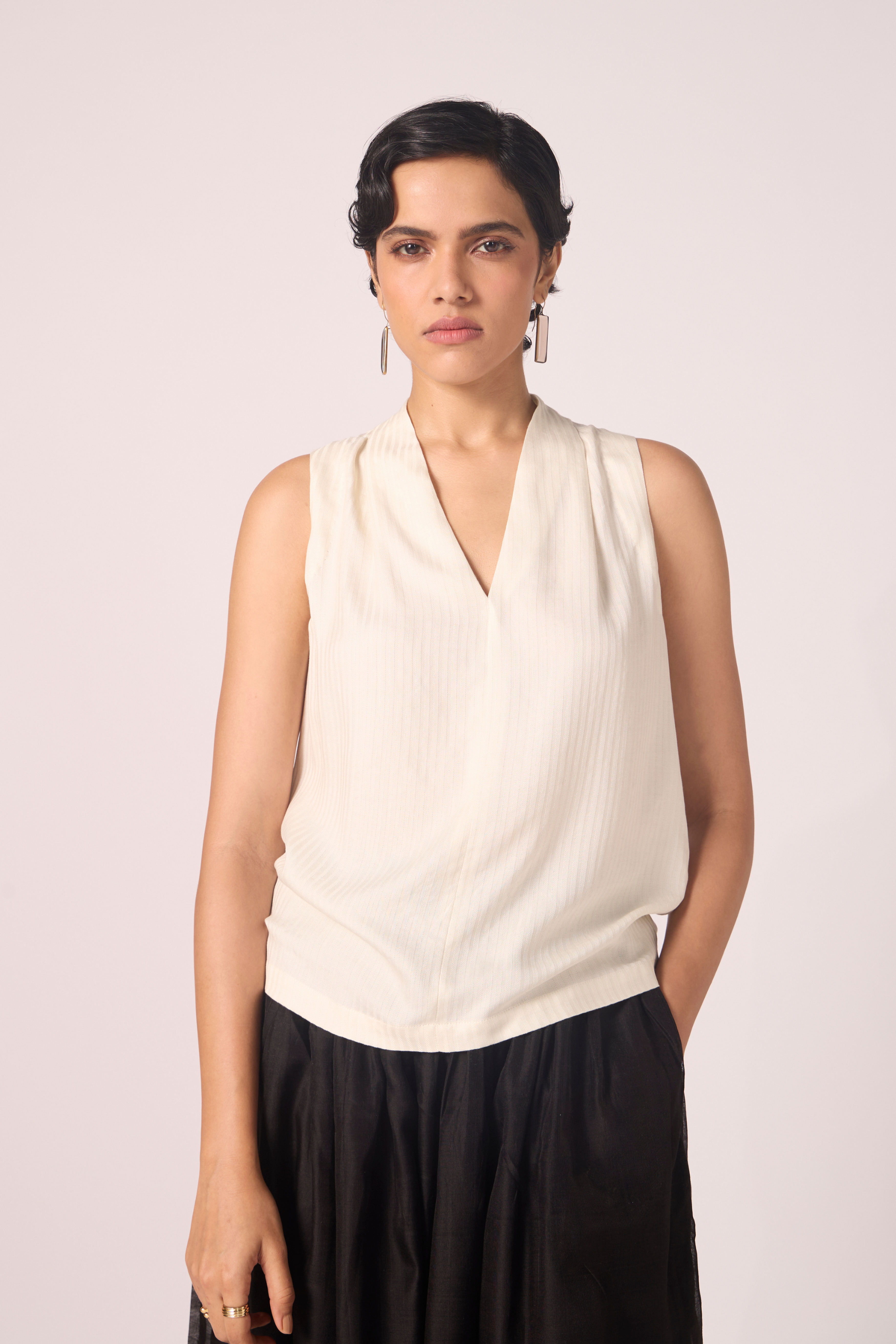 Quiet architecture at the neckline; softness through the back. A sleeveless essential with presence. -Regular Fit - Anushka is 5'8 and wearing S . Her body measurements are Bust: 32", Waist: 29", Hips: 36" - Spun silk twill stripe - V-neck with refined pleated collar - Gentle gathers at back yoke for comfort, regular fit