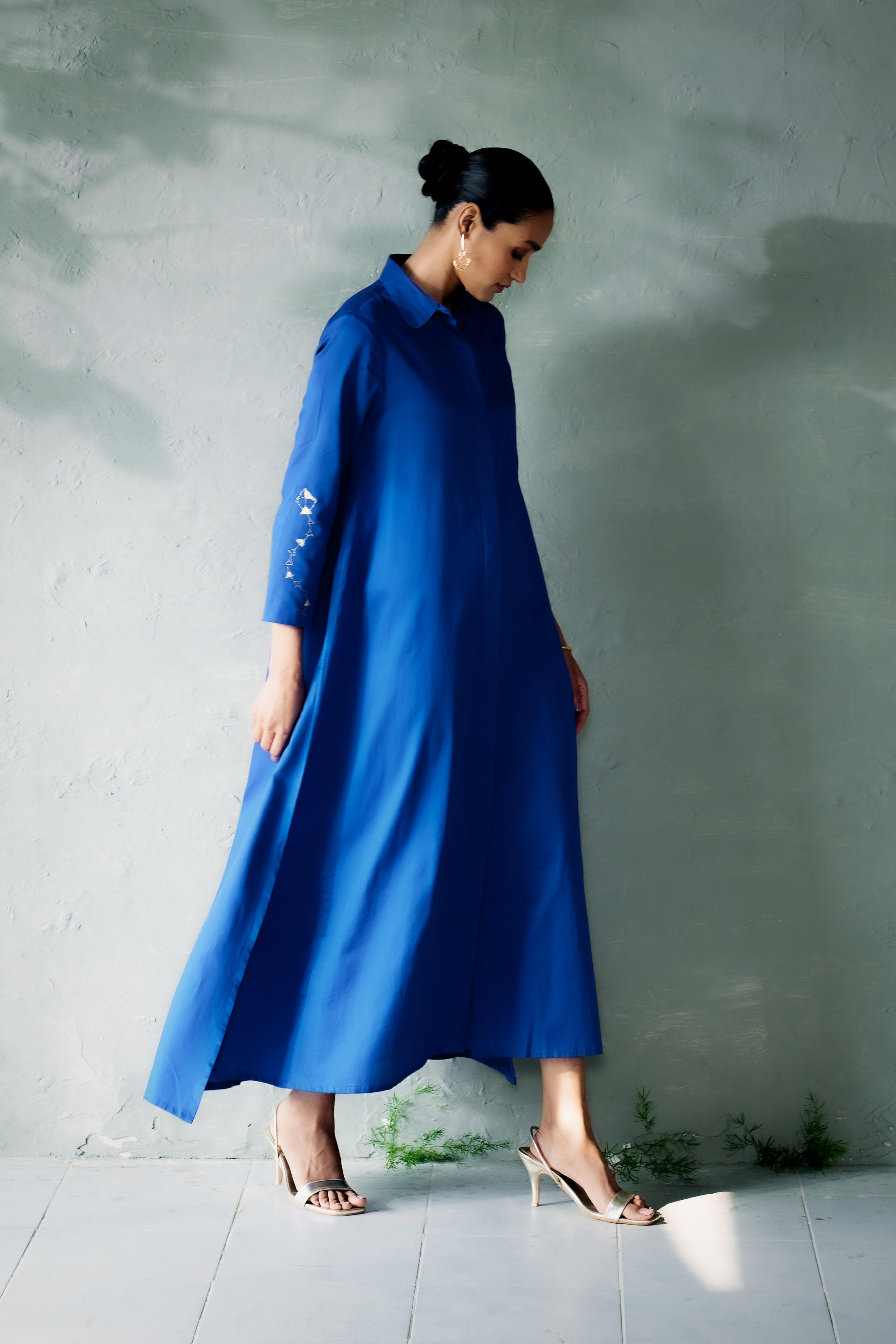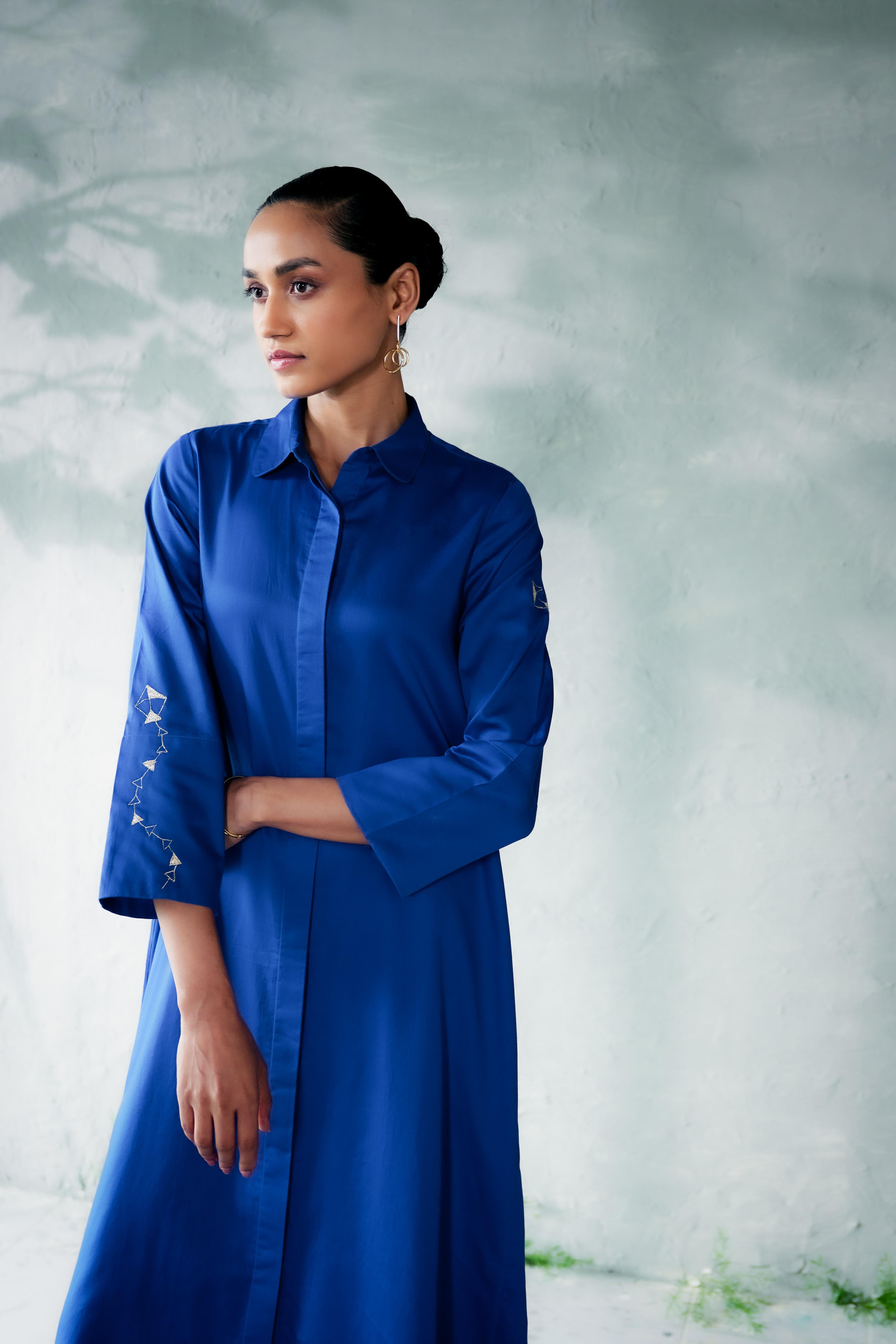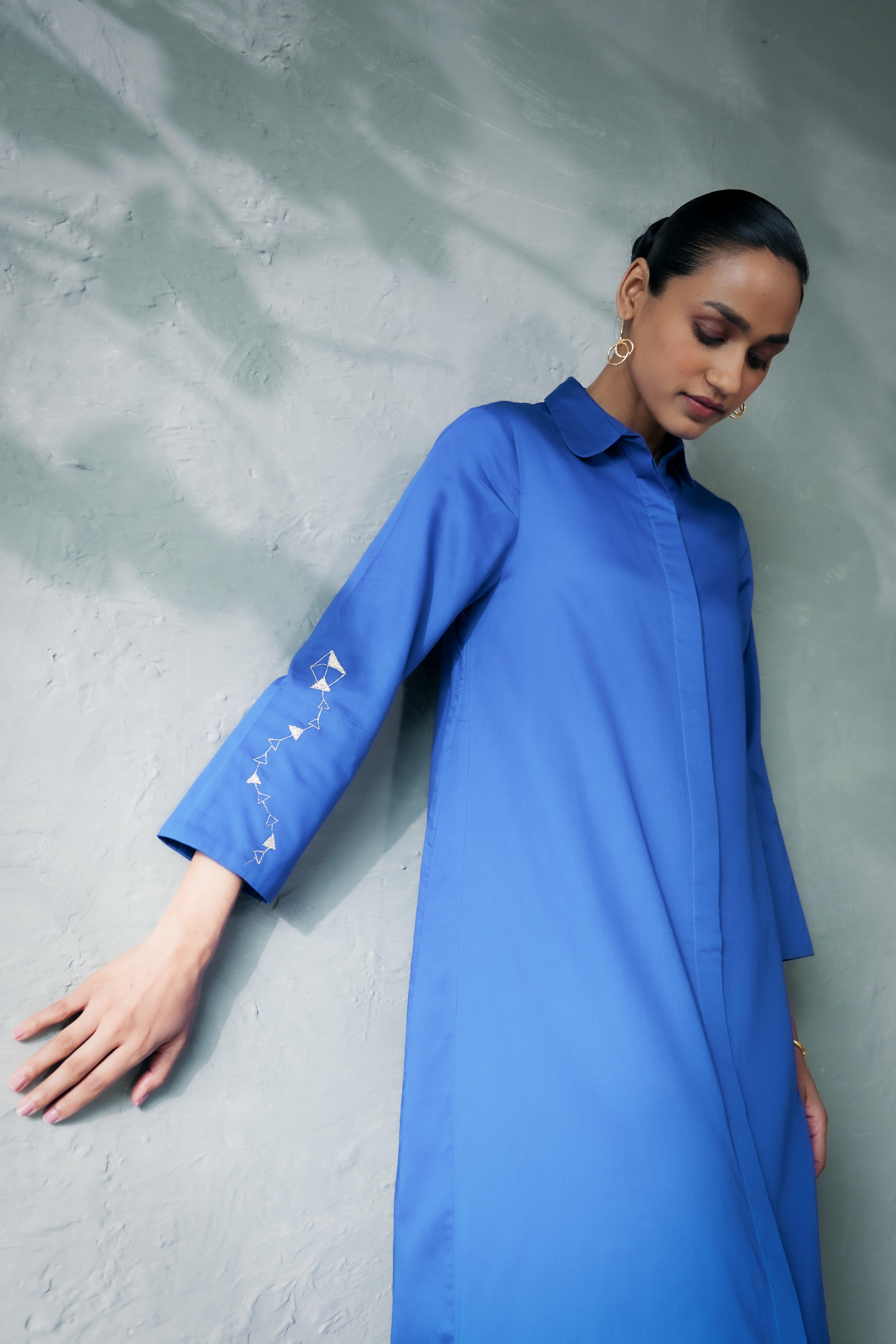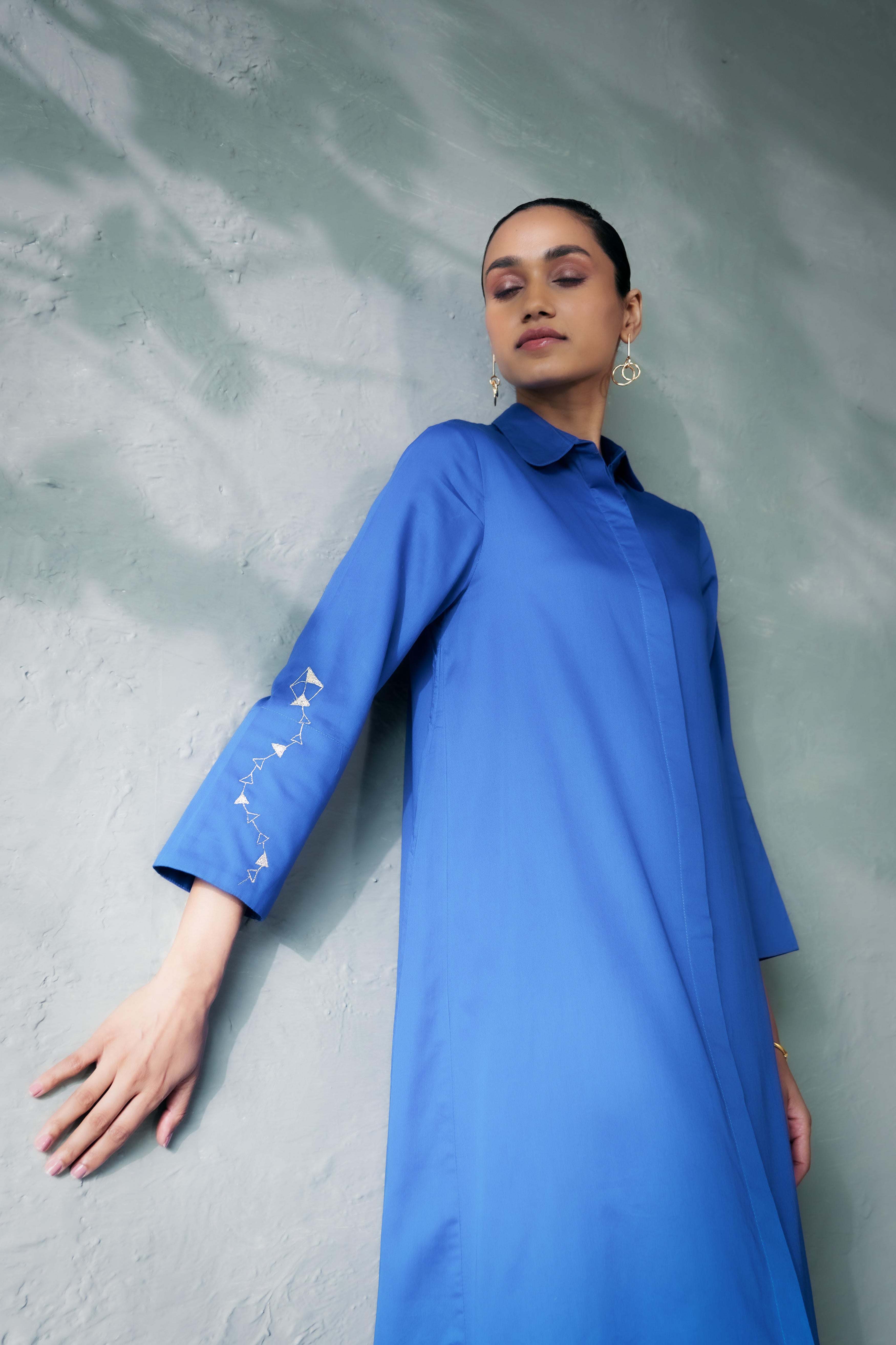 The Lumisky Dress in electric blue is a fluid blend of poise and play. Crafted in soft modal satin, it features a collared neckline and front placket for tailored ease. The graceful silhouette is elevated by a 3/4th sleeve, with a delicate gold kite-and-string motif embroidered on the right sleeve — a quiet nod to festivity. Model is 5'9" & wearing Size 'S' Its drape and subtle sheen make it perfect for intimate gatherings or a special day out, carrying an effortless sense of celebration.