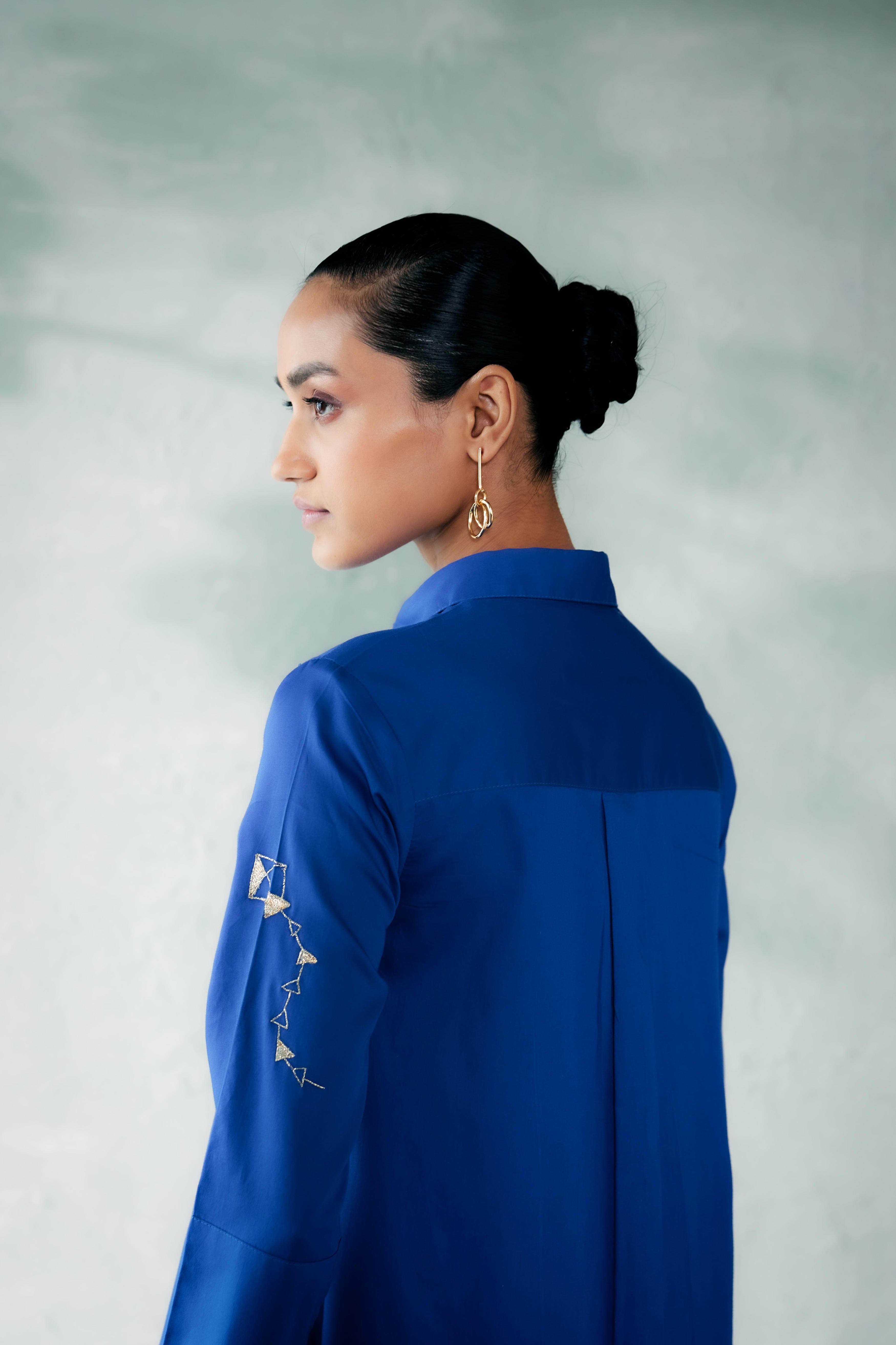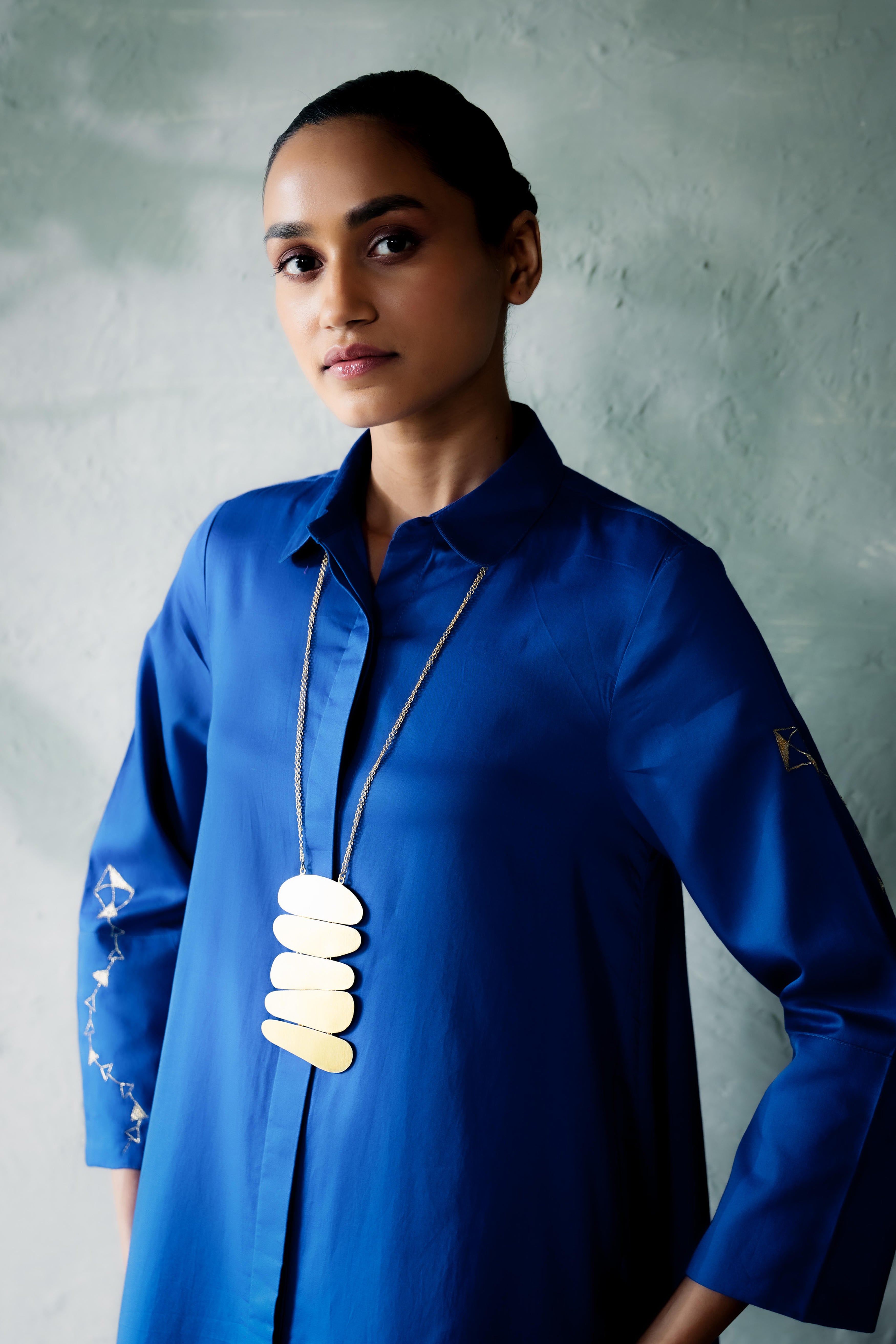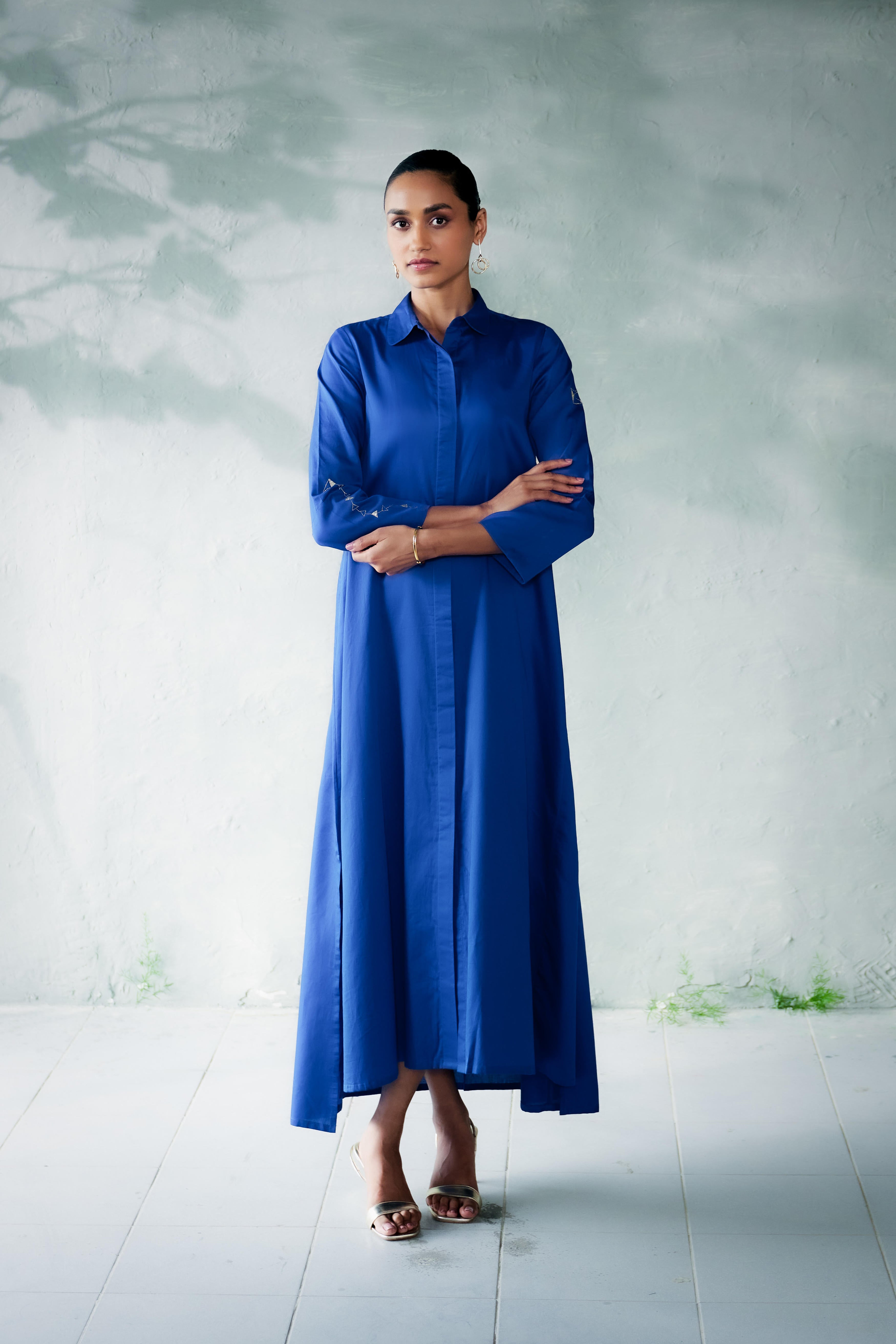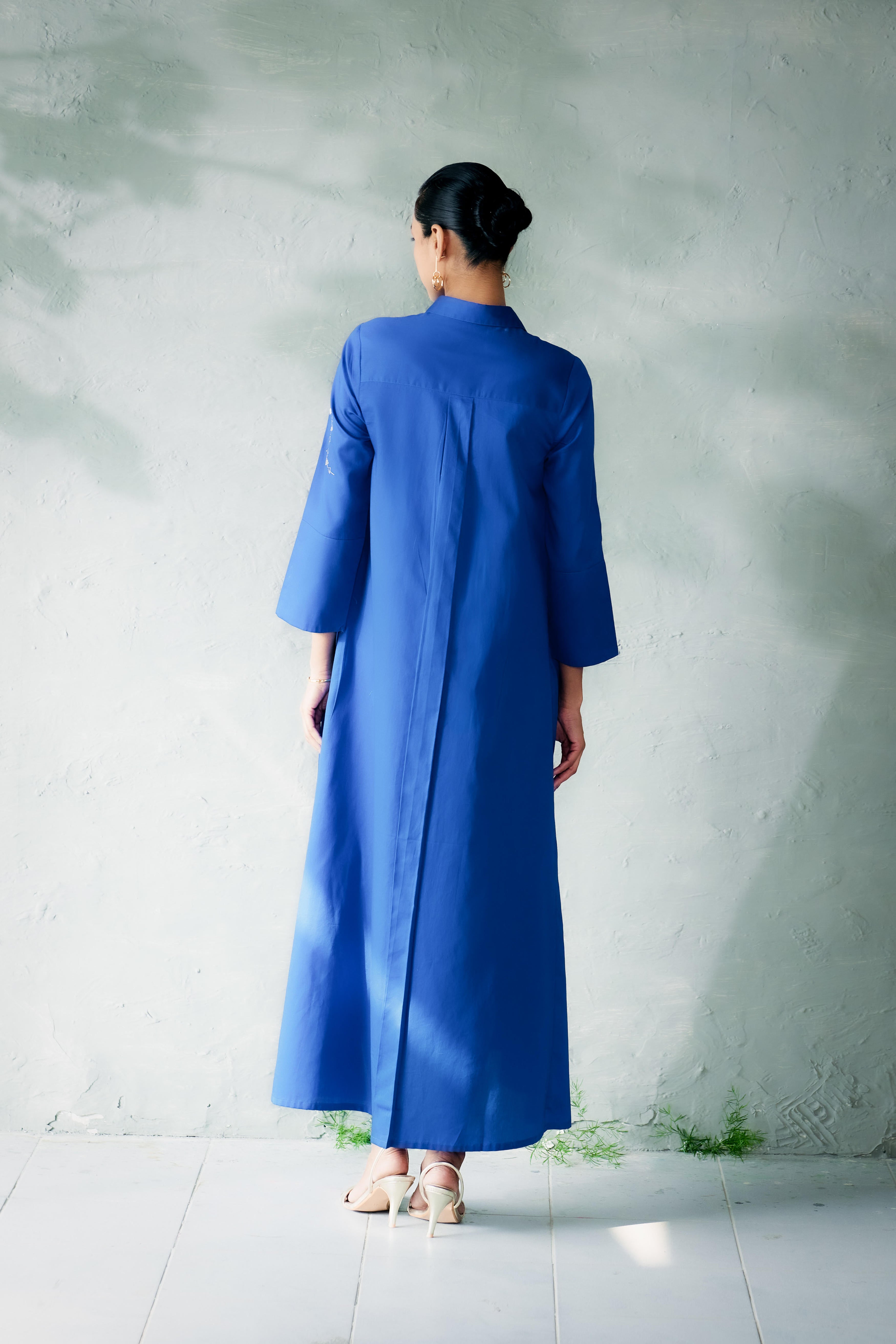 The Lumisky Dress in electric blue is a fluid blend of poise and play. Crafted in soft modal satin, it features a collared neckline and front placket for tailored ease. The graceful silhouette is elevated by a 3/4th sleeve, with a delicate gold kite-and-string motif embroidered on the right sleeve — a quiet nod to festivity. Model is 5'9" & wearing Size 'S' Its drape and subtle sheen make it perfect for intimate gatherings or a special day out, carrying an effortless sense of celebration.
