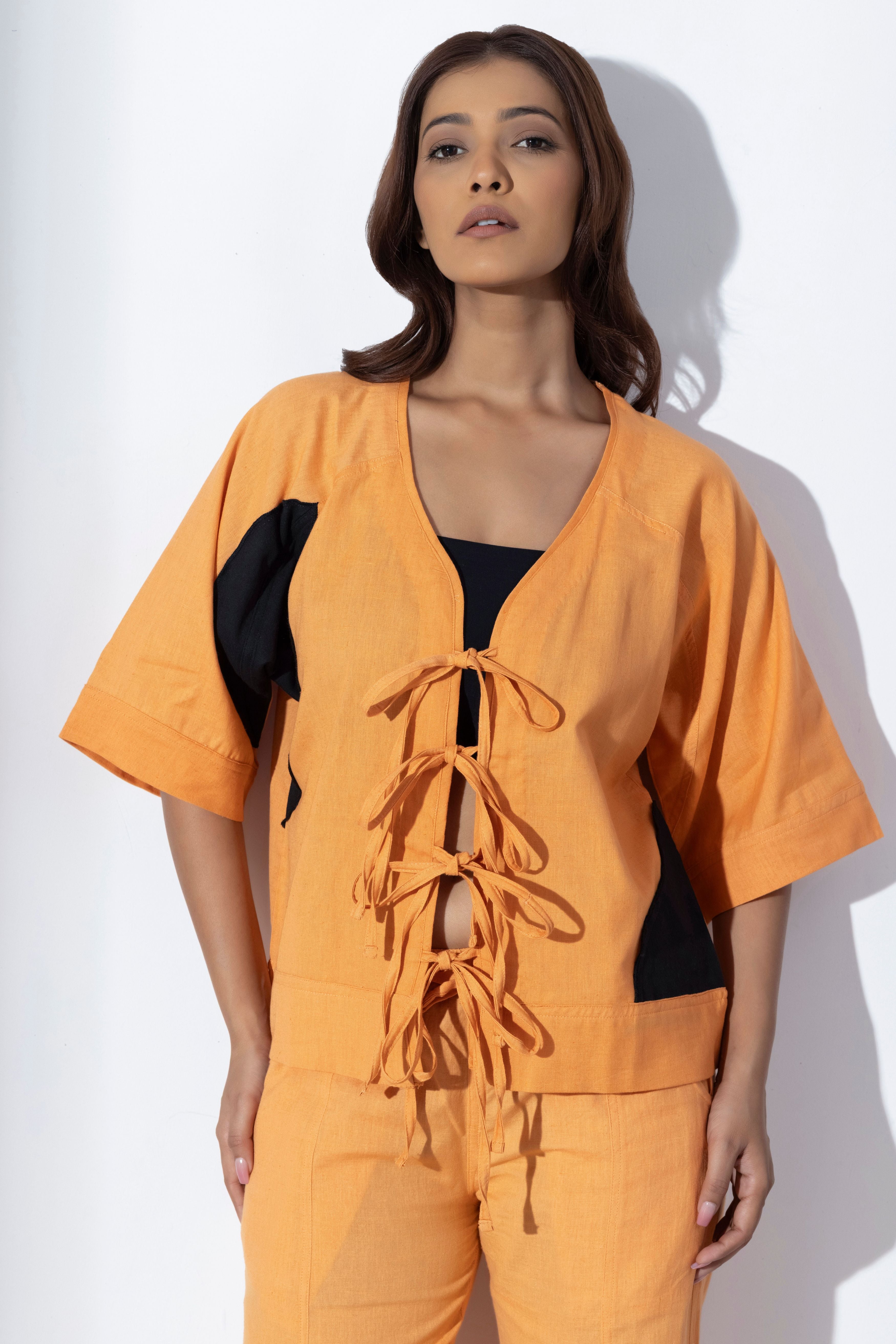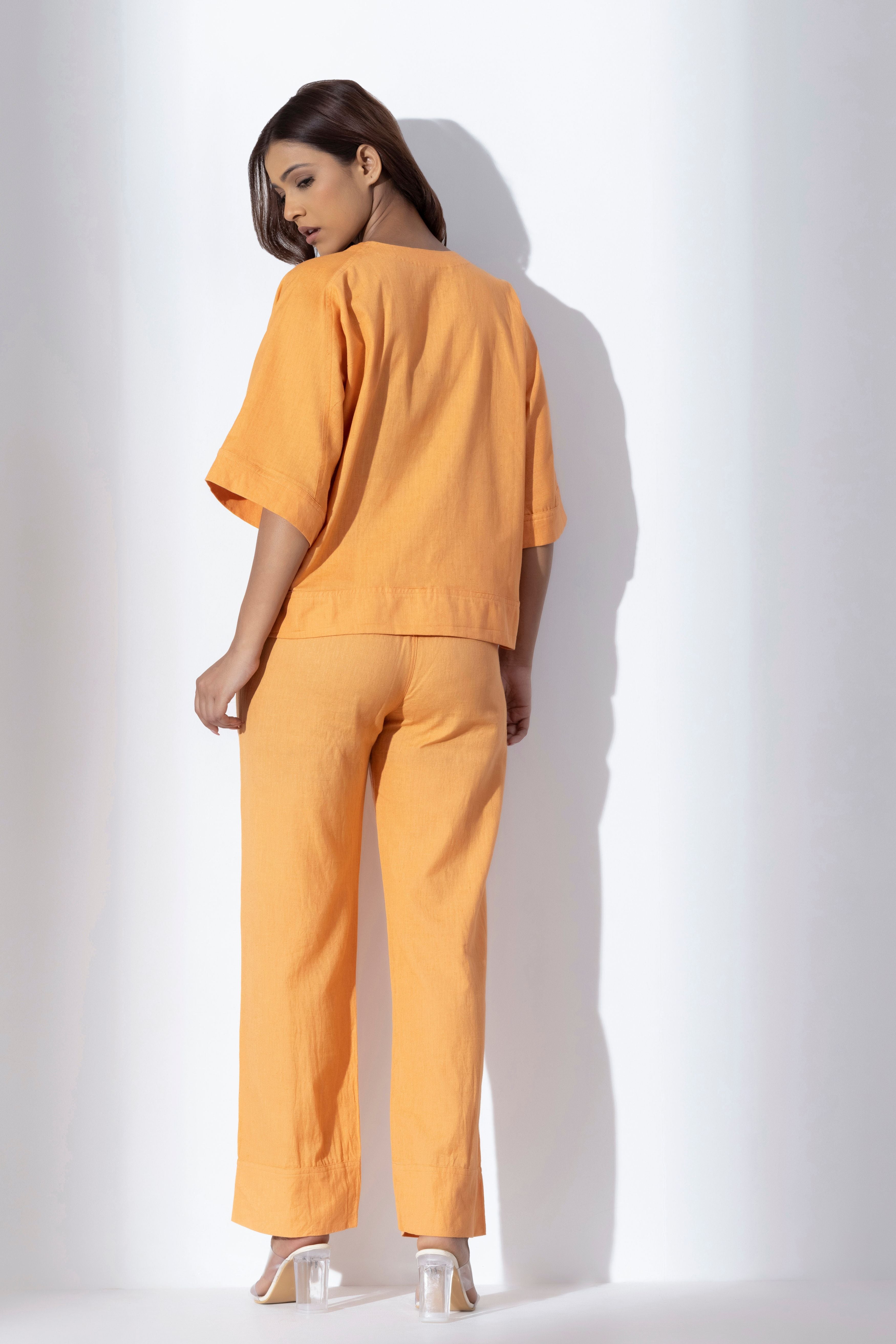 Luna Pant crafted in 100% organic chambray cotton in warm orange tone features a straight leg mid-rise pant with elasticated waist band and drawstring. All the seams have double stitch detailings to elevate the pant and make the finishings look more premium and luxe. Perfect for daytime elegance or casual evenings out - a true wardrobe essential for modern minimalist.  Elastic waistband with drawstring Mid-rise straight-leg pant with side pockets Model is wearing a size S This is textile fabric, subtle imperfections in the weave, texture and colours are natural outcome of handcrafted textiles and not a defect.