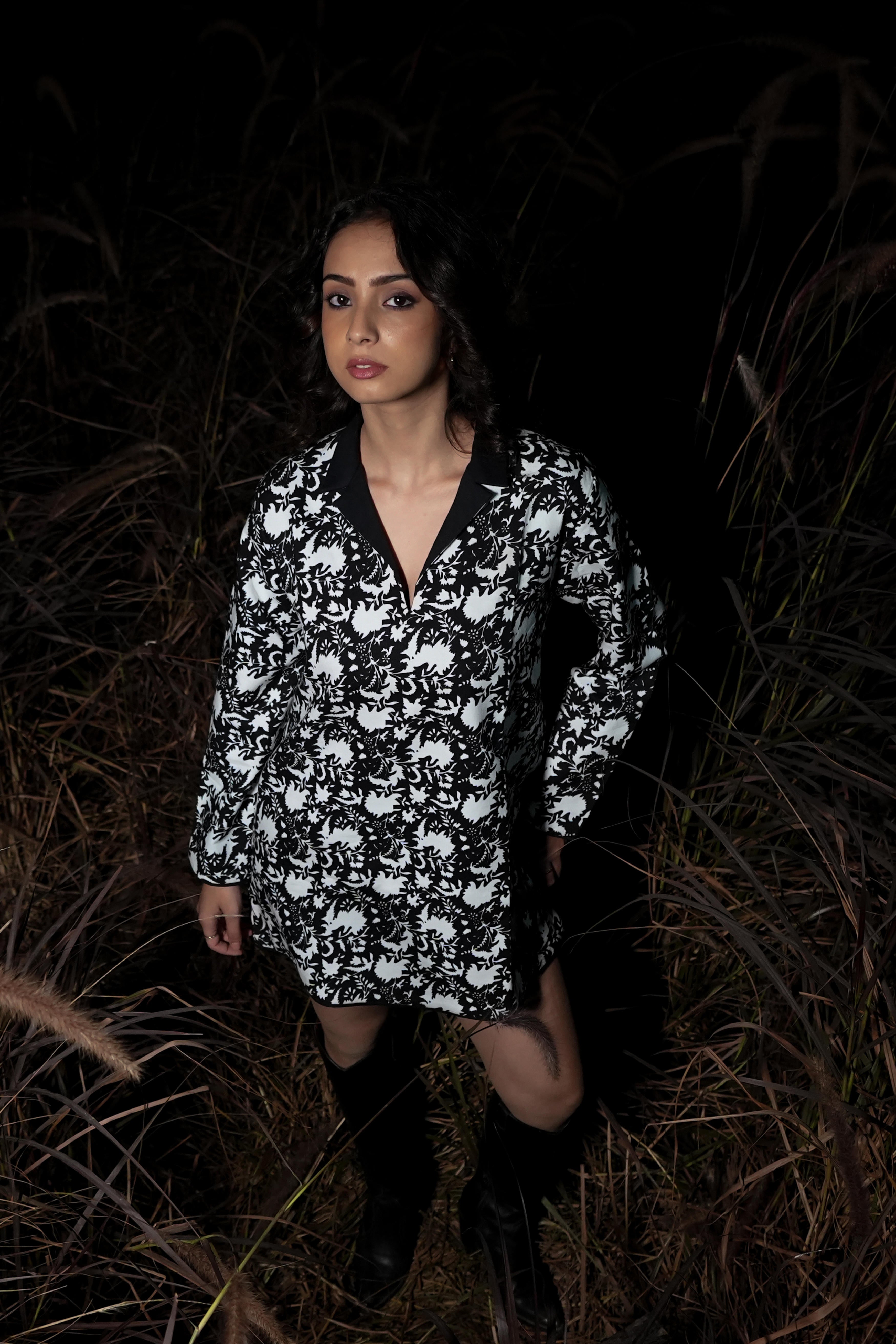The Lune Dress is a blazer-fit mini with a sharp notch collar and a clean V opening through the front. The shoulders are lightly structured, and the body falls straight to an above-the-knee hem, giving it a precise, jacket-like line in a single piece.