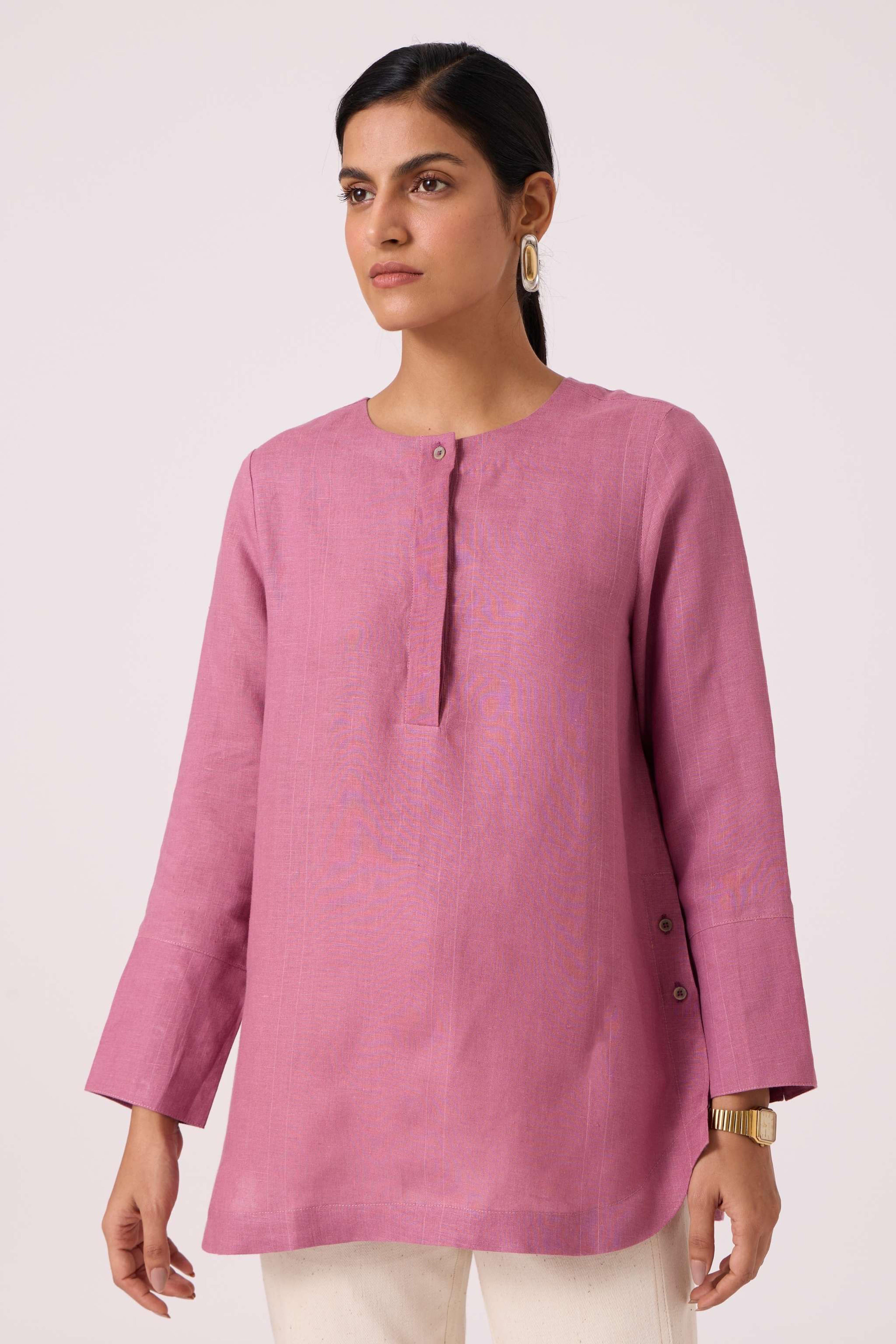 This *regular-fit kurta top* offers a contemporary twist on the classic design. It features a *front button placket*, *full sleeves with exaggerated cuffs*, and a *side overlap slit with button detail*. The top is finished with a *curved hemline*. The model, Chhavi, is 5'6" and is wearing a size XS.