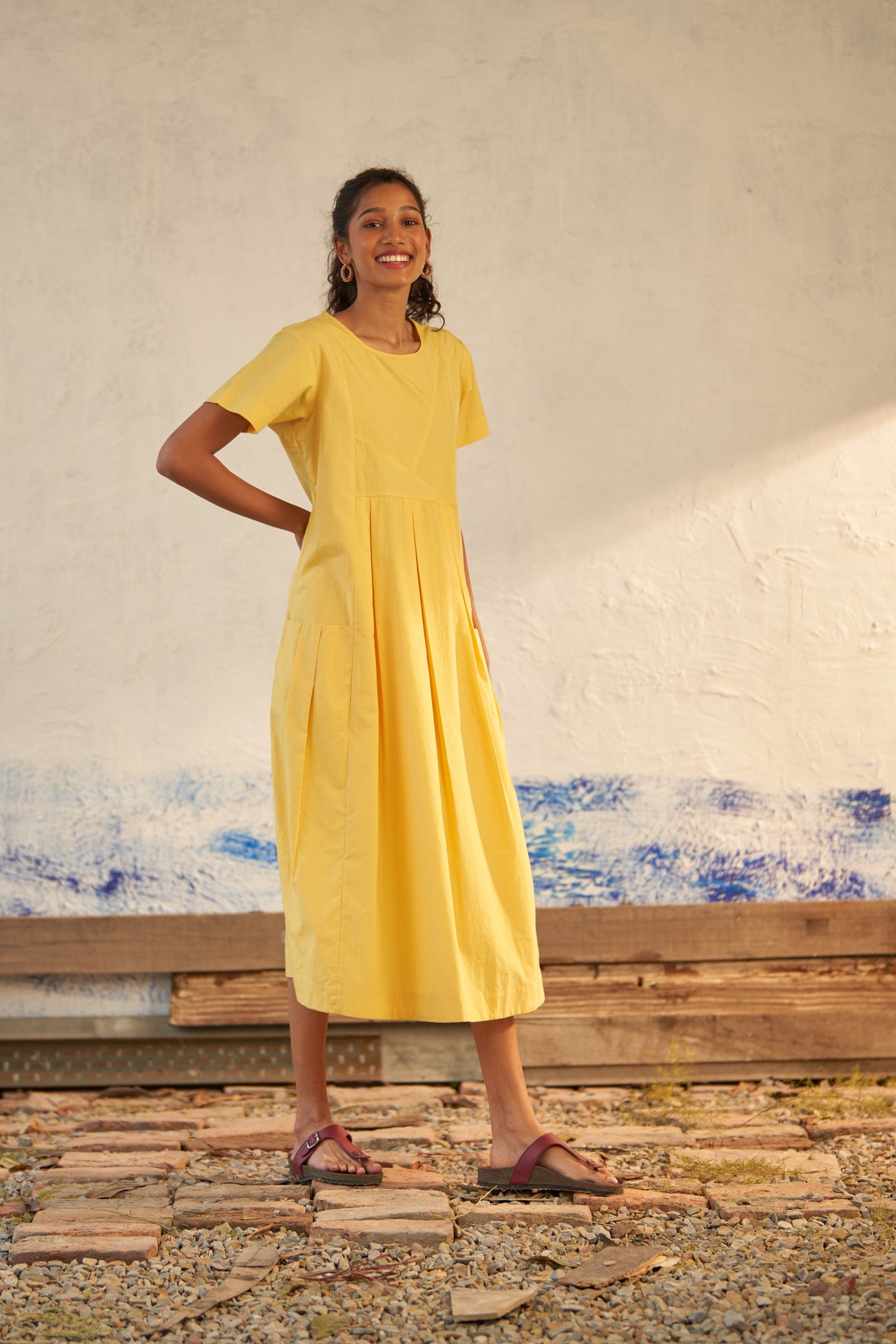 For a sunny summer day, embrace the vibrant energy of this yellow dress. It features oversized pockets in the front and patchwork on the yoke, adding to its visual appeal. Pleats enhance the overall flow, making it a effortlessly flowy choice for summer.