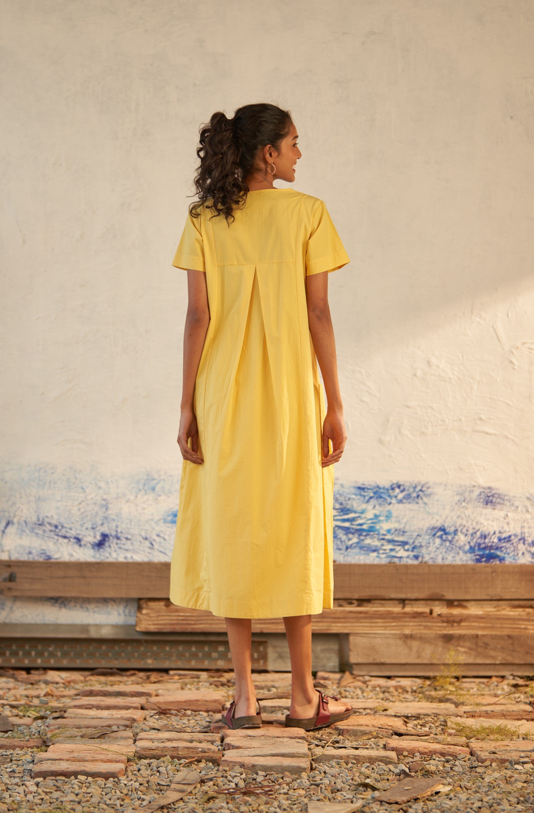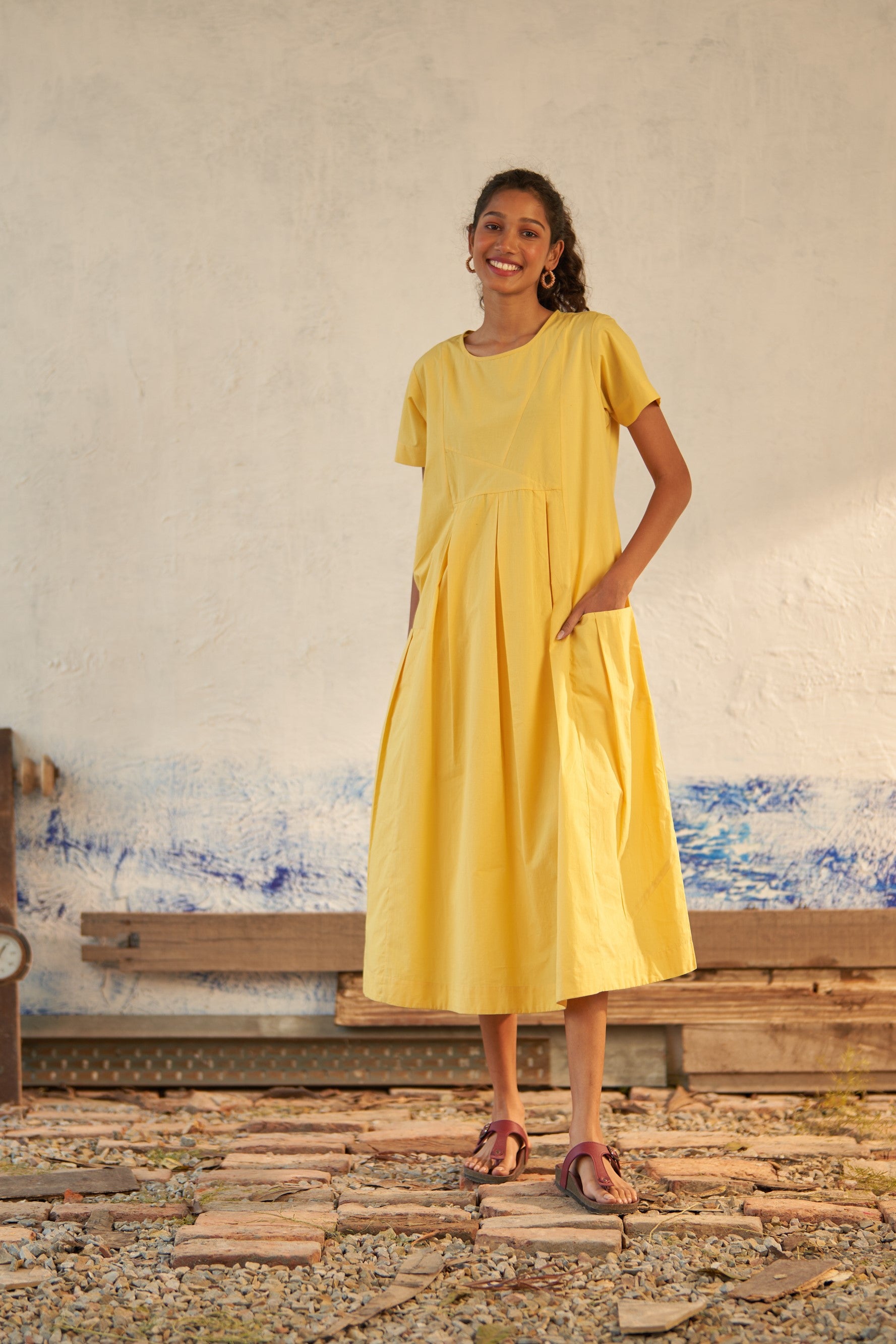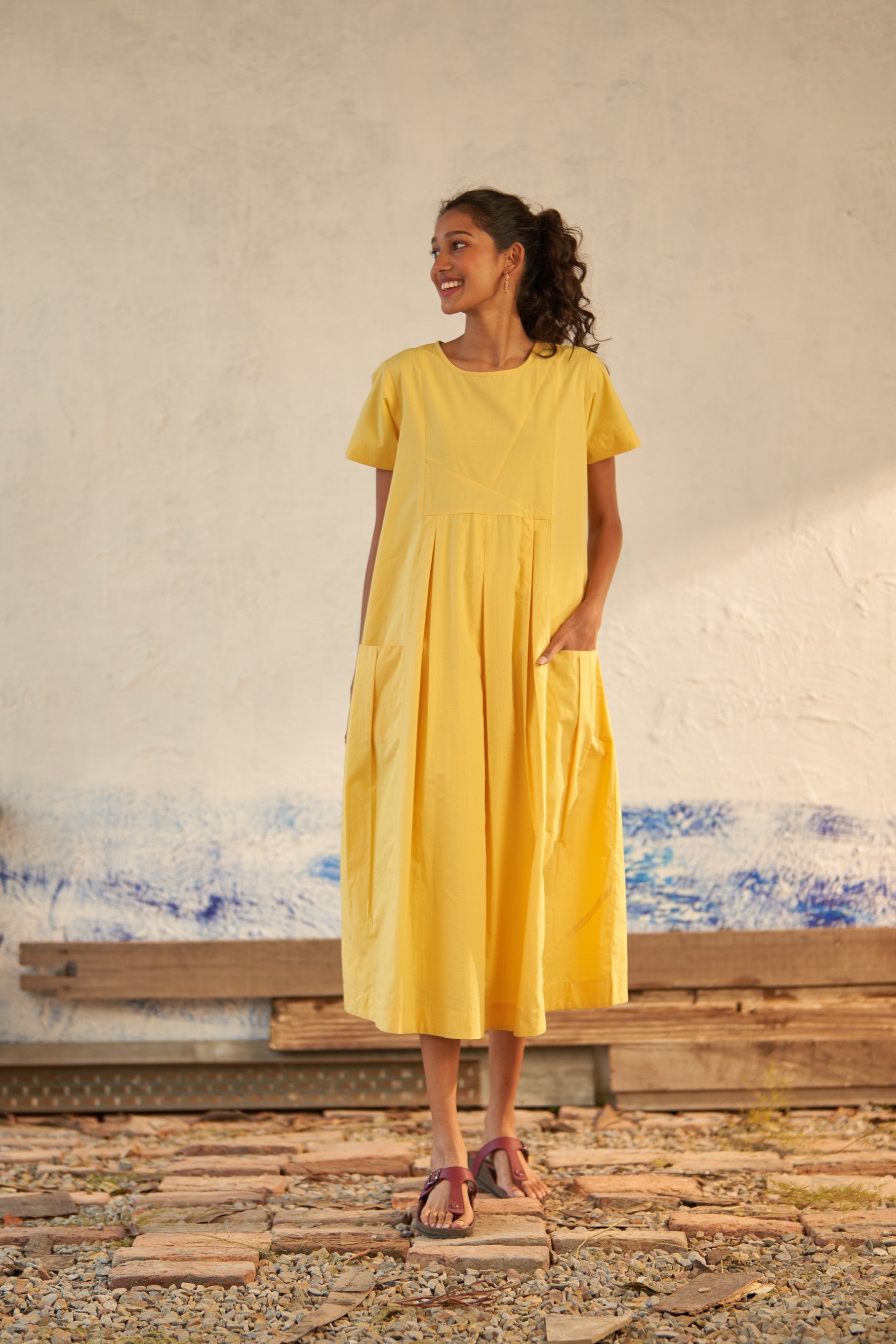 For a sunny summer day, embrace the vibrant energy of this yellow dress. It features oversized pockets in the front and patchwork on the yoke, adding to its visual appeal. Pleats enhance the overall flow, making it a effortlessly flowy choice for summer.