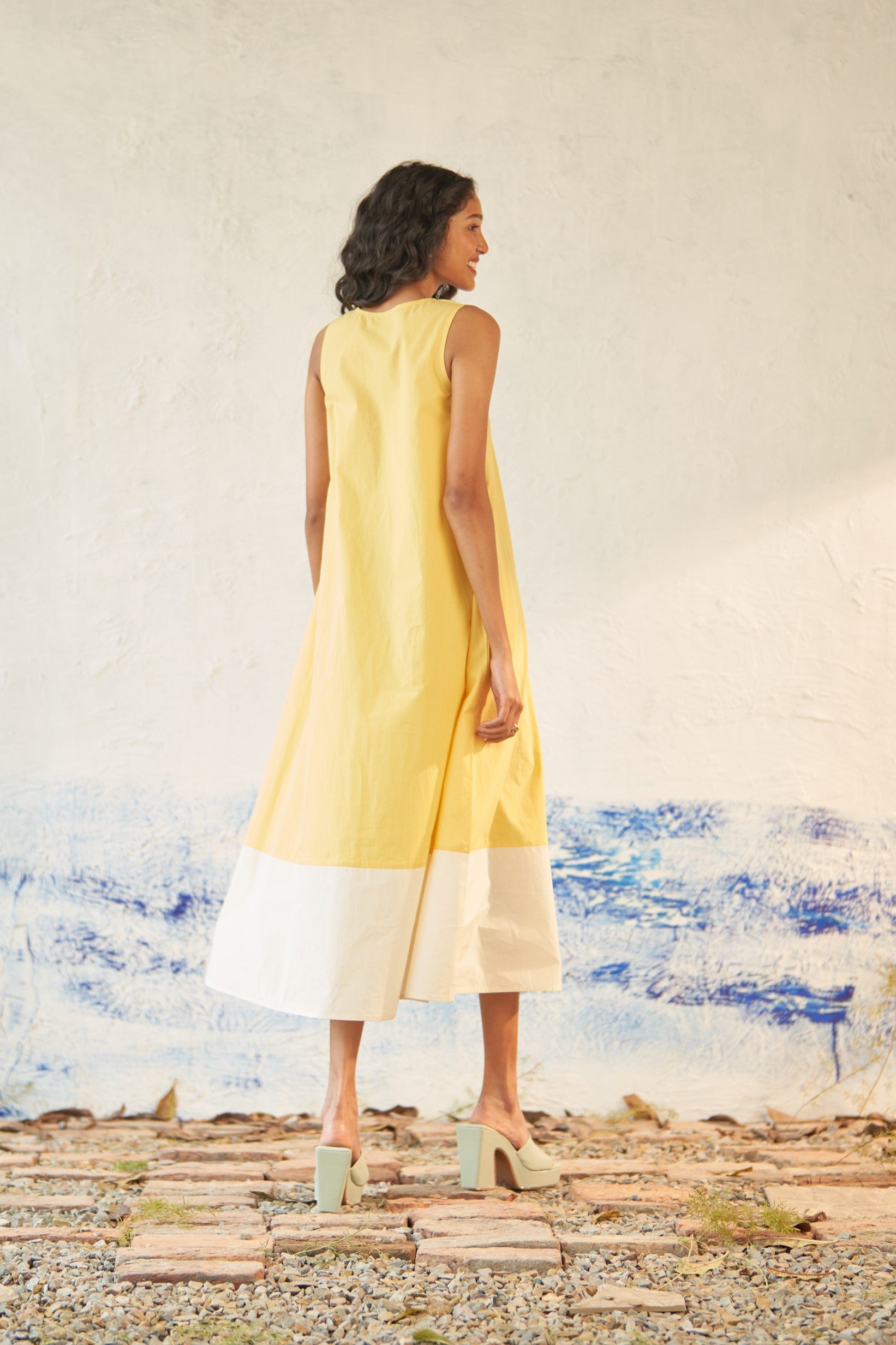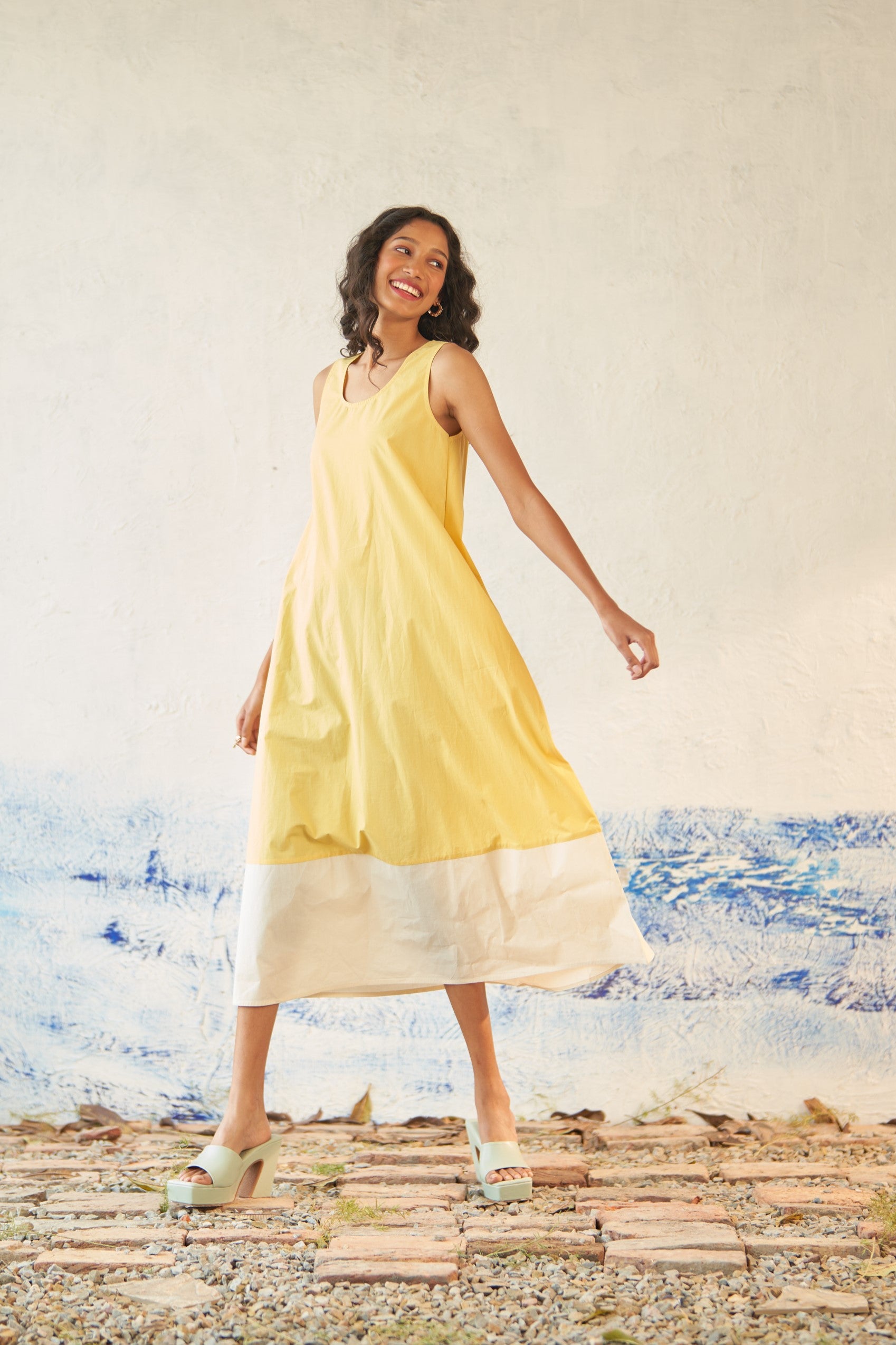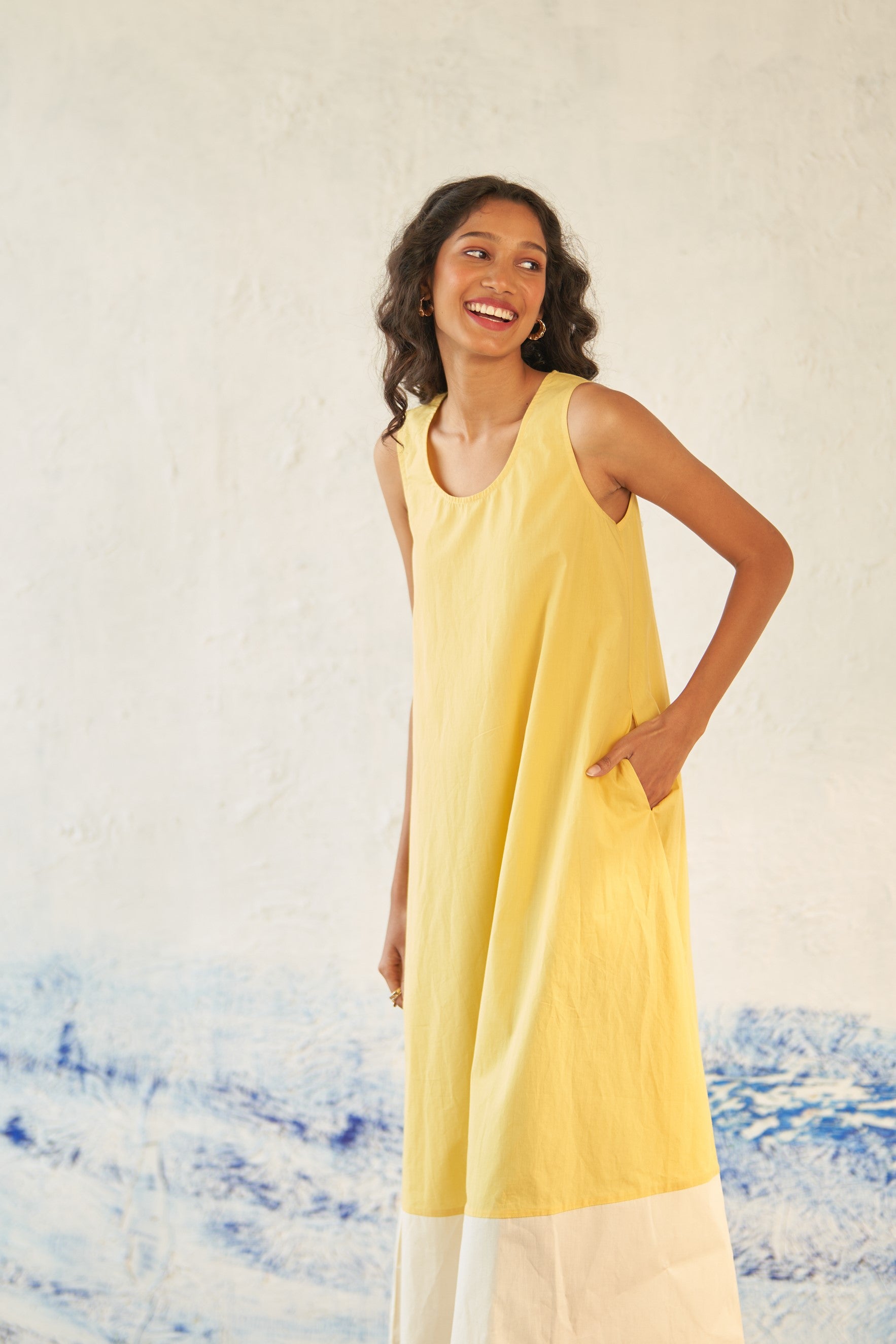 This premium cotton dual-toned dress is expertly crafted to gracefully drape through the frame, featuring a scoop neck and a curved hem. Its sleeveless design with a voluminous flare allows for effortless movement from morning to evening. A must-have addition to your collection of easy-to-wear outfits.